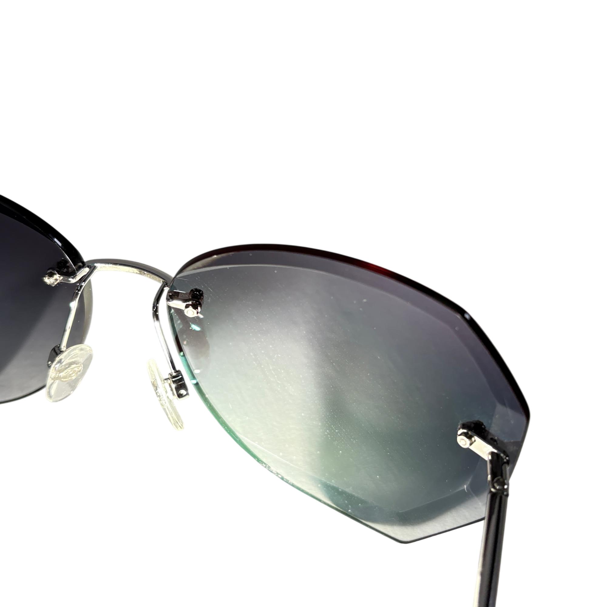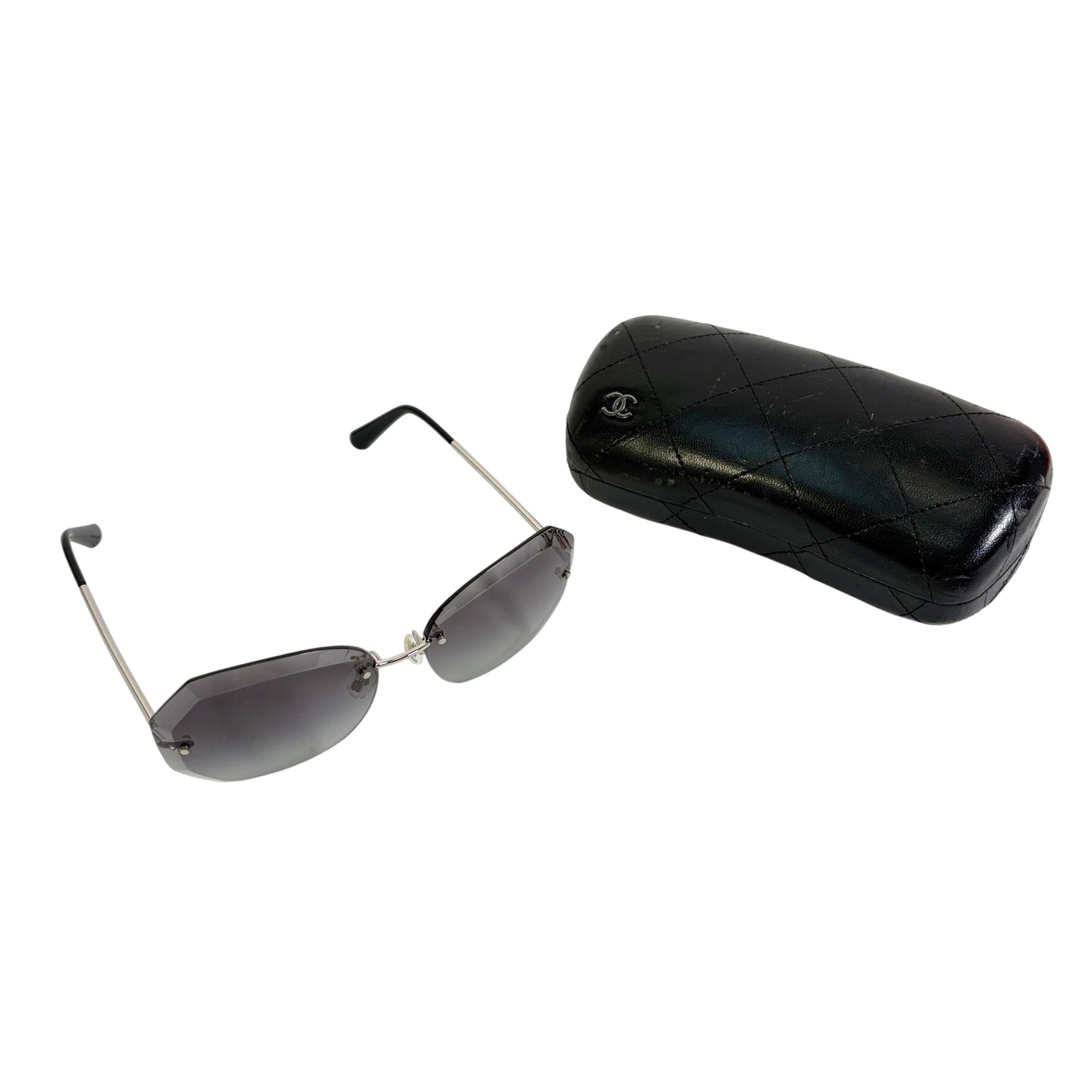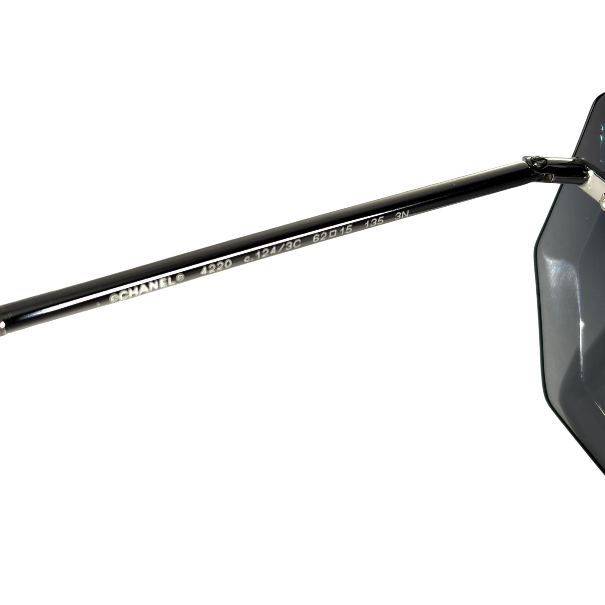 Chanel 4220 Dark Silver Acetate Rimless Sunglasses feature a sleek and modern design with black lenses set in a dark silver acetate rimless frame, offering a sophisticated and lightweight eyewear option. These sunglasses combine elegant craftsmanship with a distinctive round shape to provide both style and comfort, making them a fashionable accessory for everyday wear.