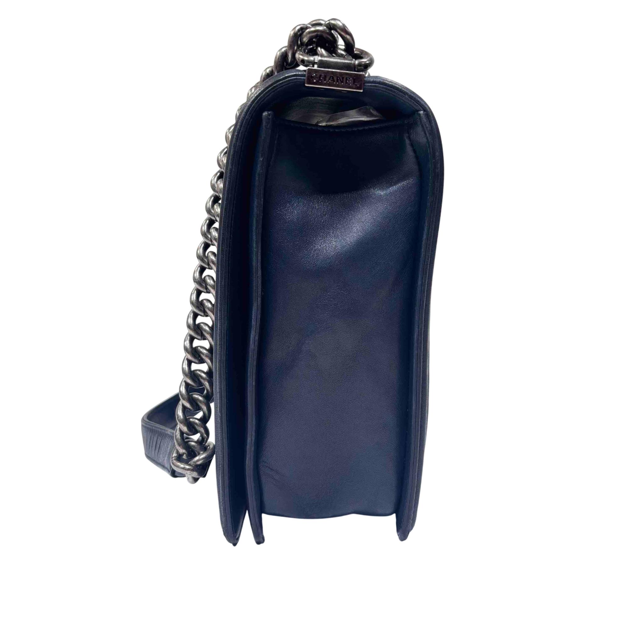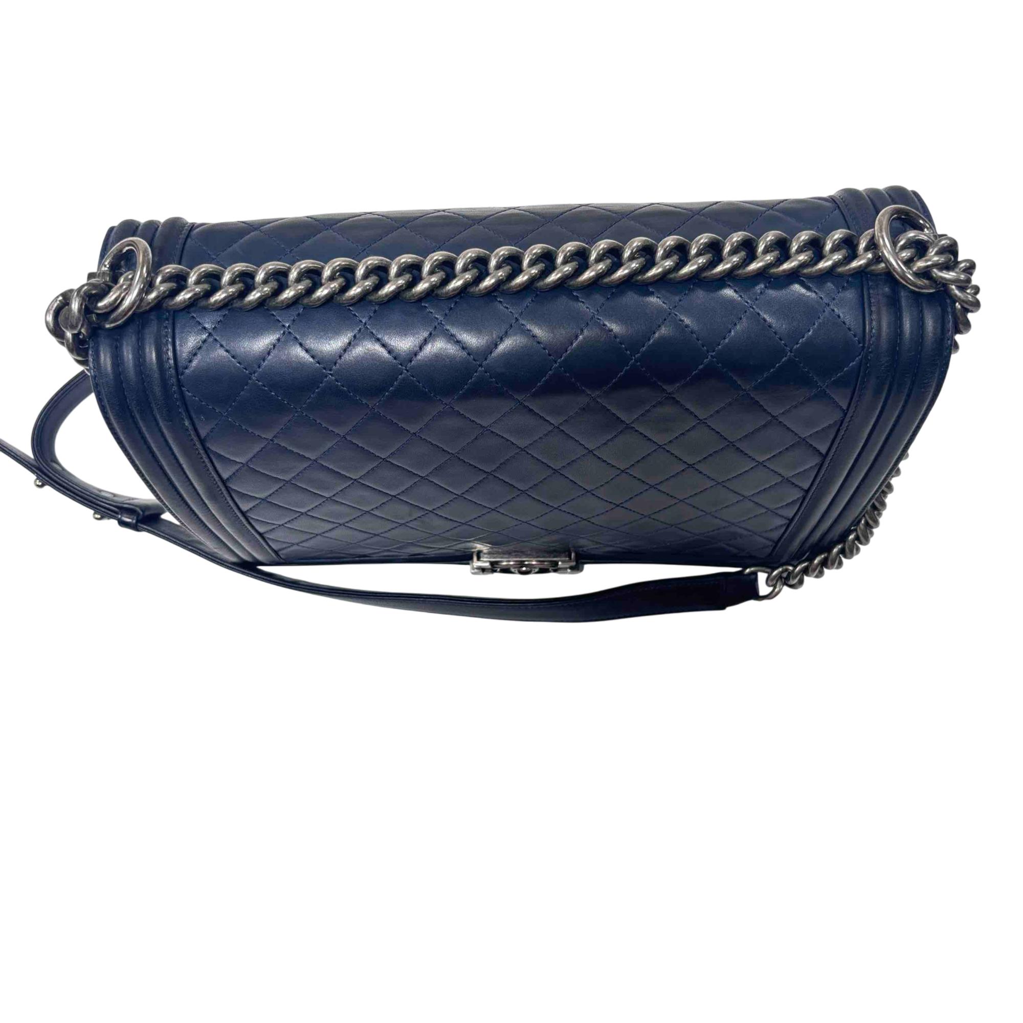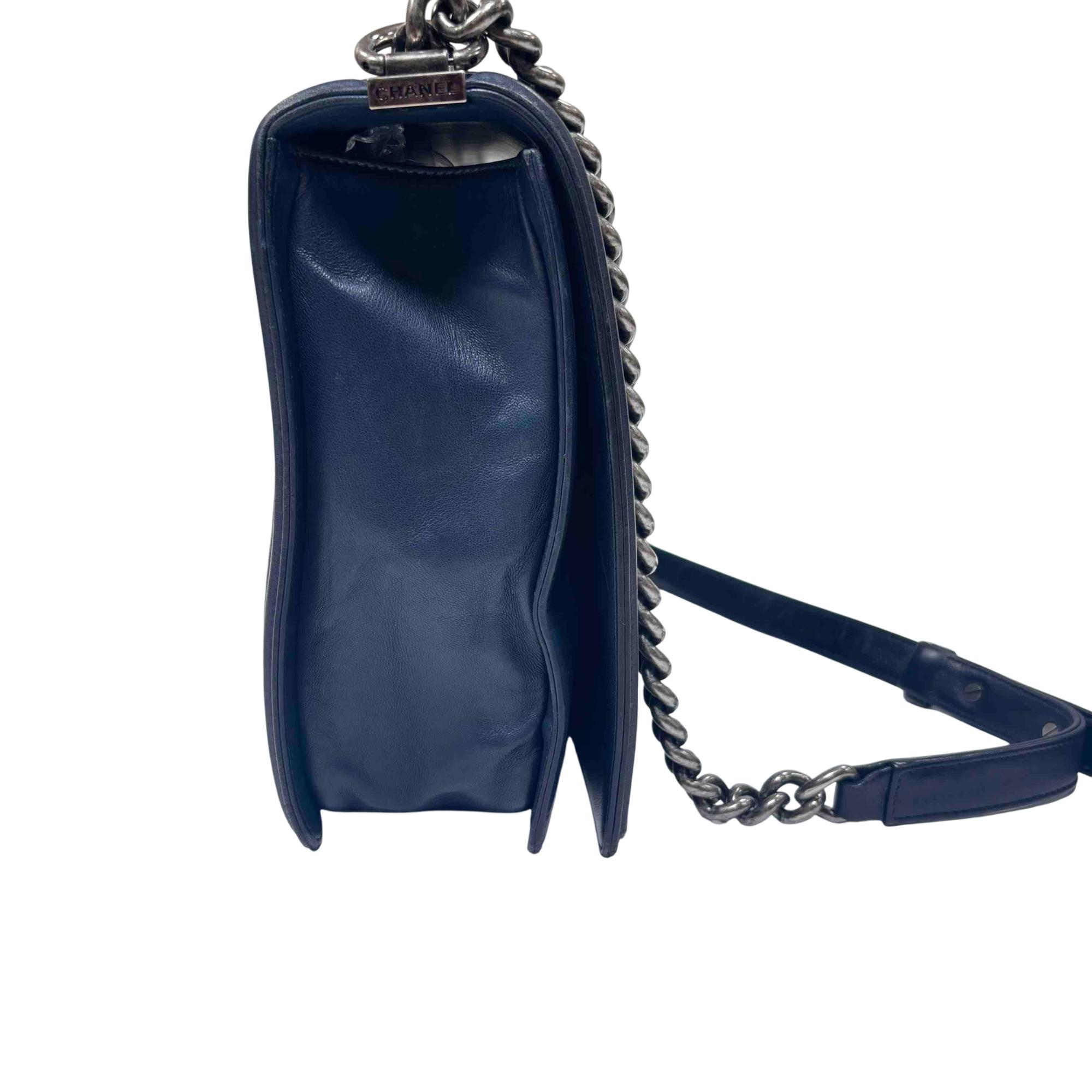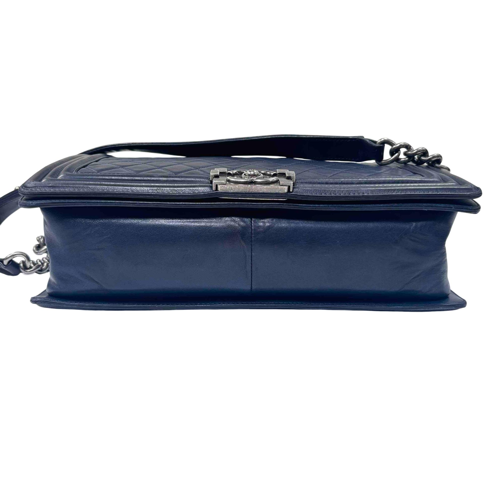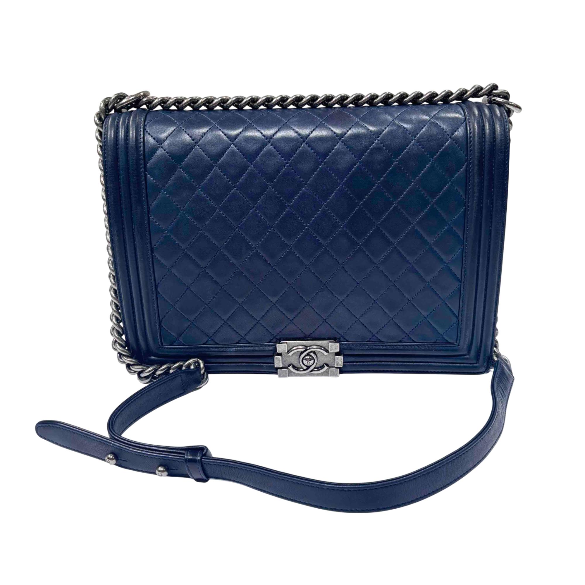 This is the iconic Chanel Boy Flap Bag, crafted in luxurious blue quilted leather and finished with a bold silver chain and signature CC push-lock closure. Renowned for its modern, structured silhouette and instantly recognizable design, this versatile handbag elevates any look from day to night. Own a true fashion statement that combines Chanels timeless elegance with a contemporary edge.