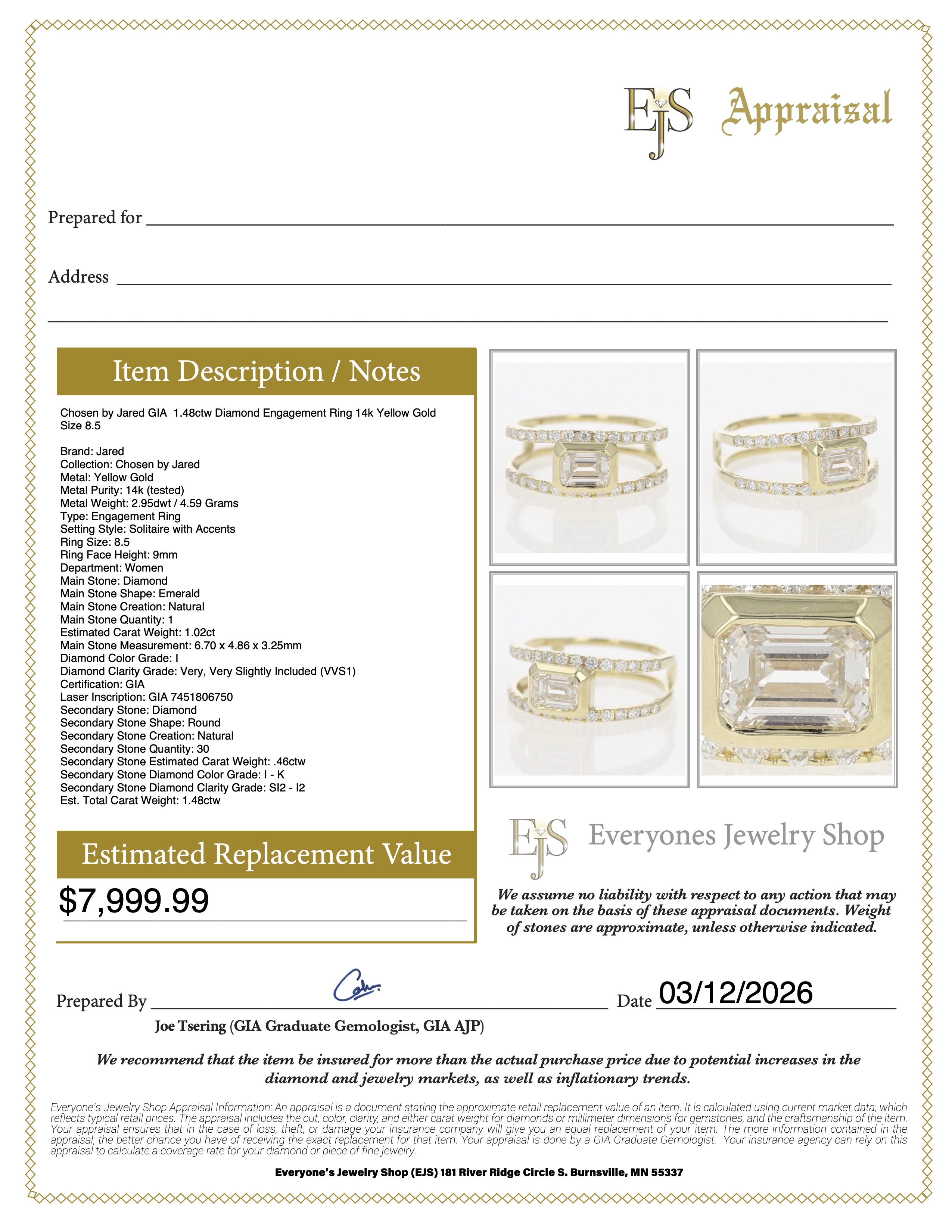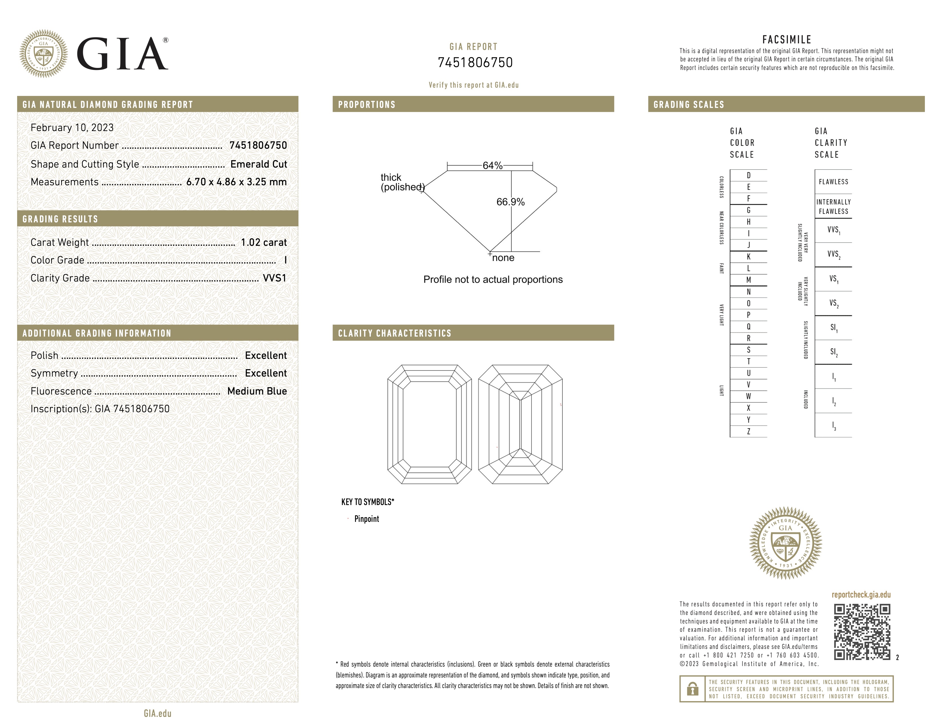 The primary diamond is laserscribed with GIA 7451806750 on the girdle.