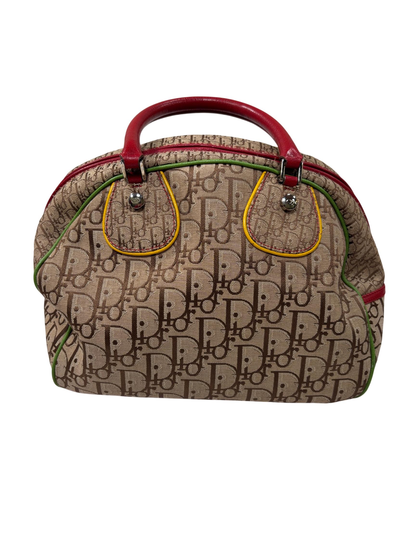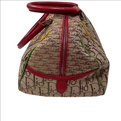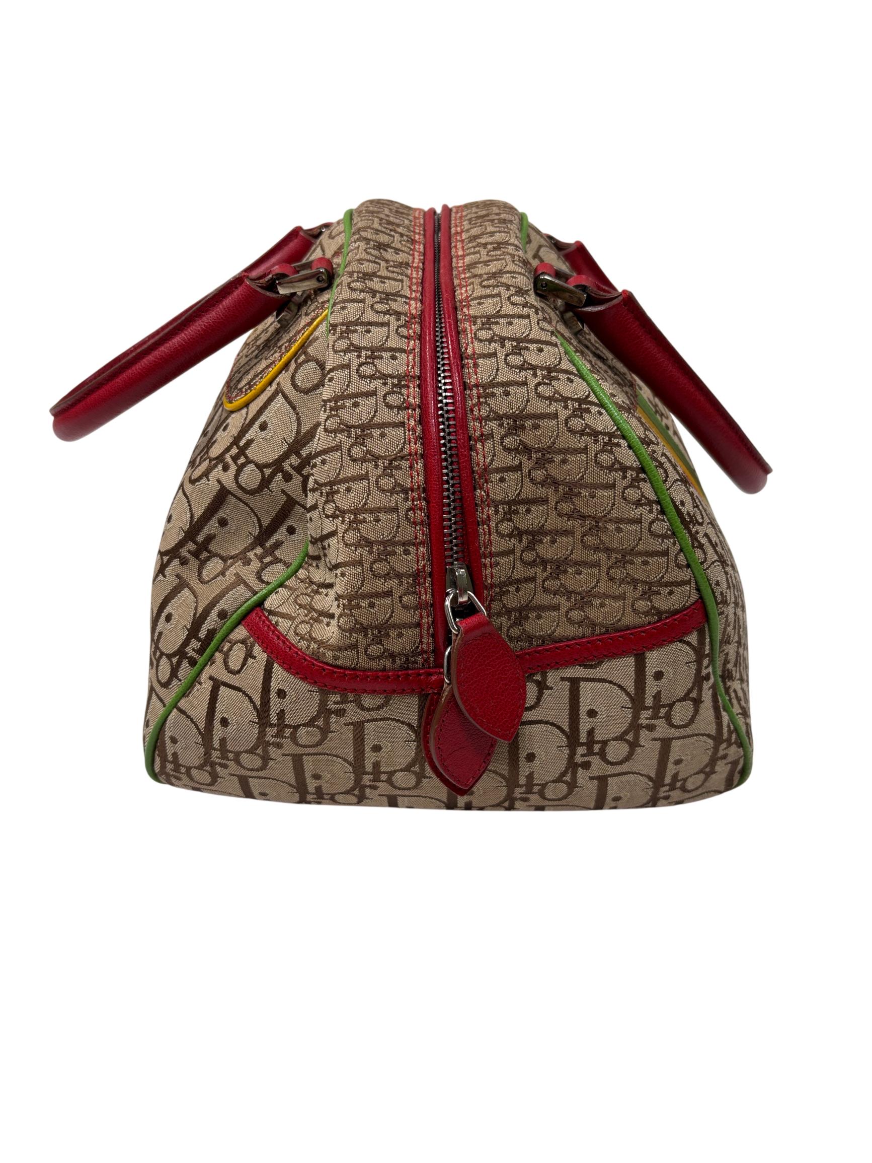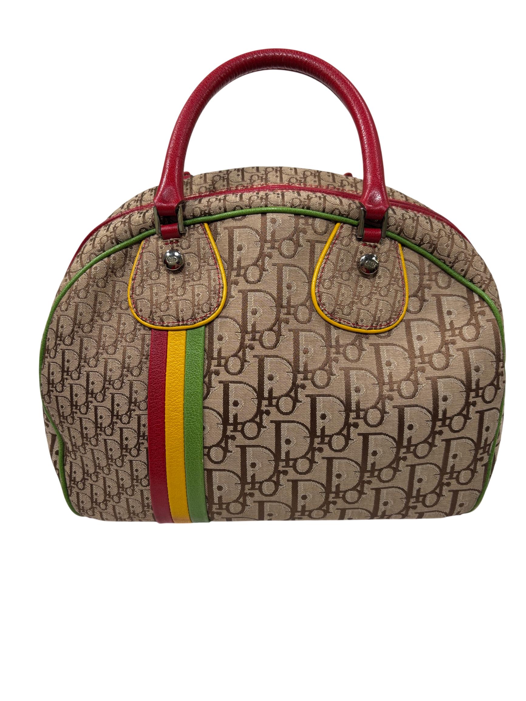 Christian Dior Brown Trotter Coated Canvas Rasta Bowler Bag features a rich brown canvas body accented by vibrant red trim and handles, complemented with polished silver hardware. This luxurious fashion accessory is designed for stylish functionality with a secure zipper closure and high-quality leather craftsmanship, making it an elegant addition to any wardrobe.
