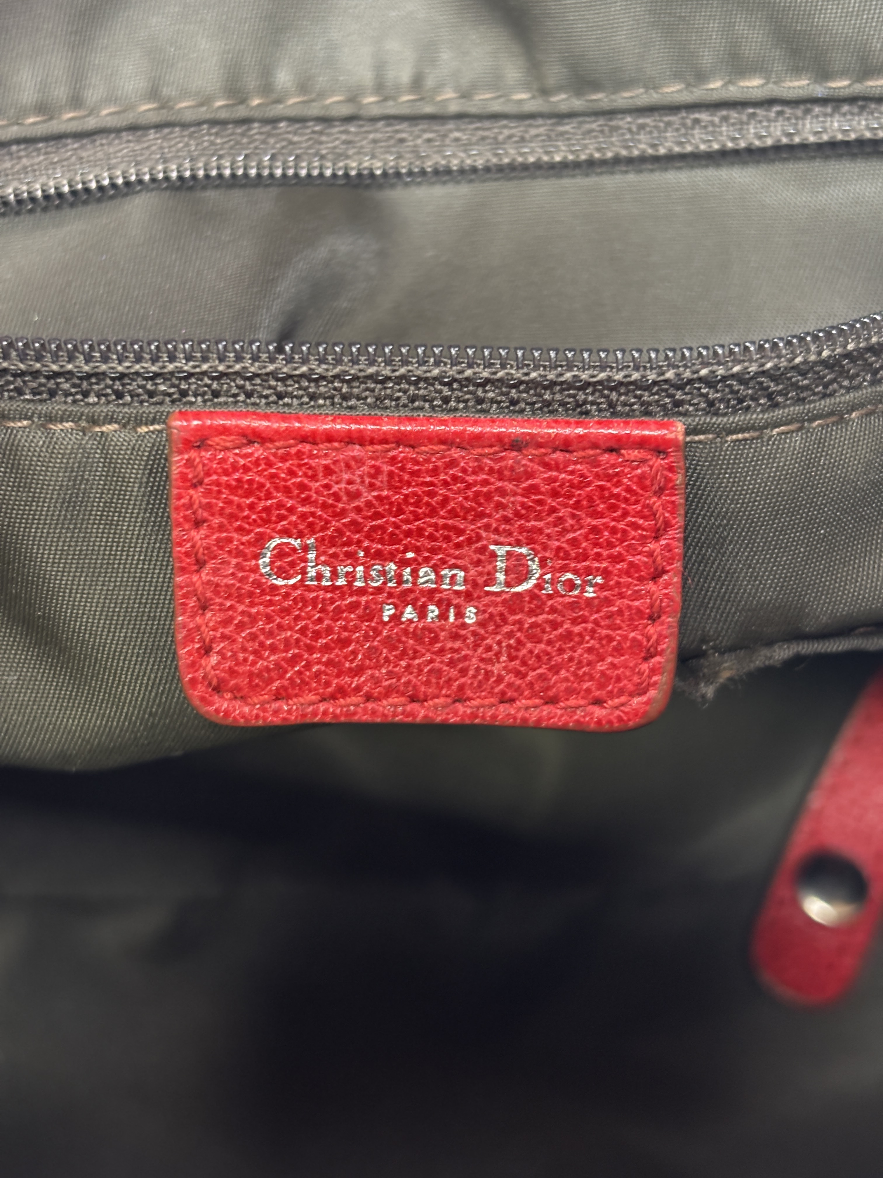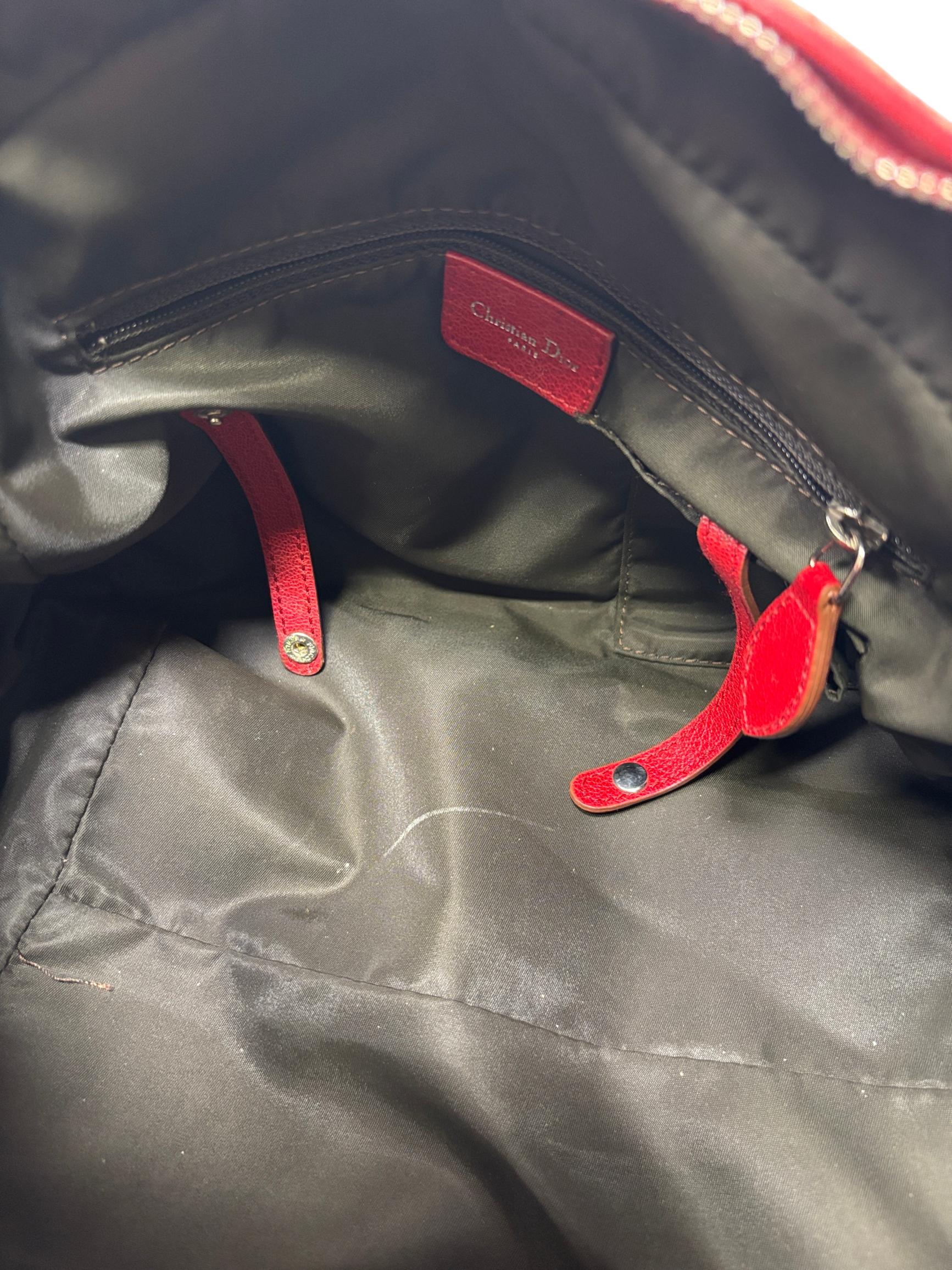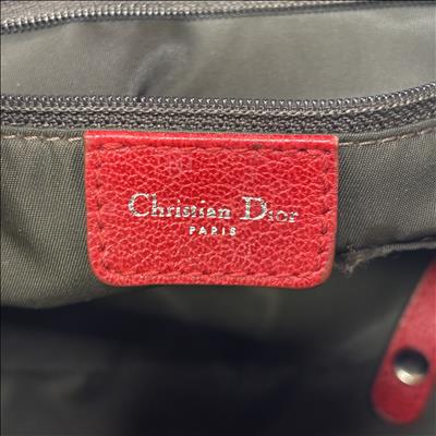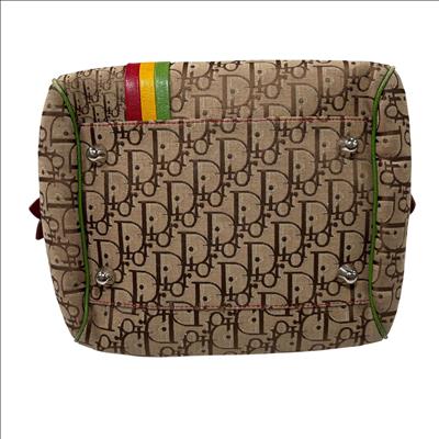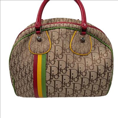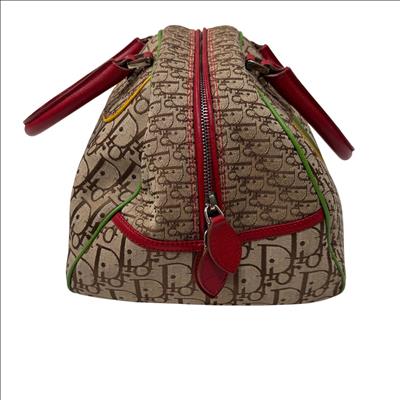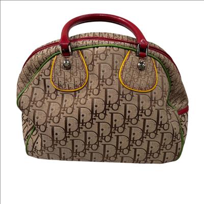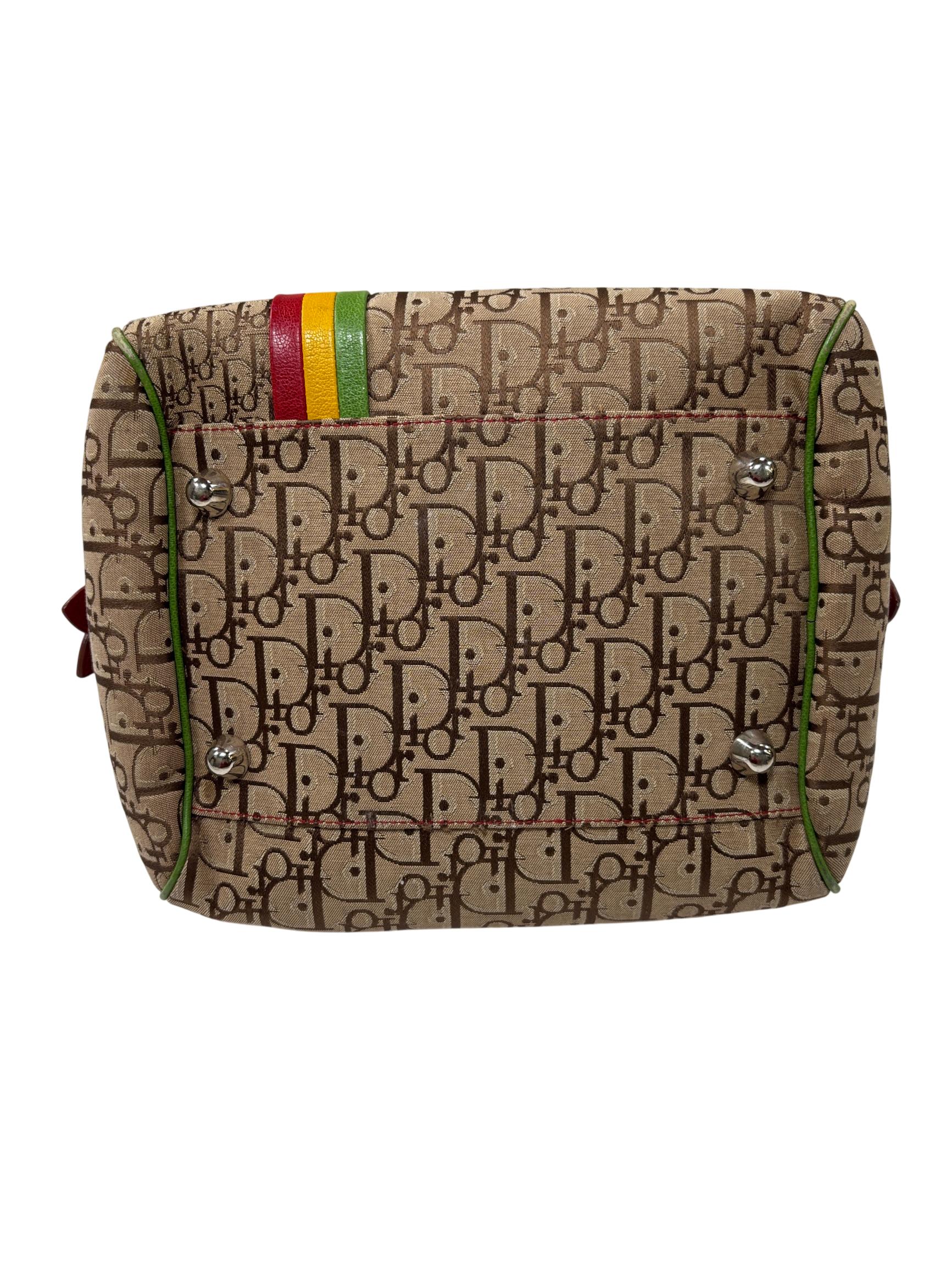 Christian Dior Brown Trotter Coated Canvas Rasta Bowler Bag features a rich brown canvas body accented by vibrant red trim and handles, complemented with polished silver hardware. This luxurious fashion accessory is designed for stylish functionality with a secure zipper closure and high-quality leather craftsmanship, making it an elegant addition to any wardrobe.