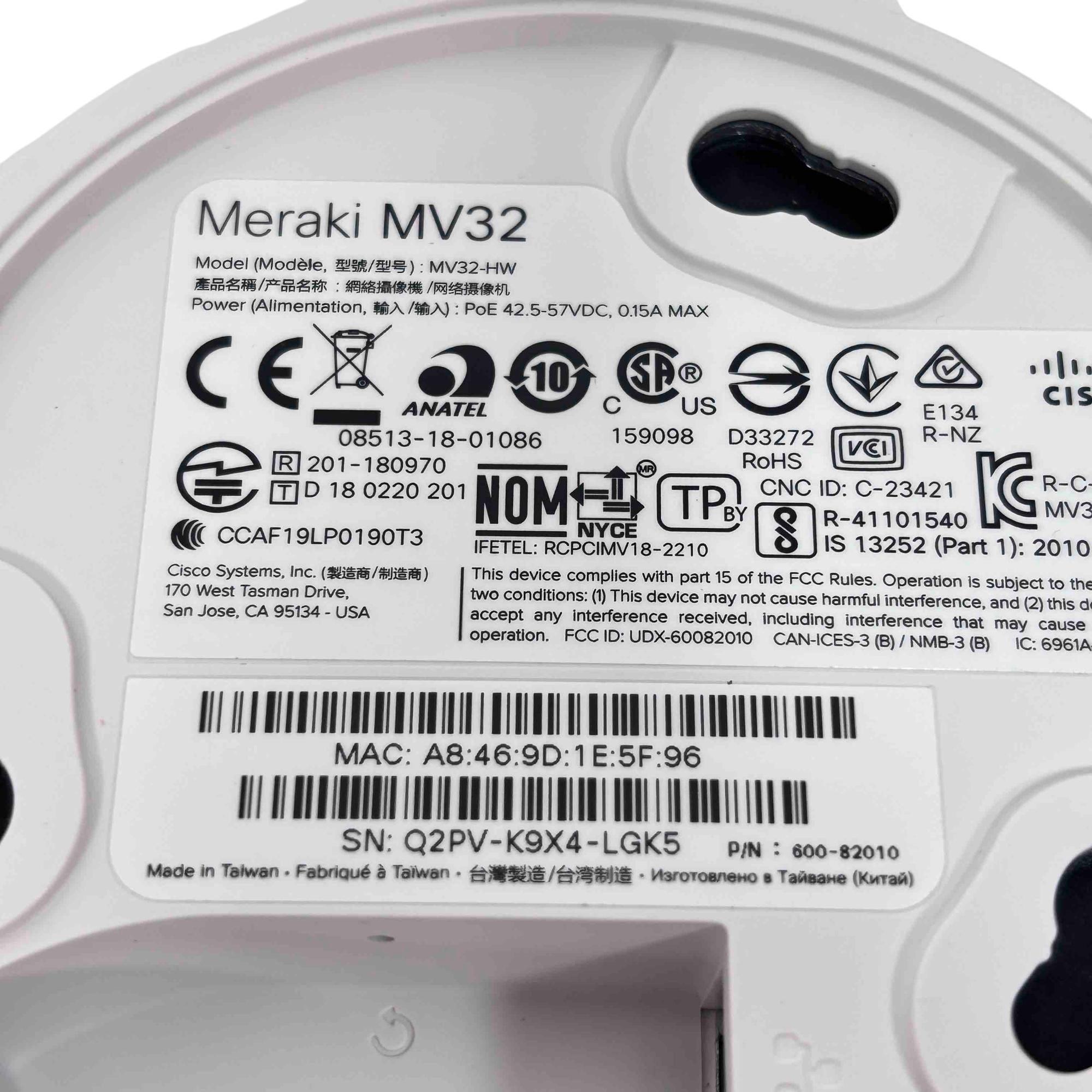 Cisco Meraki MV32-HW 360° Fisheye 8.4MP 256GB Indoor Security Camera
