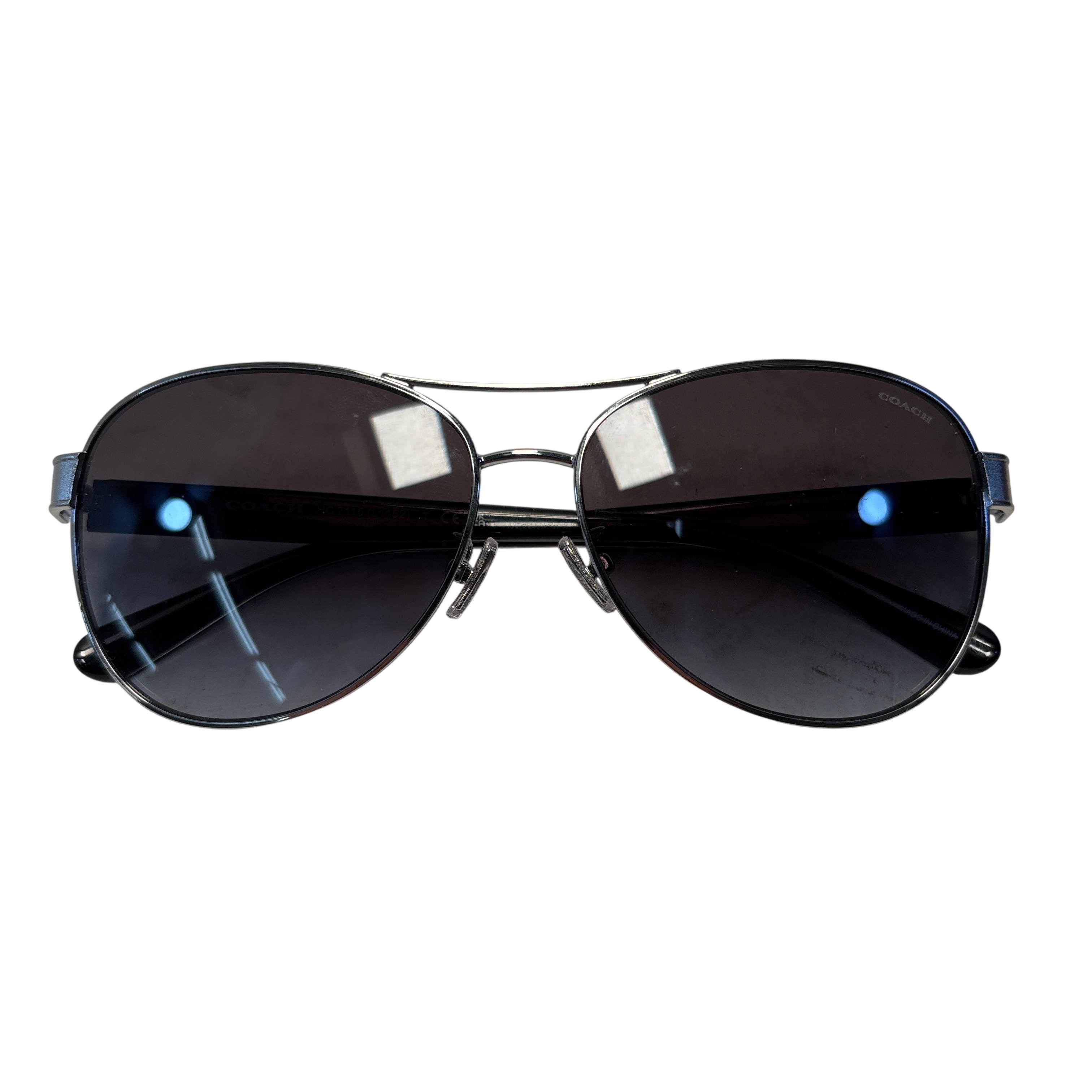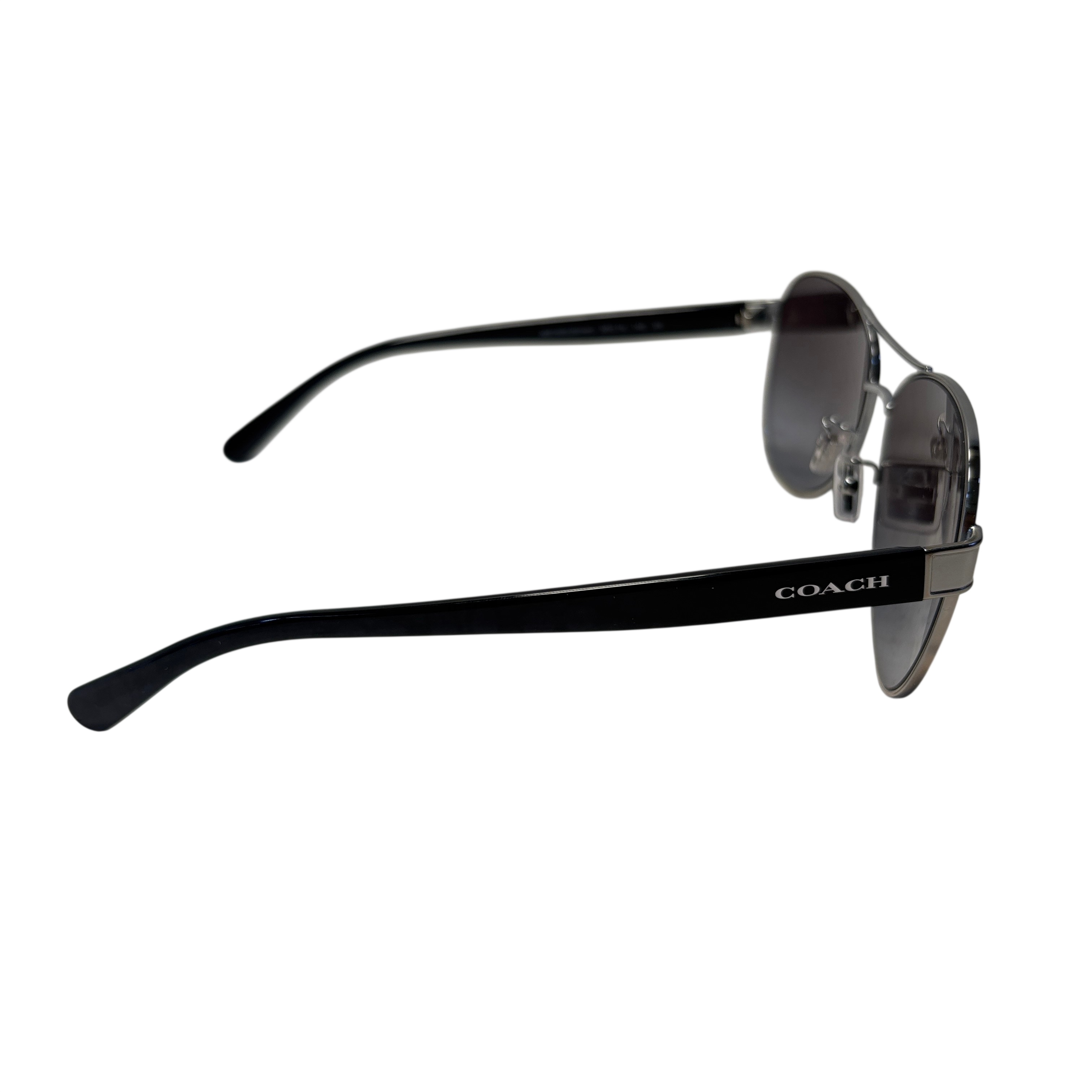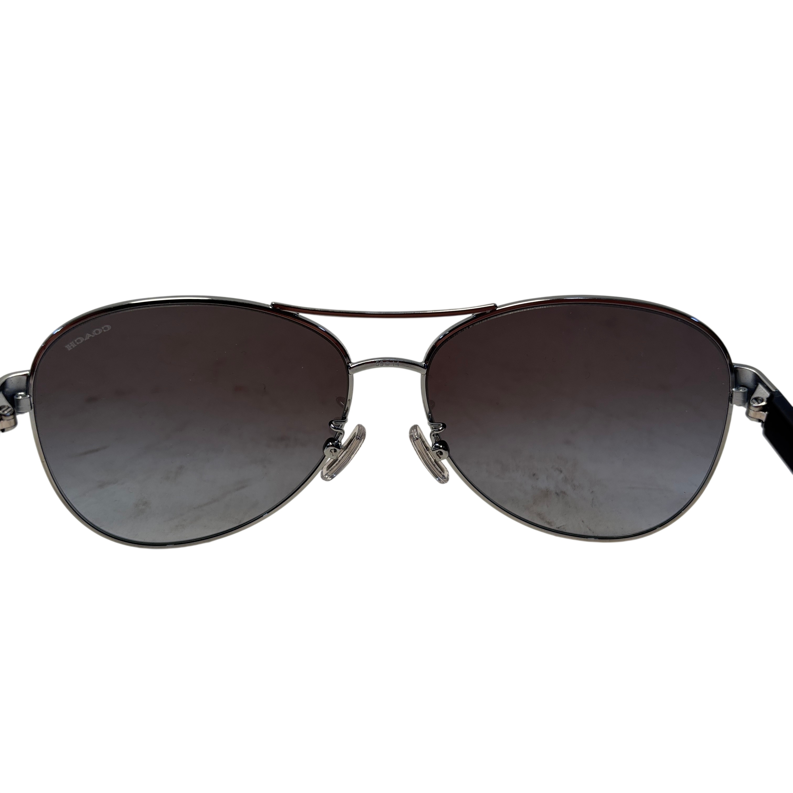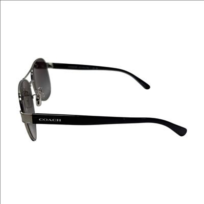 The Coach Sunglasses feature a sleek silver metal frame paired with dark gradient lenses that provide excellent UV protection with a 3N rating. These aviator-style sunglasses measure 59 mm lens width, 14 mm bridge width, and 140 mm temple length, ensuring a comfortable and stylish fit. Designed with adjustable nose pads and durable construction, they are perfect for everyday wear and outdoor activities. Elevate your look with these timeless Coach sunglasses that combine fashion and function.