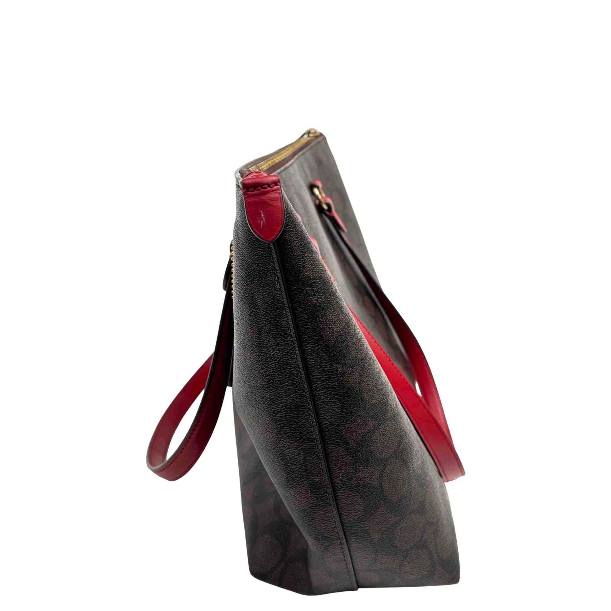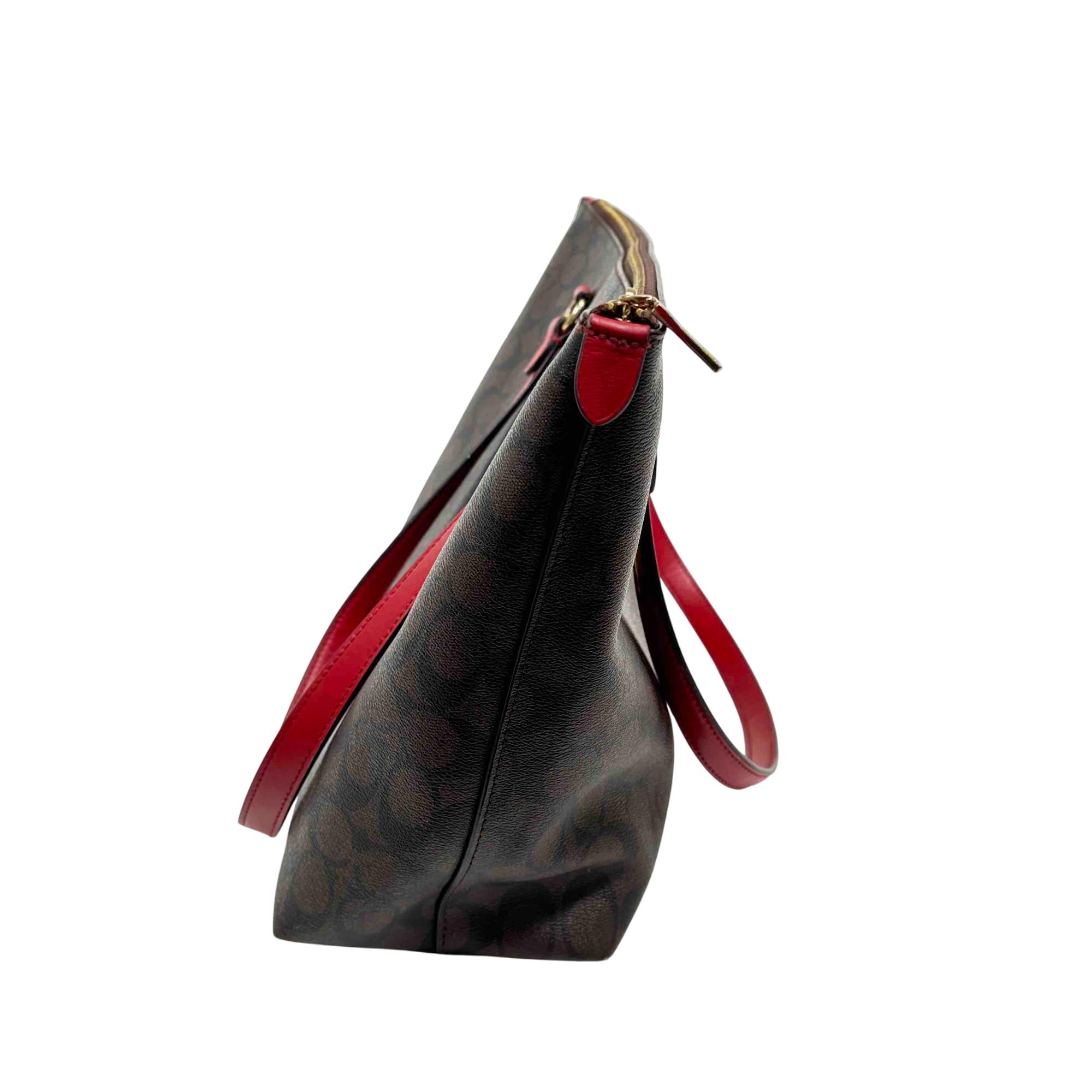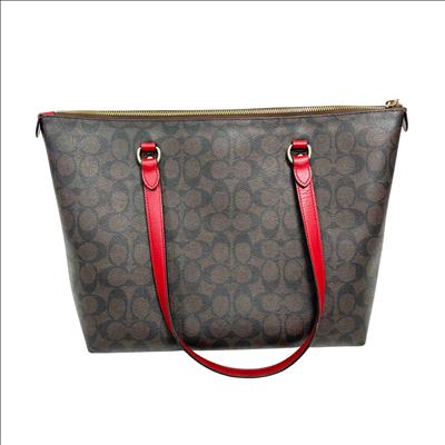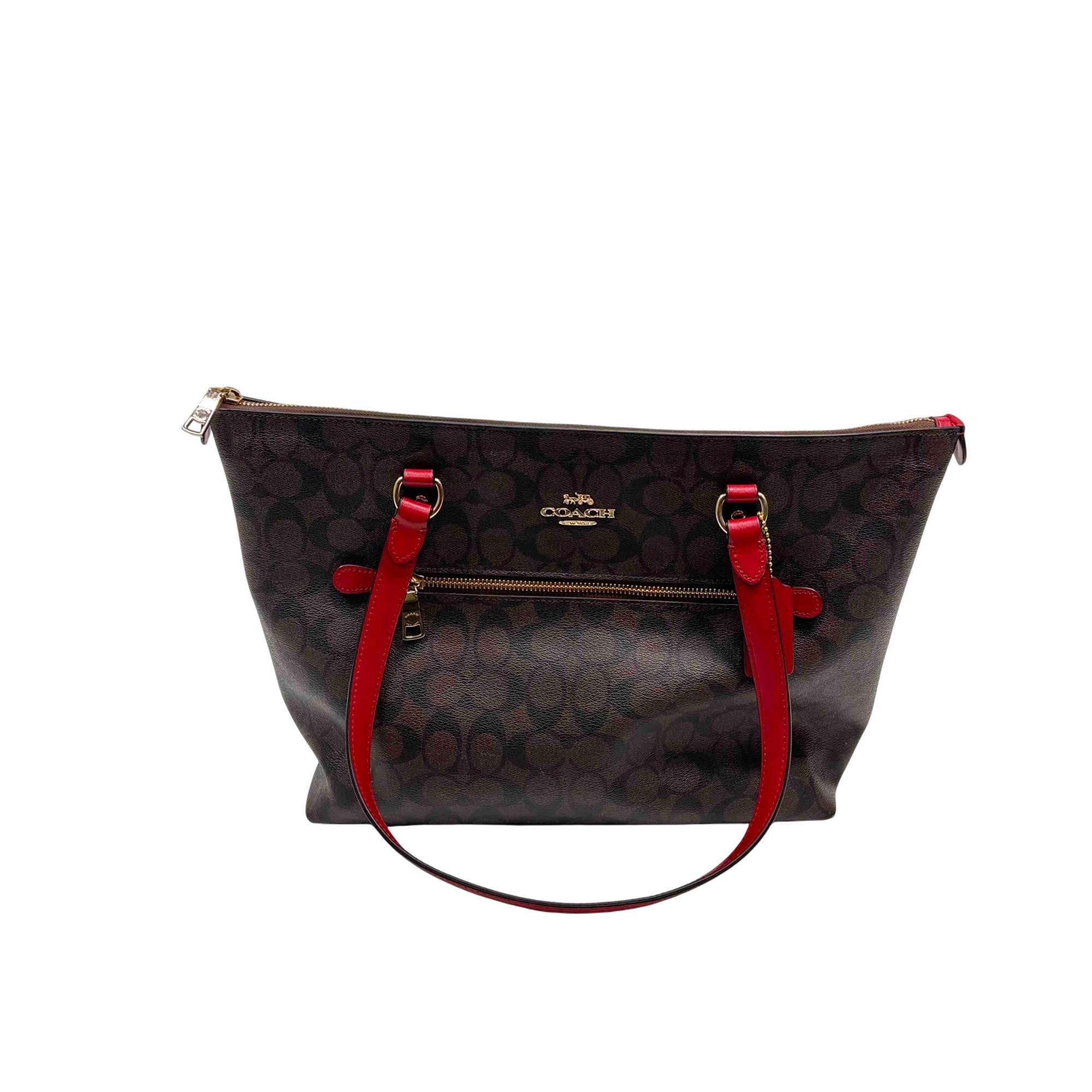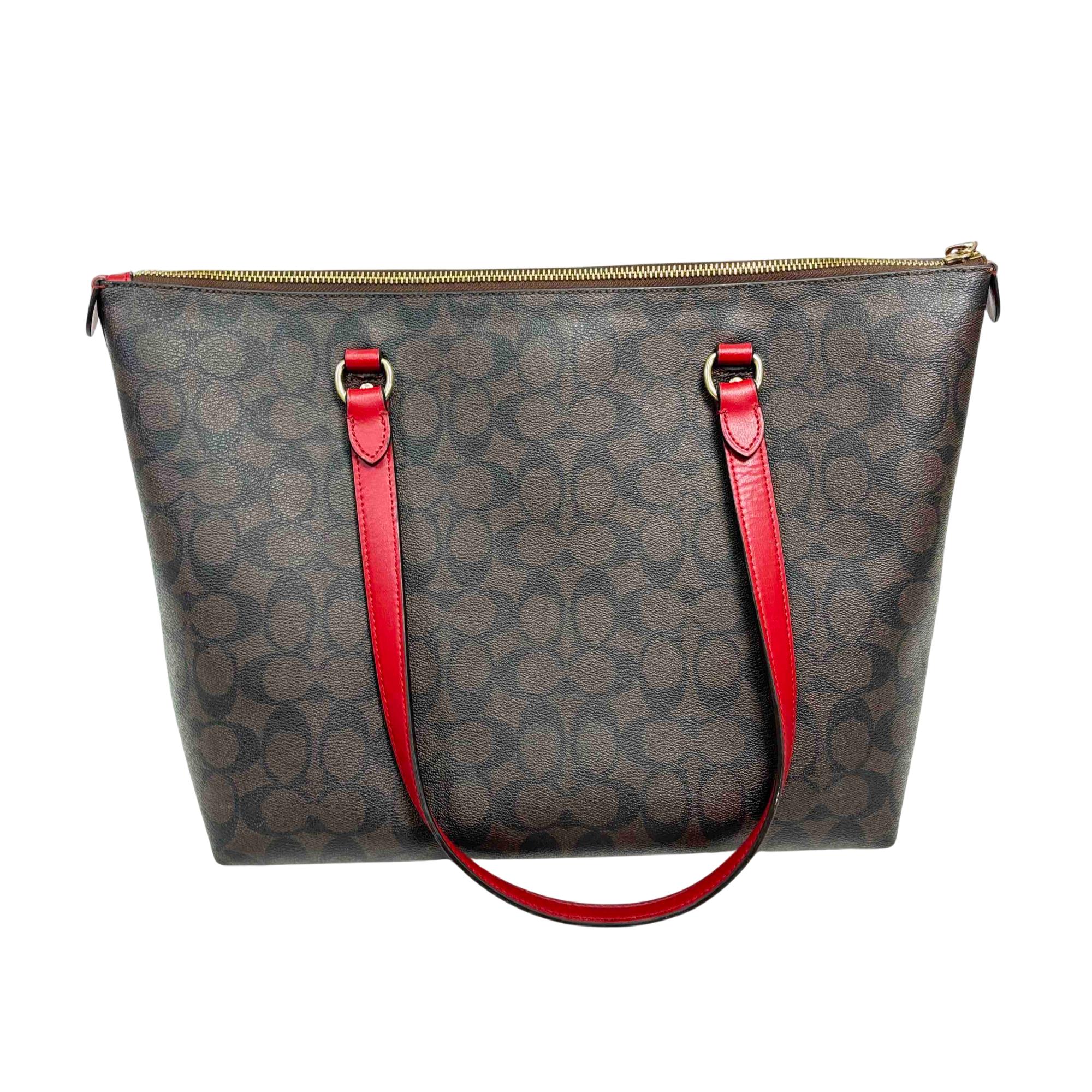 Coach Gallery Tote Bag in Signature Canvas Brown/Red features a distinctive brown and red color scheme crafted from durable canvas with leather accents. This spacious tote includes a zip-top closure and multiple internal pockets for organized storage, blending classic design with everyday practicality. The leather trim and subtle logo detailing add a refined touch to this versatile accessory ideal for daily use or casual outings.