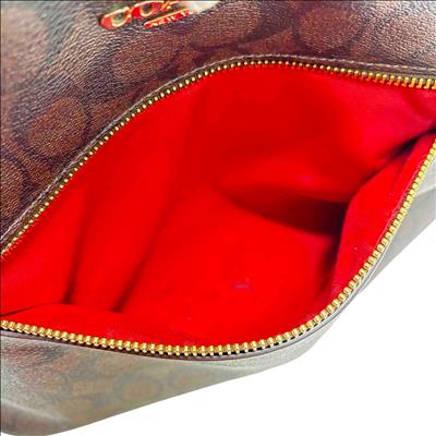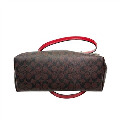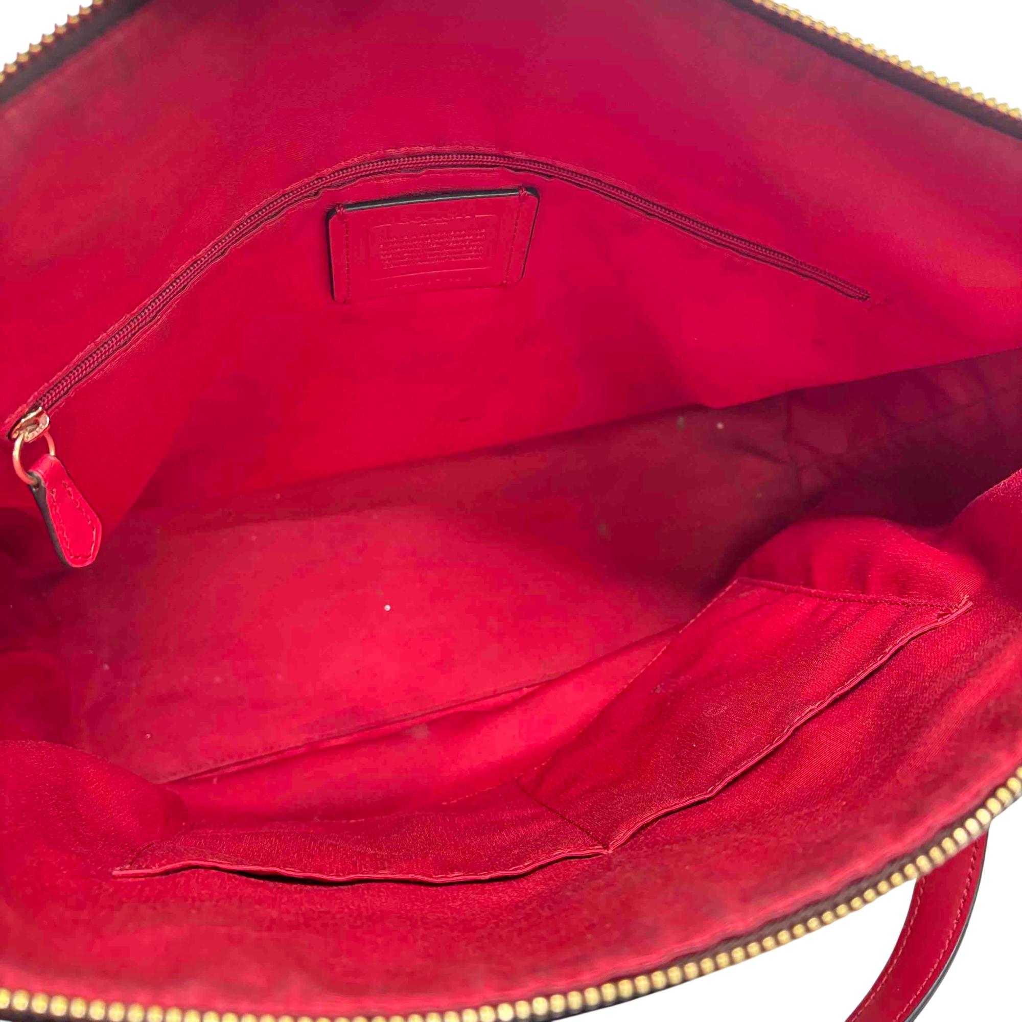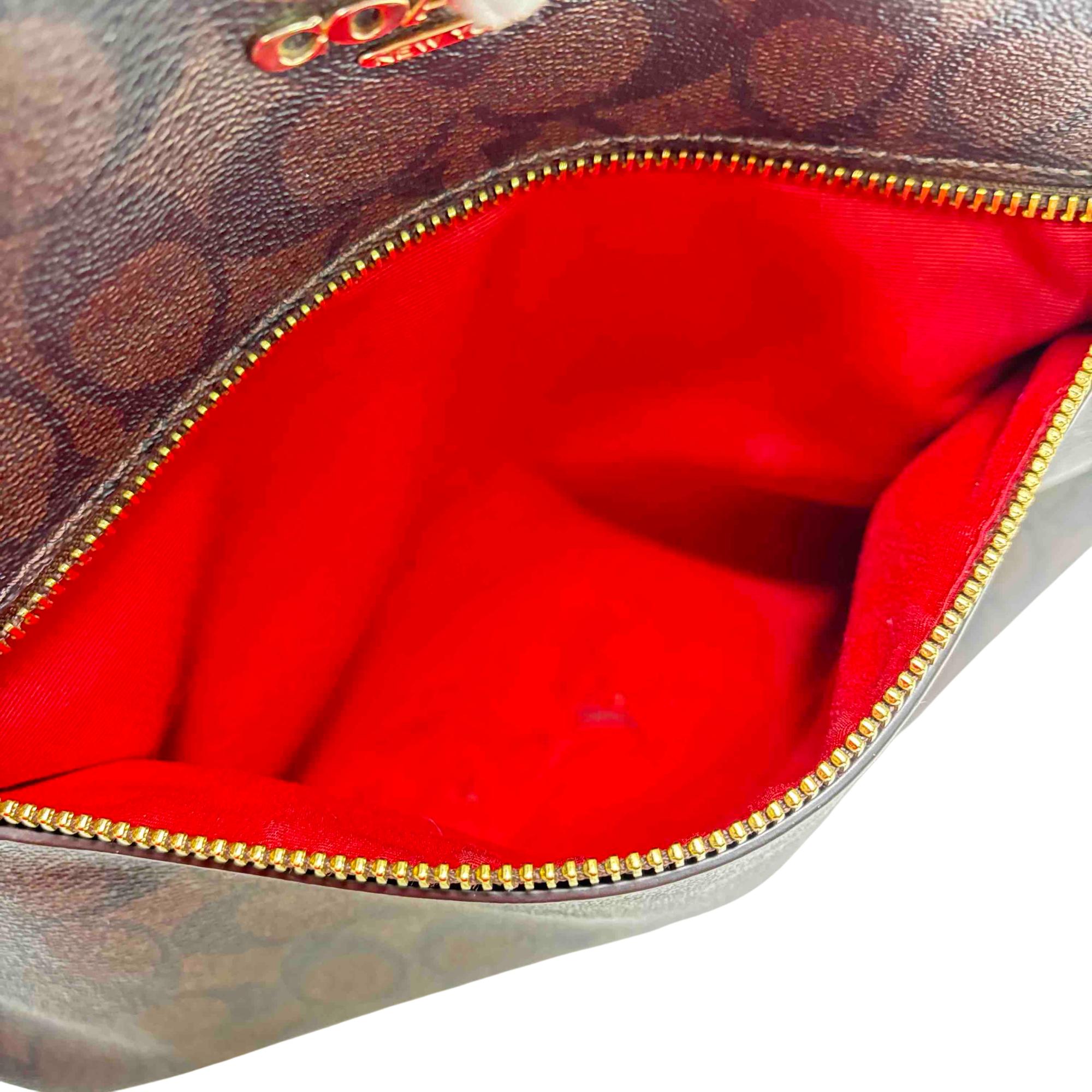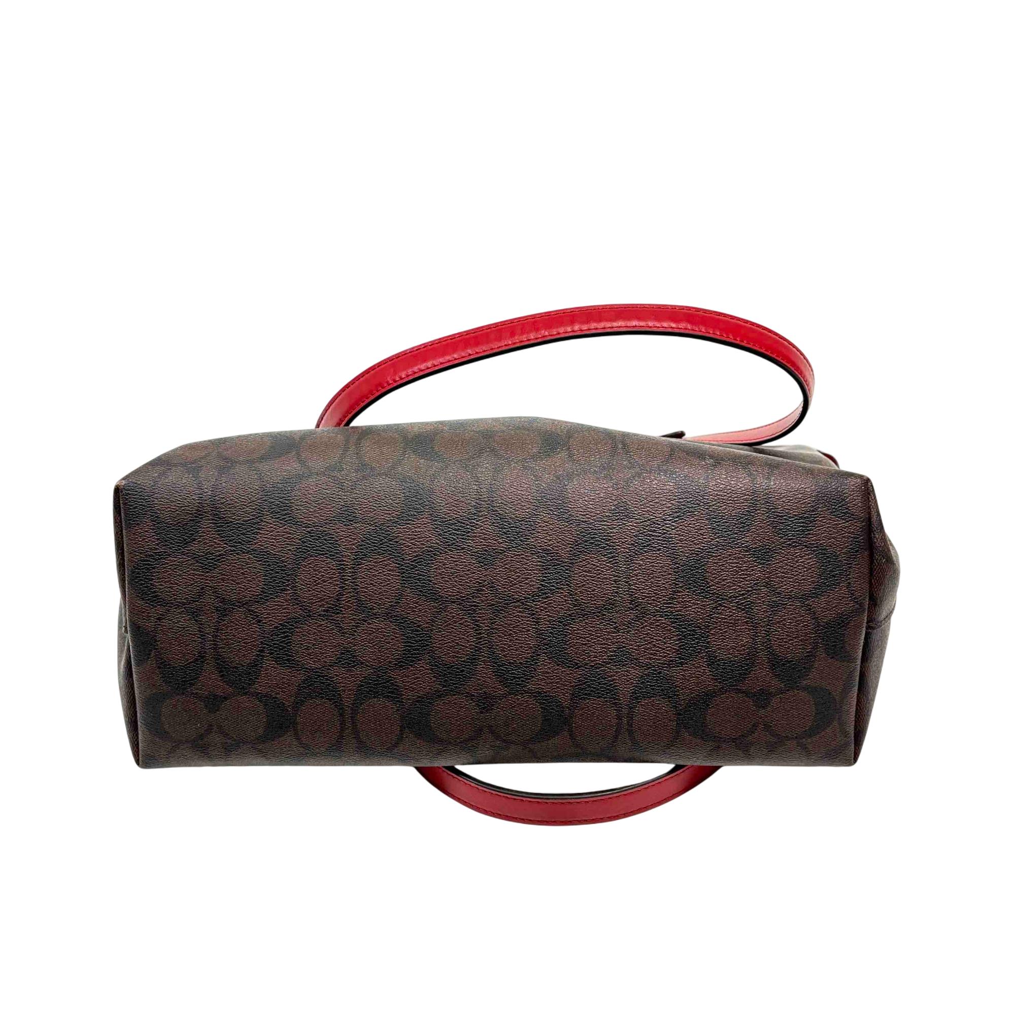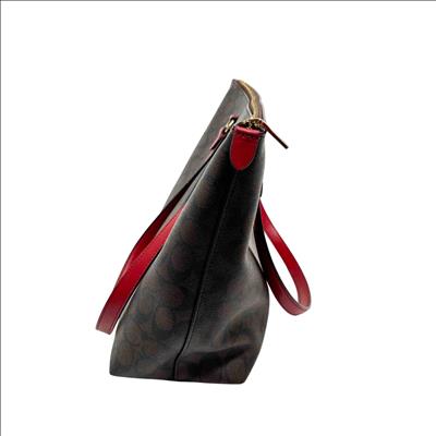 Coach Gallery Tote Bag in Signature Canvas Brown/Red features a distinctive brown and red color scheme crafted from durable canvas with leather accents. This spacious tote includes a zip-top closure and multiple internal pockets for organized storage, blending classic design with everyday practicality. The leather trim and subtle logo detailing add a refined touch to this versatile accessory ideal for daily use or casual outings.