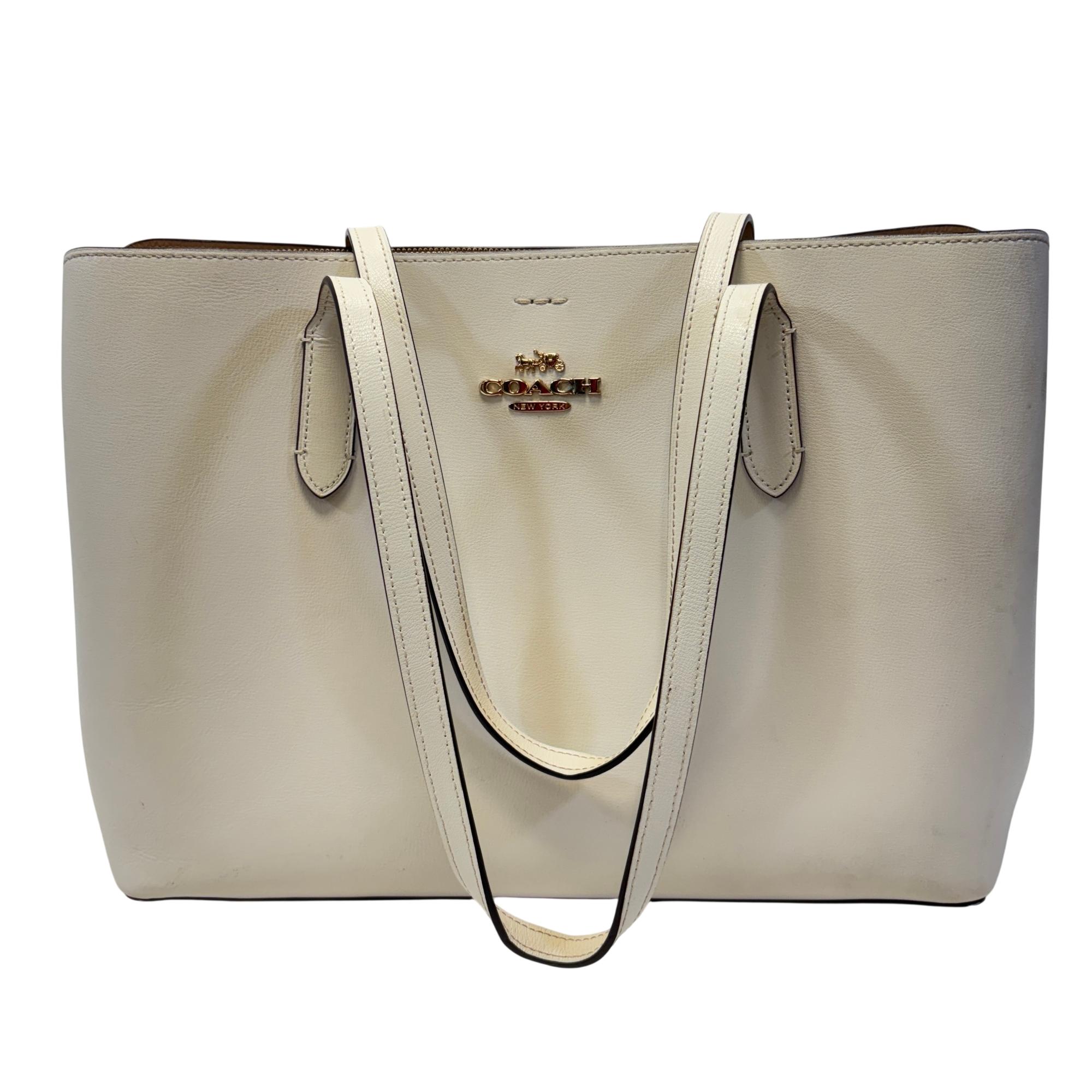 Elevate your daily essentials with the sophisticated Coach Large Avenue Carryall crafted from durable, polished pebble leather in a clean white finish. This spacious and versatile tote features a chic gold-toned hardware, dual shoulder straps, and a secure center zip compartment, making it perfect for organizing all your work or travel needs. The timeless design effortlessly transitions from busy weekdays to relaxed weekends, offering both elegance and practicality.
