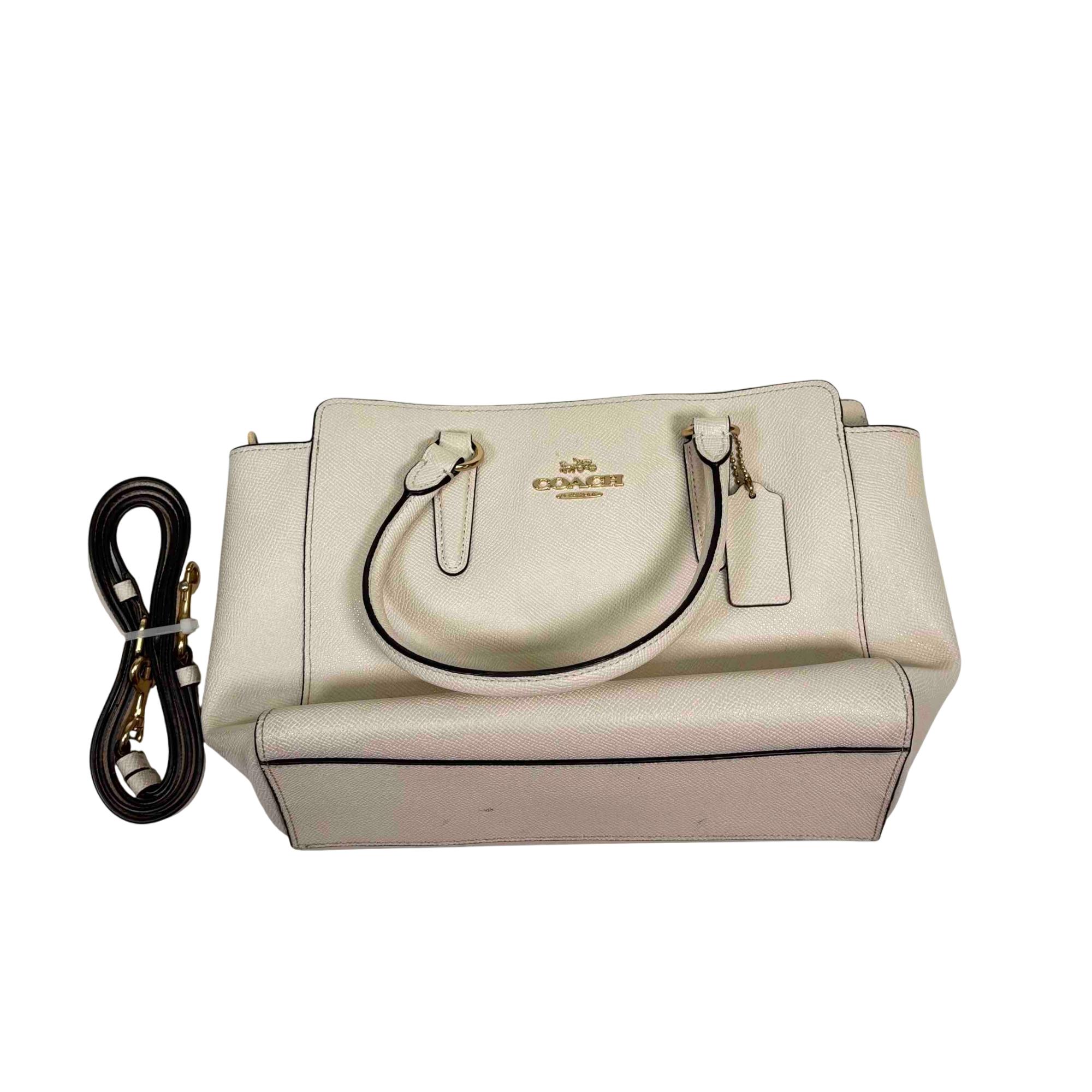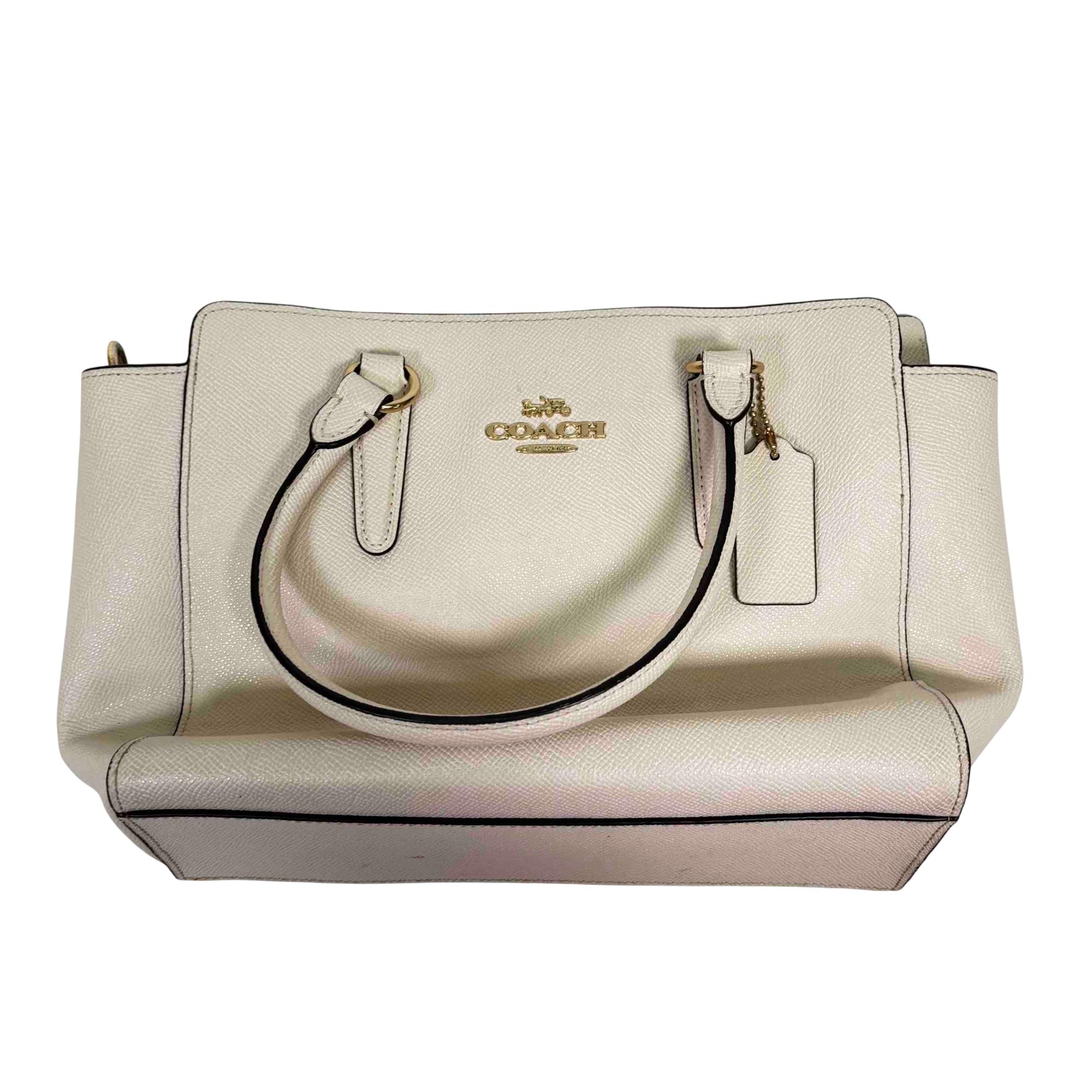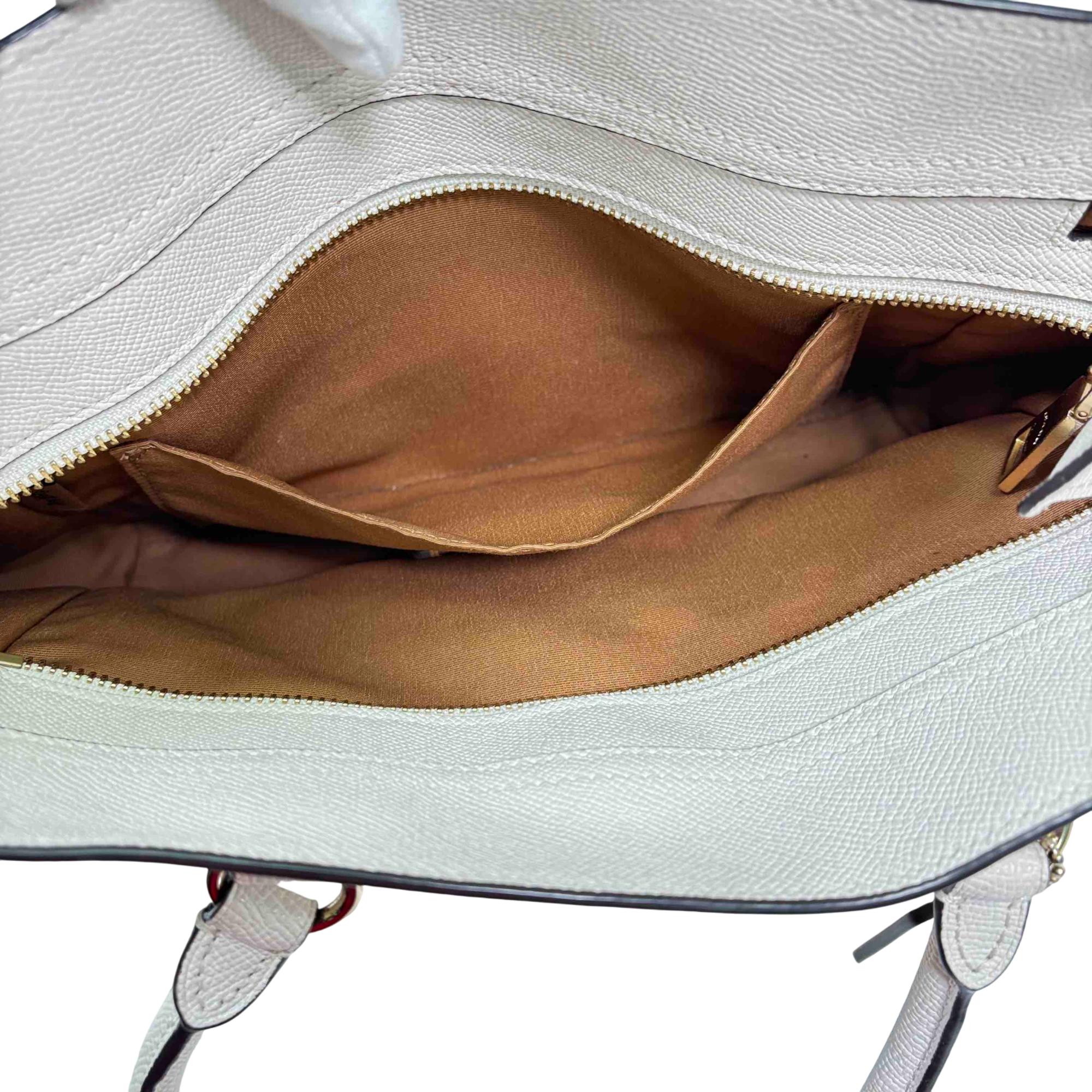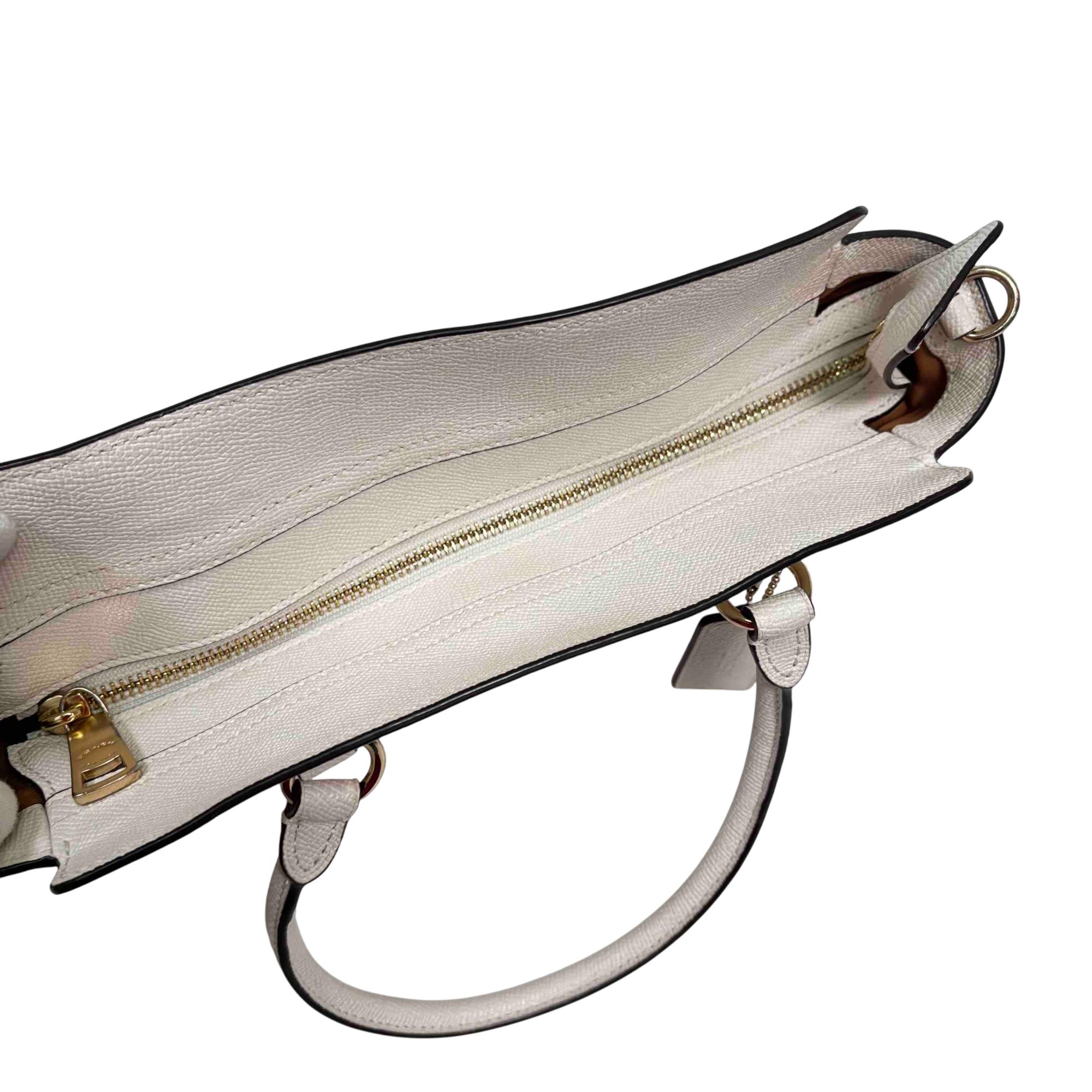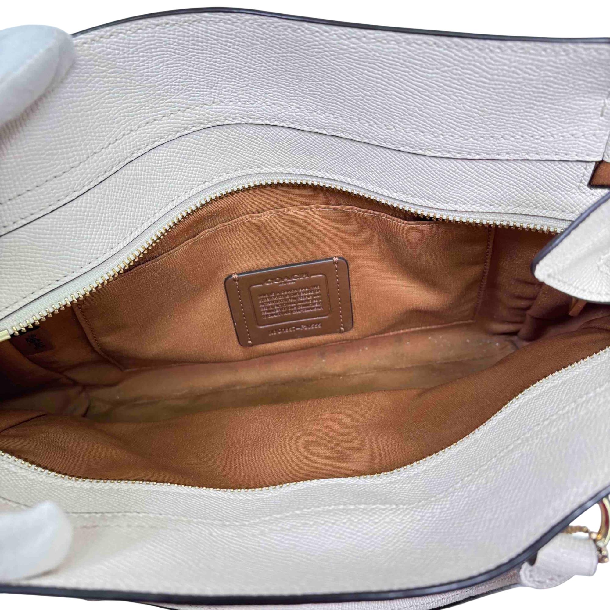 Coach Tabby 26 Shoulder Bag in White Pebble Leather features a sleek white leather exterior contrasted by a brown interior, designed for both style and functionality. This shoulder bag includes a sturdy handle and refined gold-tone hardware, offering a sophisticated accessory perfect for everyday use or special occasions.