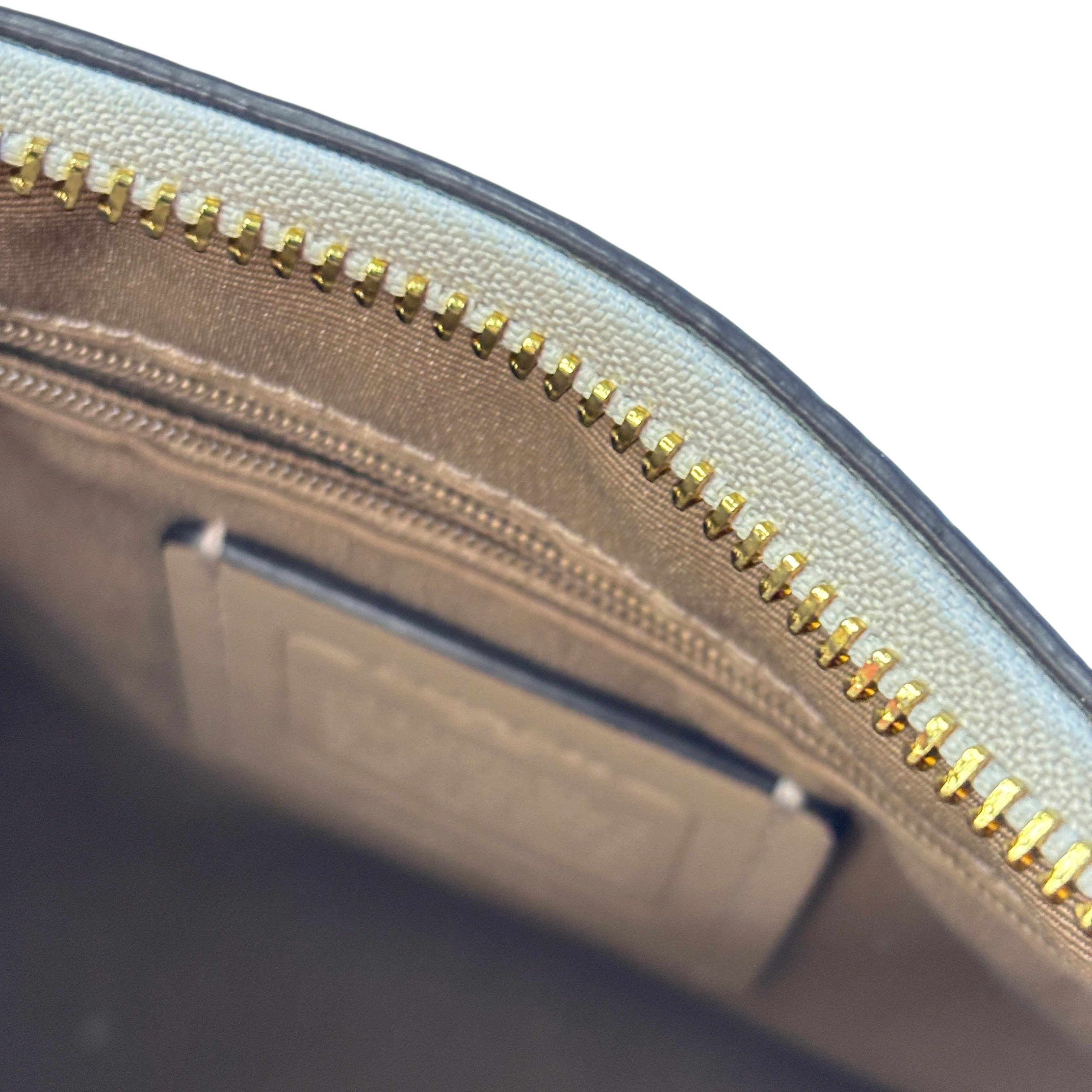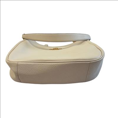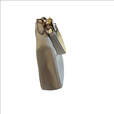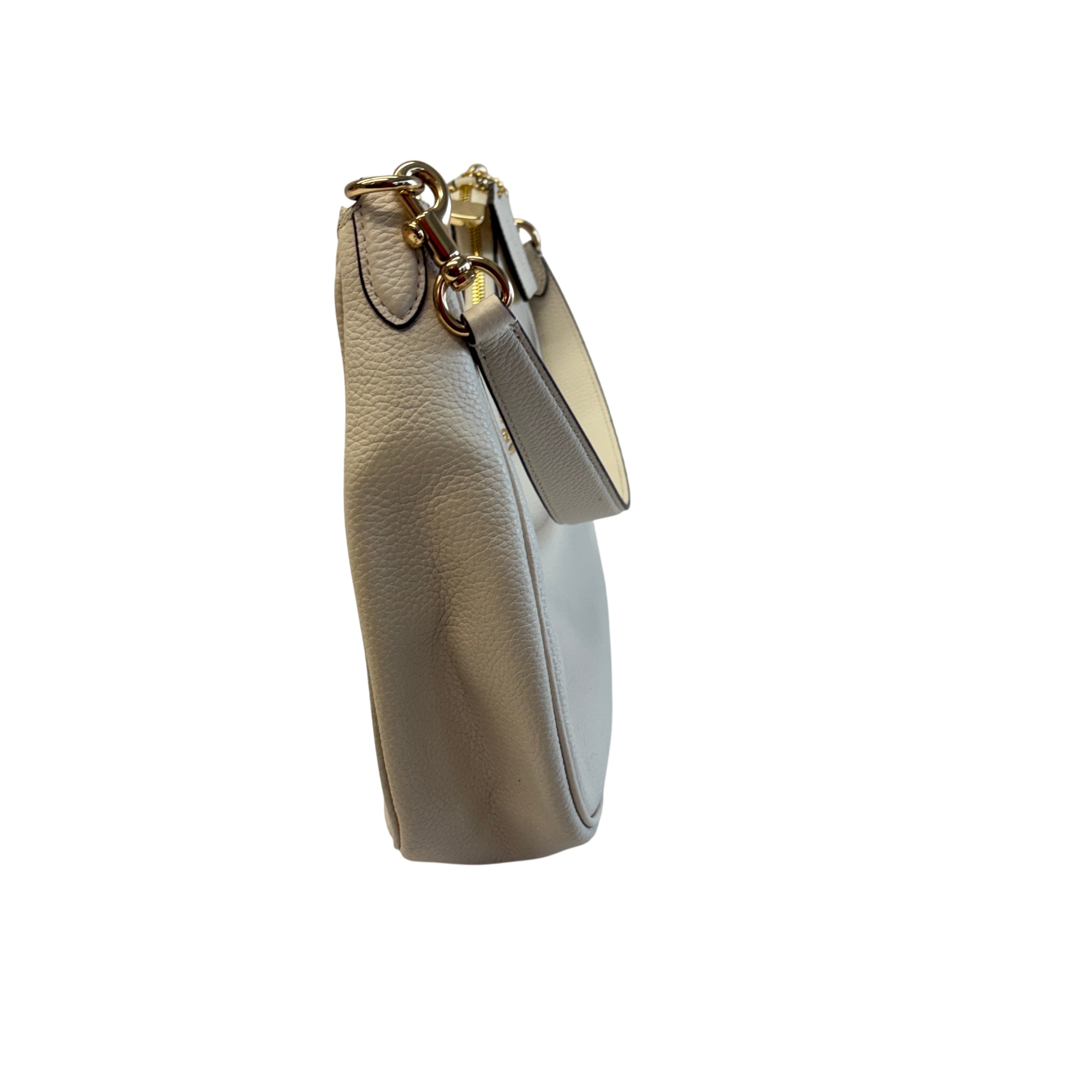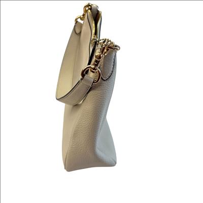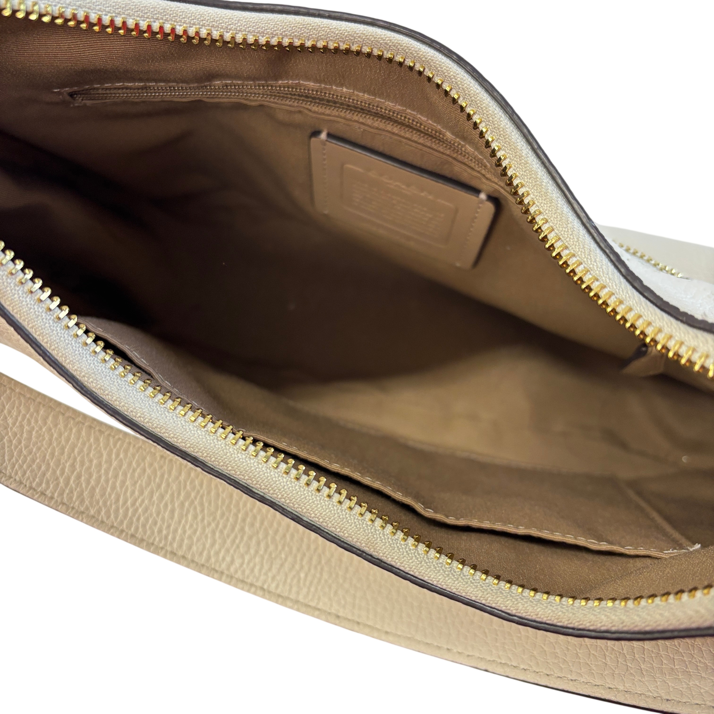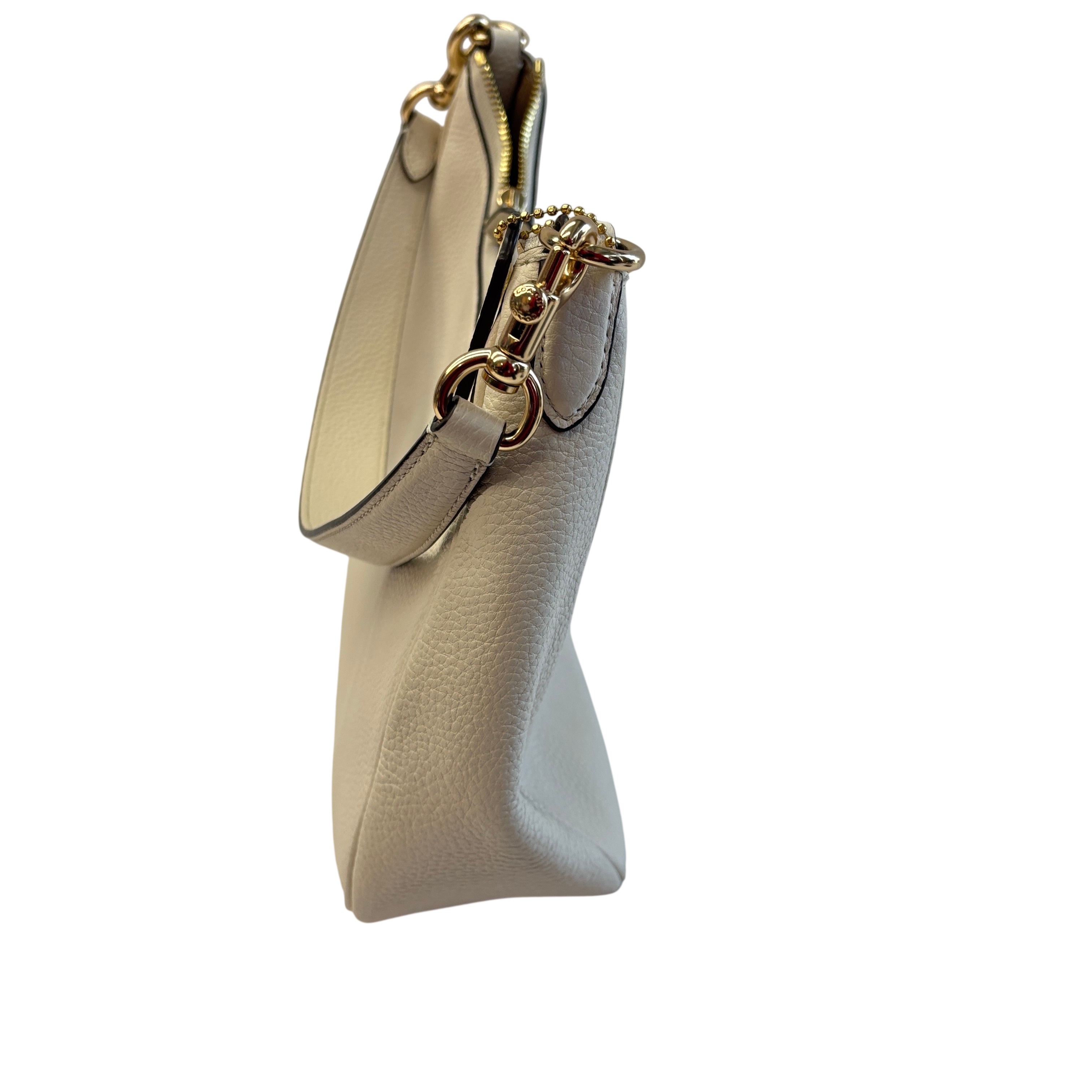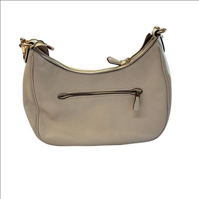 This Coach Purse is crafted from high-quality pebbled leather in a light beige color, featuring elegant gold-tone hardware. This compact shoulder purse offers a top zip closure and a convenient back zip pocket for easy access to essentials. Inside, a fabric lining and interior slip pocket provide organized storage. With dimensions approximately 10 inches in length, 6 inches in height, and 2 inches in width, this purse is a stylish and practical accessory for everyday use.