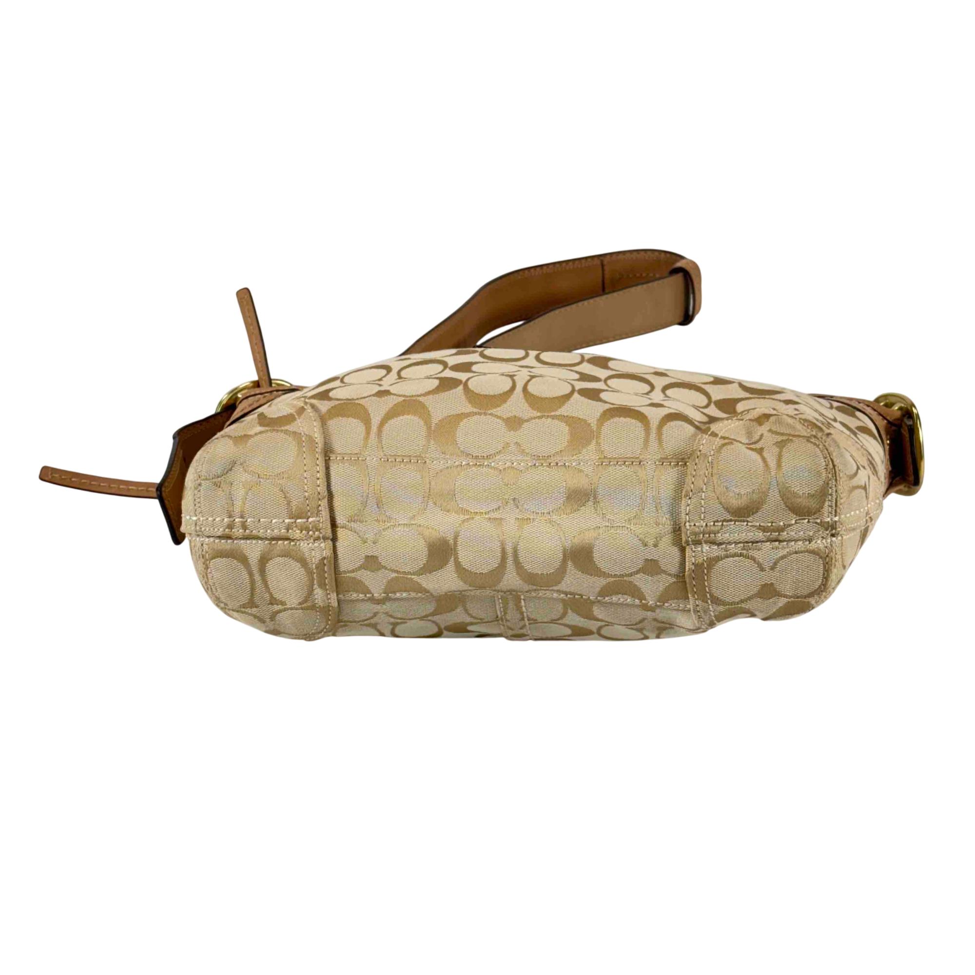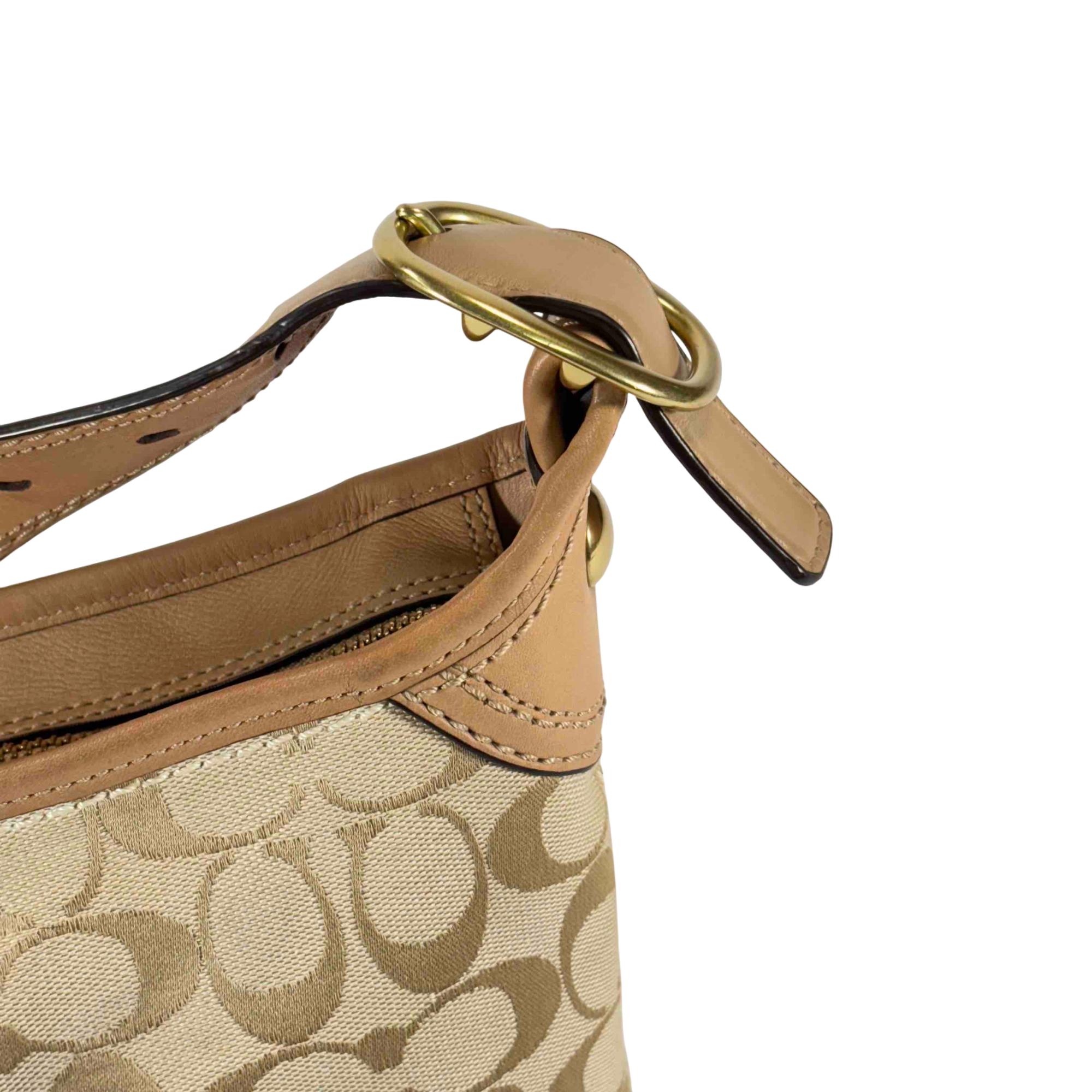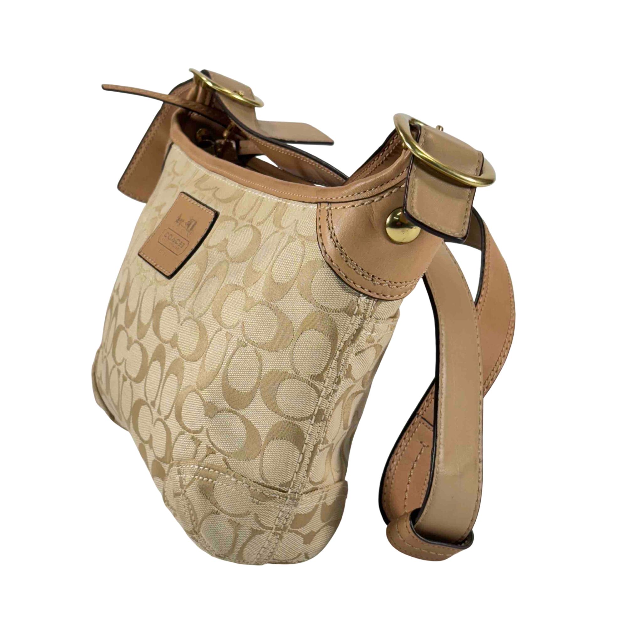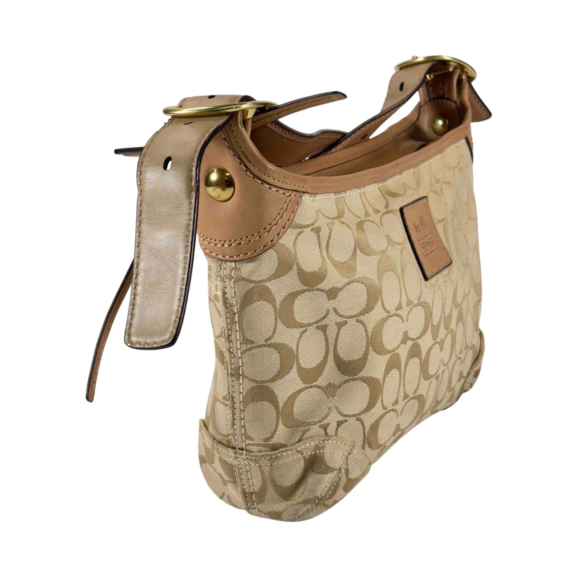 Elevate your style with this stunning Coach Signature Canvas Tan Leather Shoulder Bag. Crafted with attention to detail, it features a luxurious combination of tan leather and classic canvas, accented with a sophisticated gold buckle. Perfect for everyday use or special occasions, this chic handbag offers both elegance and practicality.