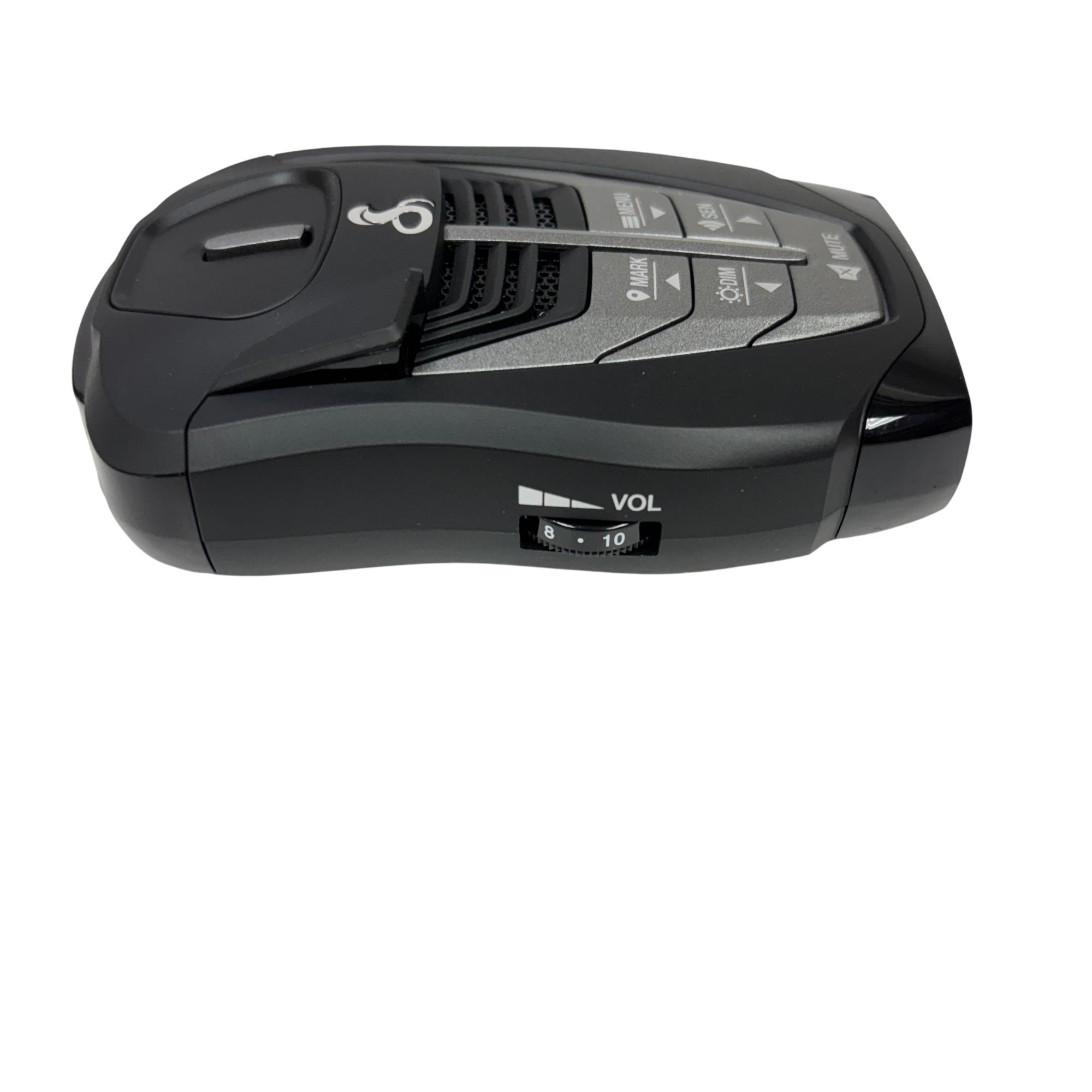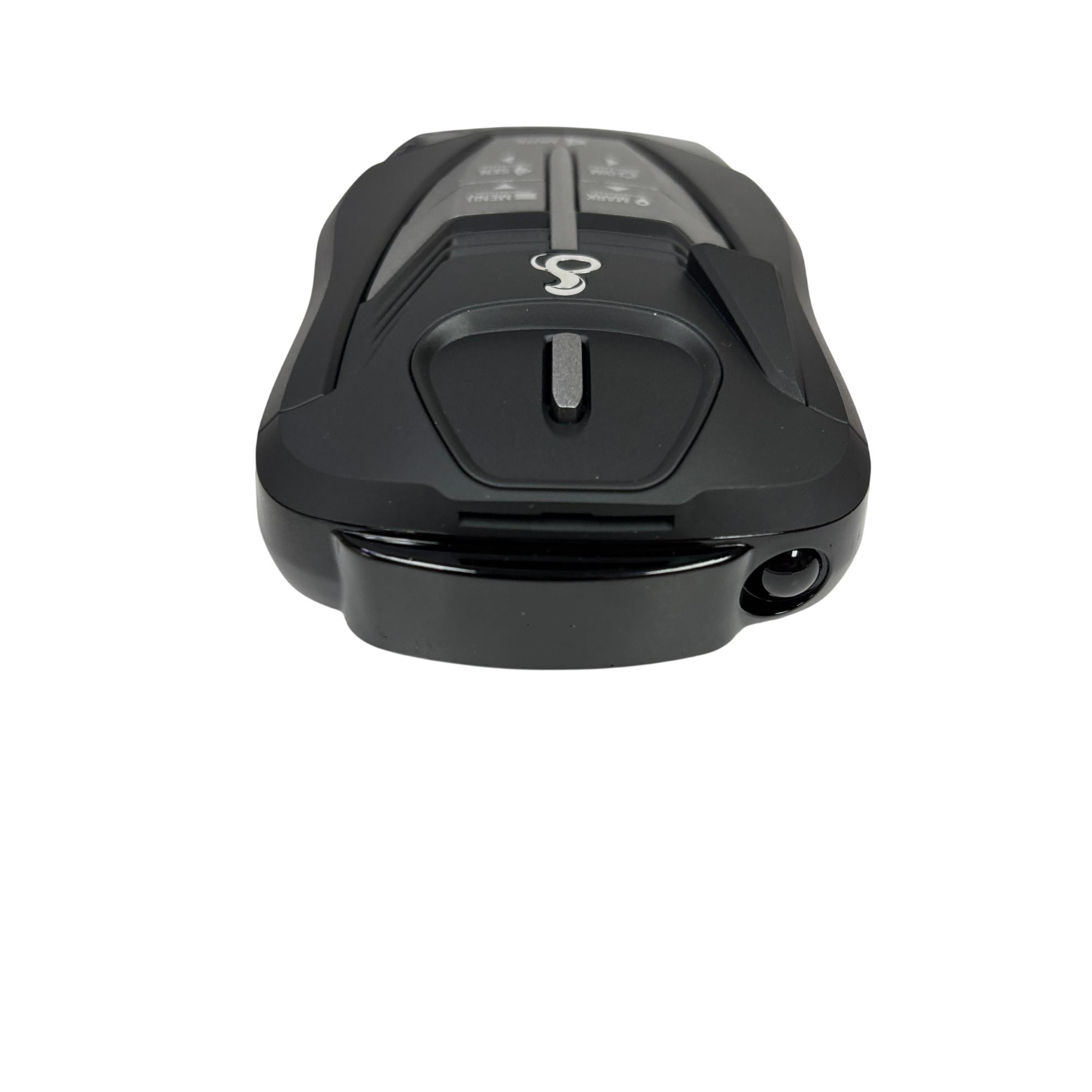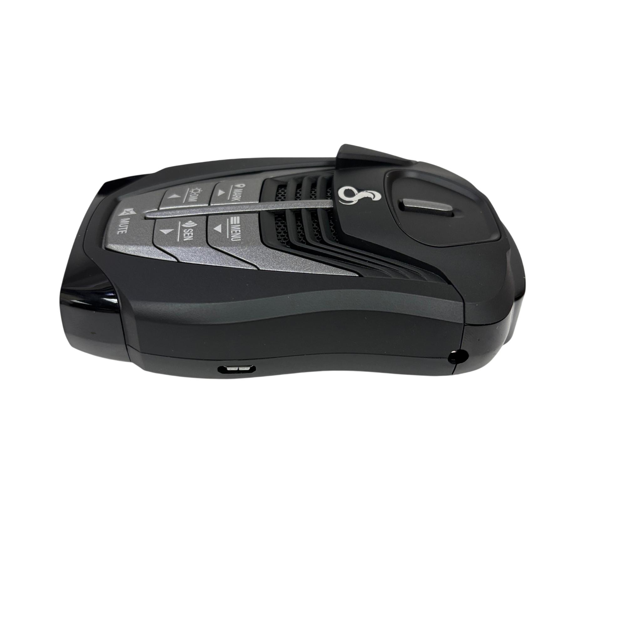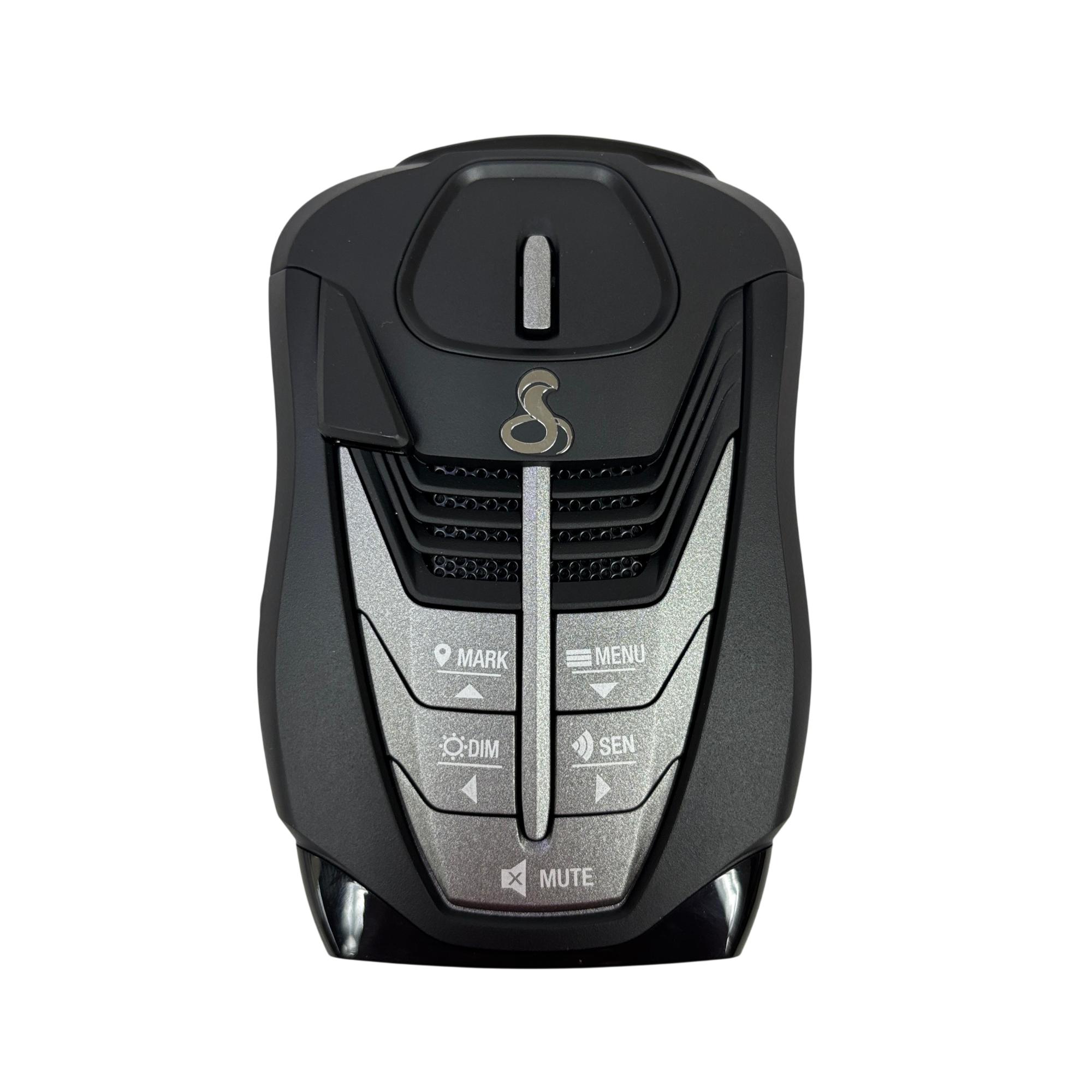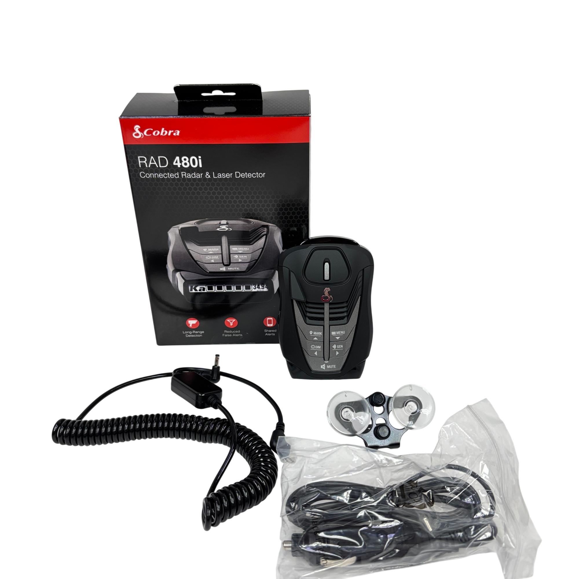 This Cobra RAD 480i Connected Radar & Laser Detector offers advanced long-range detection of radar and laser signals with Bluetooth connectivity for seamless integration with smartphones. This black device features a clear display, multiple control buttons, and voice alerts to help drivers stay informed and avoid false alarms, enhancing on-road safety and convenience.