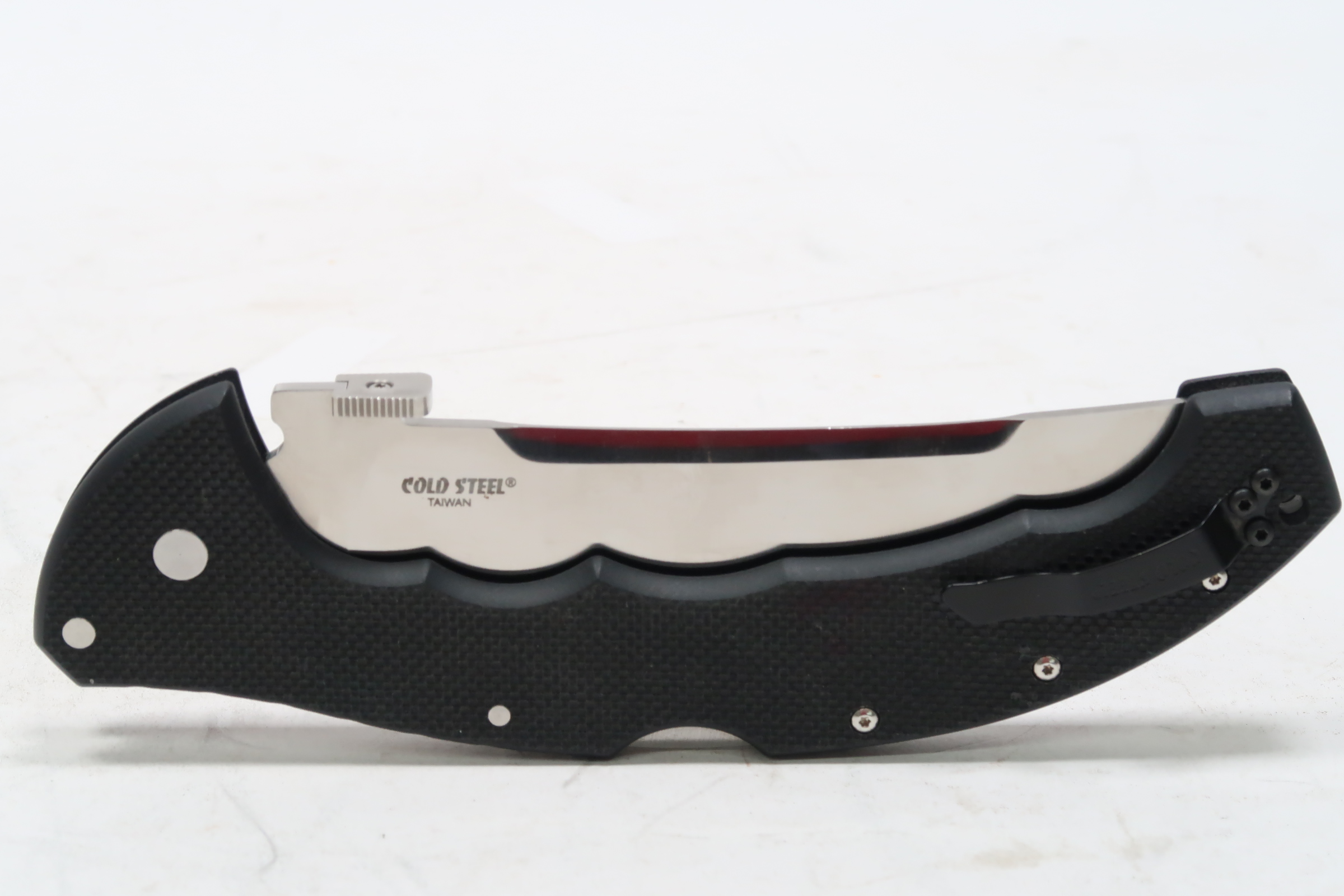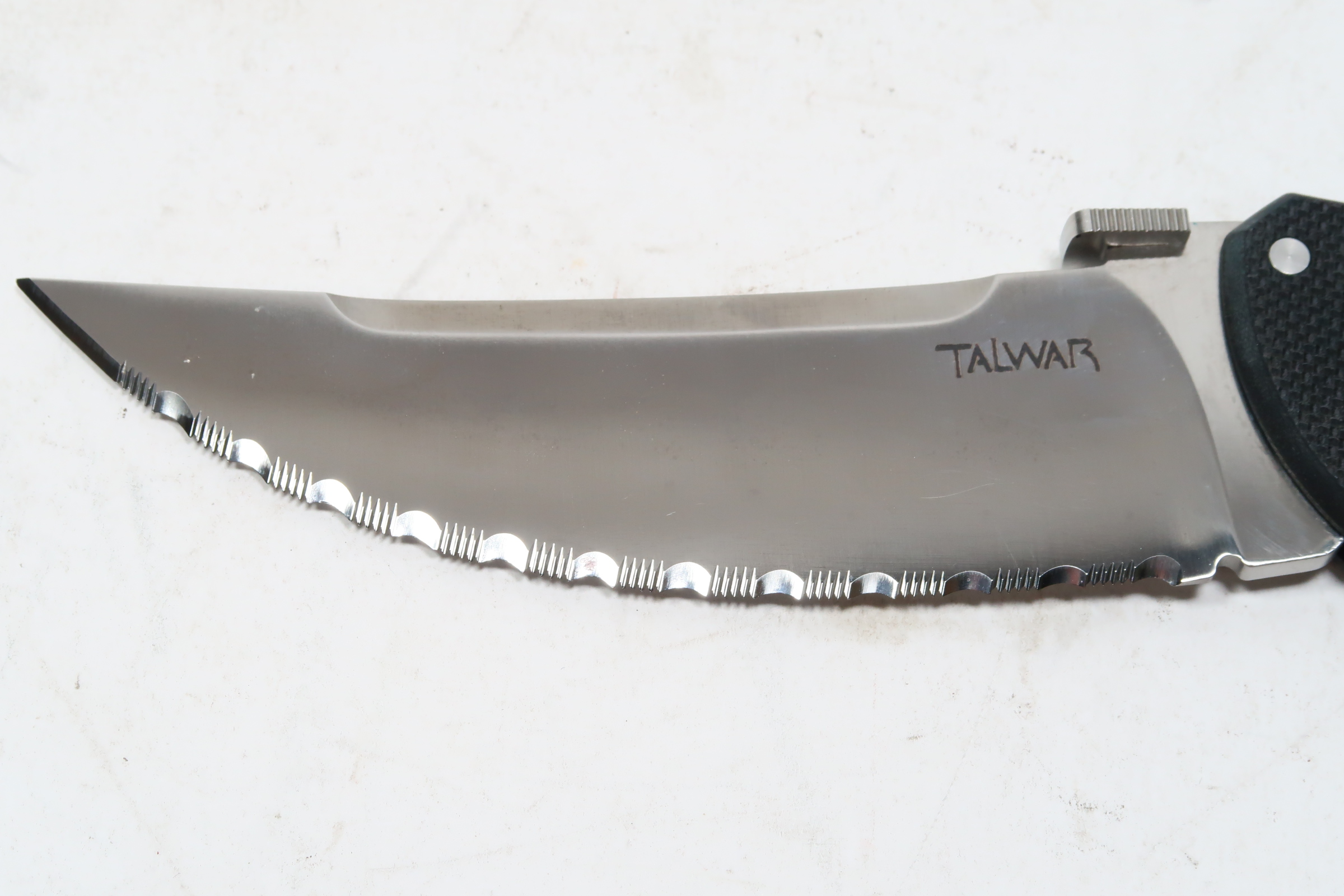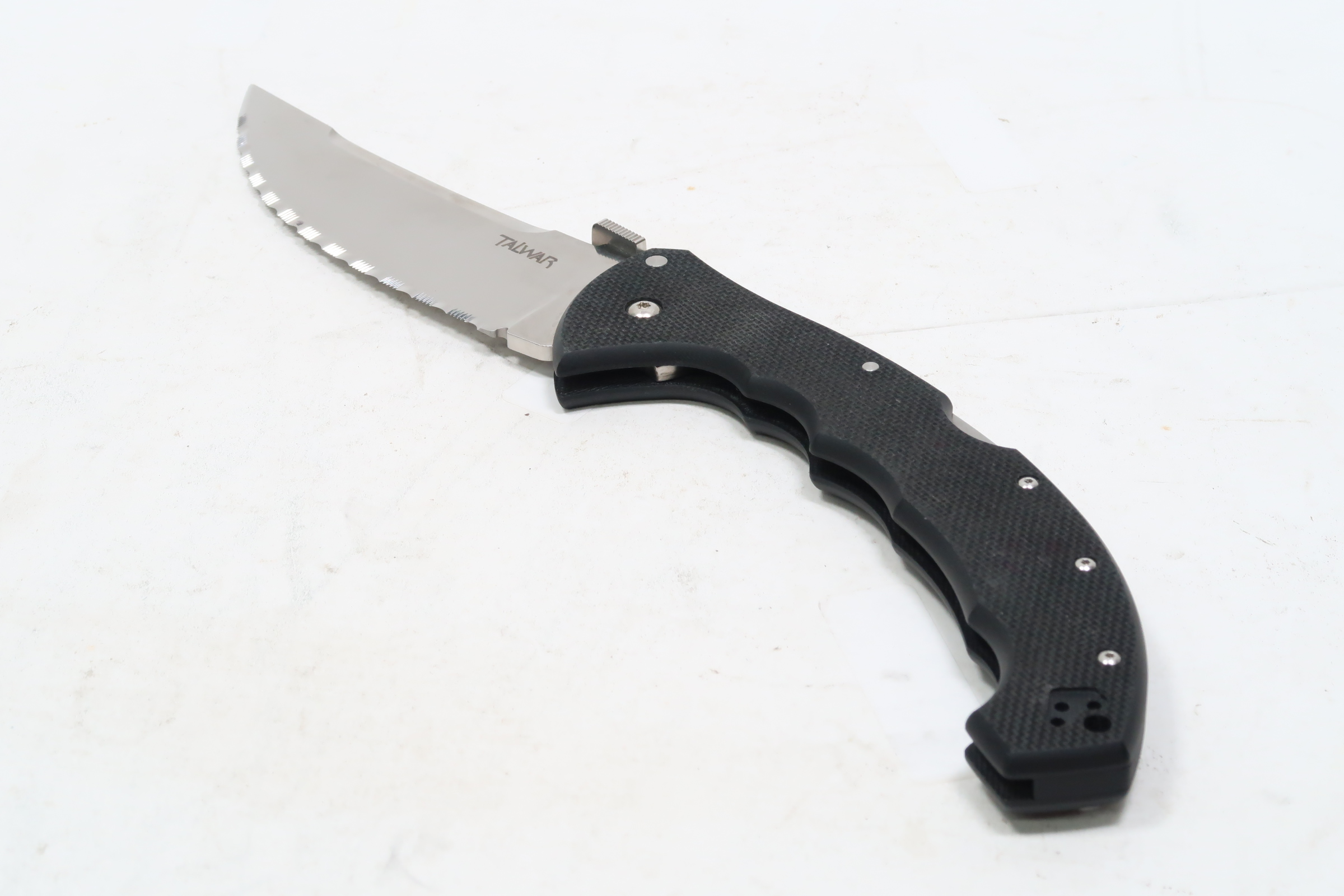 The Cold Steel Talwar XL knife takes inspiration from the traditional, razor sharp, curved blade Indo-Persian sword of the same name. This model, 21TTXL, features a 5.5" plain edge blade. Flat ground with a continuously curved cutting edge from the upswept tip all the way to the choil, the Cold Steel Talwar gives cutting and piercing power unheard of in a folding knife. The handle is American G-10 textured and contoured into a pistol grip style for comfort and safety. Add in the industry leading Tri-Ad lock and you have a knife to be reckoned with. It also has Andrew Demko's ambidextrous thumb plate that allows you to draw-snag the knife as you pull it from your pocket--the power of the Talwar at the speed of lightning.
