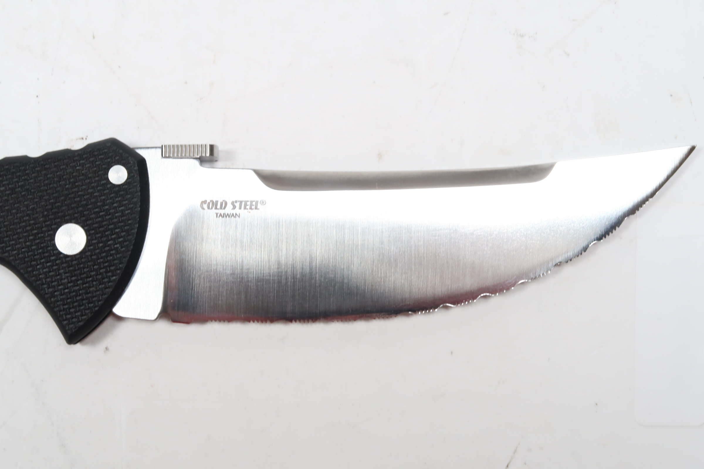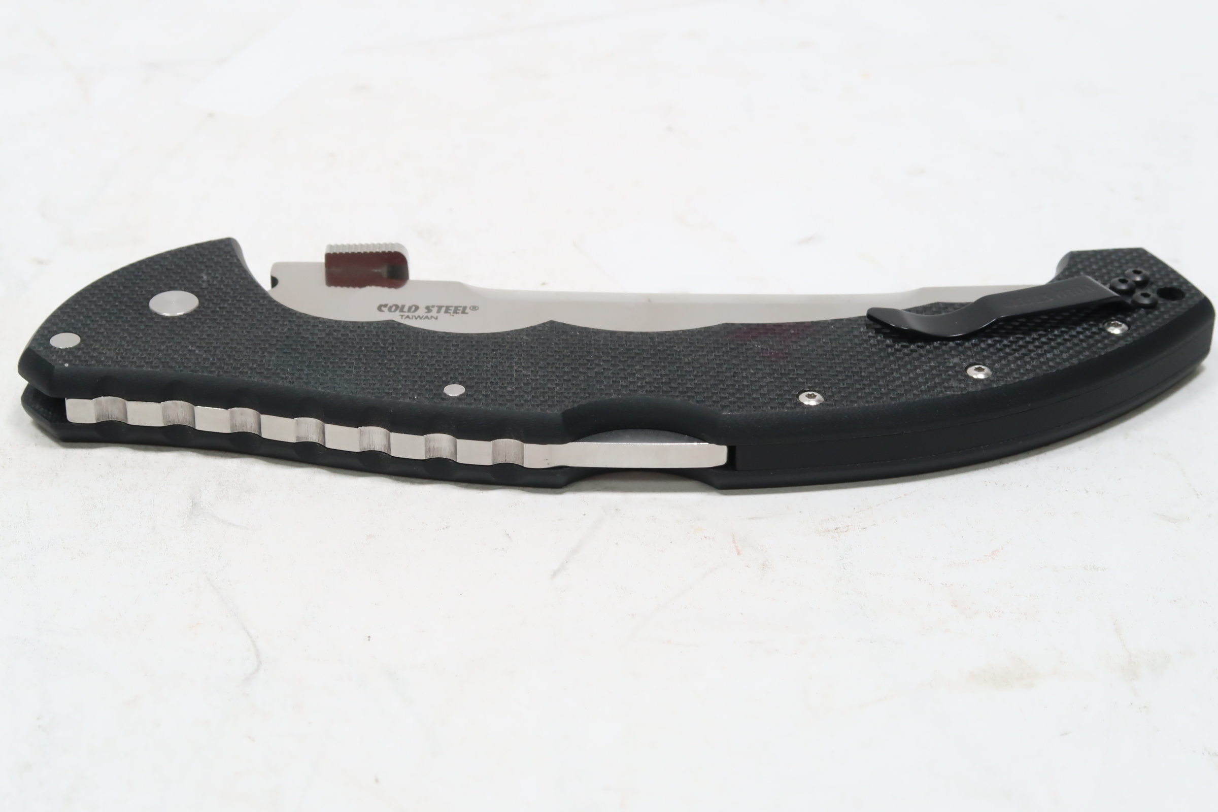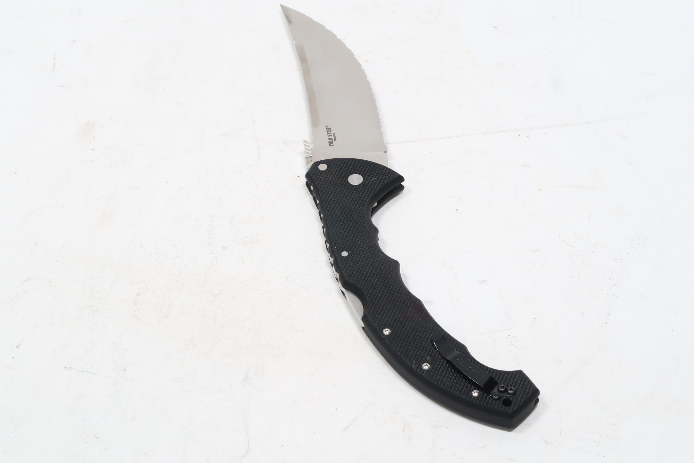 The Cold Steel Talwar XL knife takes inspiration from the traditional, razor sharp, curved blade Indo-Persian sword of the same name. This model, 21TTXL, features a 5.5" plain edge blade. Flat ground with a continuously curved cutting edge from the upswept tip all the way to the choil, the Cold Steel Talwar gives cutting and piercing power unheard of in a folding knife. The handle is American G-10 textured and contoured into a pistol grip style for comfort and safety. Add in the industry leading Tri-Ad lock and you have a knife to be reckoned with. It also has Andrew Demko's ambidextrous thumb plate that allows you to draw-snag the knife as you pull it from your pocket--the power of the Talwar at the speed of lightning.