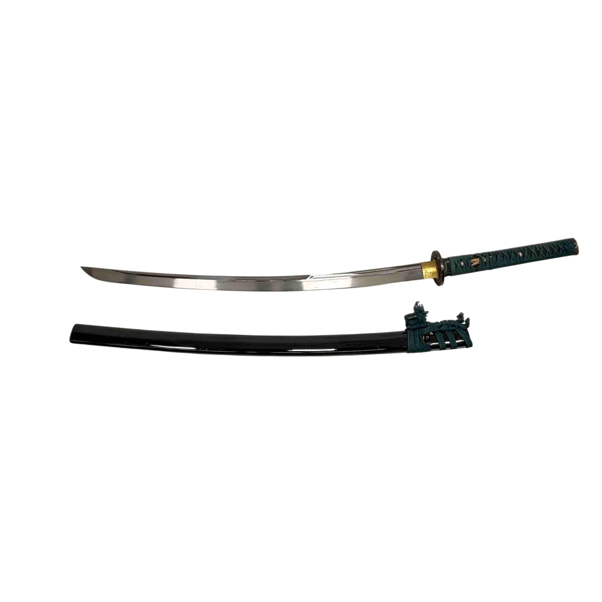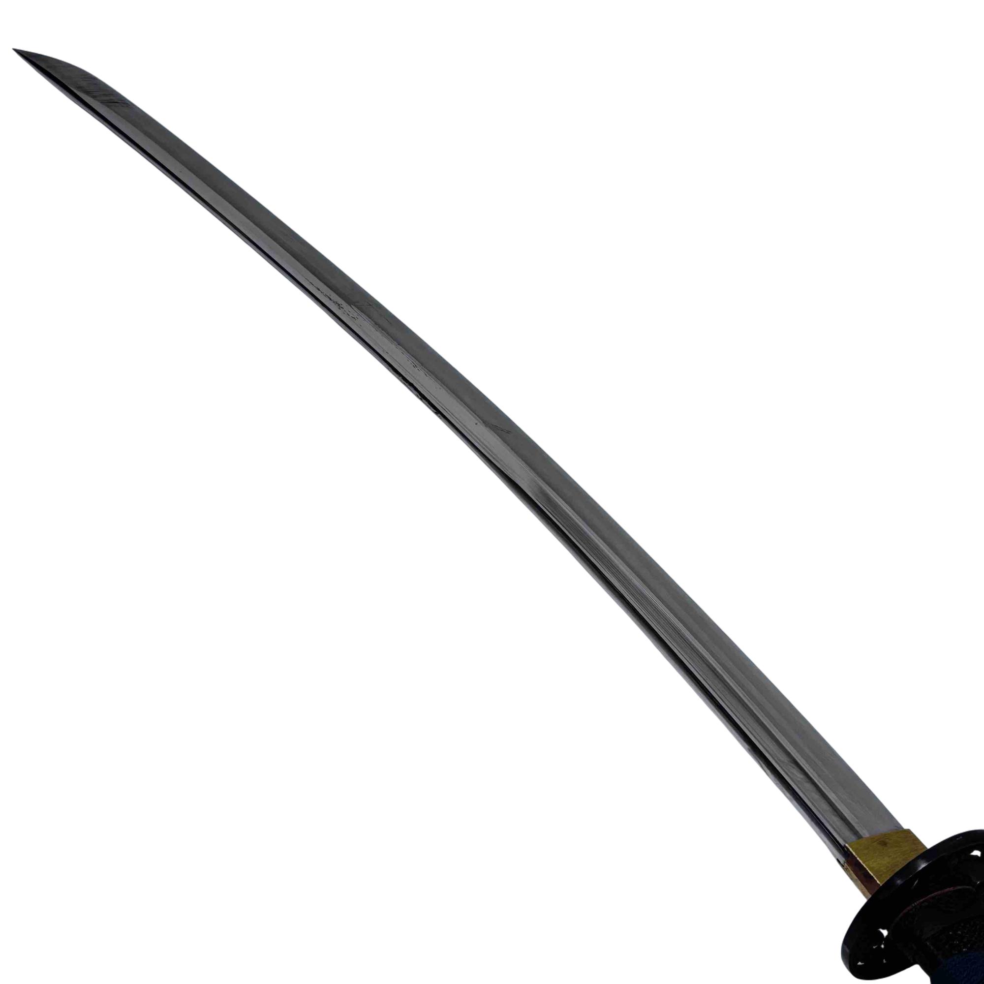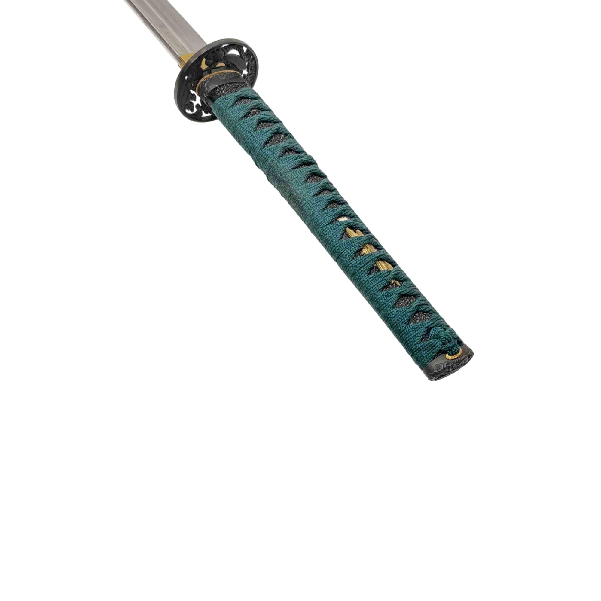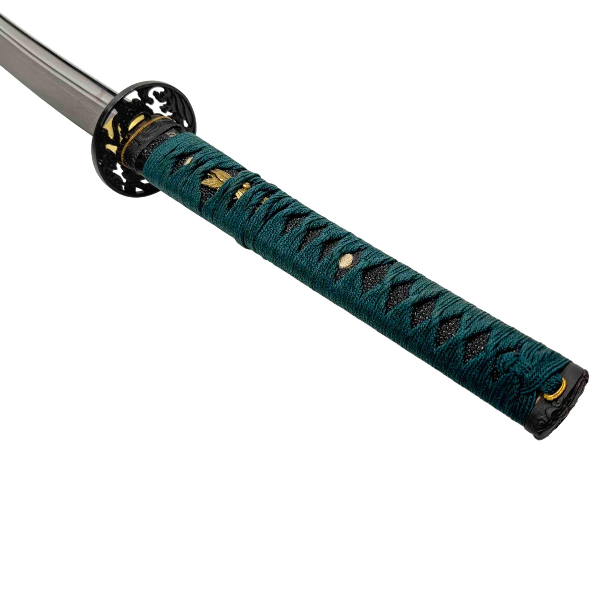 The Dragonfly Katana is a beautiful sword with a distinctive teal-green silk cord-wrap and black same (ray skin) handles, complementing rich iron furniture with a dragonfly motif. Their deeply curved and hand polished 1060 steel blades terminate in a long "iris leaf" point for maximum cutting potential.