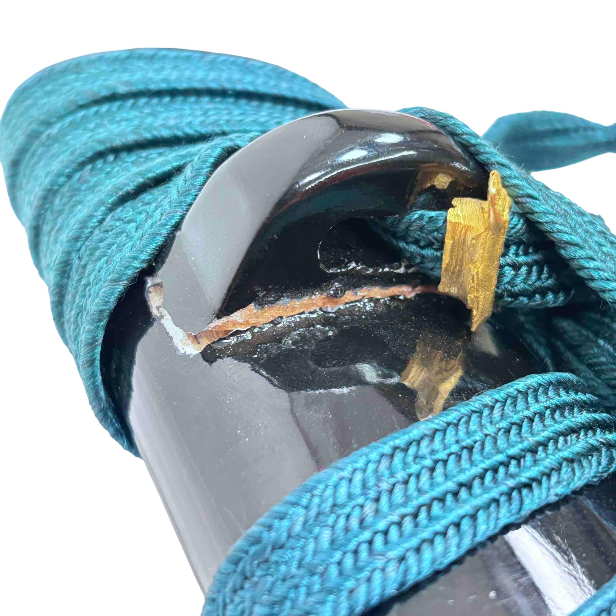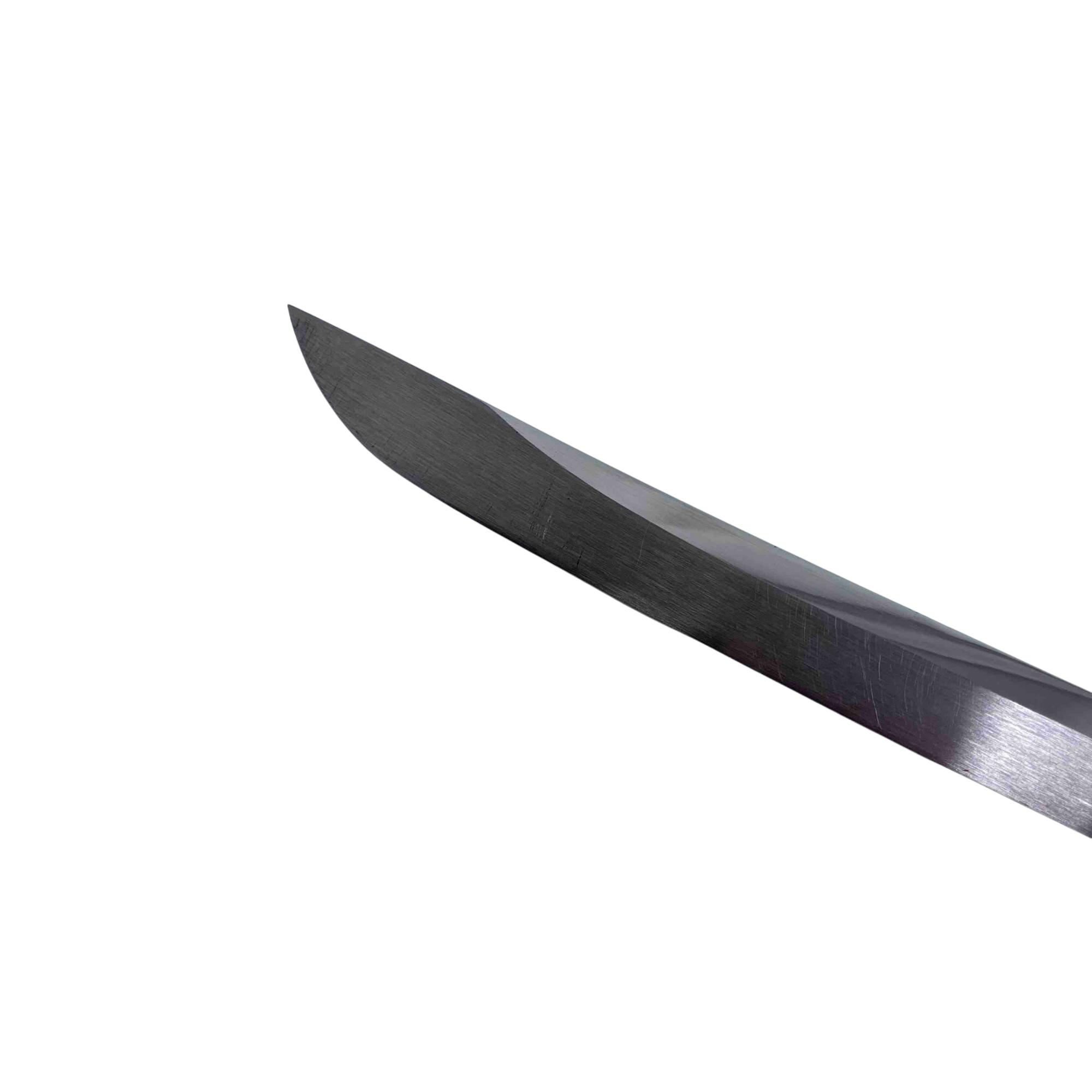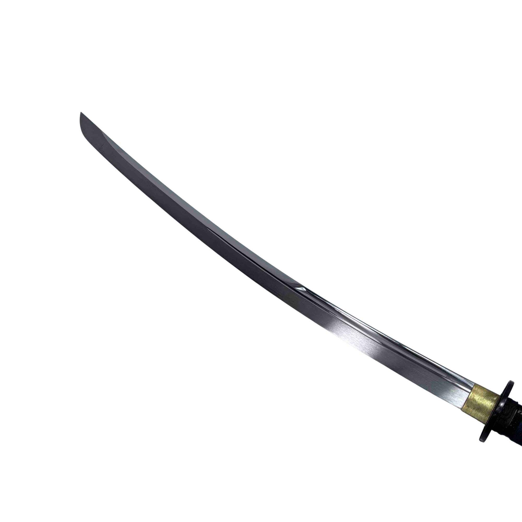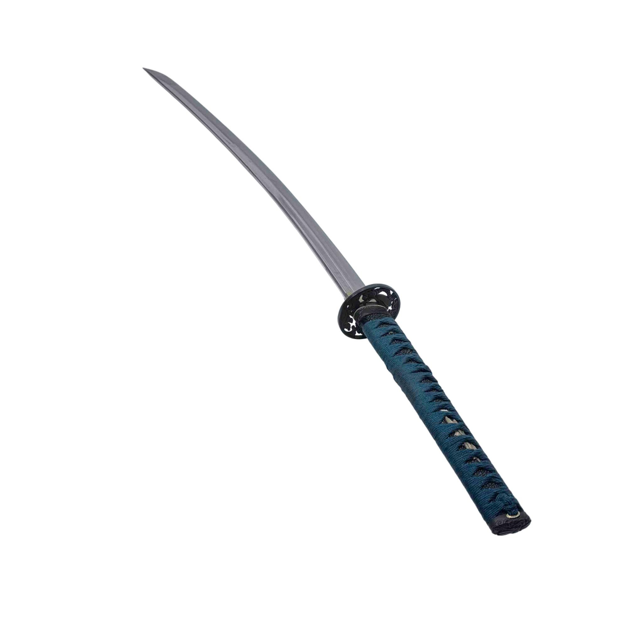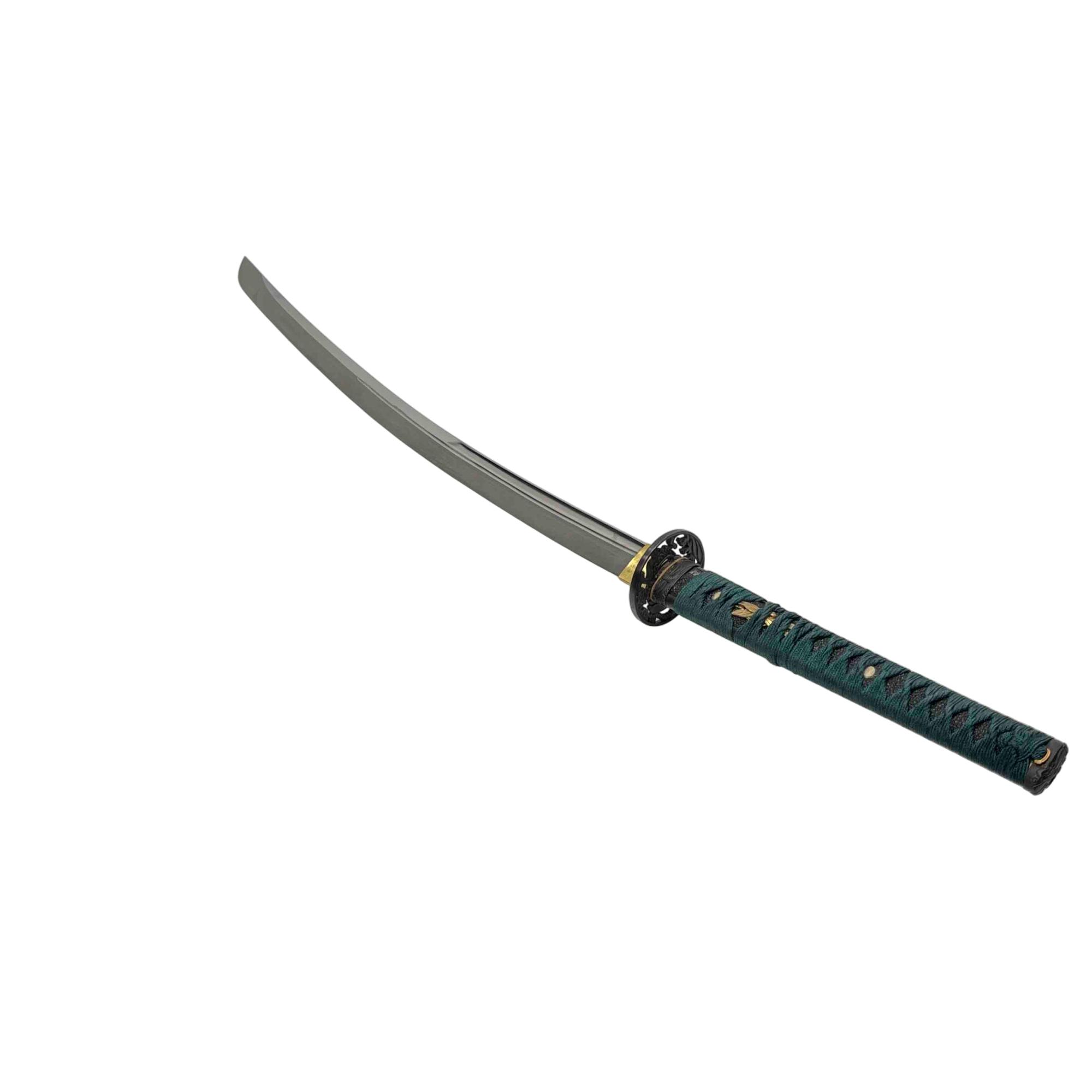 The Dragonfly Katana is a beautiful sword with a distinctive teal-green silk cord-wrap and black same (ray skin) handles, complementing rich iron furniture with a dragonfly motif. Their deeply curved and hand polished 1060 steel blades terminate in a long "iris leaf" point for maximum cutting potential.