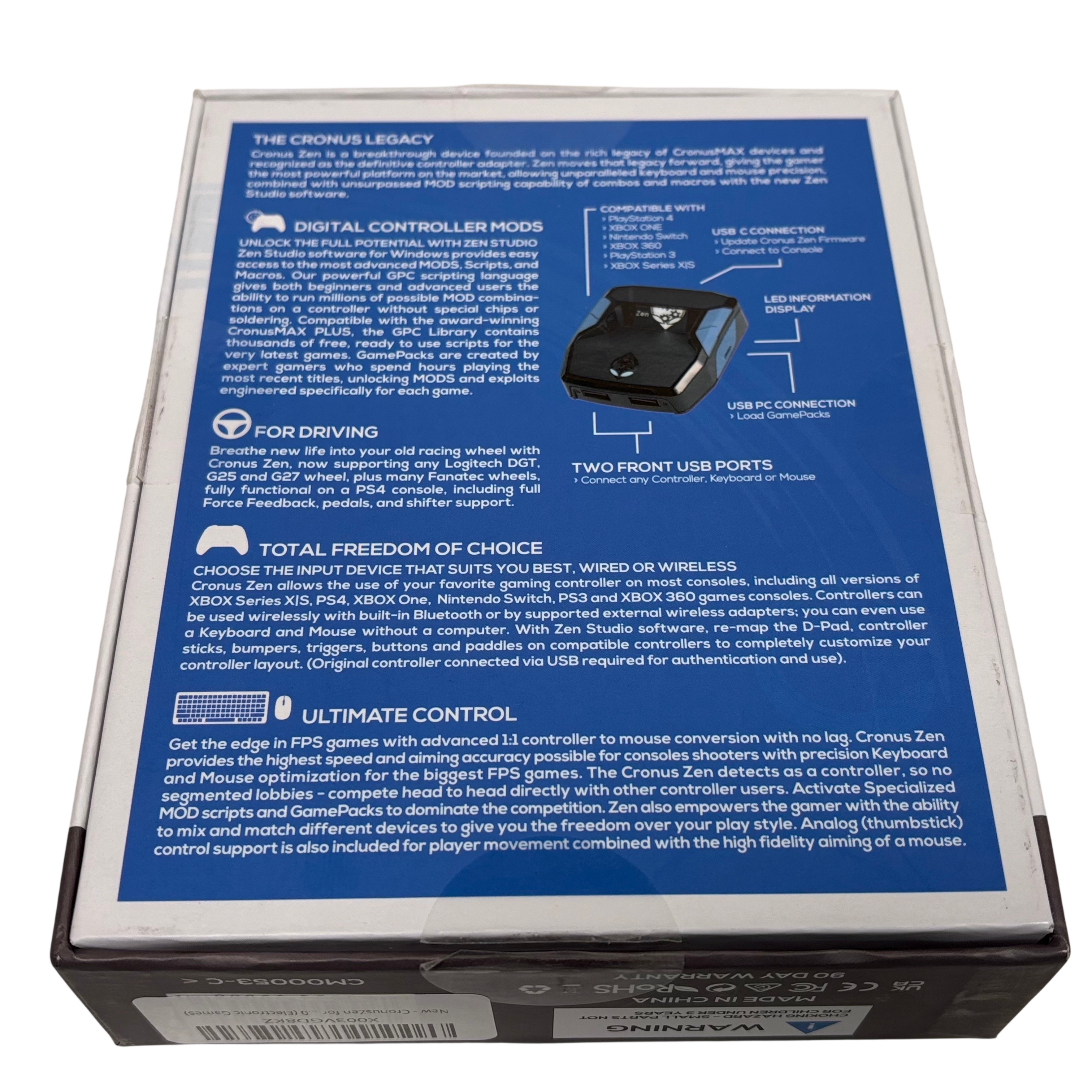 This Collective Minds Cronus Zen CM00053-C is a versatile gaming controller adapter that allows you to use almost any controller on popular consoles including PS4, Xbox One, Nintendo Switch, Xbox Series X|S, Xbox 360, and PS3. Featuring built-in Bluetooth and support for external wireless adapters, it offers precision control with keyboard and mouse for consoles. The device supports advanced controller to mouse conversion with no lag, MODscripts, and GamePacks, empowering gamers to customize layouts and gain an edge in FPS games. Included is the Cronus Zen device and a durable braided USB cable, making it an essential tool for competitive and casual gamers alike.