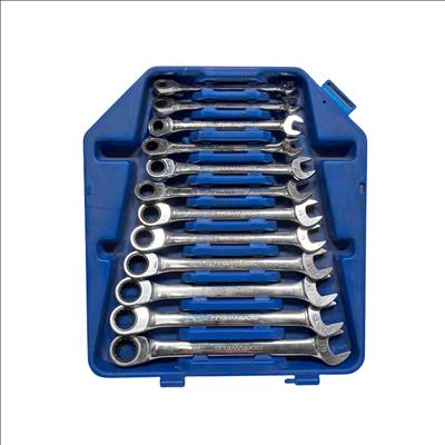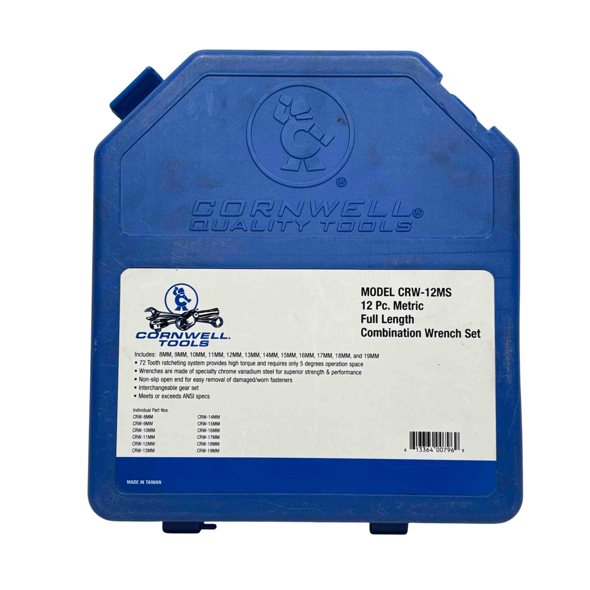 Cornwell CRW12MS 12-Piece Metric Full Length Ratcheting Combination Wrench Set features durable, precision-engineered wrenches designed for efficient fastening and loosening of metric bolts. Each wrench offers full-length construction with ratcheting combination ends, housed in a convenient blue plastic case for organized storage and portability.