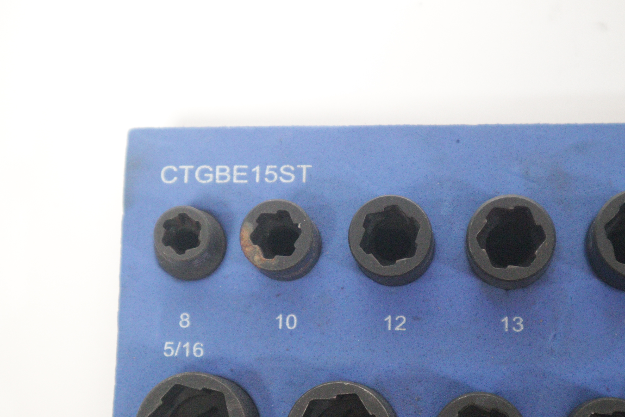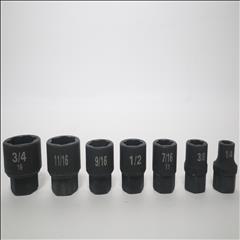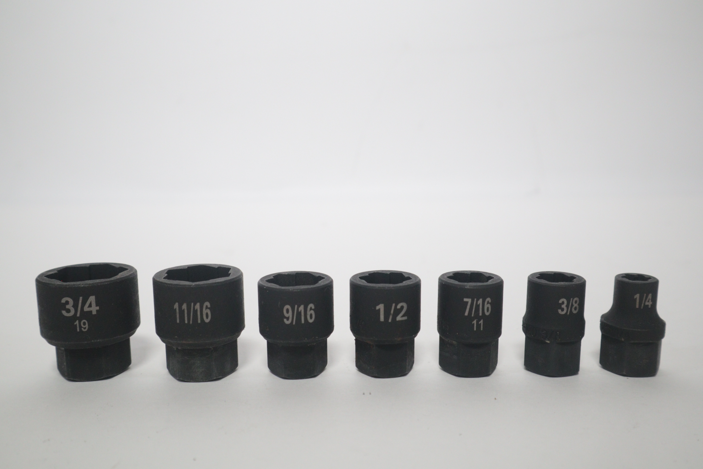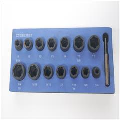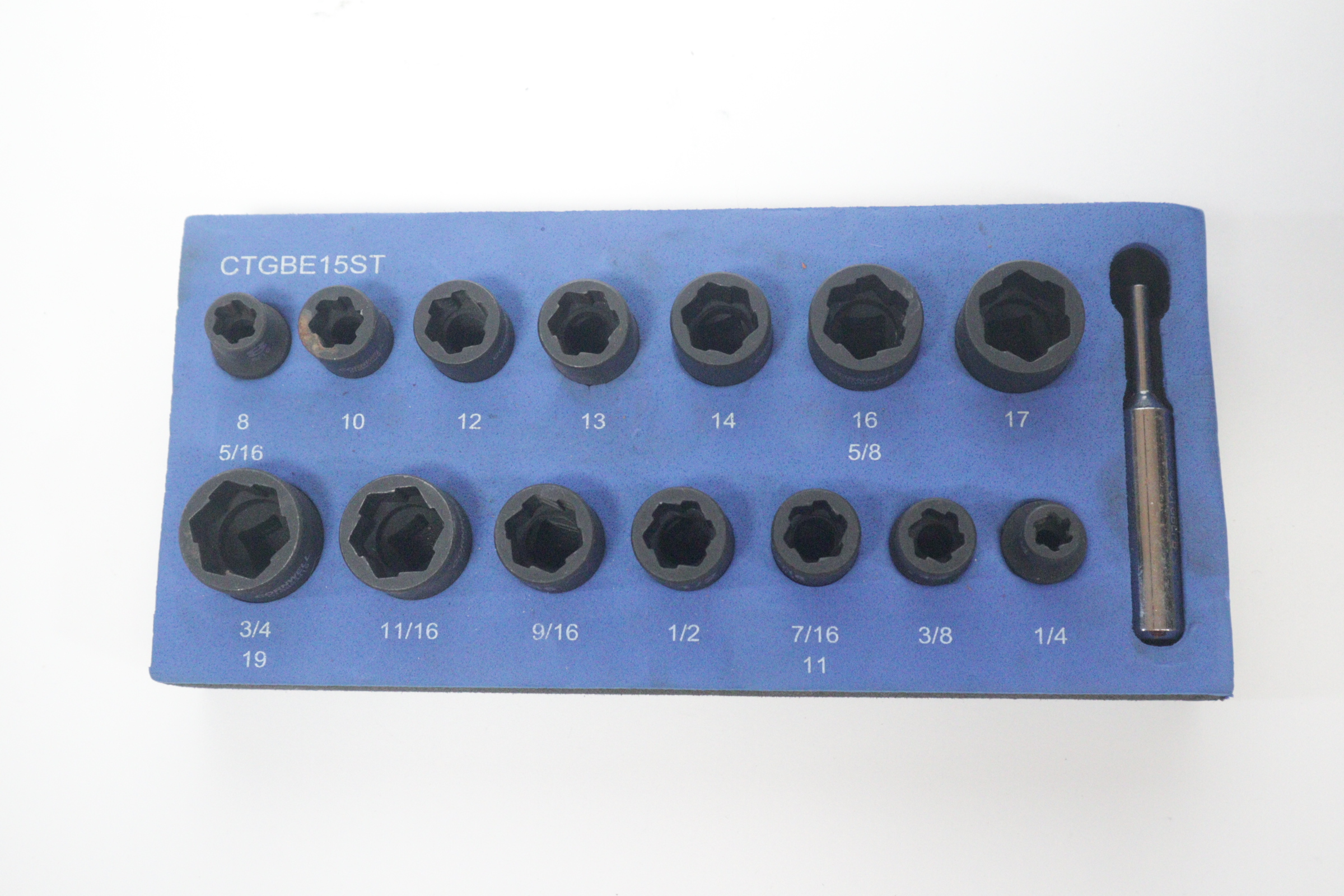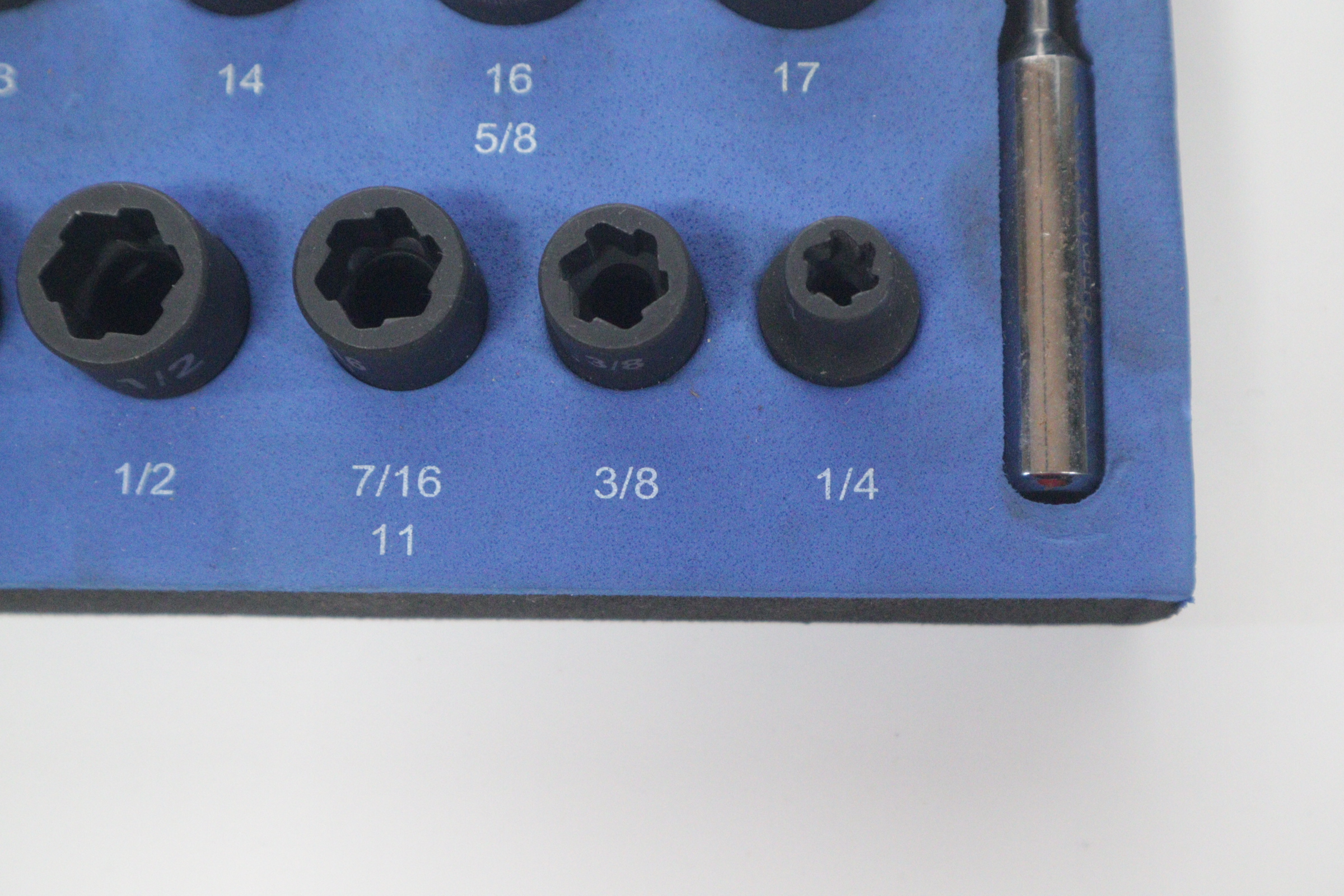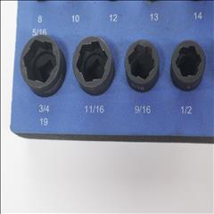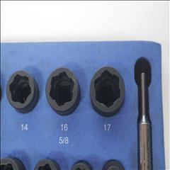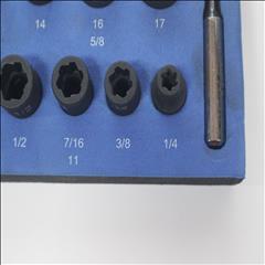 Service end provides greater surface control for less chance of slipping and less chance of damaging bolt. May be used to remove broken bolts or replace new bolts. Size range includes 1 each: 1/4", 3/8", 7/16" (11mm), 1/2", 9/16", 5/8" (16mm), 11/16", 3/4" (19mm), 8mm (5/16"), 10mm, 12mm, 13mm, 14mm, 17mm. Also includes punch bar.