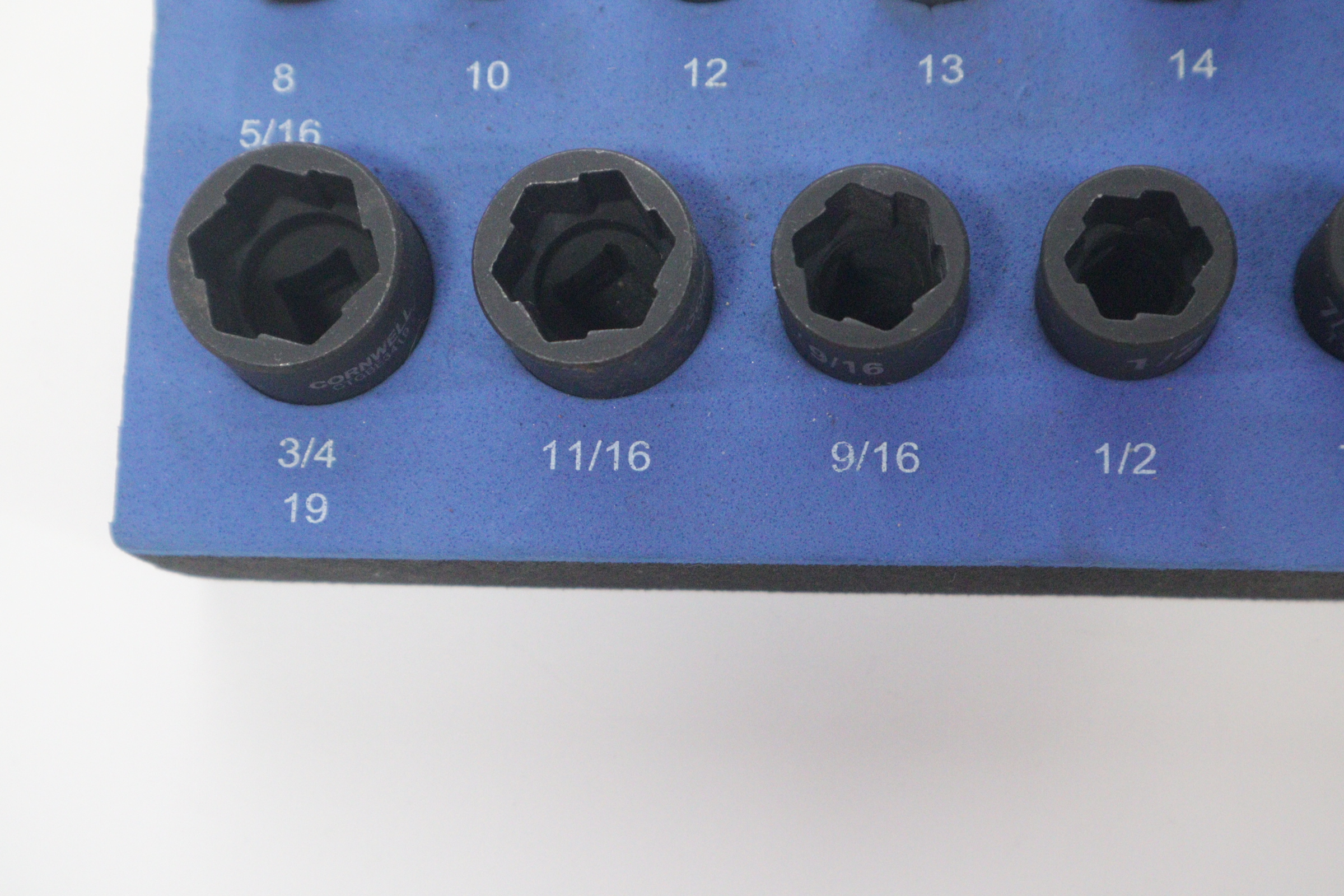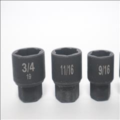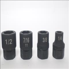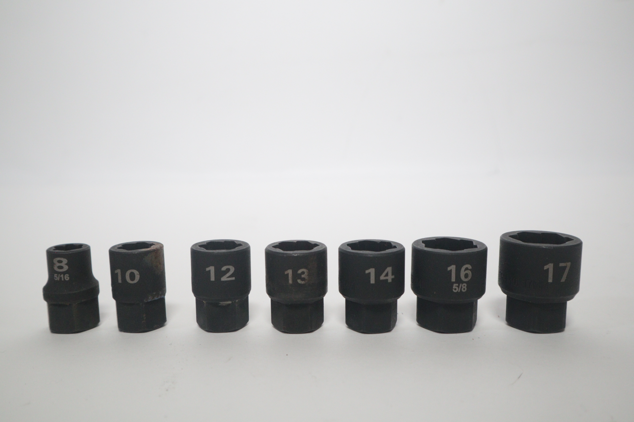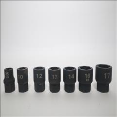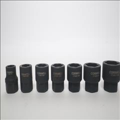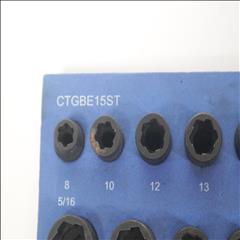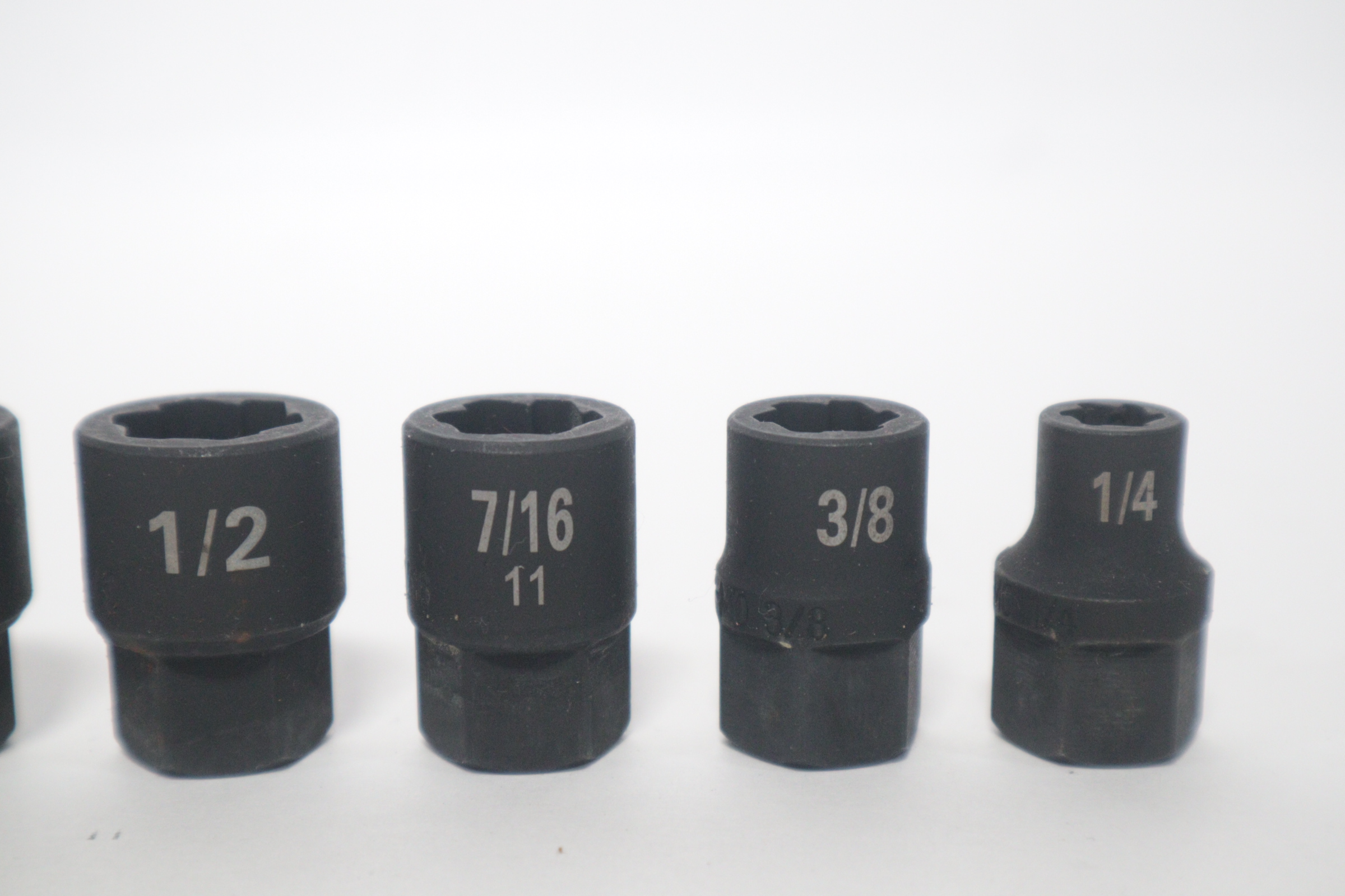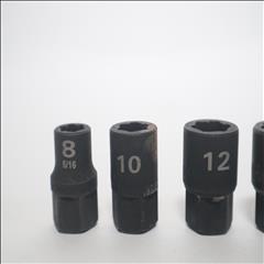 Service end provides greater surface control for less chance of slipping and less chance of damaging bolt. May be used to remove broken bolts or replace new bolts. Size range includes 1 each: 1/4", 3/8", 7/16" (11mm), 1/2", 9/16", 5/8" (16mm), 11/16", 3/4" (19mm), 8mm (5/16"), 10mm, 12mm, 13mm, 14mm, 17mm. Also includes punch bar.