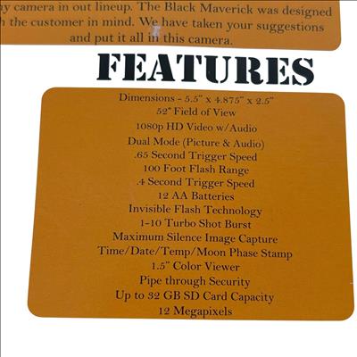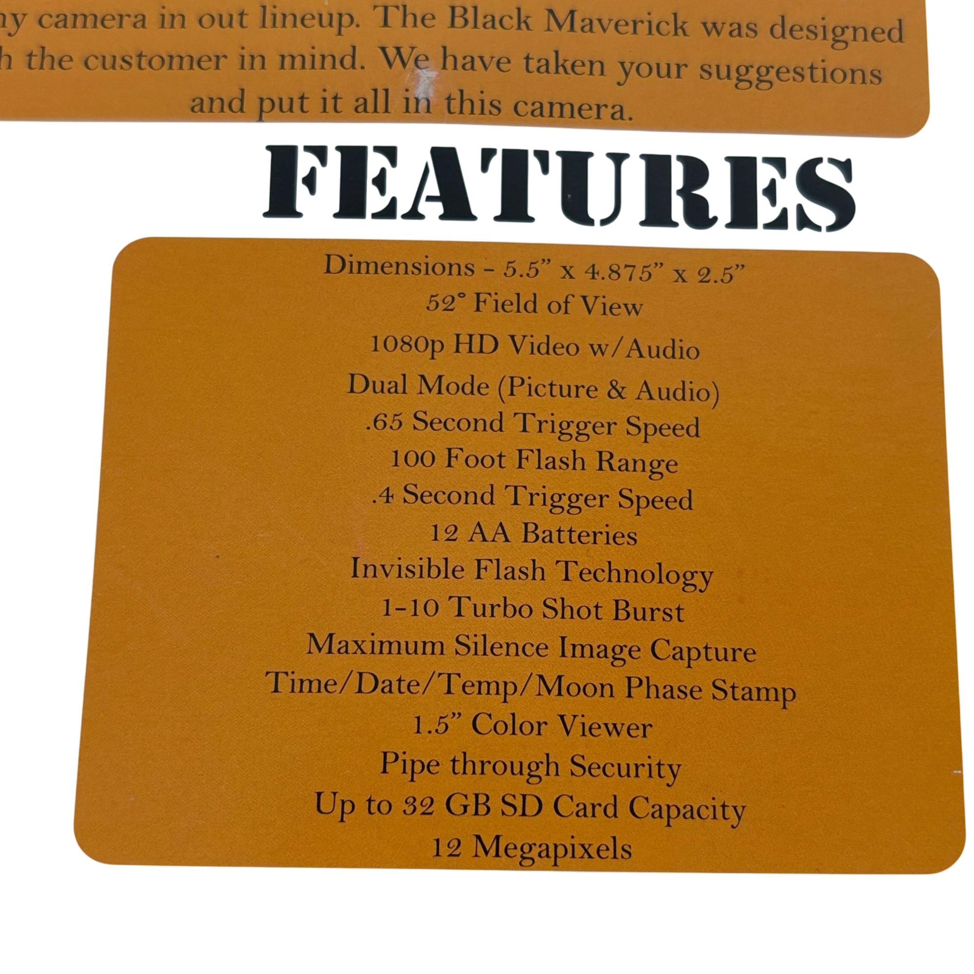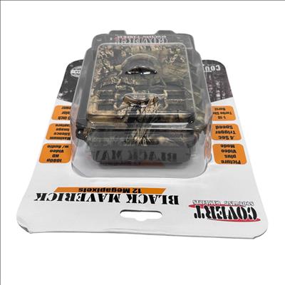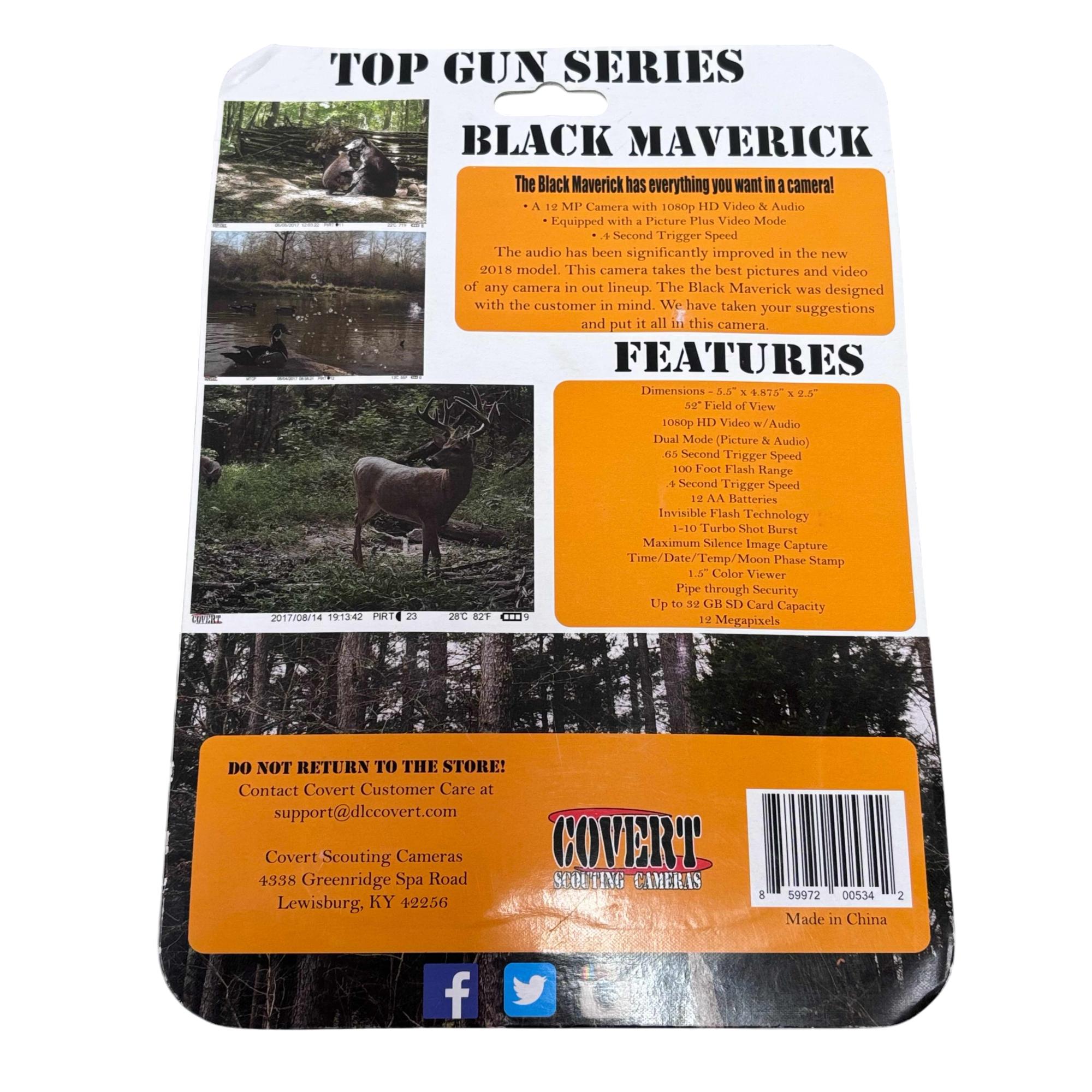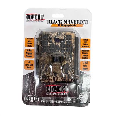 Covert Scouting Cameras Black Maverick Trail Camera 12 Megapixels (Break-Up Country Camouflage Edition) delivers high-quality 1080p HD video with audio and crisp 12-megapixel images. It features a rapid 0.4-second trigger speed, invisible flash technology for stealthy night captures, and a wide 52-degree field of view optimized for outdoor surveillance. Designed for durability and covert operation, this trail camera includes a 1.5-inch color viewer and supports up to 32 GB SD cards for extensive data storage.