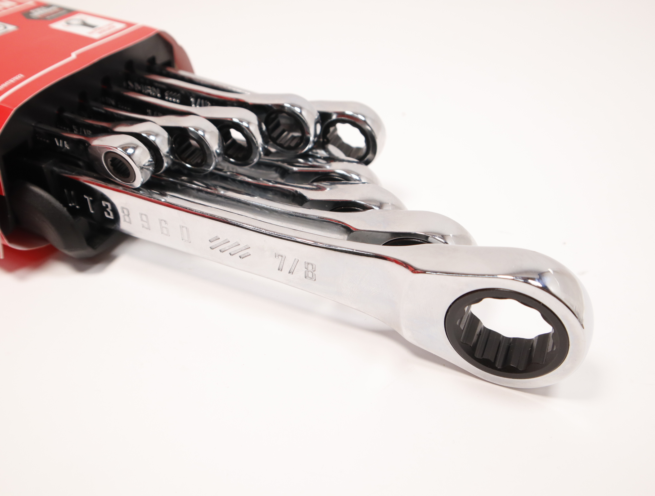 Includes (11) Ratcheting Wrenches SAE (1/4-in, 5/16-in, 3/8-in, 7/16-in, 1/2-in, 9/16-in, 5/8-in, 11/16-in, 3/4-in, 7/8-in, 15/16-in)