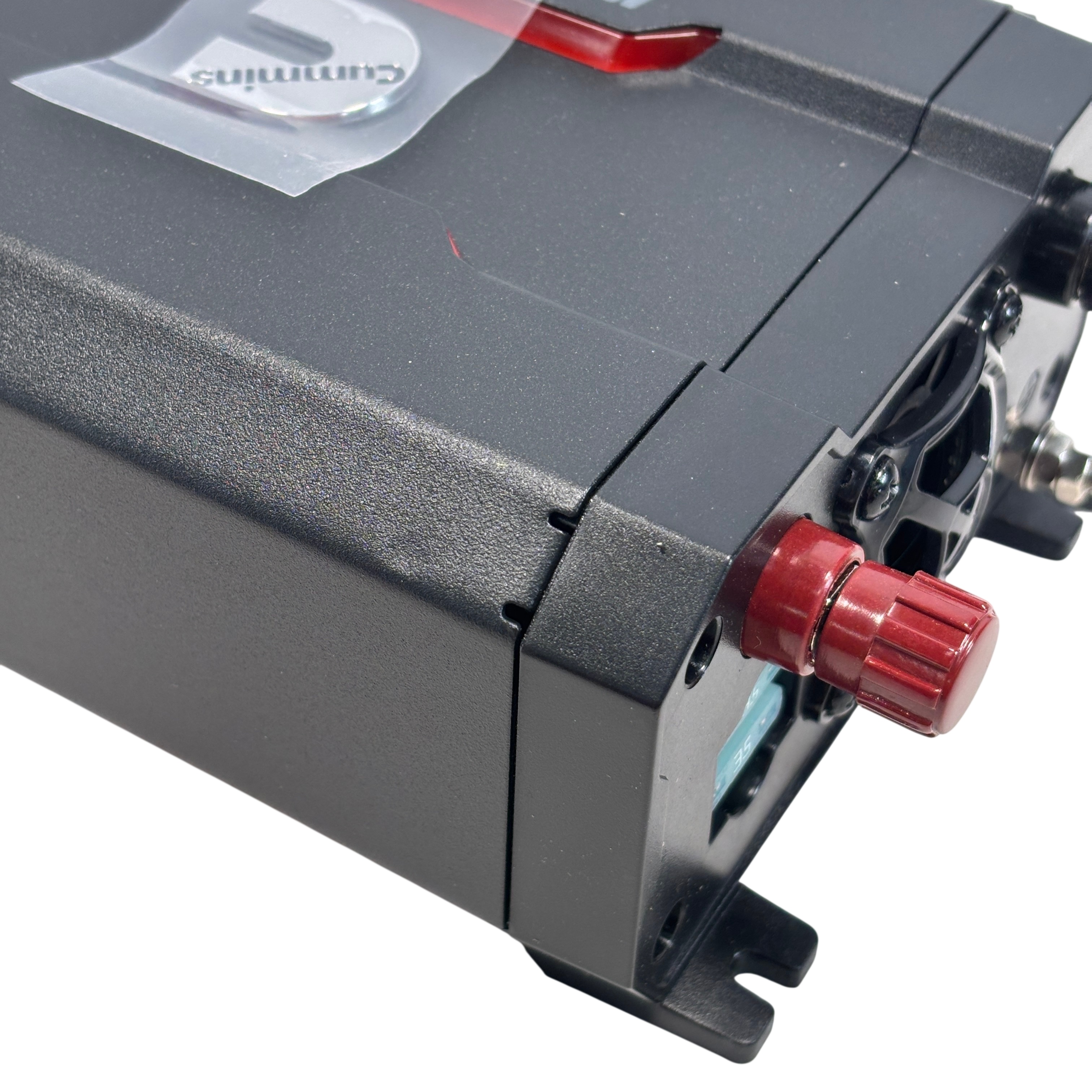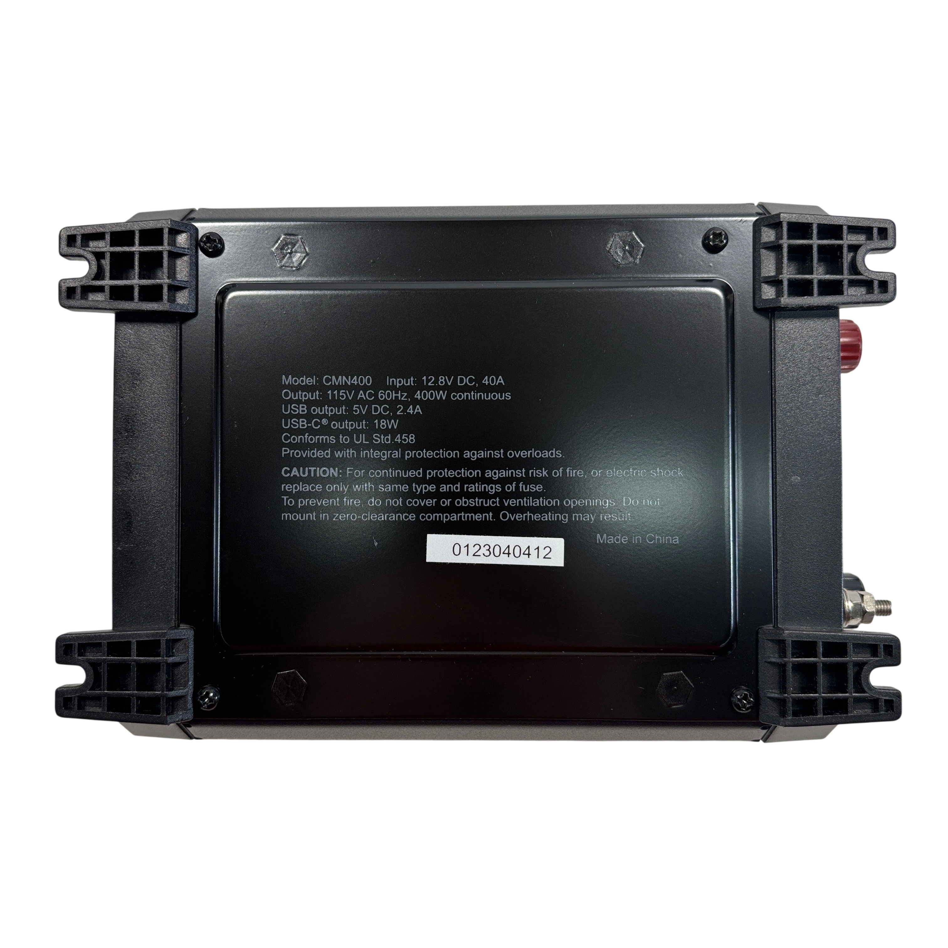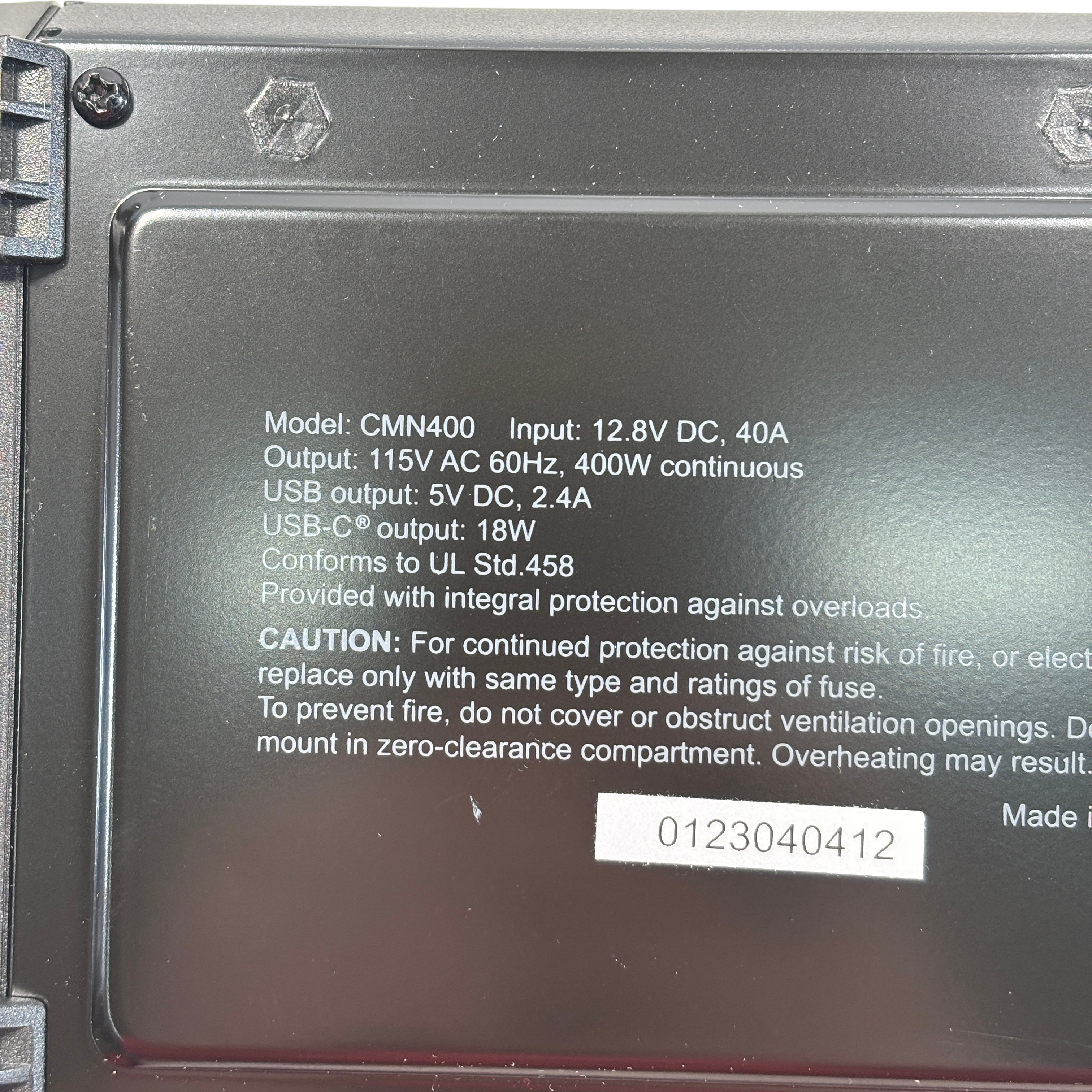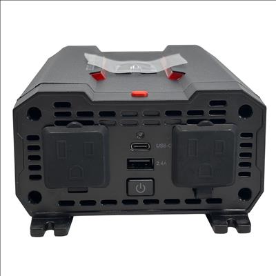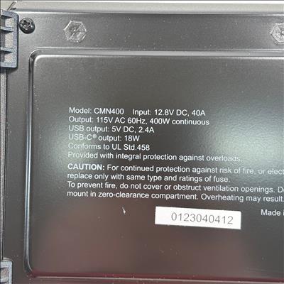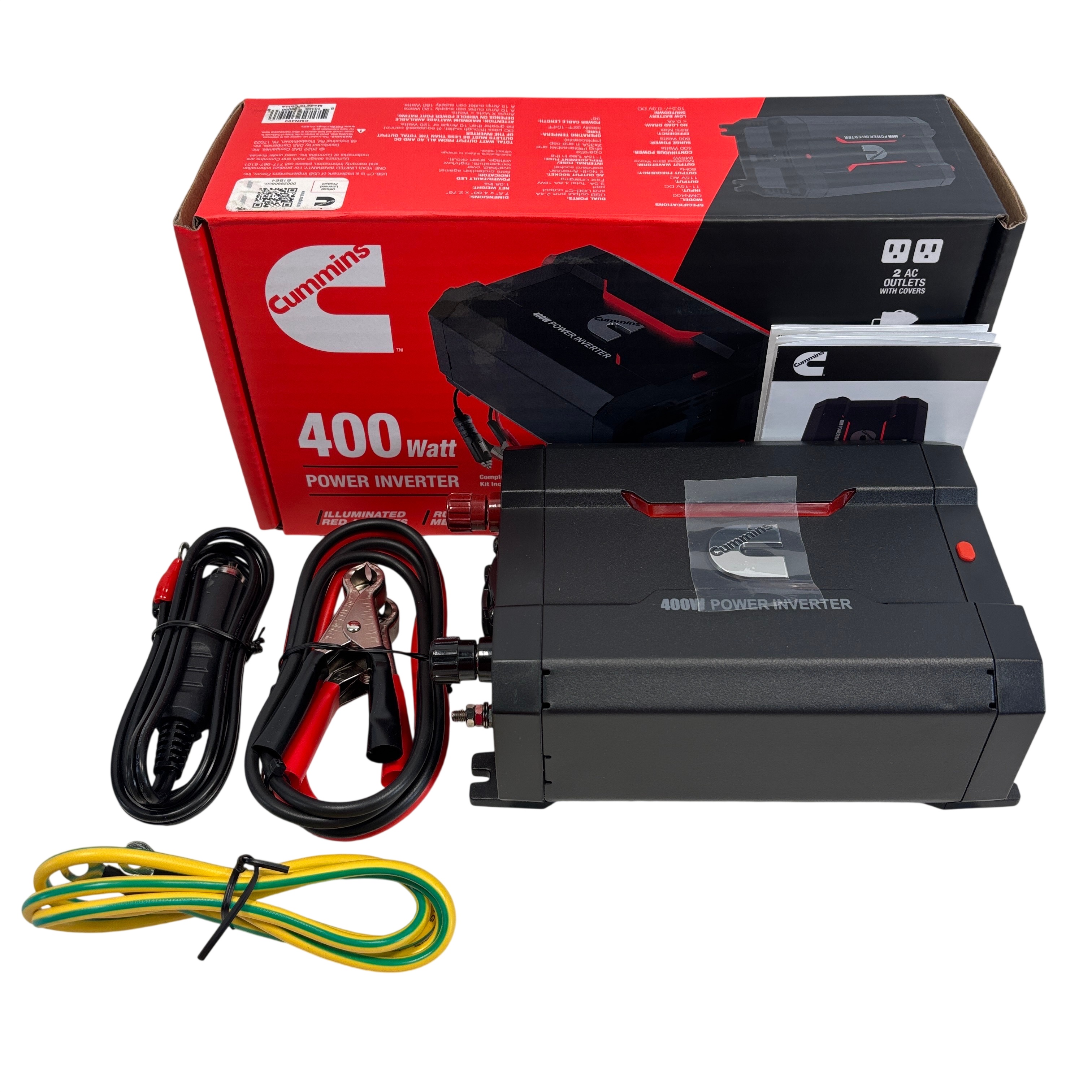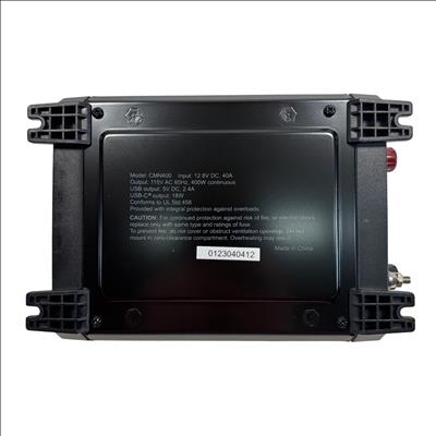 The Cummins CMN400 400W Car Power Inverter converts 12.8V DC power from a battery source into 115V AC power at 60Hz, delivering a continuous output of 400 watts. This compact inverter features dual AC outlets with protective covers, a USB output of 5V DC at 2.4A, and a USB-C output delivering 18W, making it ideal for powering small electronics and appliances on the go. Designed with integral overload protection, it ensures safe and reliable operation. The package includes battery clamps, cables, and a user manual, making it a complete solution for portable power needs.