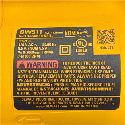 DEWALT 1/2" 7.8 Amp Corded Variable Speed Hammer Drill offers reliable performance with its powerful 7.8 amp motor and variable speed trigger for precise control. Designed for heavy-duty applications, this corded hammer drill features a 1/2-inch metal keyed chuck and a durable construction suitable for both metal and masonry drilling tasks.