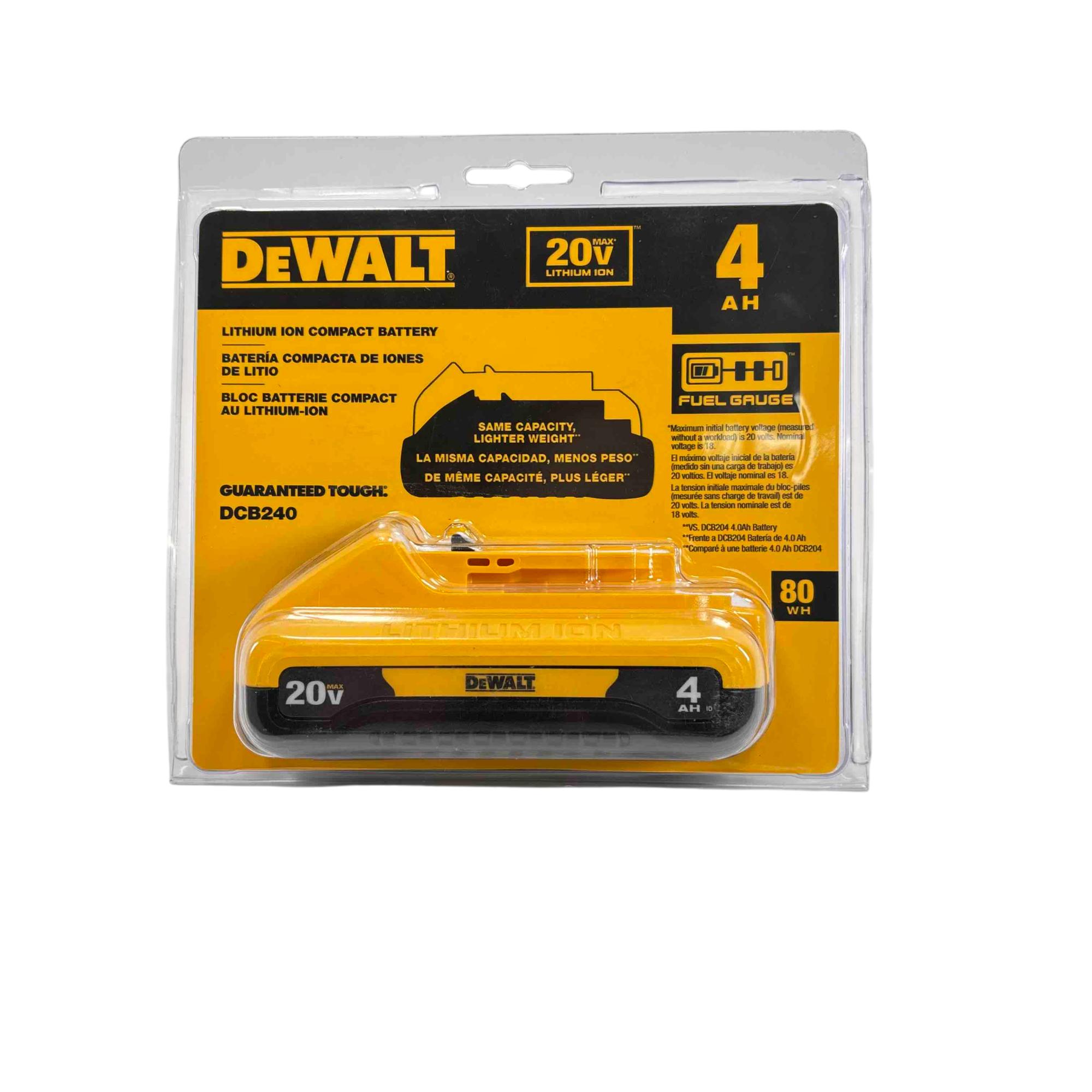 Power up your tools with the DEWALT DCB240 20V Max 4.0Ah Lithium Ion Compact Battery. Engineered with state-of-the-art Fuel Gauge Technology, this lightweight battery delivers the same exceptional capacity with reduced weight, making it ideal for tackling various tasks with ease. Experience guaranteed toughness and reliable performance that professionals trust.
