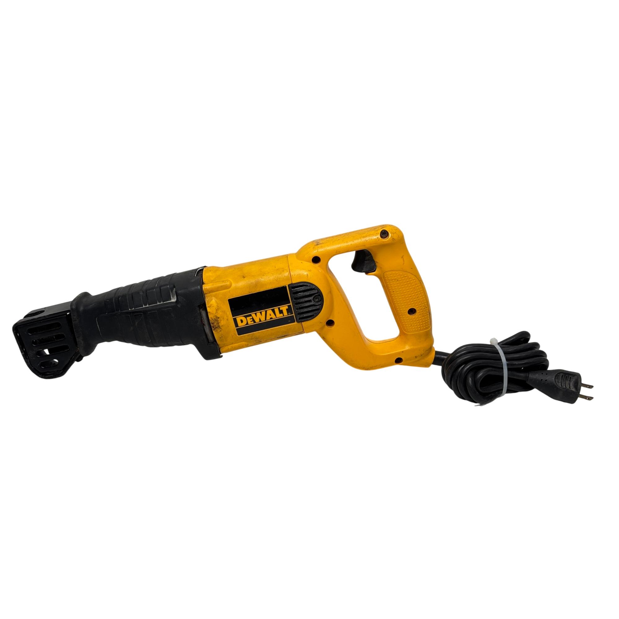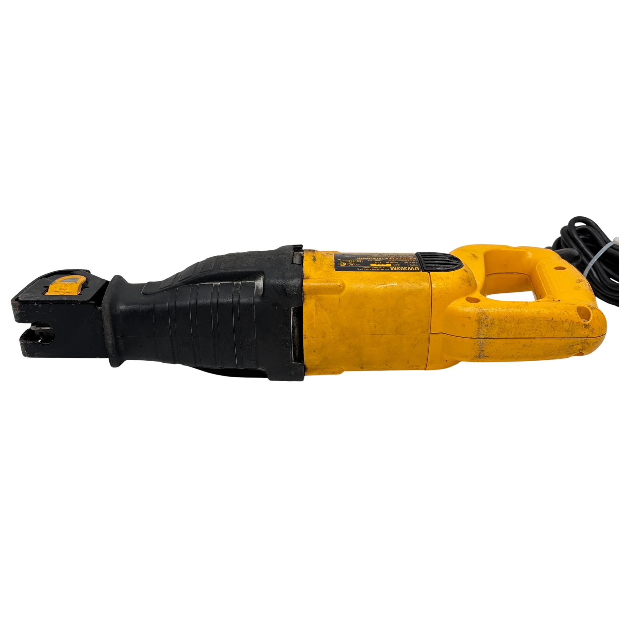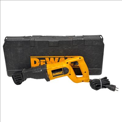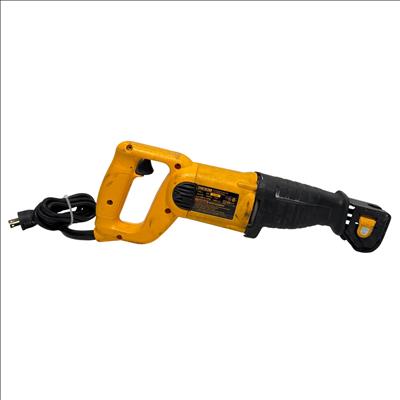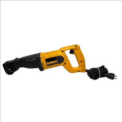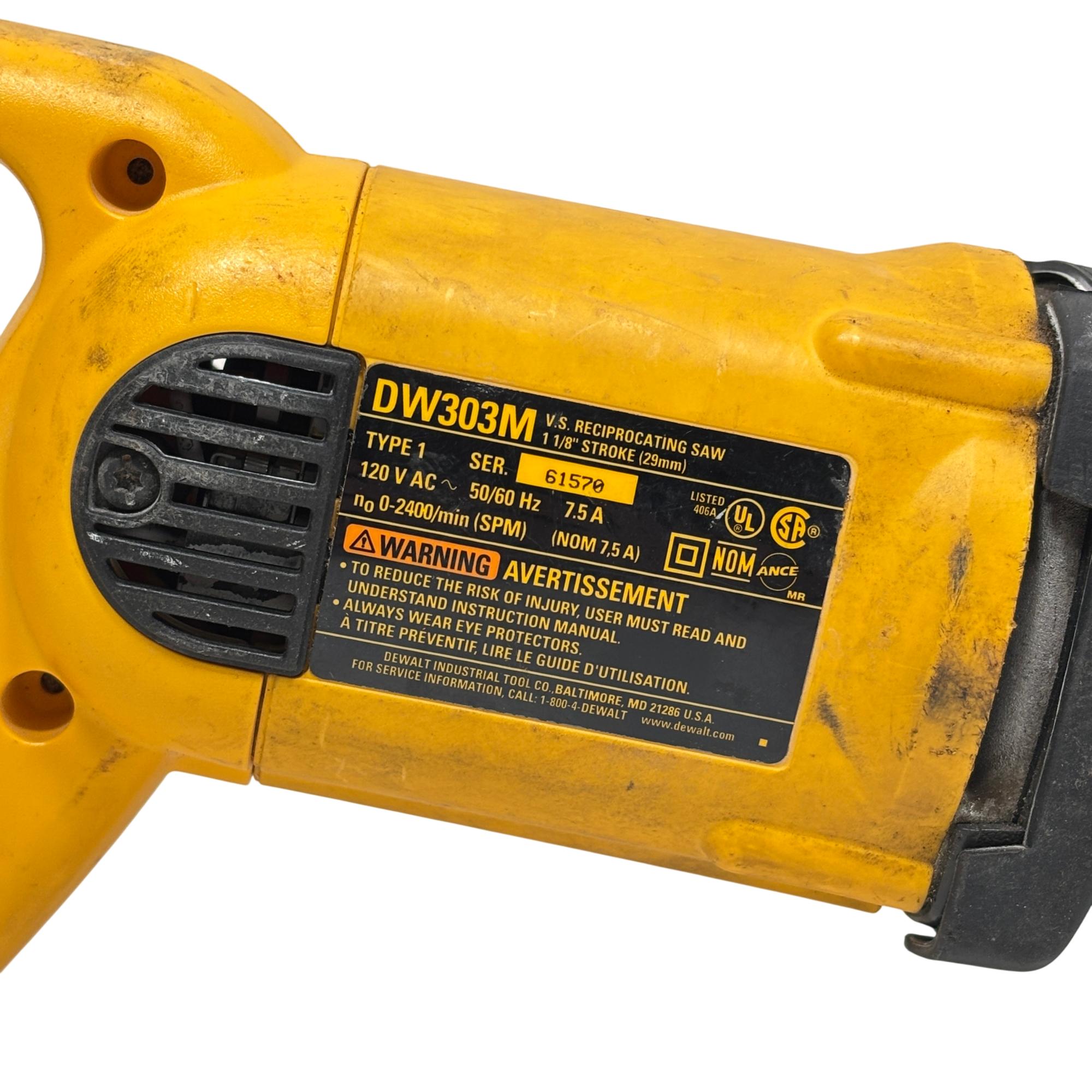 DEWALT DW303M Variable Speed Reciprocating Saw features a powerful 7.5 amp motor and a 1-1/8 inch stroke length designed for efficient cutting performance. This corded tool offers variable speed control, making it suitable for a variety of demolition and remodeling tasks, with a durable yellow and black construction for enhanced visibility on the job site.