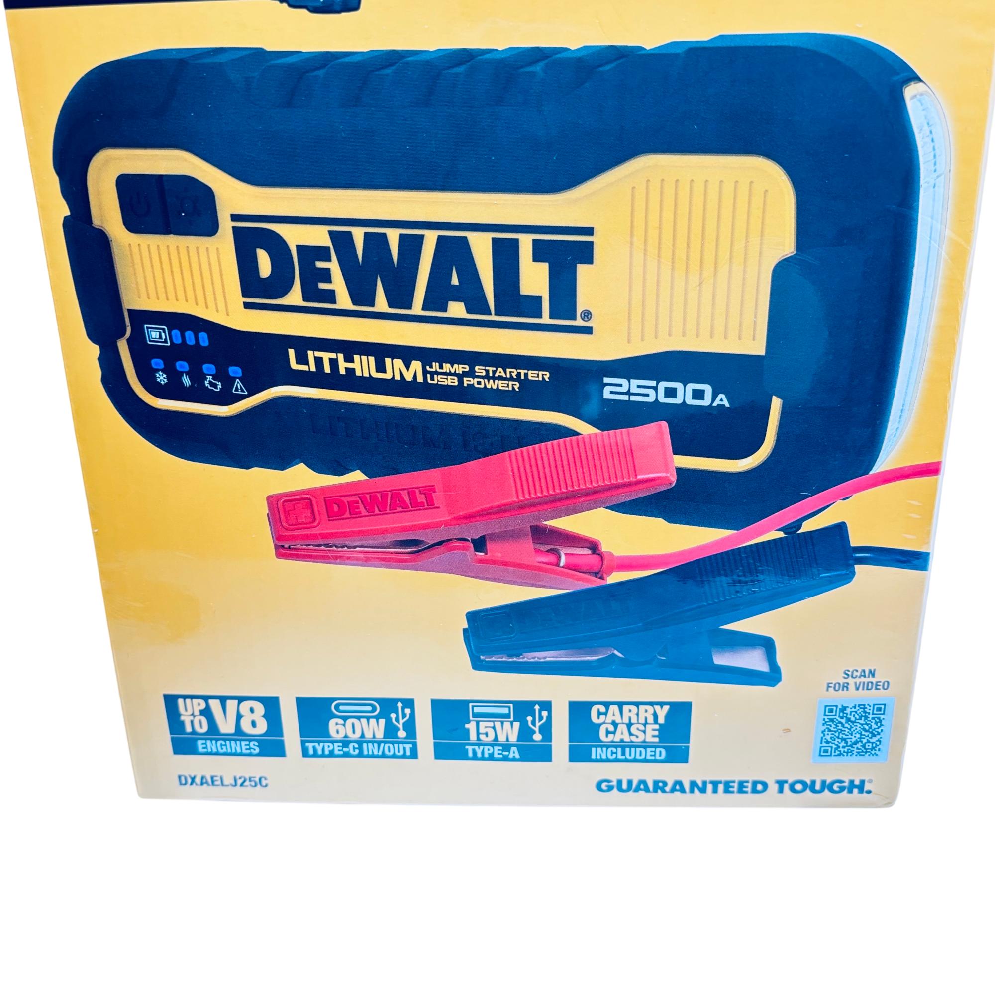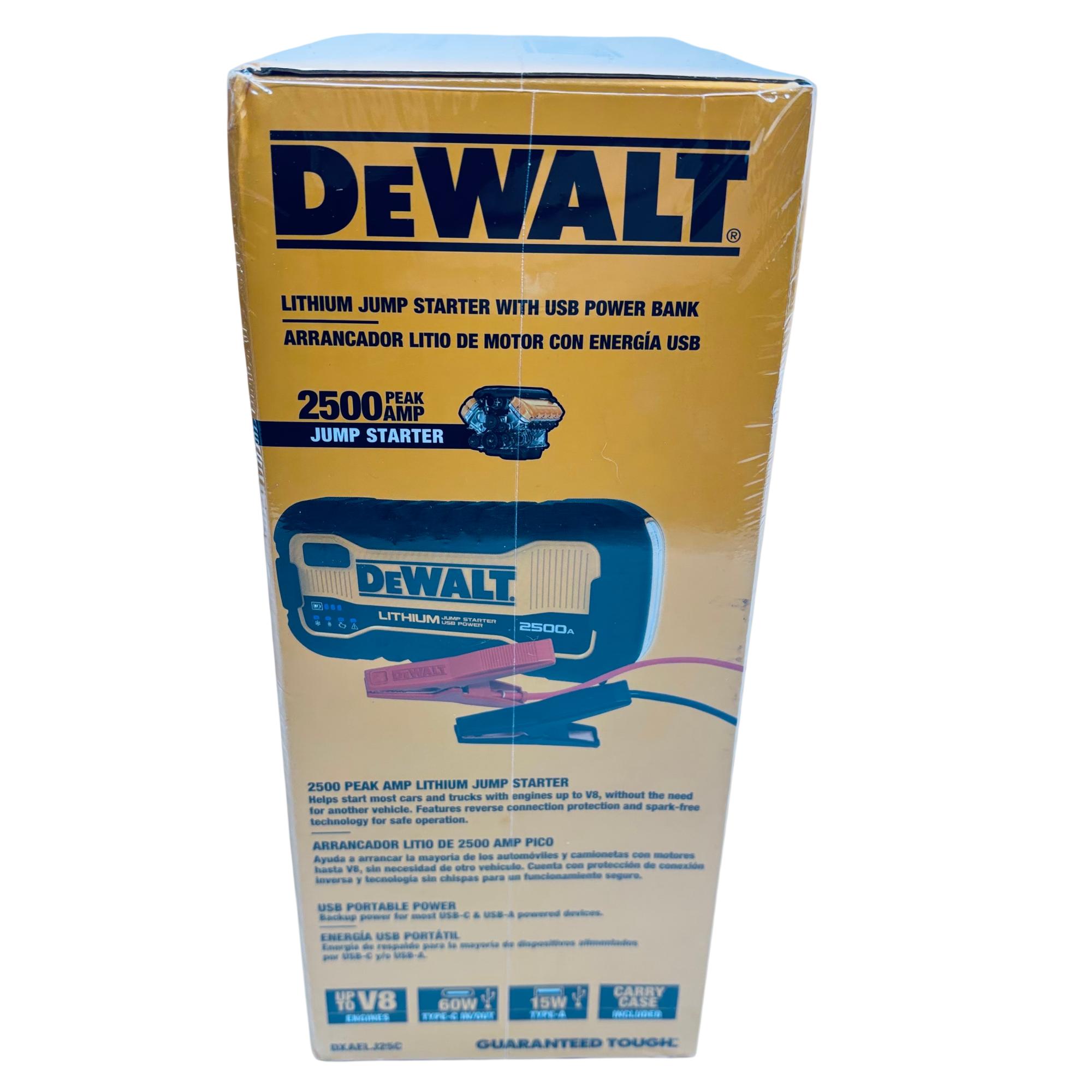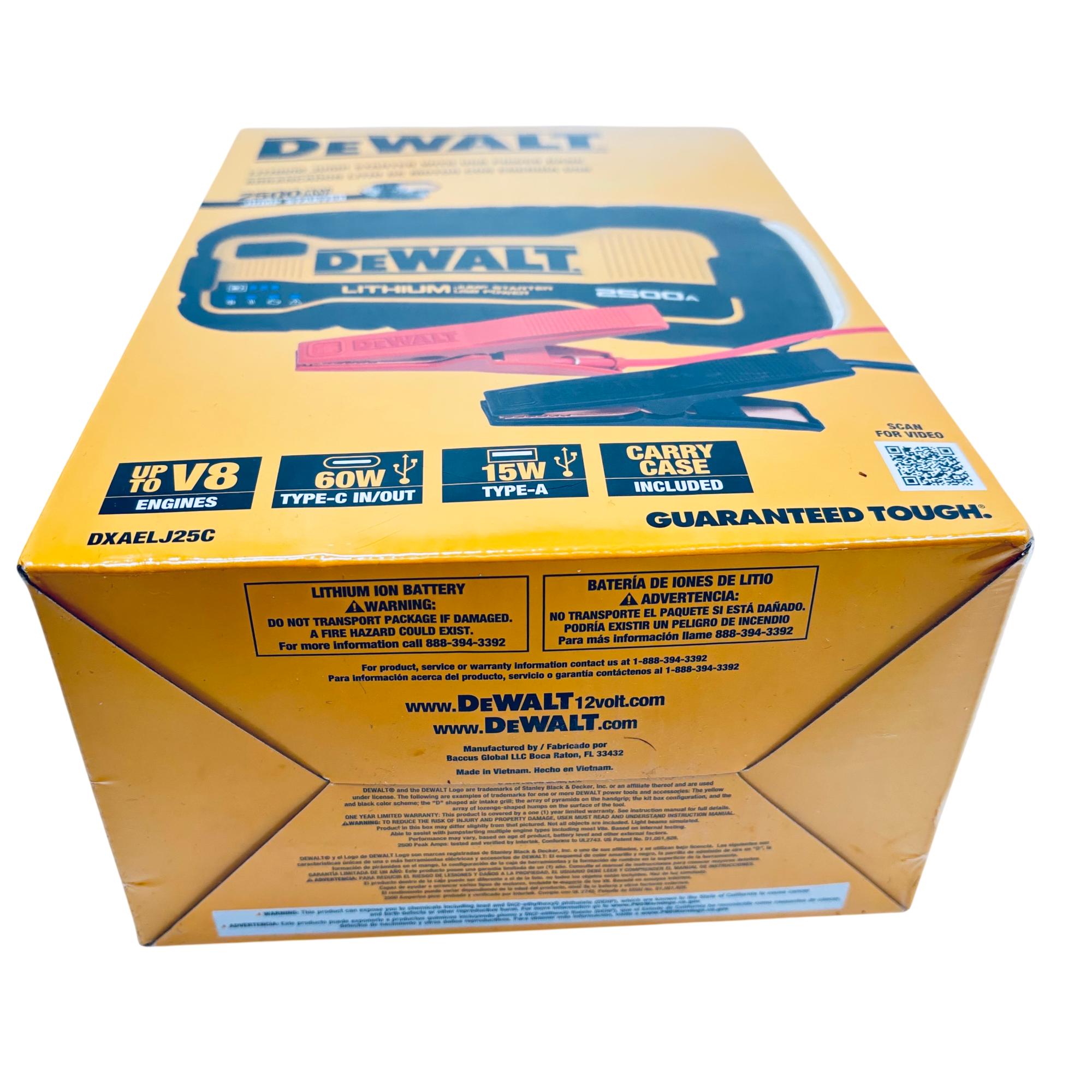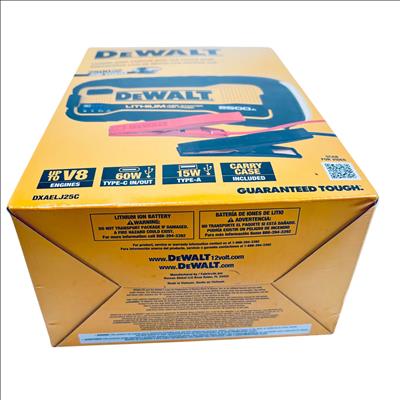 DEWALT DXAELJ25C 2500A Lithium Jump Starter with USB Power Bank delivers powerful 2500 peak amps capable of jump-starting V8 engines efficiently. It features versatile USB Type-C and Type-A ports for convenient power delivery and charging. Designed with portability in mind, this lithium jump starter ensures reliable engine starting and power backup in a compact, durable form.