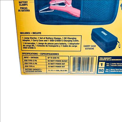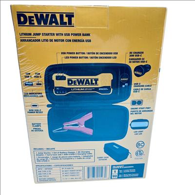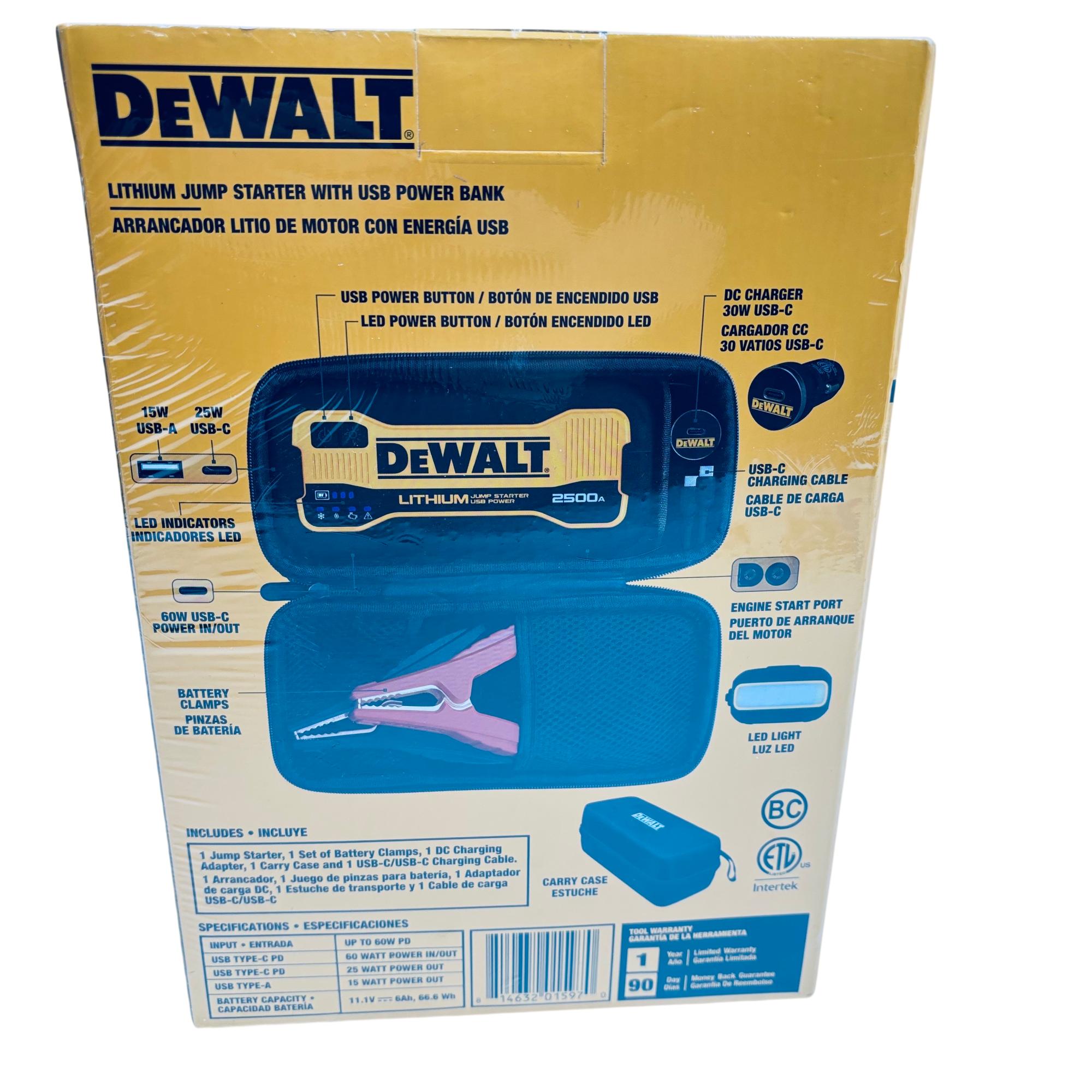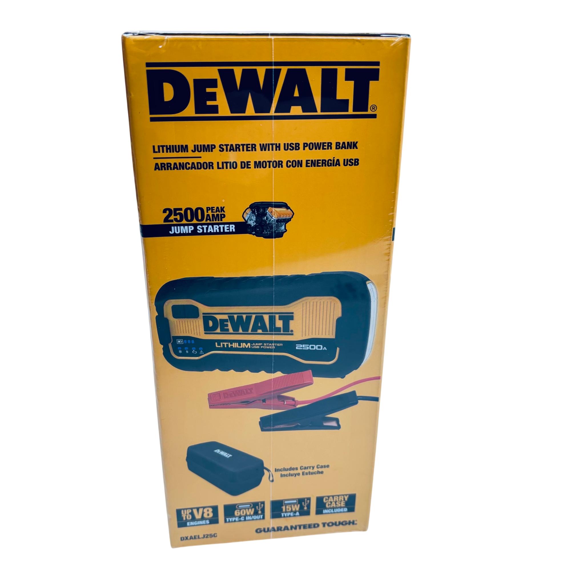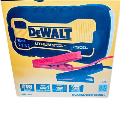 DEWALT DXAELJ25C 2500A Lithium Jump Starter with USB Power Bank delivers powerful 2500 peak amps capable of jump-starting V8 engines efficiently. It features versatile USB Type-C and Type-A ports for convenient power delivery and charging. Designed with portability in mind, this lithium jump starter ensures reliable engine starting and power backup in a compact, durable form.