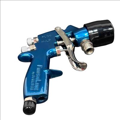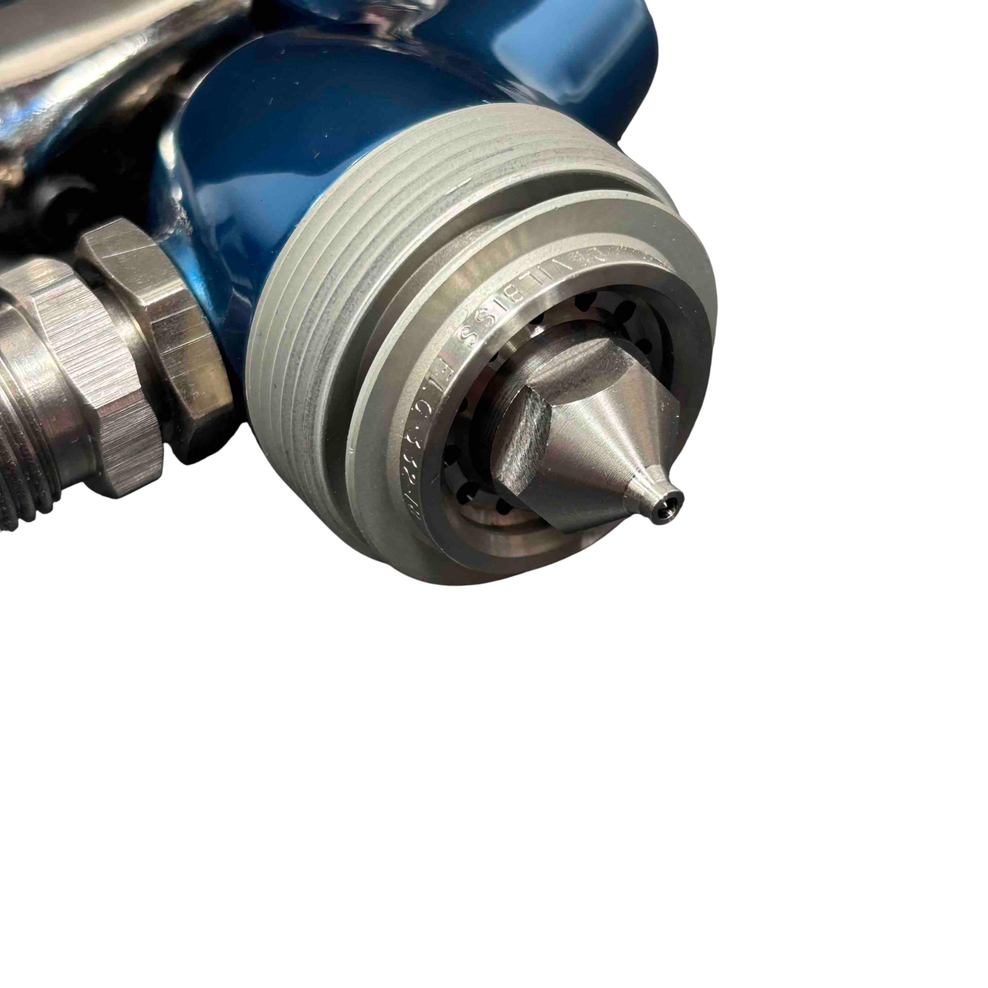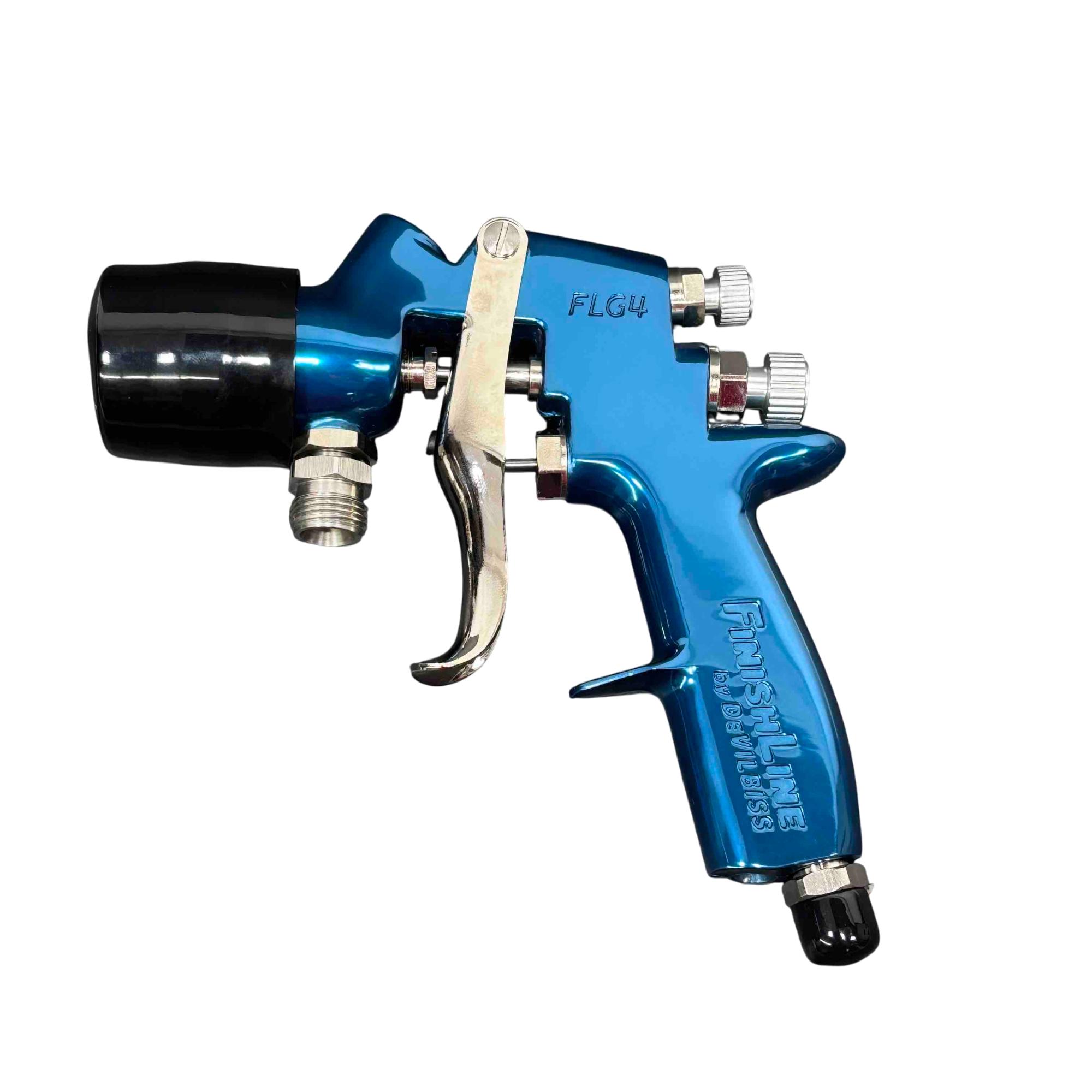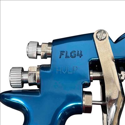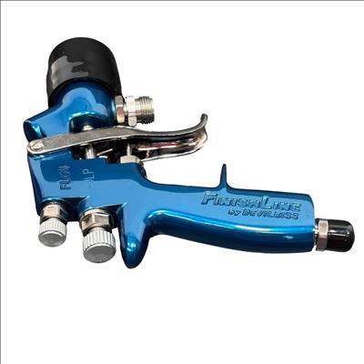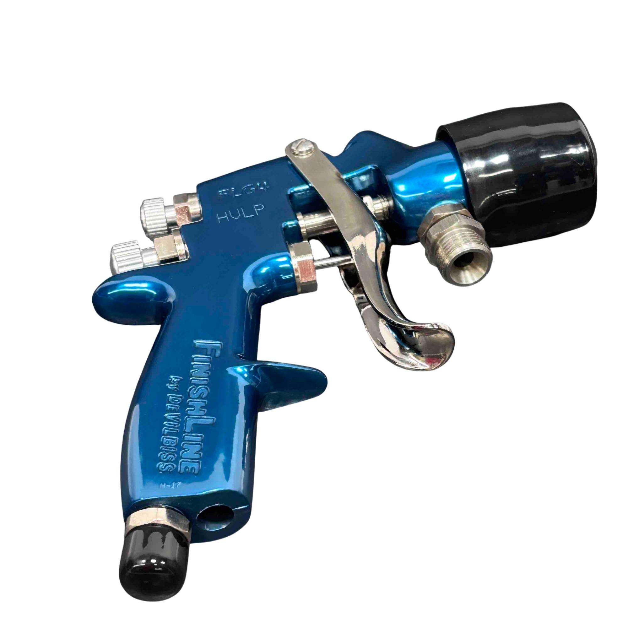 The DeVilbiss FinishLine FLG-4 HVLP Gravity Feed Spray Gun delivers precise and efficient paint application with its high volume, low pressure design. Engineered for professional use, this spray gun features a durable blue and silver metal body, optimized for smooth finishes and reduced overspray in automotive and industrial painting projects.