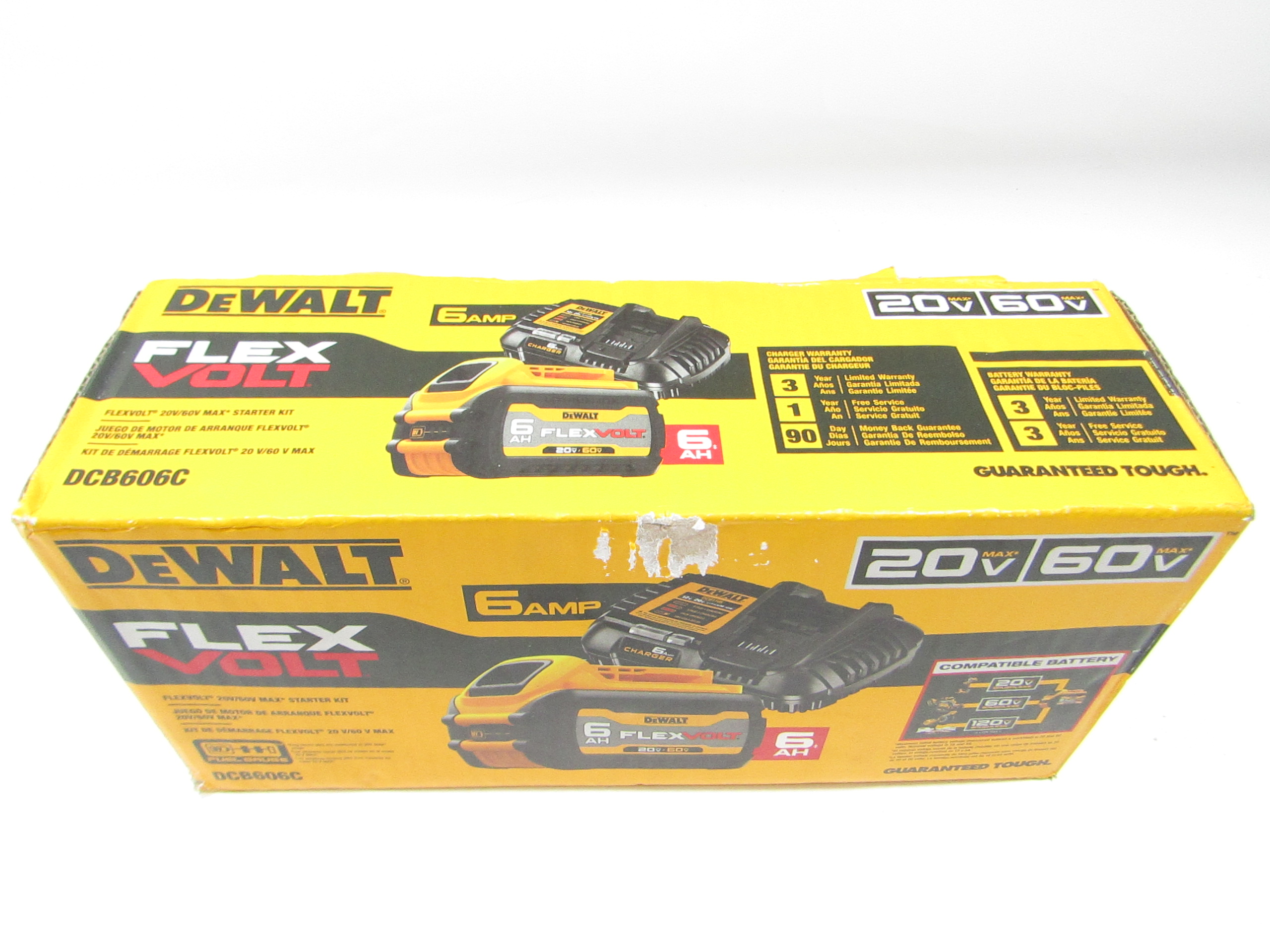 Power your 20V MAX and 60V MAX* tools with this FLEXVOLT 20V/60V MAX 6Ah battery and charger. Featuring patented technology that automatically switches voltage when you change your tools, the FLEXVOLT 20V/60V MAX battery optimizes your performance on tough jobs. The versatile DCB1106 charger is compatible with 12V MAX, 20V MAX, and FLEXVOLT 20V/60V MAX batteries and offers an LED Status light to provide instant visibility to your battery's state of charge.