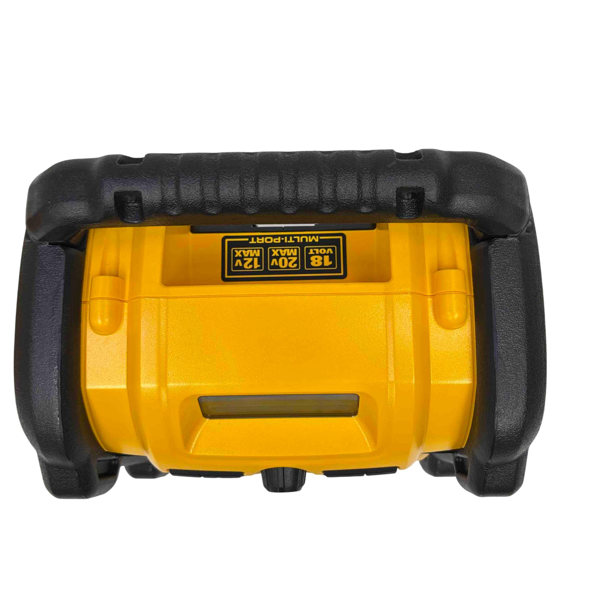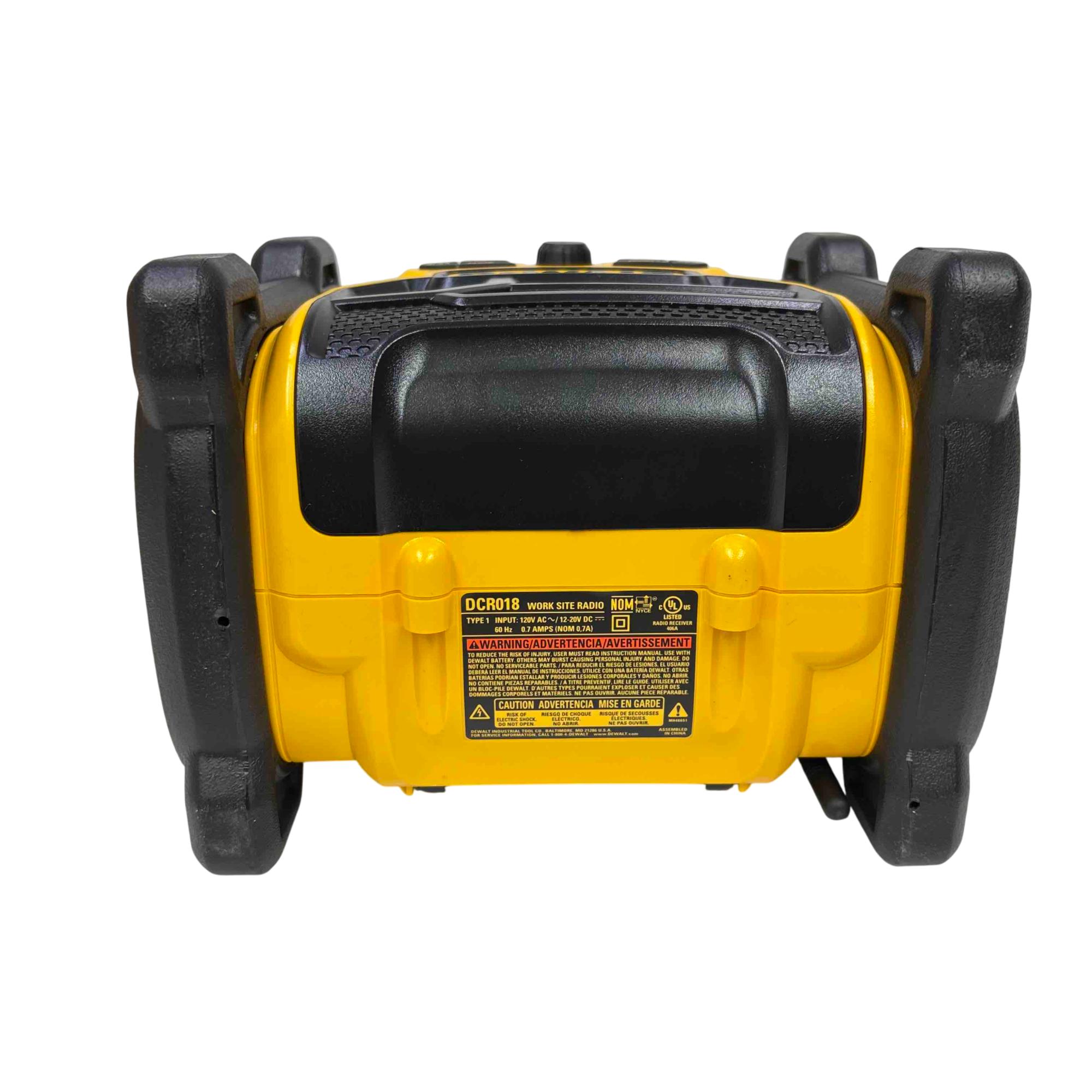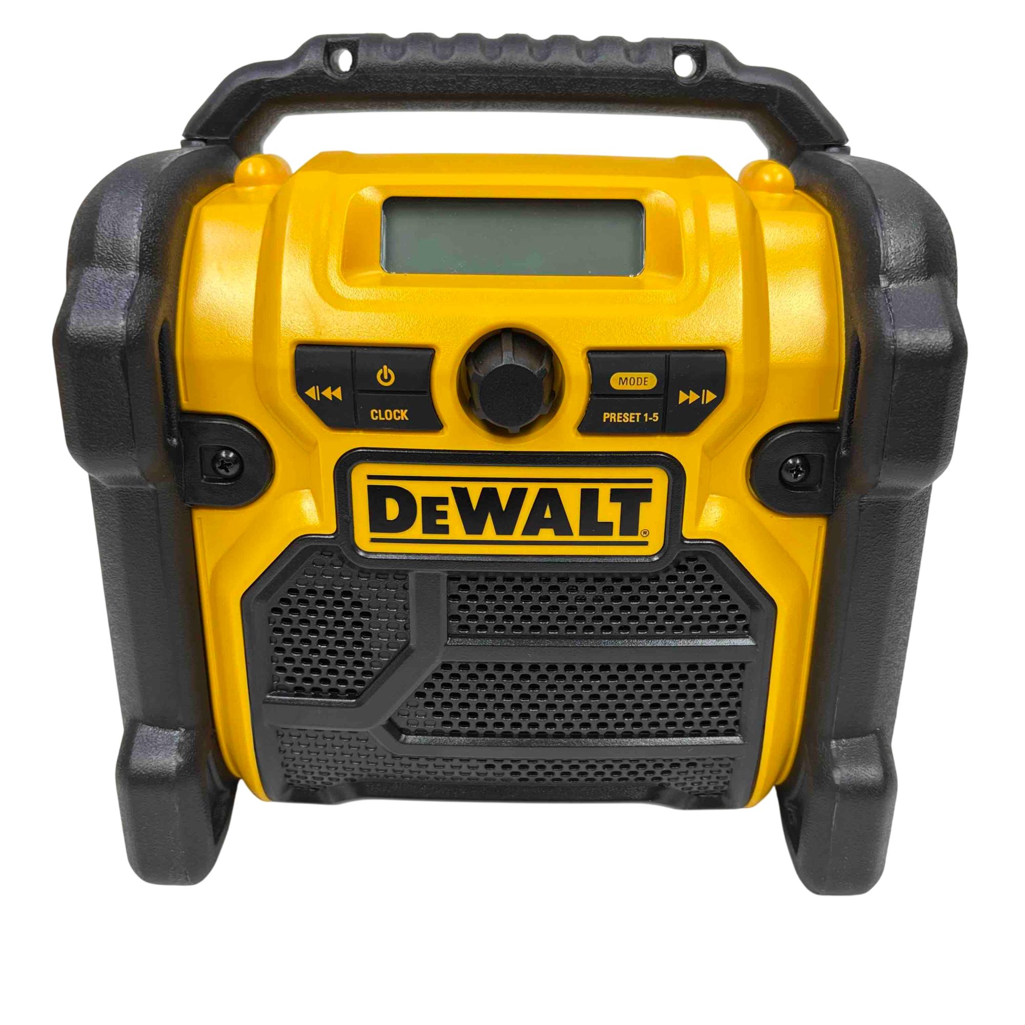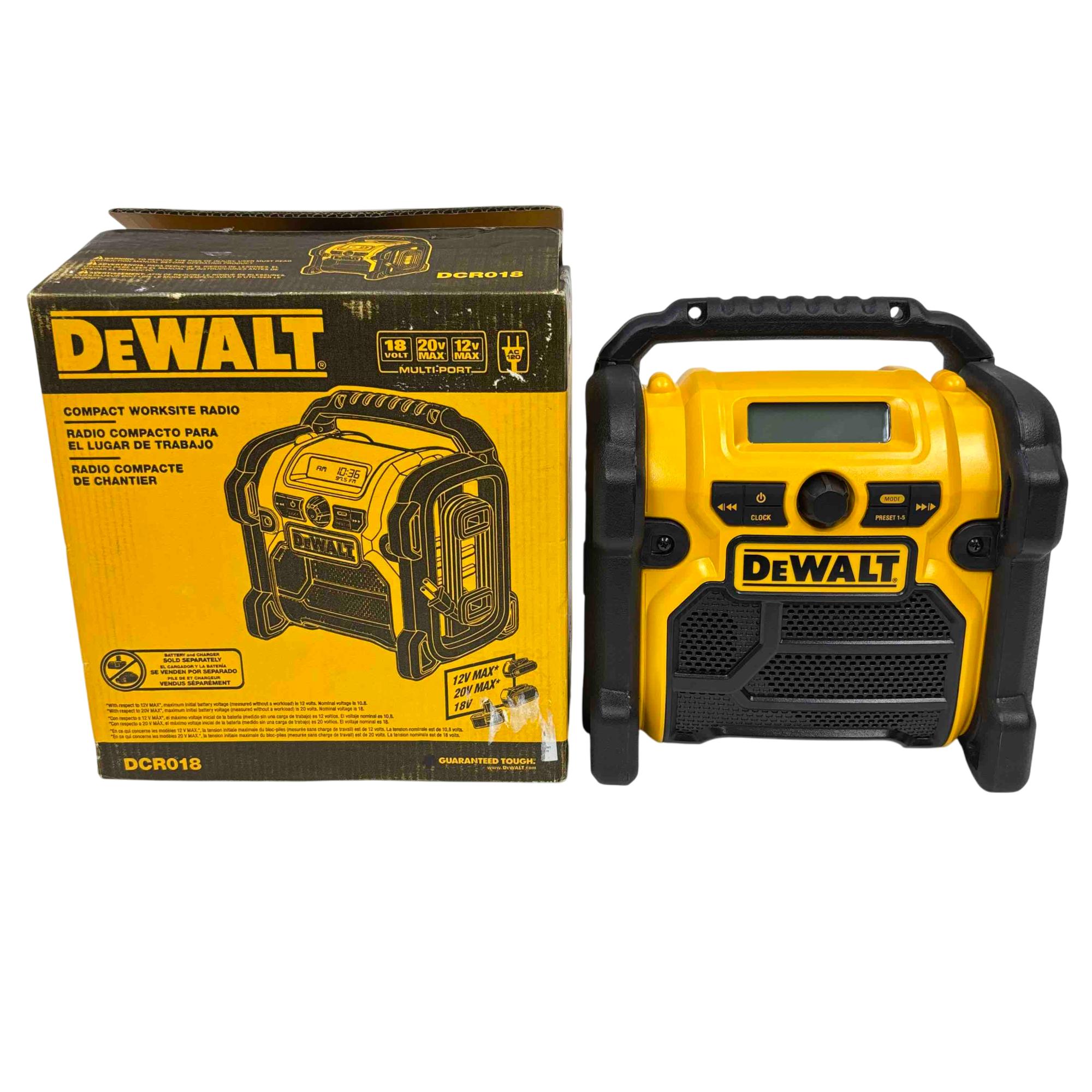 The DeWalt DCR018 Compact Worksite Radio features compatibility with 12V, 18V, and 20V MAX batteries and delivers robust sound quality for demanding jobsite environments. This multi-port radio includes AM/FM functionality, a built-in clock, and five preset stations, all housed in a durable yellow and black casing optimized for tough work conditions.