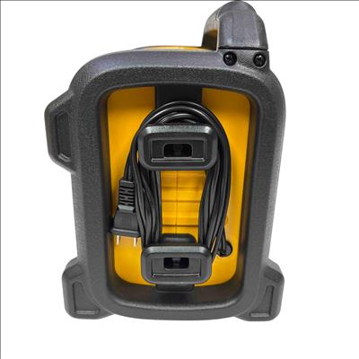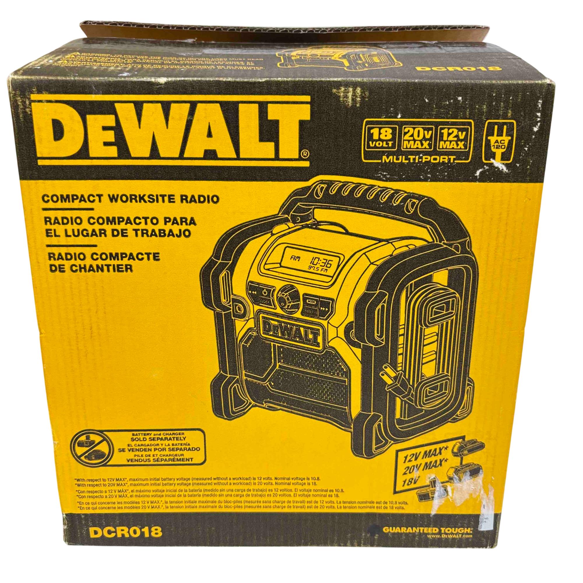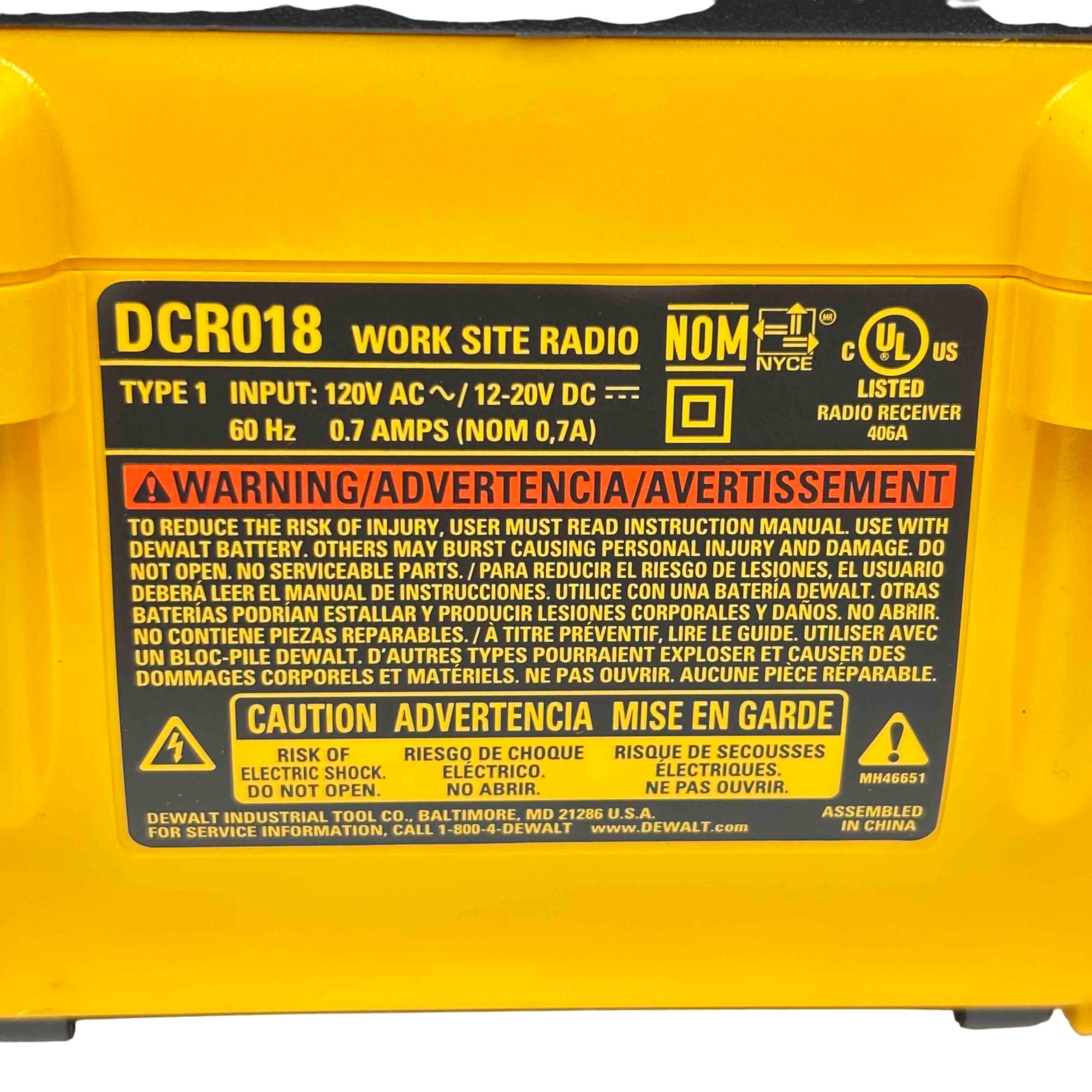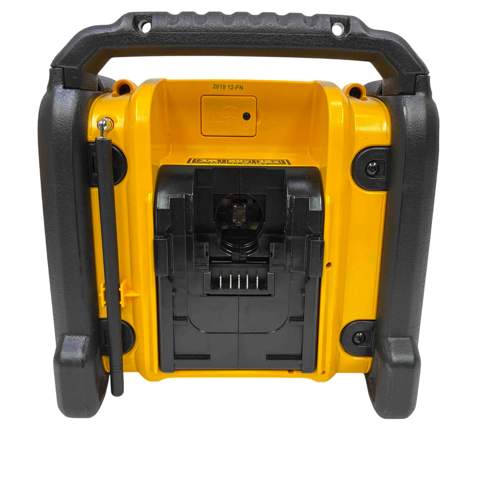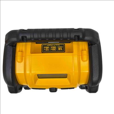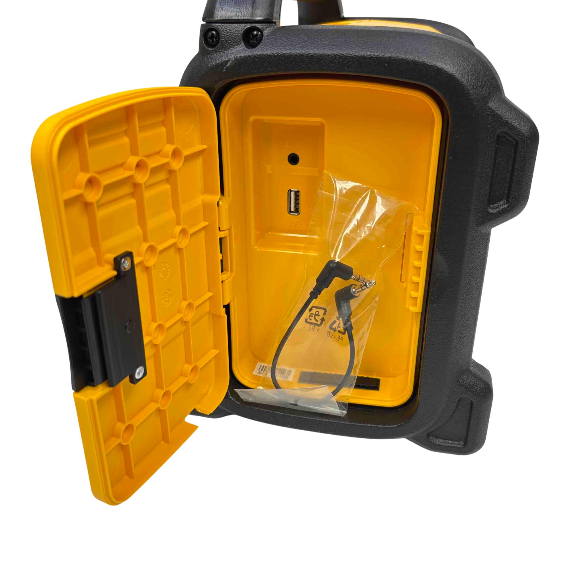 The DeWalt DCR018 Compact Worksite Radio features compatibility with 12V, 18V, and 20V MAX batteries and delivers robust sound quality for demanding jobsite environments. This multi-port radio includes AM/FM functionality, a built-in clock, and five preset stations, all housed in a durable yellow and black casing optimized for tough work conditions.