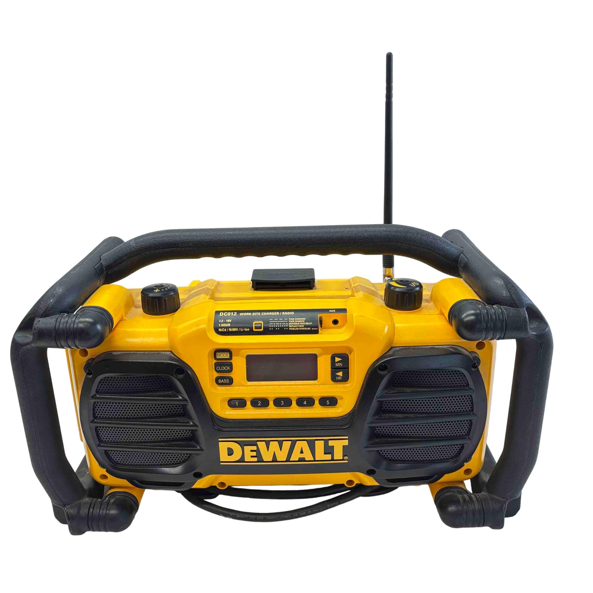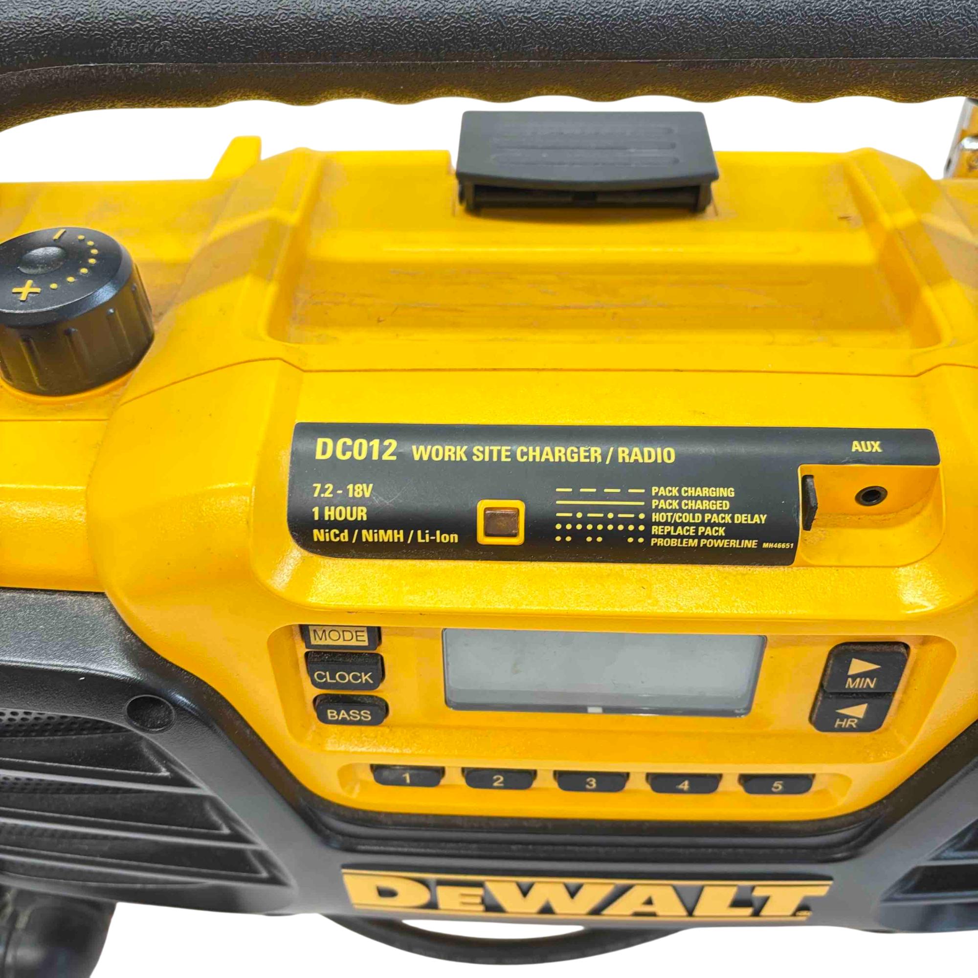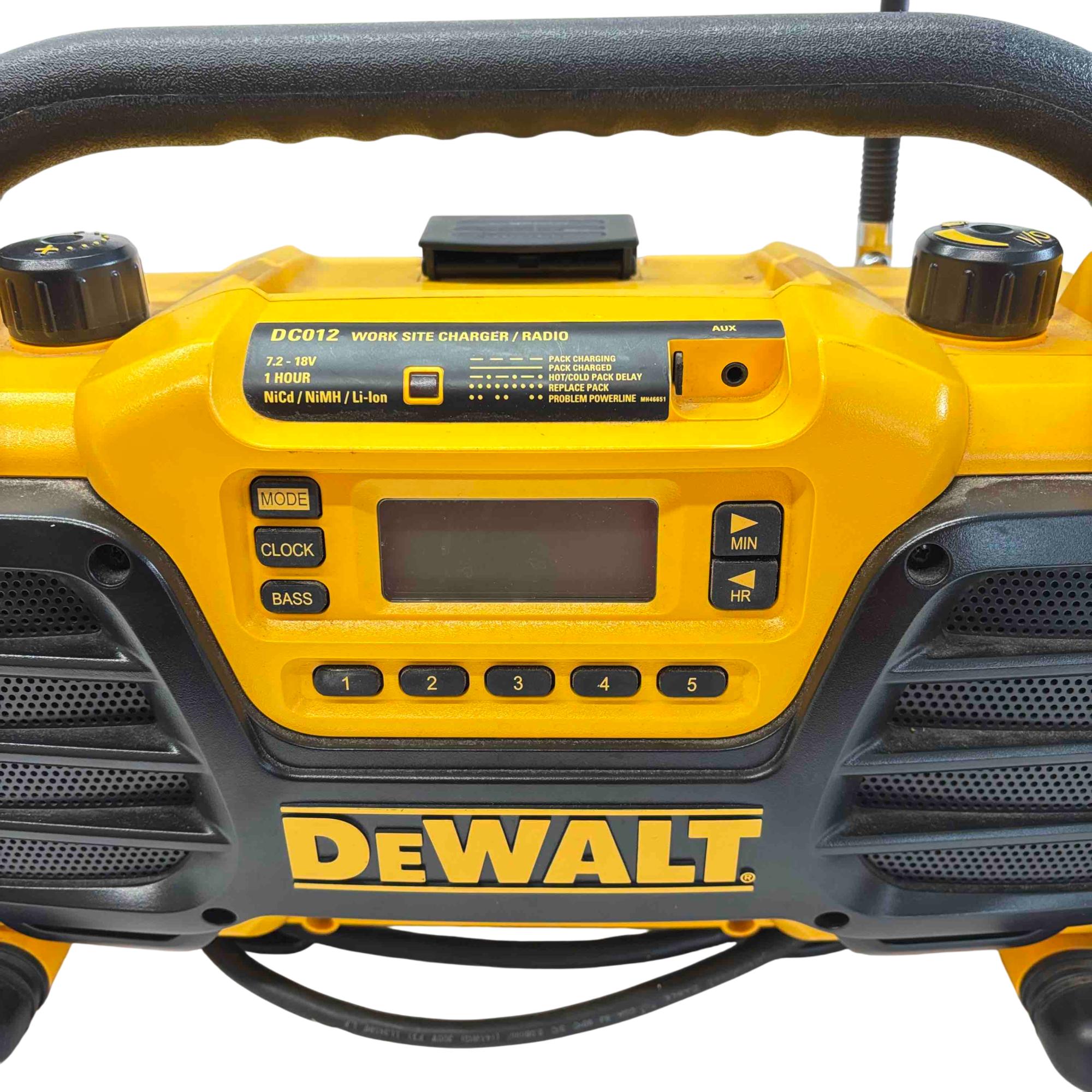 Introducing the DeWalt DC012 Work Site Charger/Radio, the perfect companion for any job site. This rugged and versatile device combines a robust radio with an integrated battery charger, compatible with DeWalt battery packs ranging from 7.2V to 18V. With its durable yellow and black design, AUX input, and quick charging capability, stay entertained and powered up all day long.