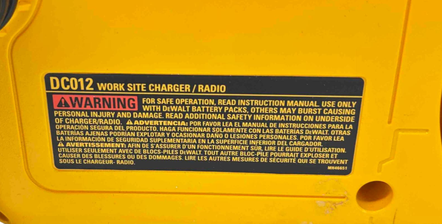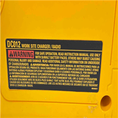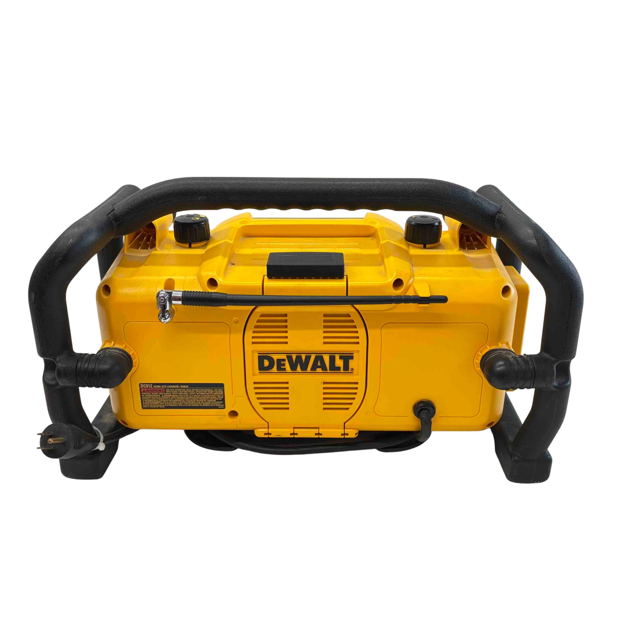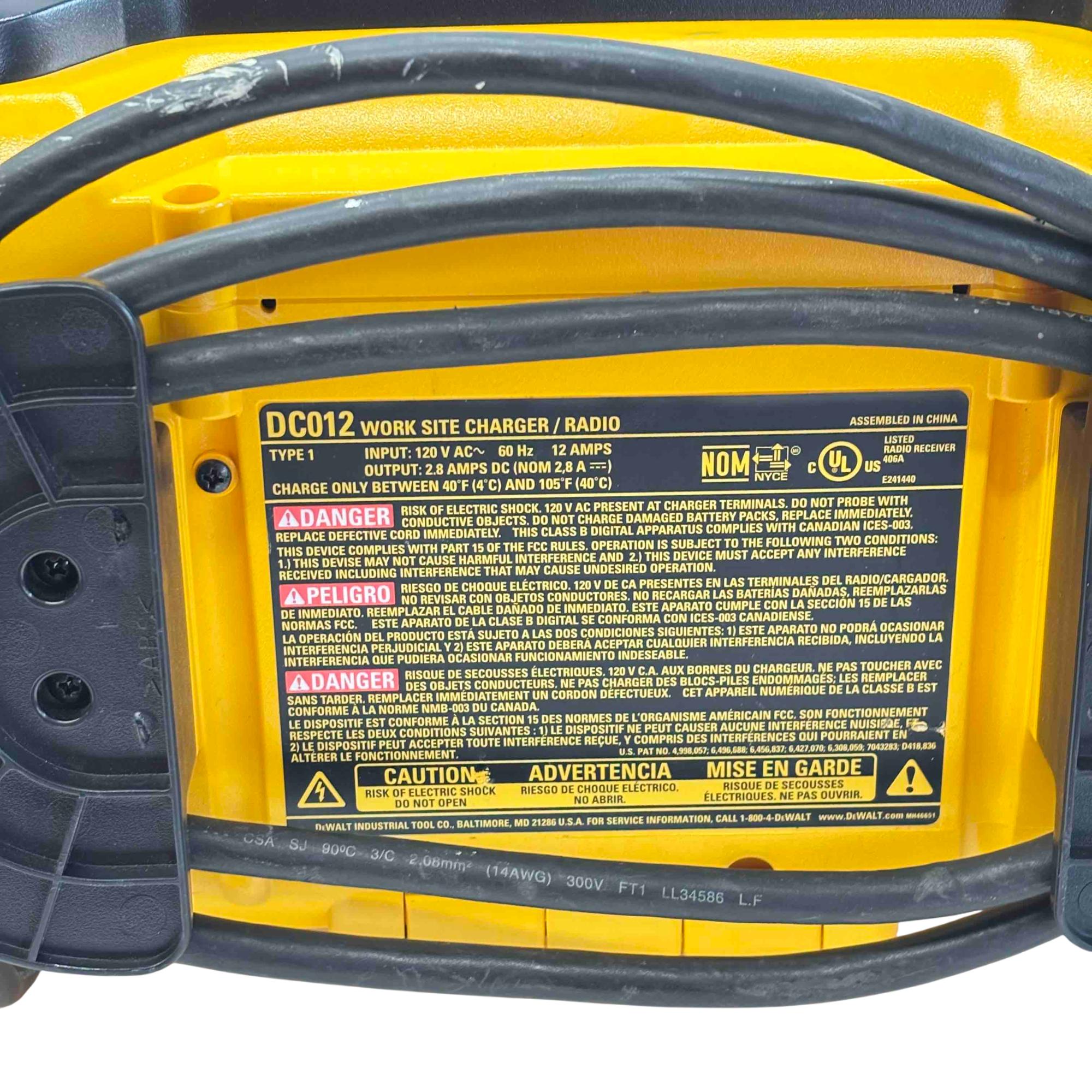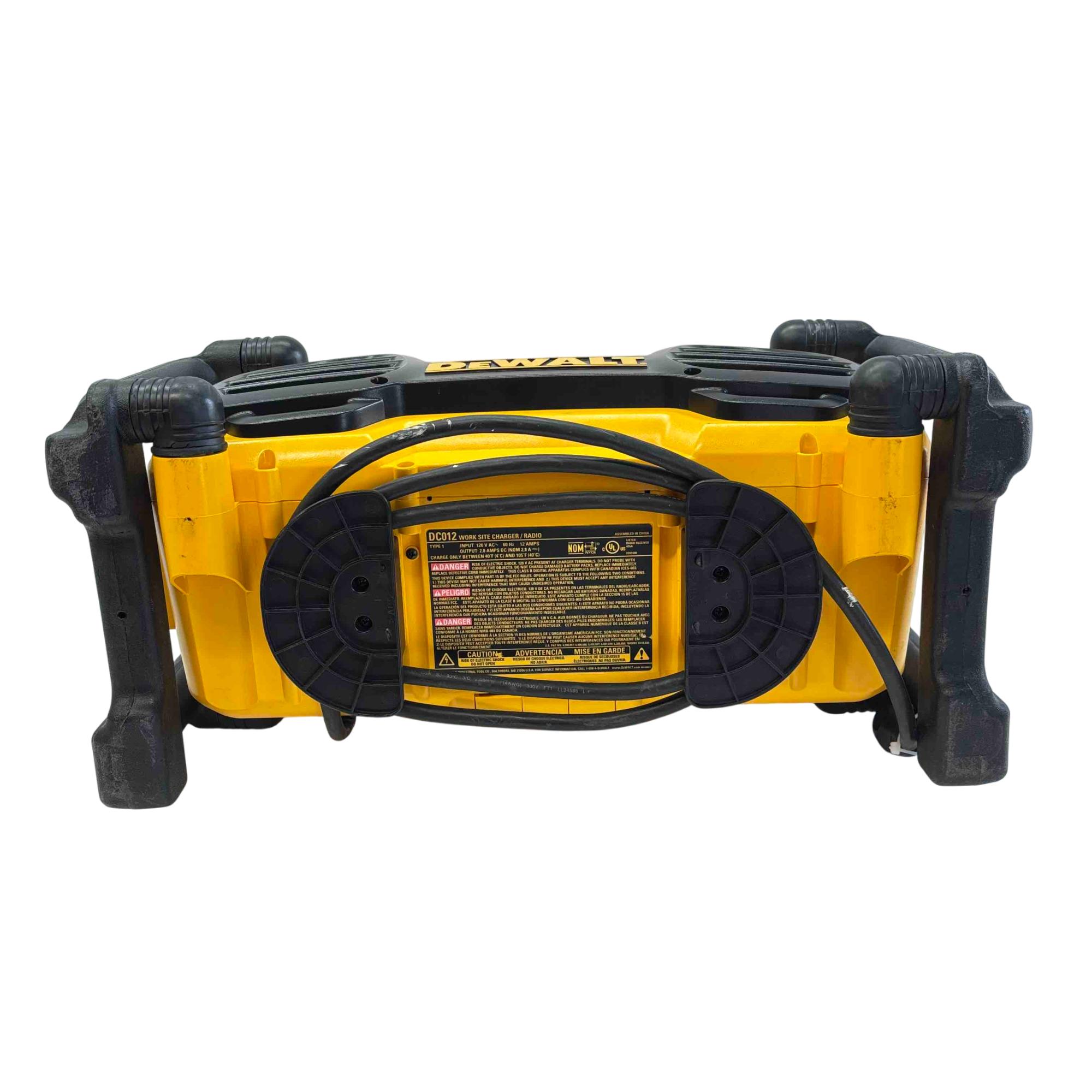 Introducing the DeWalt DC012 Work Site Charger/Radio, the perfect companion for any job site. This rugged and versatile device combines a robust radio with an integrated battery charger, compatible with DeWalt battery packs ranging from 7.2V to 18V. With its durable yellow and black design, AUX input, and quick charging capability, stay entertained and powered up all day long.