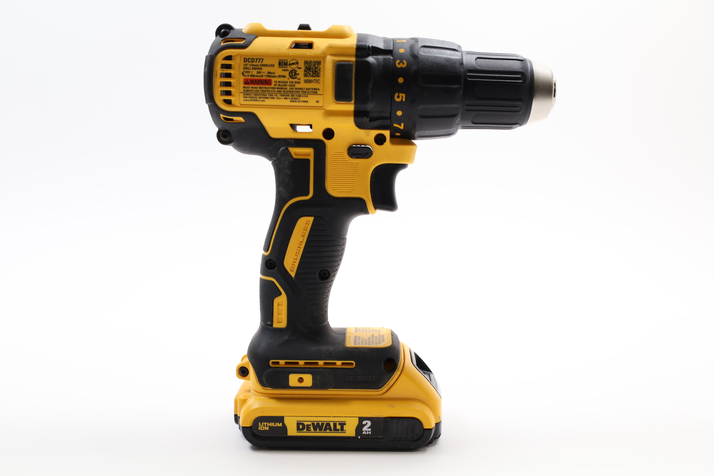 The DEWALT DCD771C2 20V MAX Cordless Drill/Driver Kit is designed with a high-performance motor that delivers 300 unit Watt out (UWO) of power. The compact, lightweight design allows you to work in tight spaces for long periods. This battery-powered drill/driver features a high-speed transmission with 2 speeds (0-450 RPM & 1,500 RPM) for a range of drilling and fastening applications.