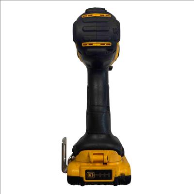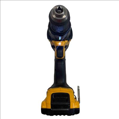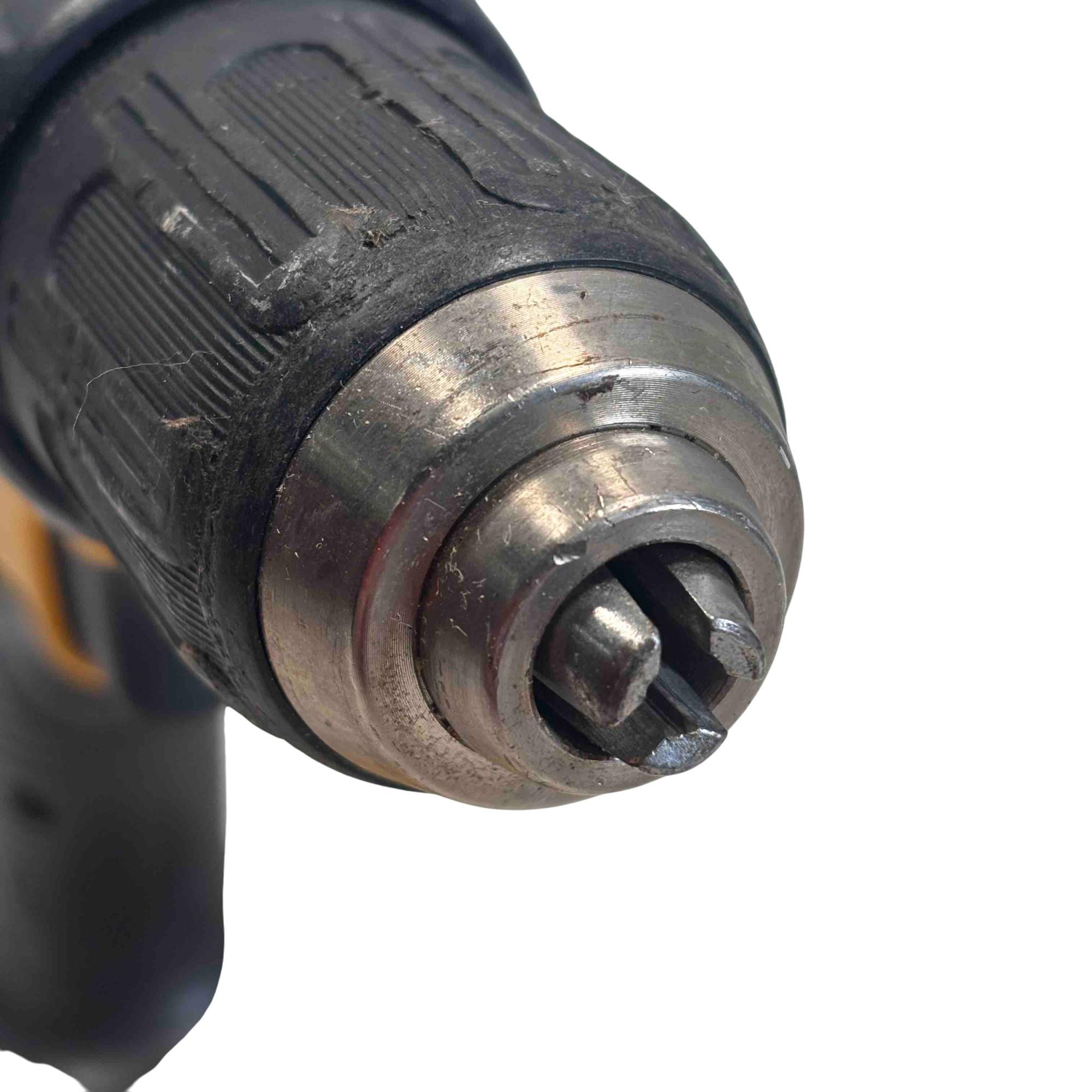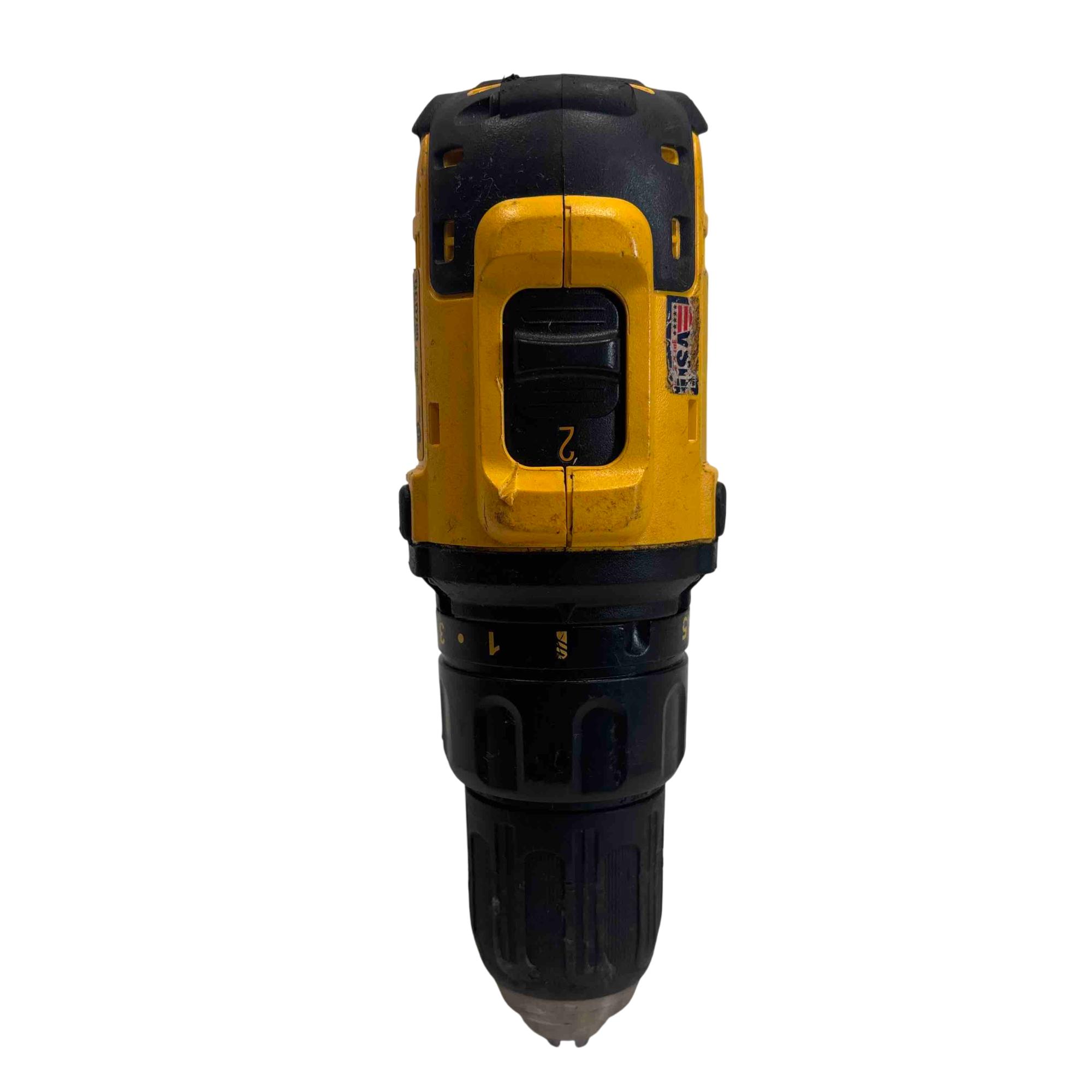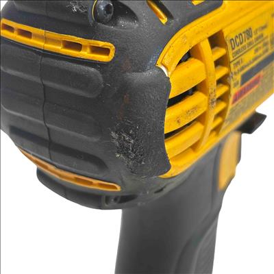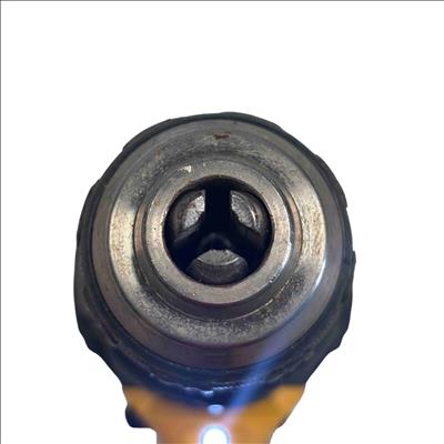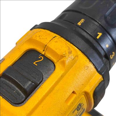 Previously owned. This drill/driver has been tested and it works. There is a scuff mark on the rubber on the back of the tool, and the rubber near the tip of the tool is scratched and word as well. The metal chuck has scratches and a few wear marks on it. There is a deep scratch in the yellow plastic on the top of the tool next to the switch. The rest of the yellow plastic on the tool has scratch marks and black stains on it. Both the power tool and the battery have wear lines where they attach, and the bottom of the battery has scratch marks on it. See photos for details.