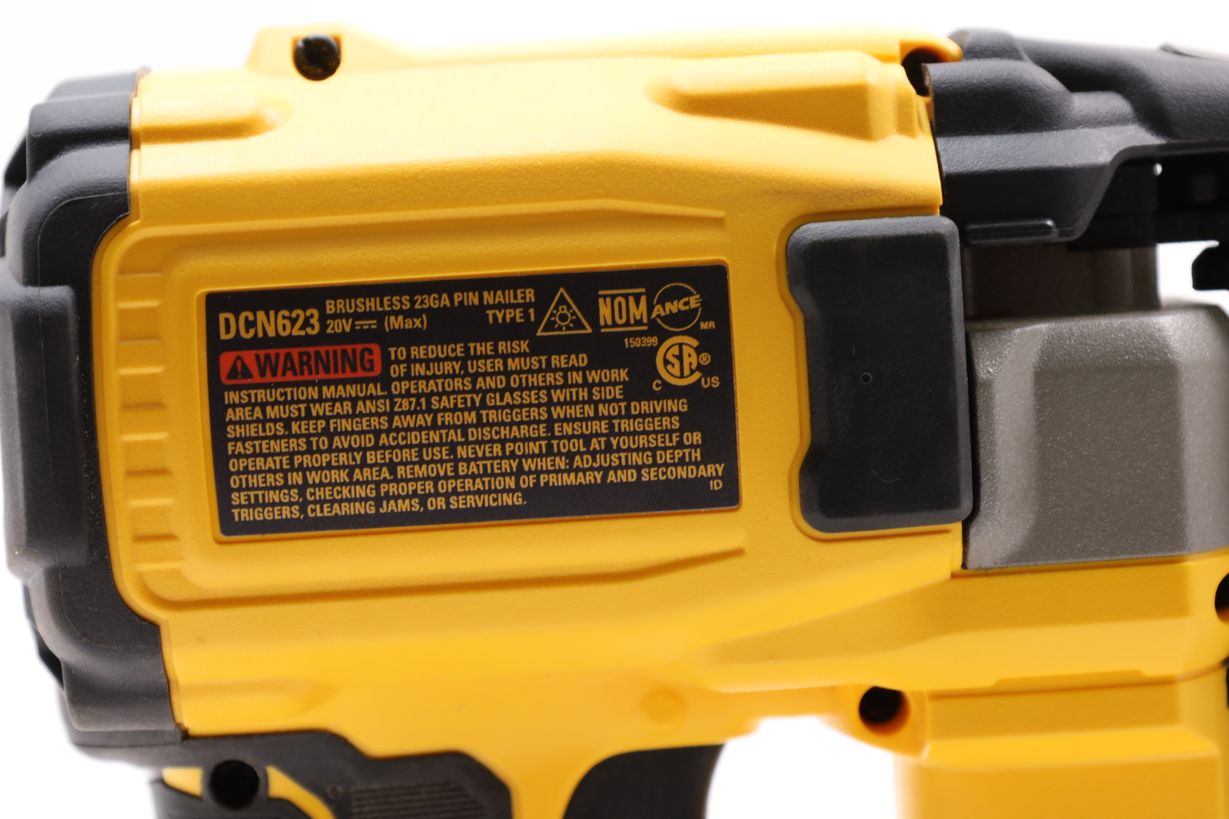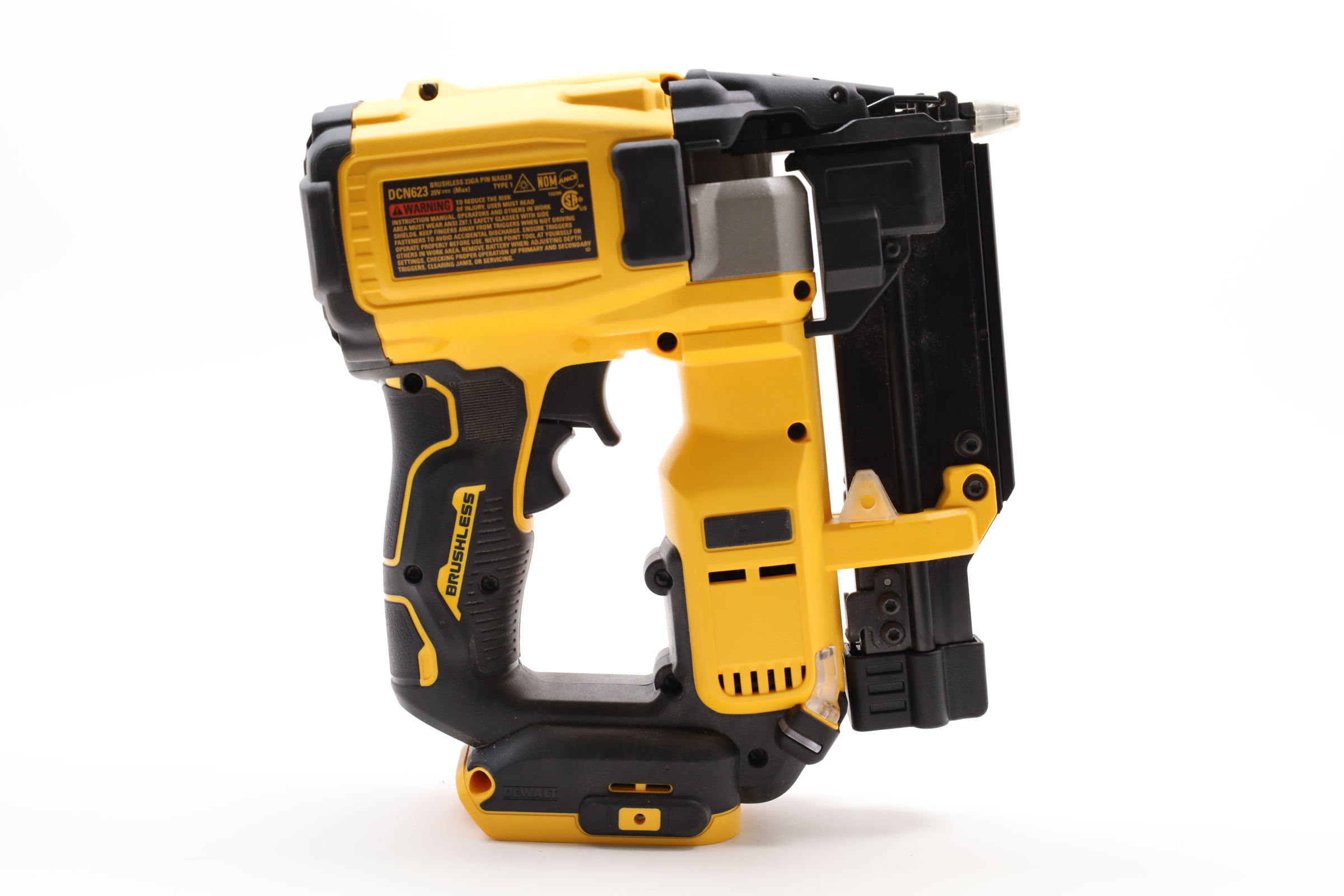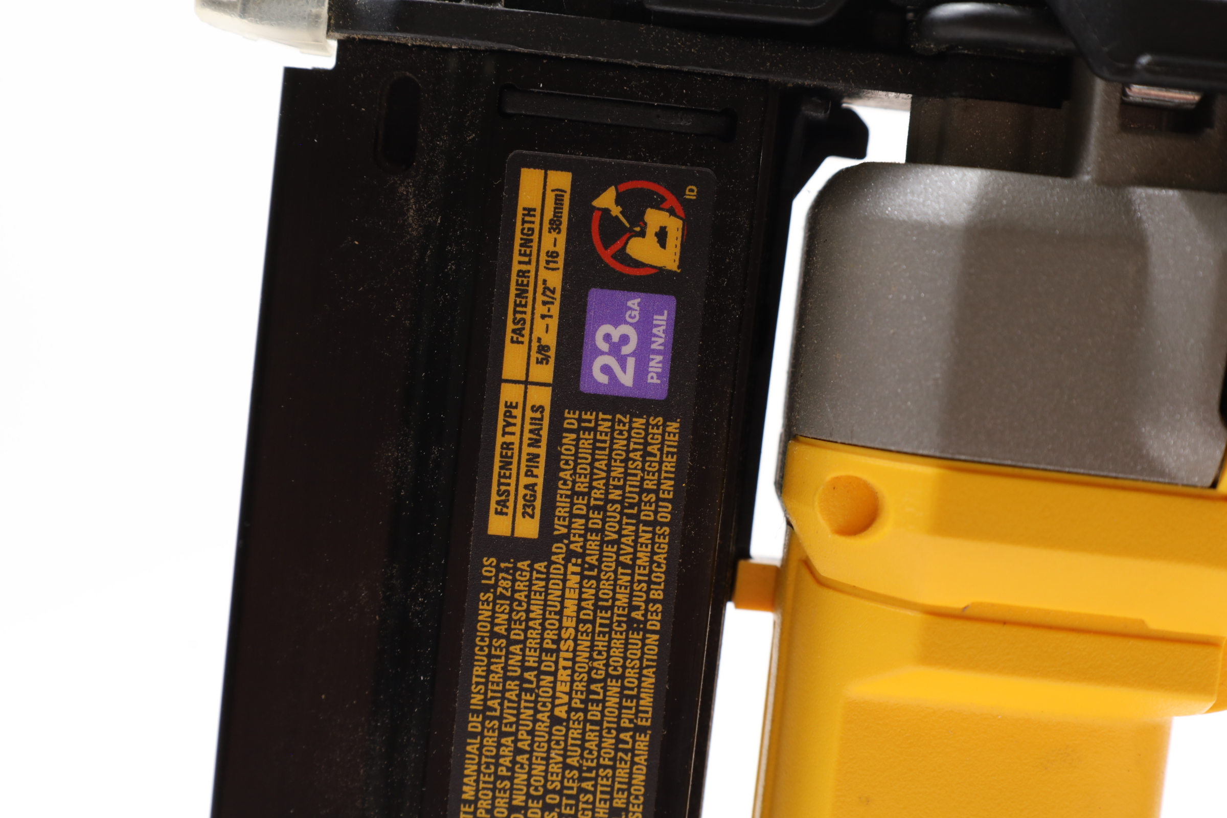 Designed for finish, trim, and remodeling tasks, offering cordless convenience without the need for hoses, compressors, or gas cartridges. It operates with a high-output brushless motor, driving 23-gauge pin nails between 5/8 inch and 1-1/2 inches in length. The tool features a tool-free jam release and depth adjustment for ease of use. A low nail lockout system with an LED indicator alerts users when reloading is needed, ensuring continuous workflow.