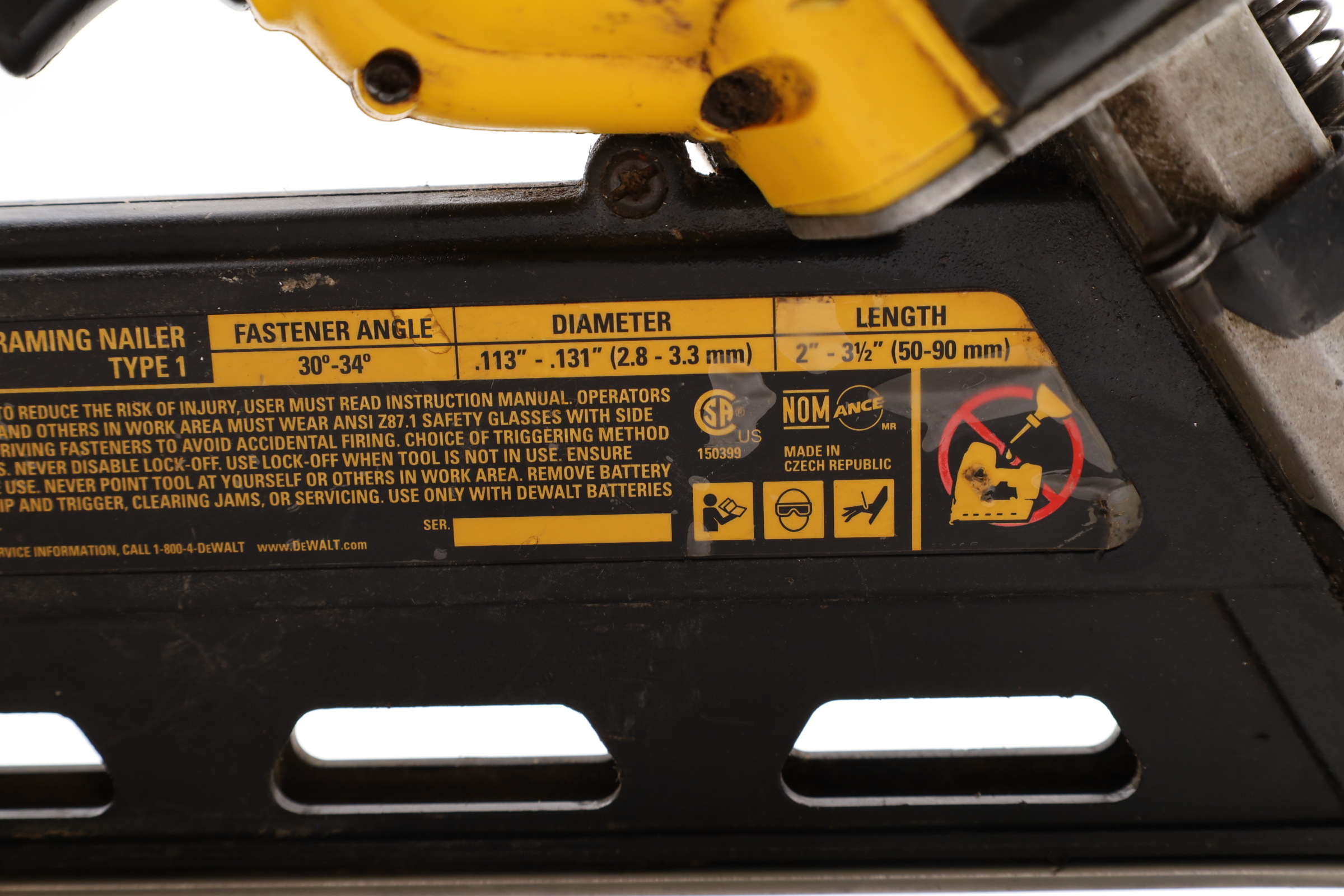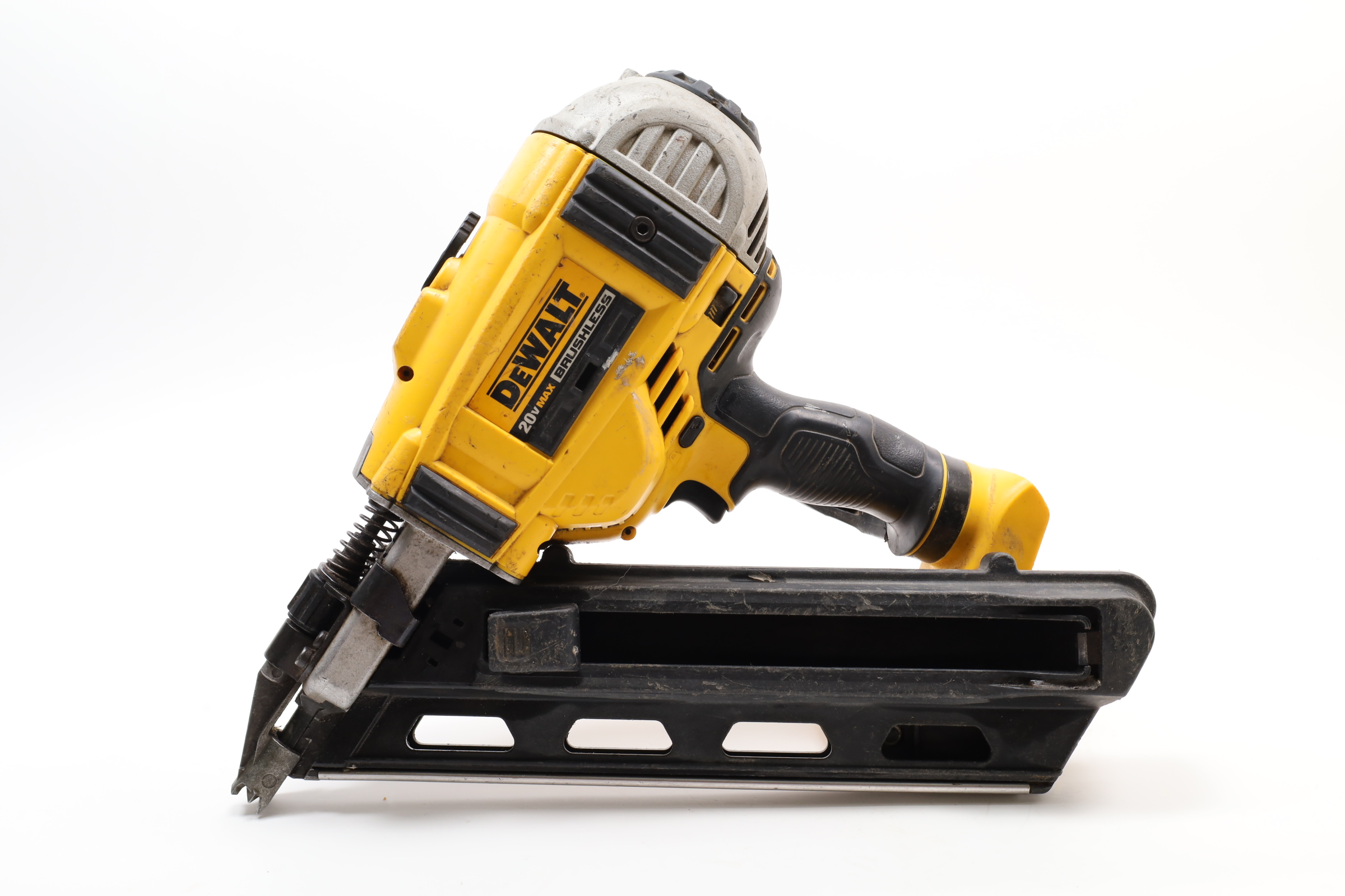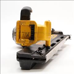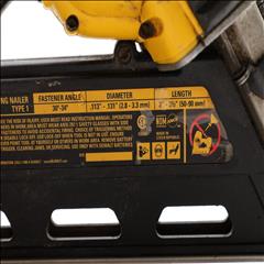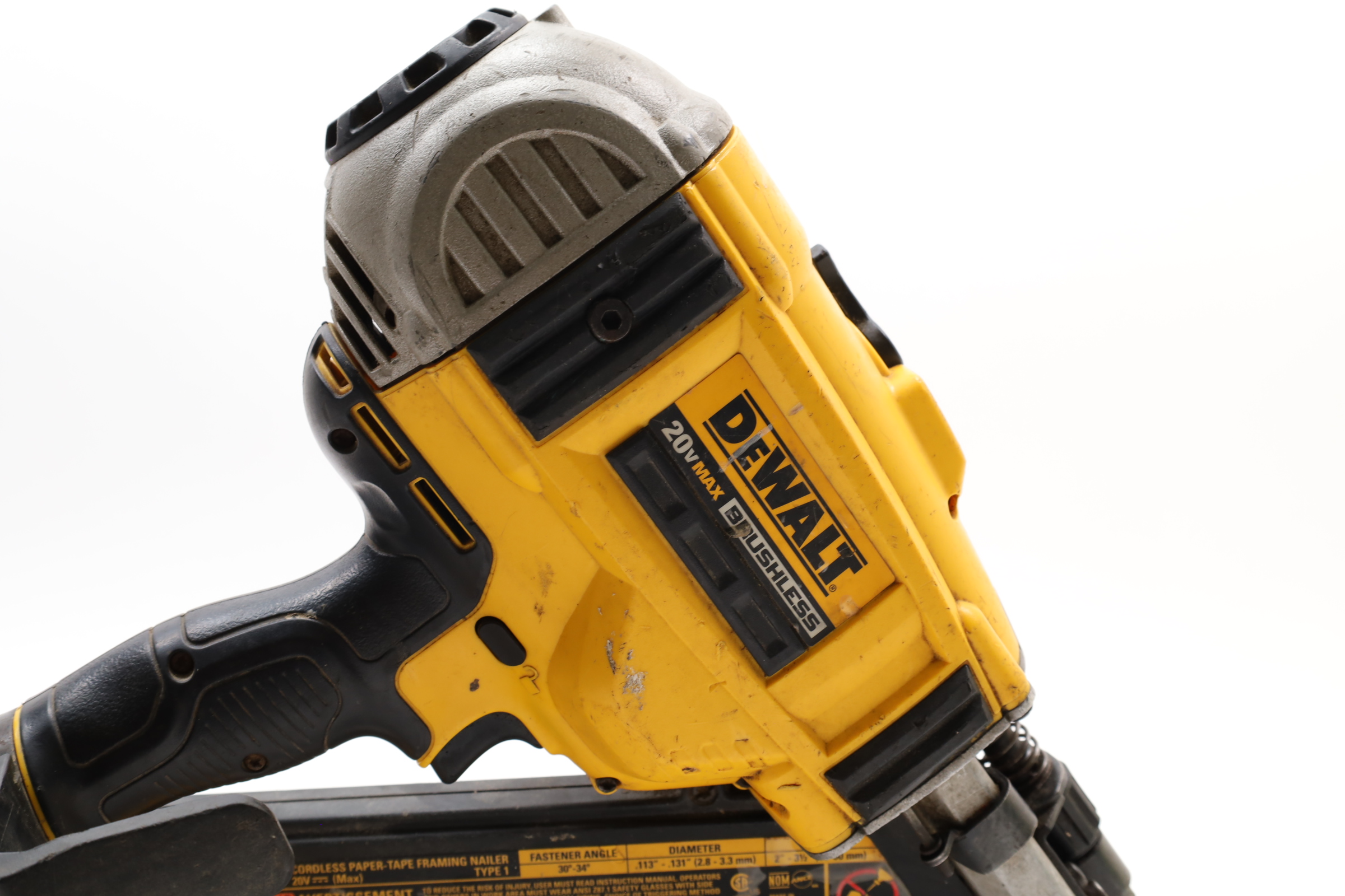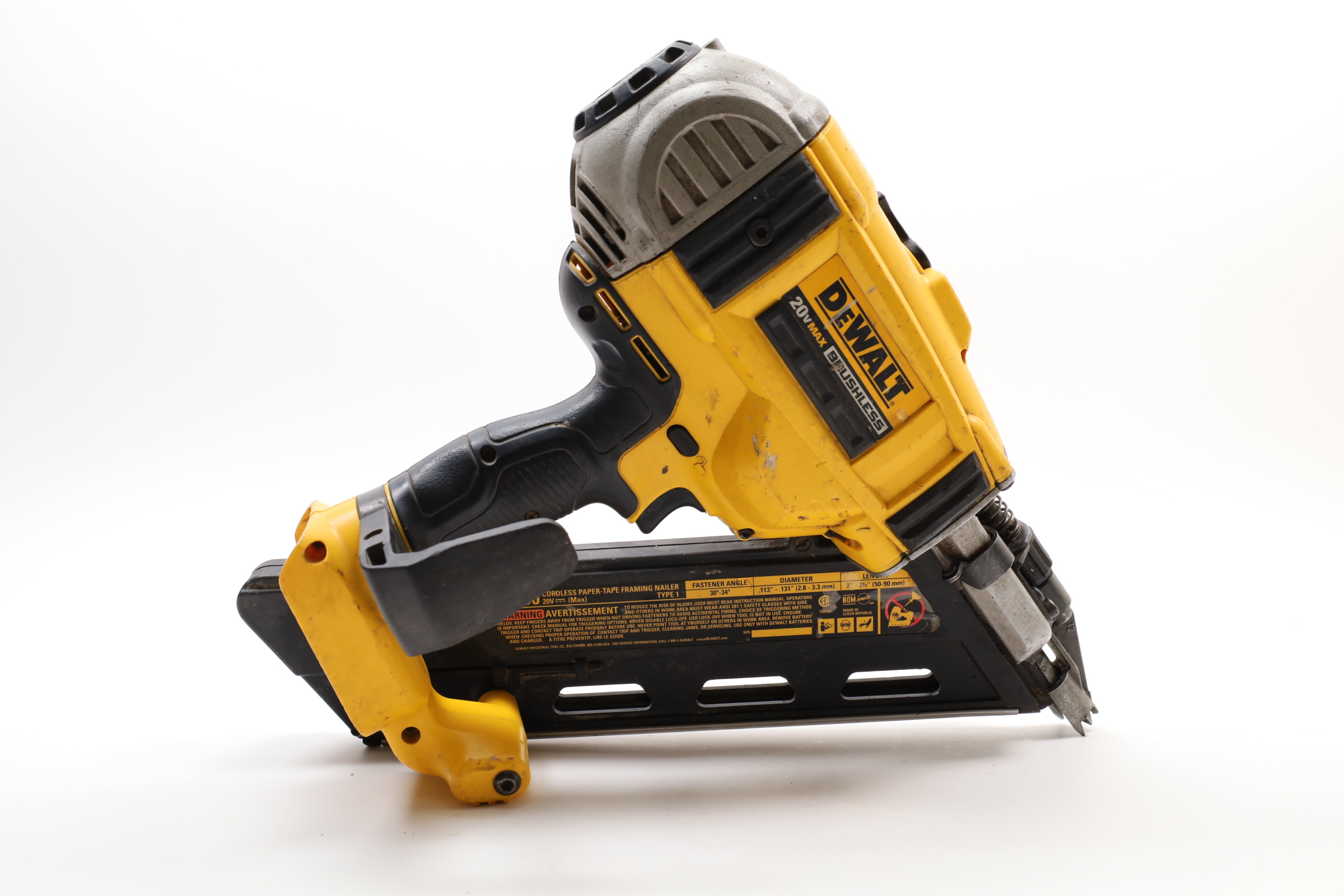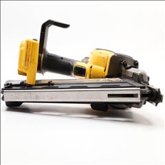 A 20V MAX Lithium-Ion Cordless Paper-Tape Framing Nailer designed for both sequential and bump firing modes. It supports fasteners ranging from 0.113 to 0.131 inches in diameter and lengths between 2 to 3 1/2 inches, using 33-degree paper-collated nails. Key features include an adjustable depth-of-drive on the nose, a swiveling belt hook adjustable for left or right-handed users, and a selector switch for firing modes. The nailer is powered by a brushless motor system, enhancing energy efficiency. Additional features include a stall release lever for easy clearing of jams and a convenient trigger lock for added safety. The fastener magazine is slightly offset, making loading straightforward and secure.