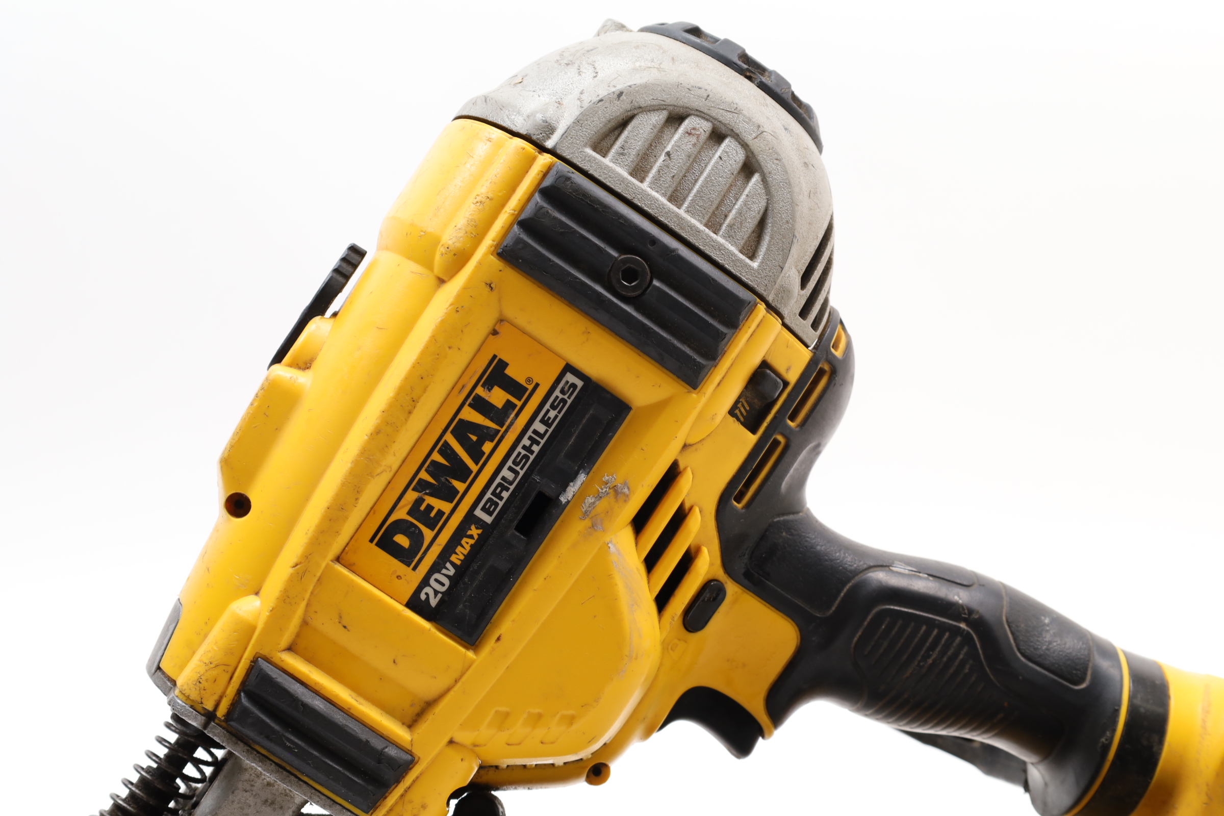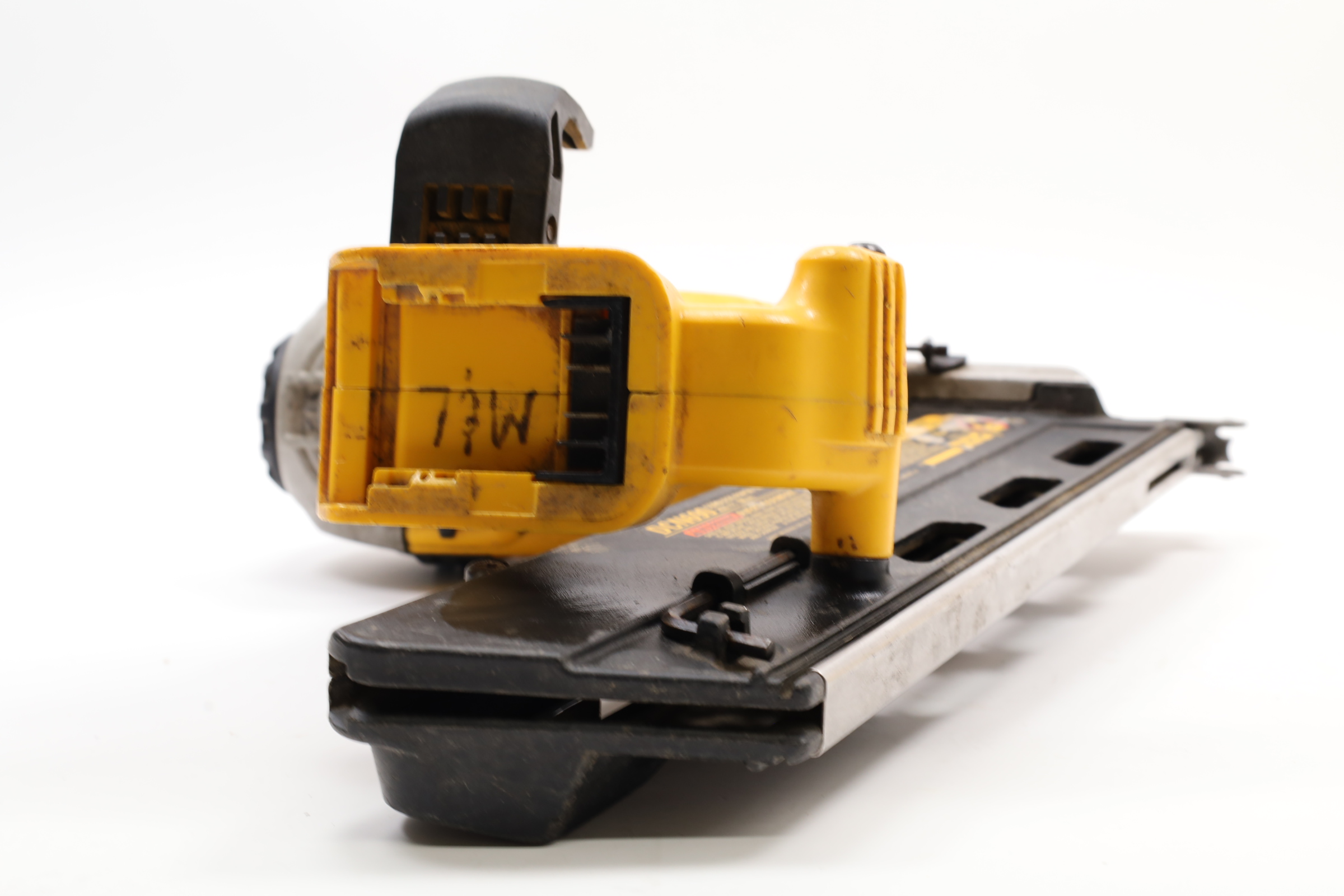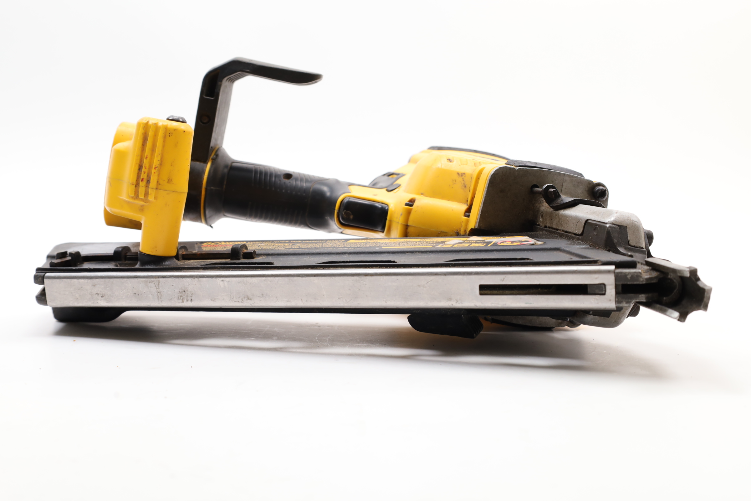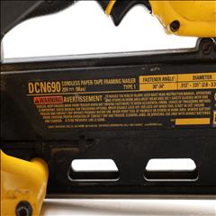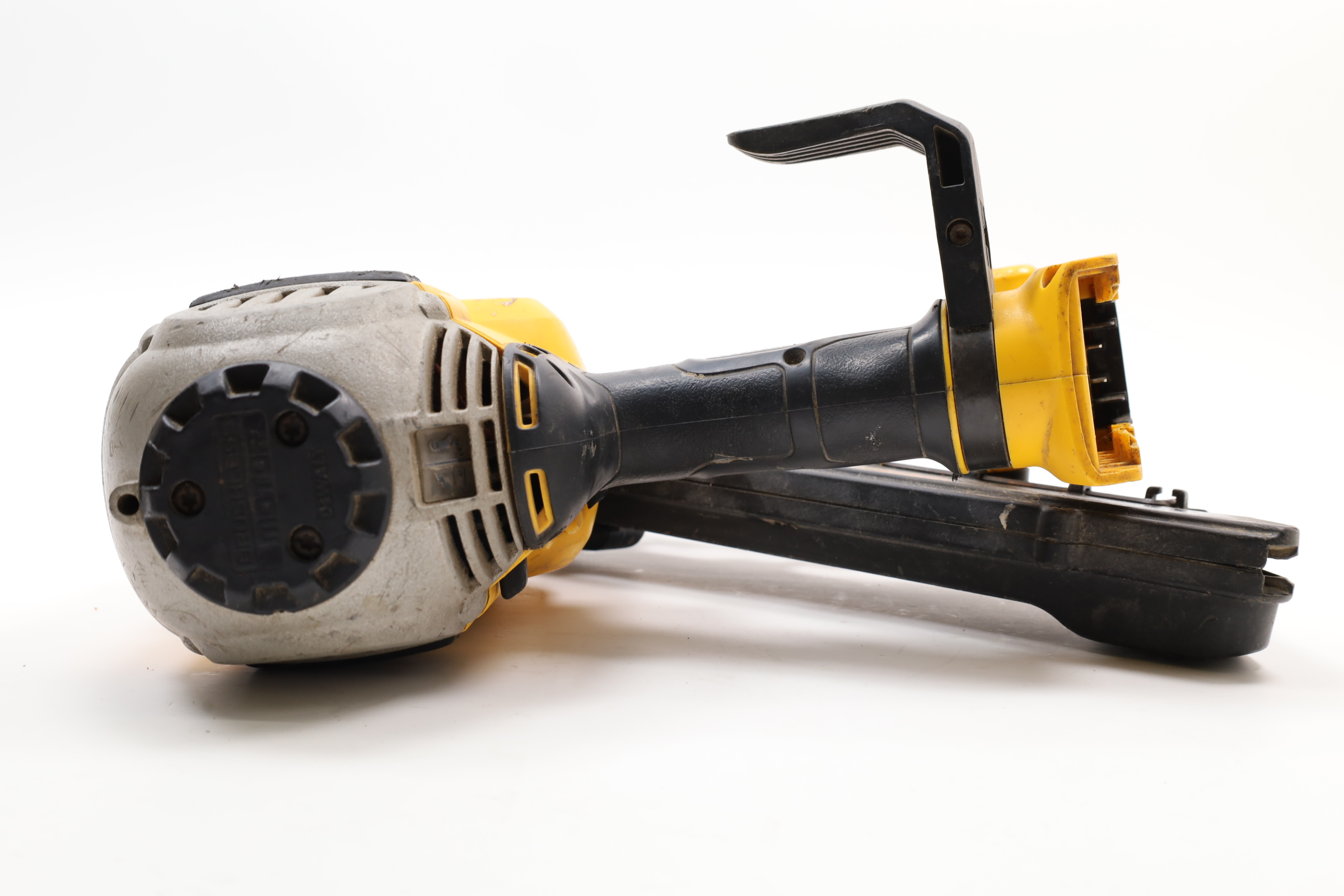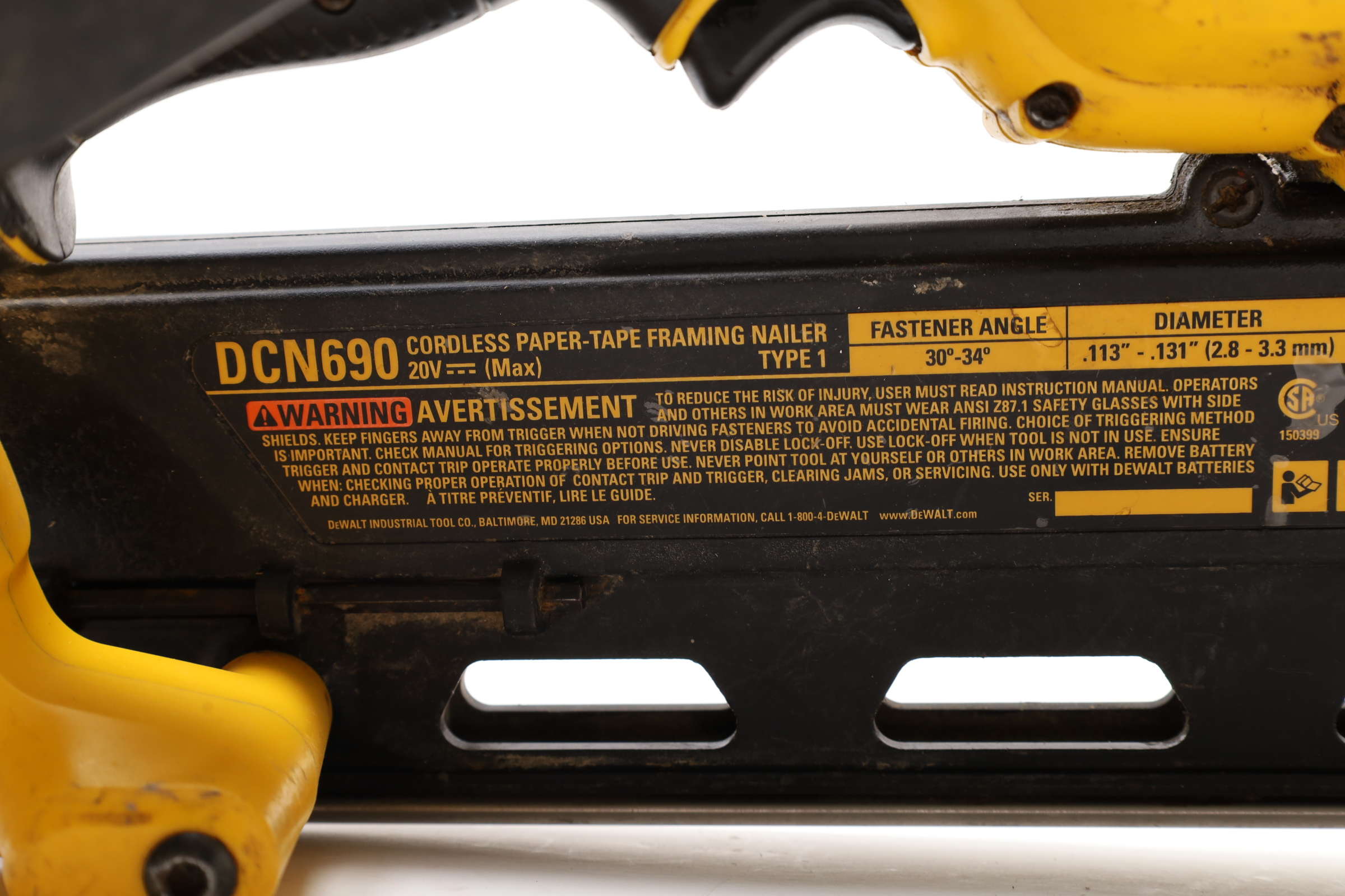 A 20V MAX Lithium-Ion Cordless Paper-Tape Framing Nailer designed for both sequential and bump firing modes. It supports fasteners ranging from 0.113 to 0.131 inches in diameter and lengths between 2 to 3 1/2 inches, using 33-degree paper-collated nails. Key features include an adjustable depth-of-drive on the nose, a swiveling belt hook adjustable for left or right-handed users, and a selector switch for firing modes. The nailer is powered by a brushless motor system, enhancing energy efficiency. Additional features include a stall release lever for easy clearing of jams and a convenient trigger lock for added safety. The fastener magazine is slightly offset, making loading straightforward and secure.