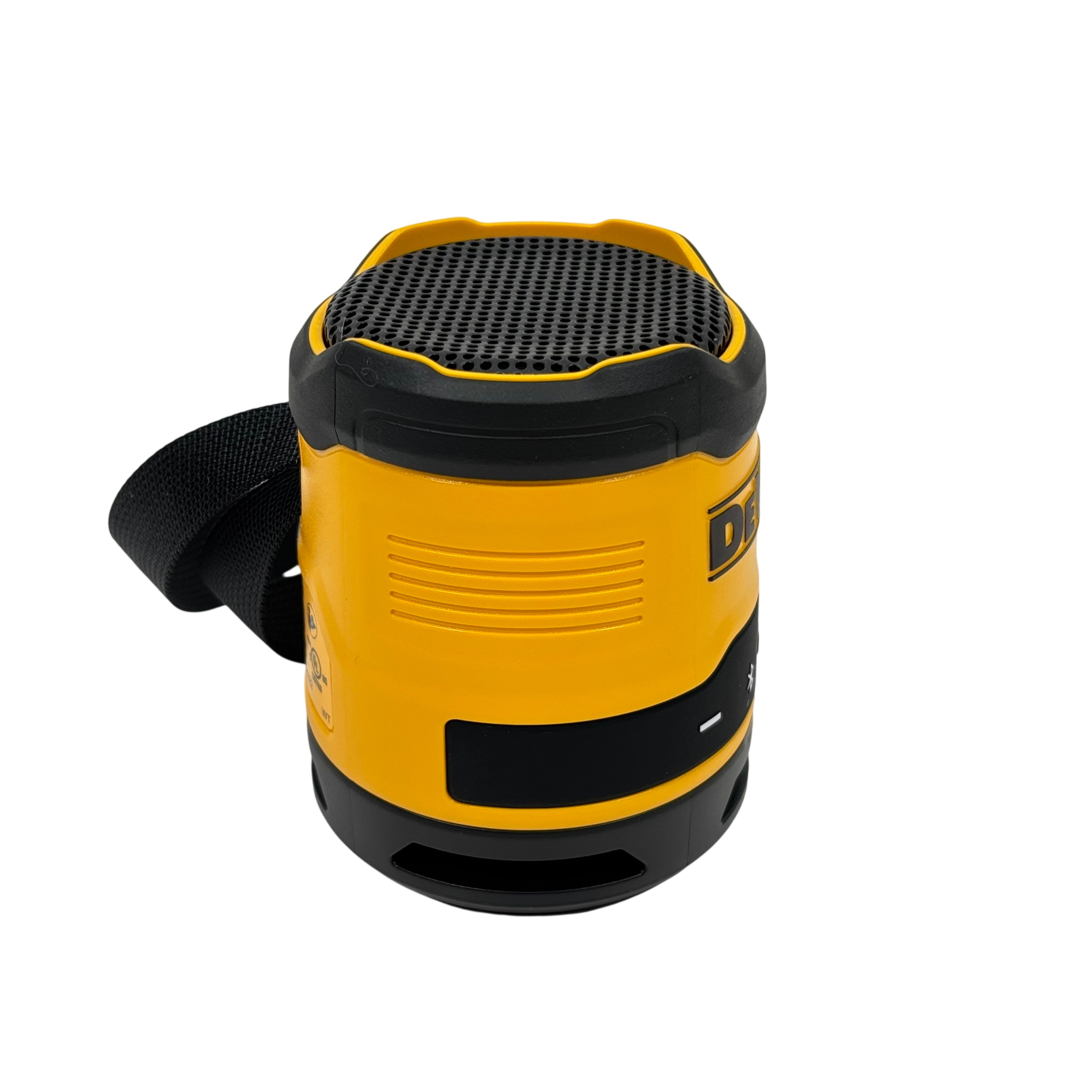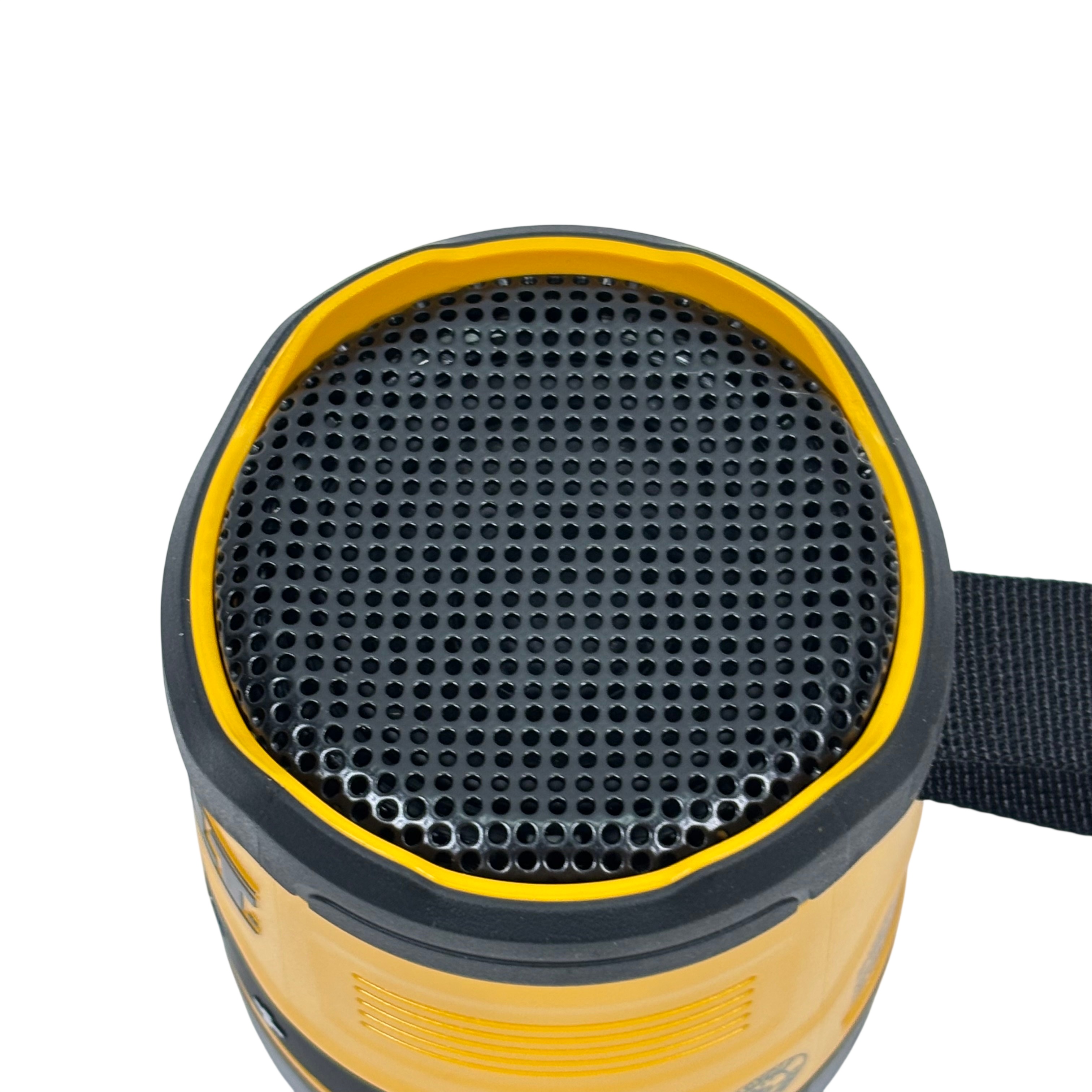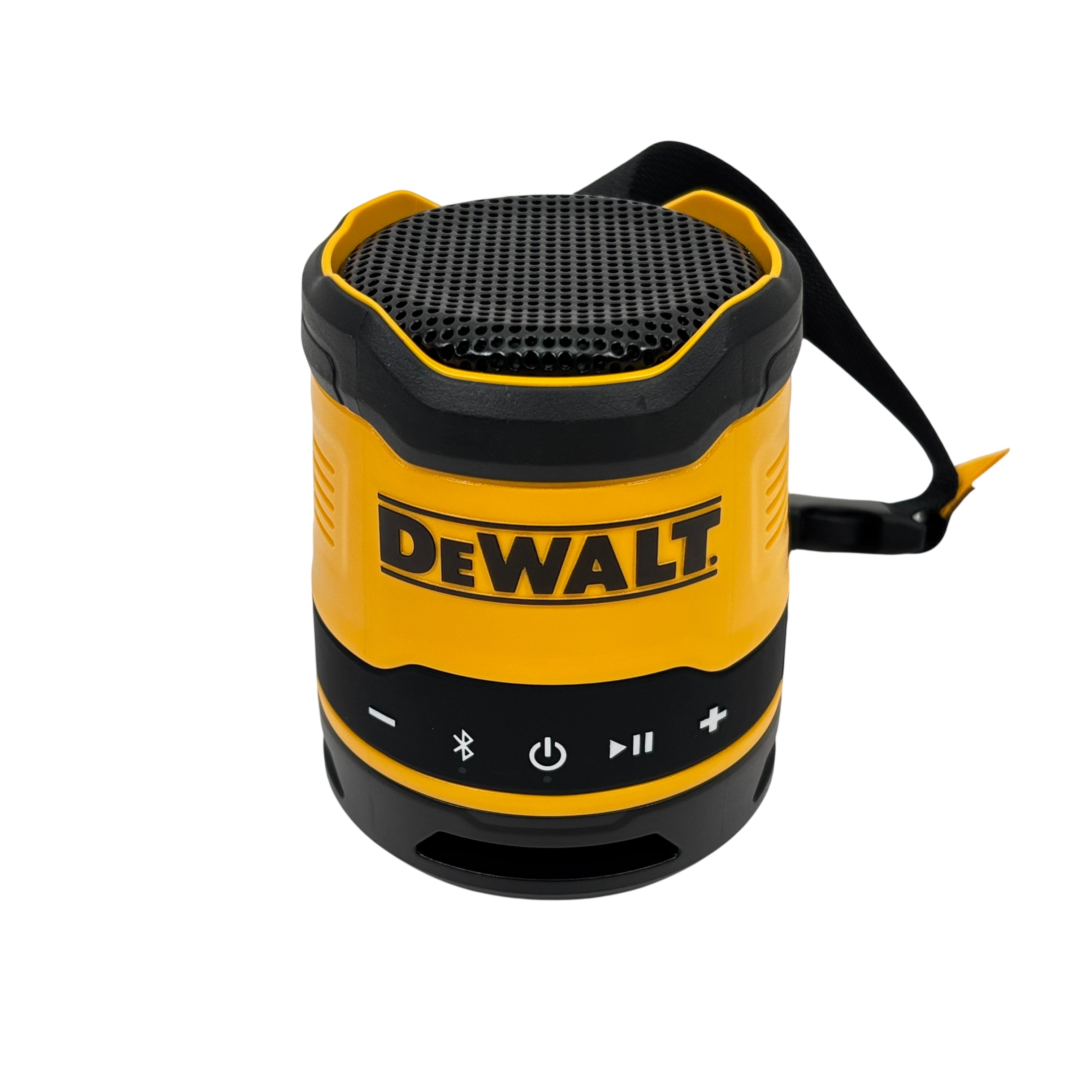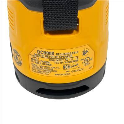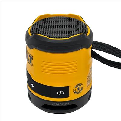DeWalt DCR008 Rechargeable Mini Bluetooth Speaker offers portable wireless audio with a compact design in the iconic DeWalt yellow and black color scheme. Featuring Bluetooth connectivity and a rechargeable battery powered via 5V USB input, this speaker is ideal for on-the-go use at job sites or outdoor settings. It includes convenient control buttons for volume adjustment, play/pause, and power, plus a durable carry strap for easy transport. This rugged mini speaker delivers reliable sound performance in a compact, industrial-grade package.