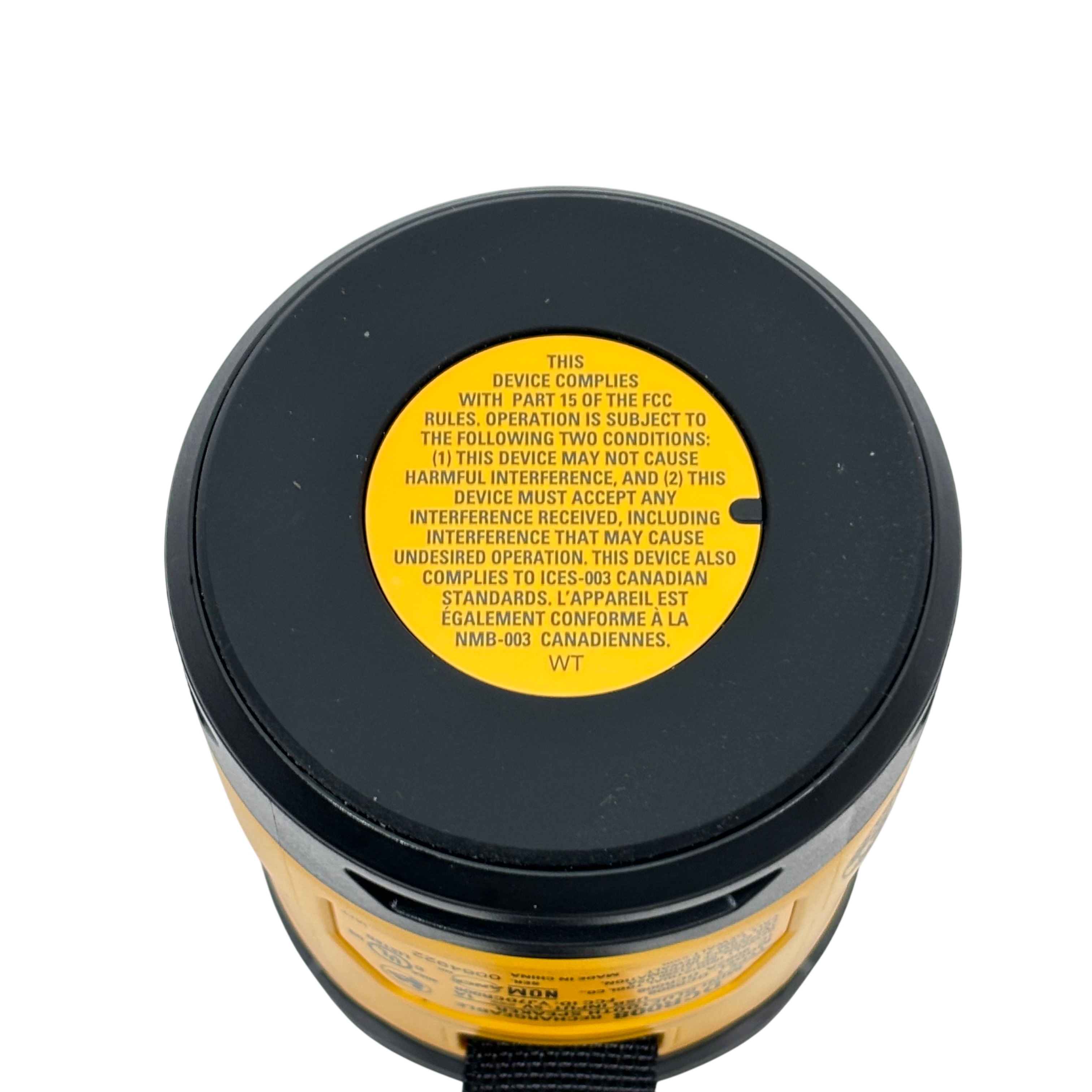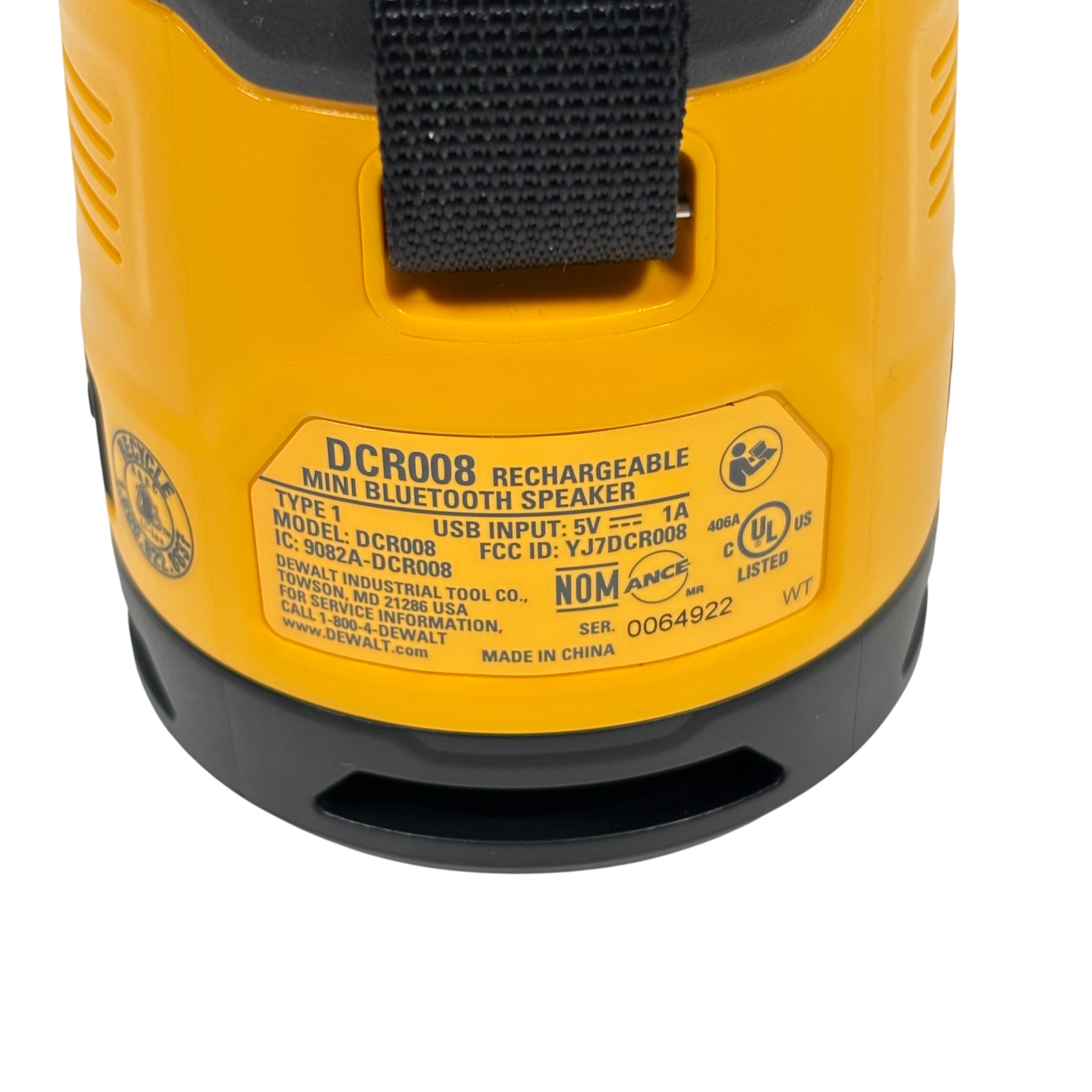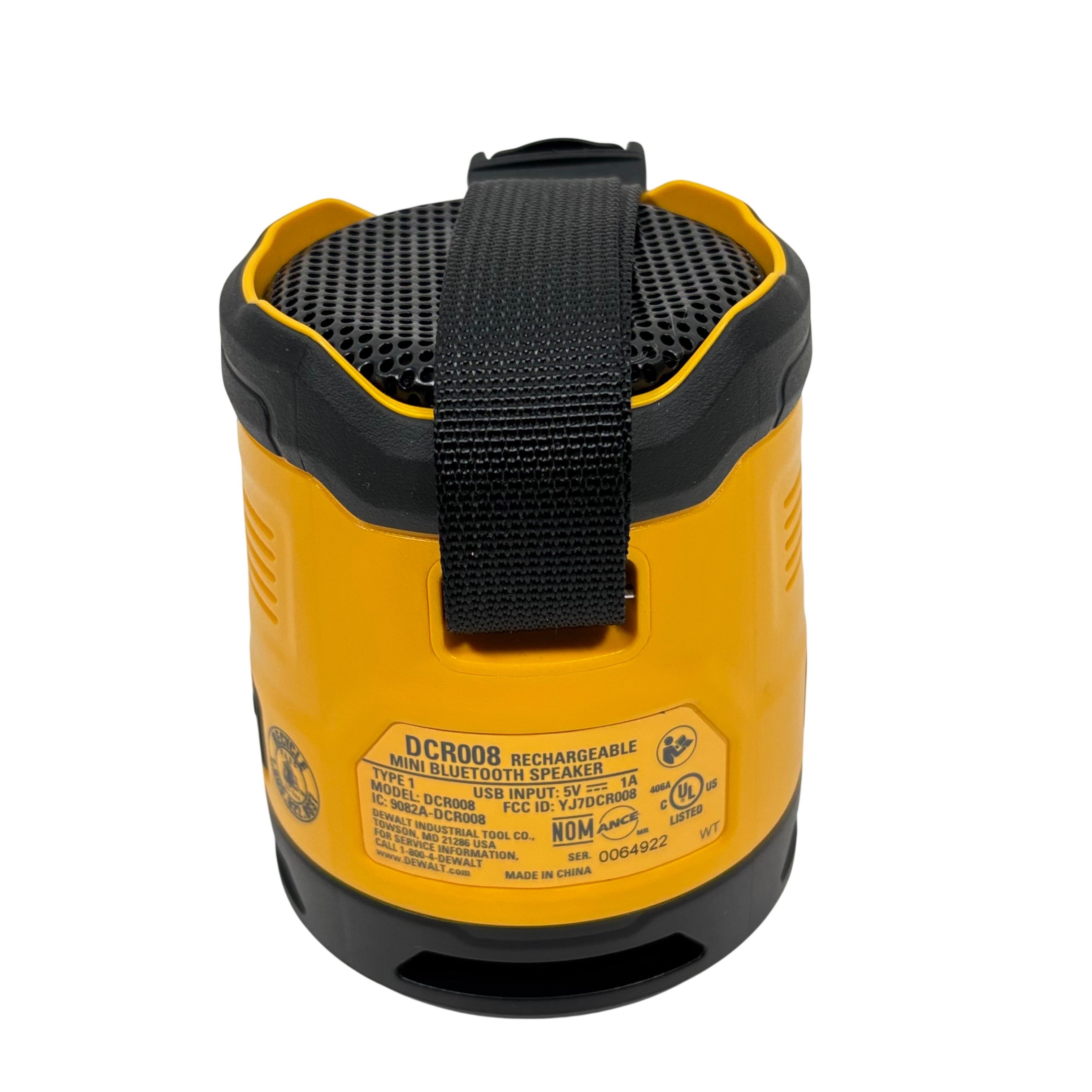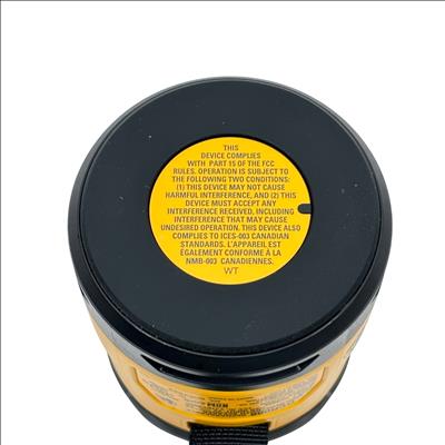 DeWalt DCR008 Rechargeable Mini Bluetooth Speaker offers portable wireless audio with a compact design in the iconic DeWalt yellow and black color scheme. Featuring Bluetooth connectivity and a rechargeable battery powered via 5V USB input, this speaker is ideal for on-the-go use at job sites or outdoor settings. It includes convenient control buttons for volume adjustment, play/pause, and power, plus a durable carry strap for easy transport. This rugged mini speaker delivers reliable sound performance in a compact, industrial-grade package.