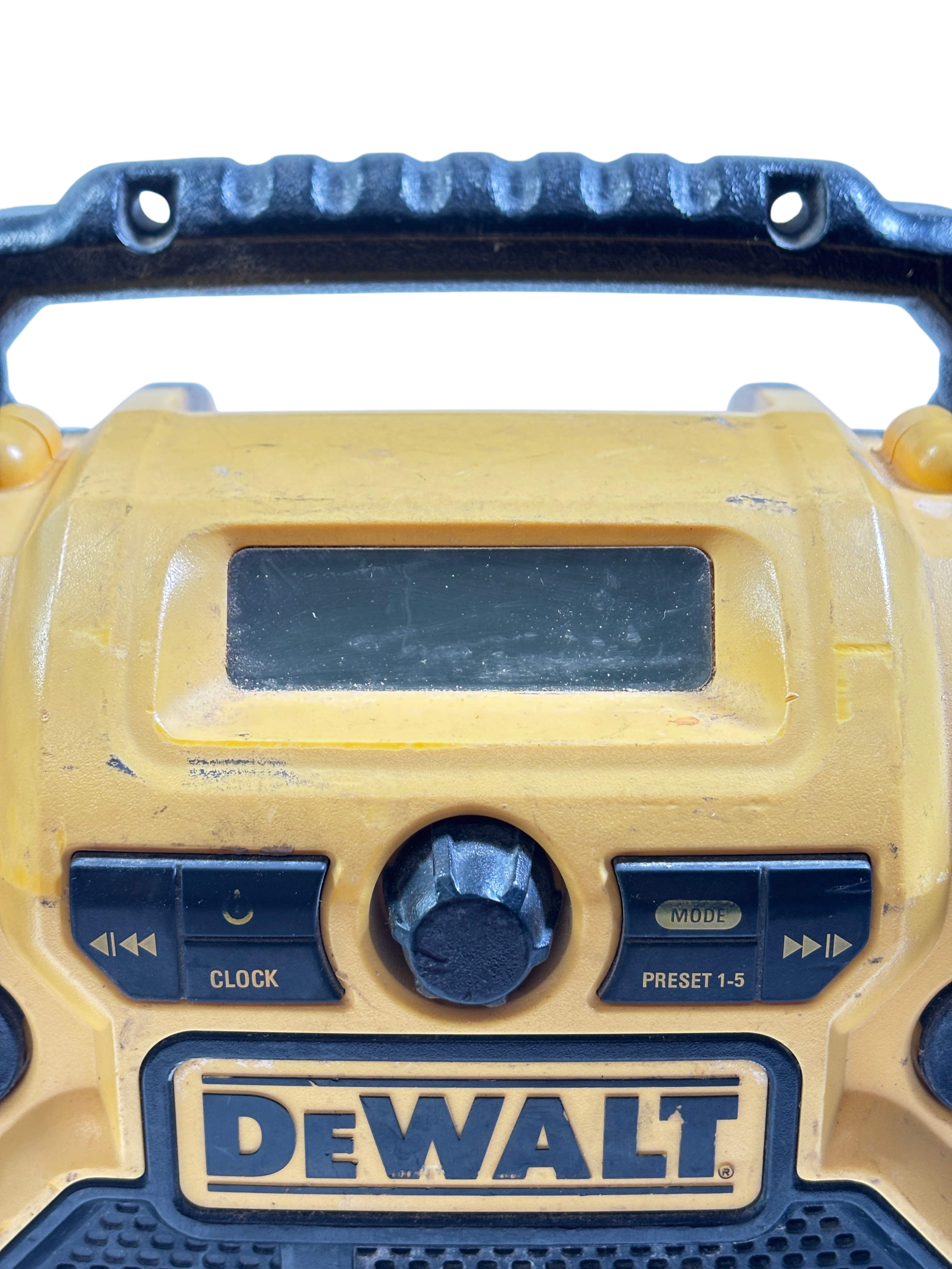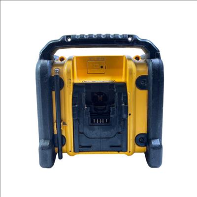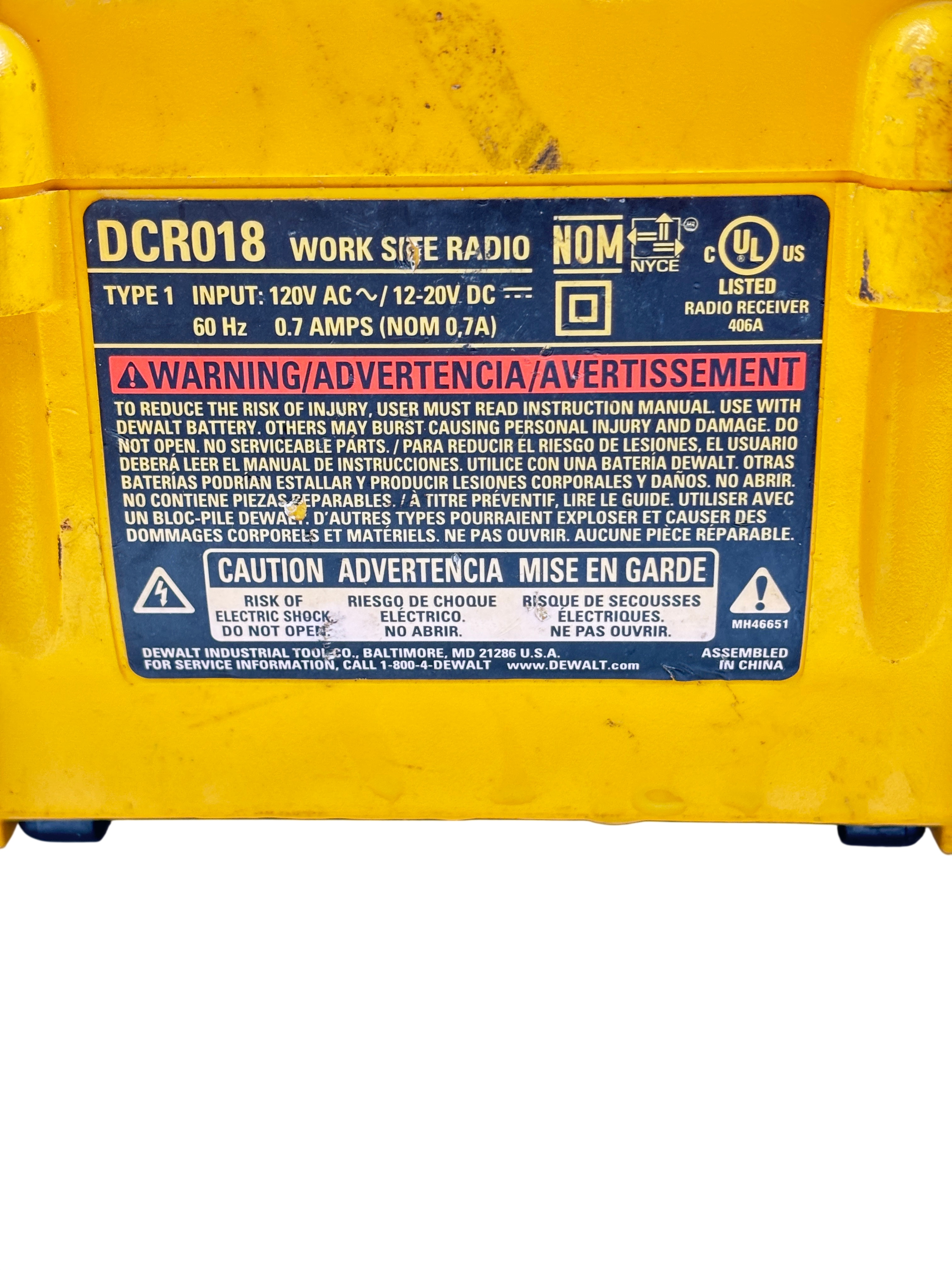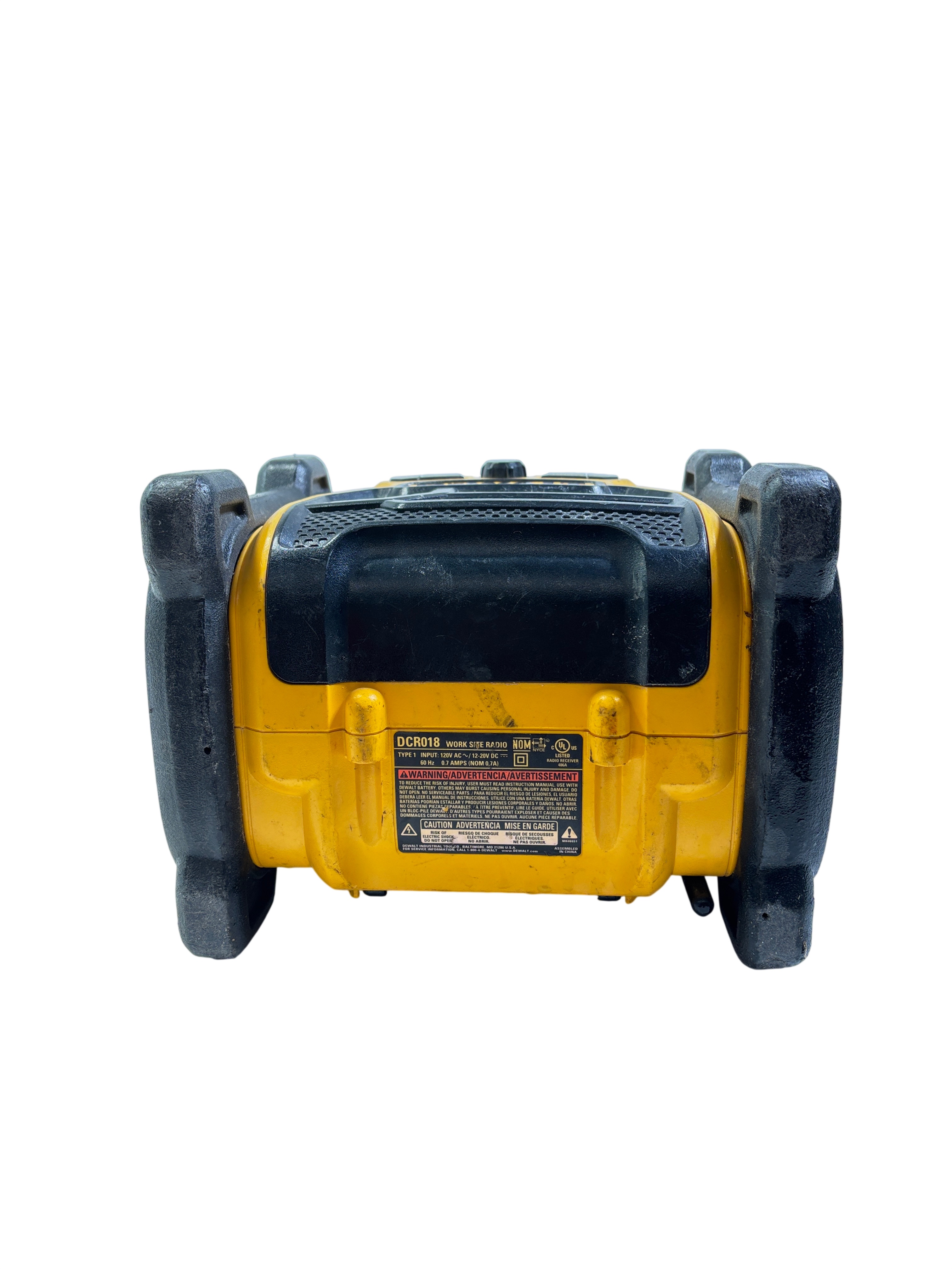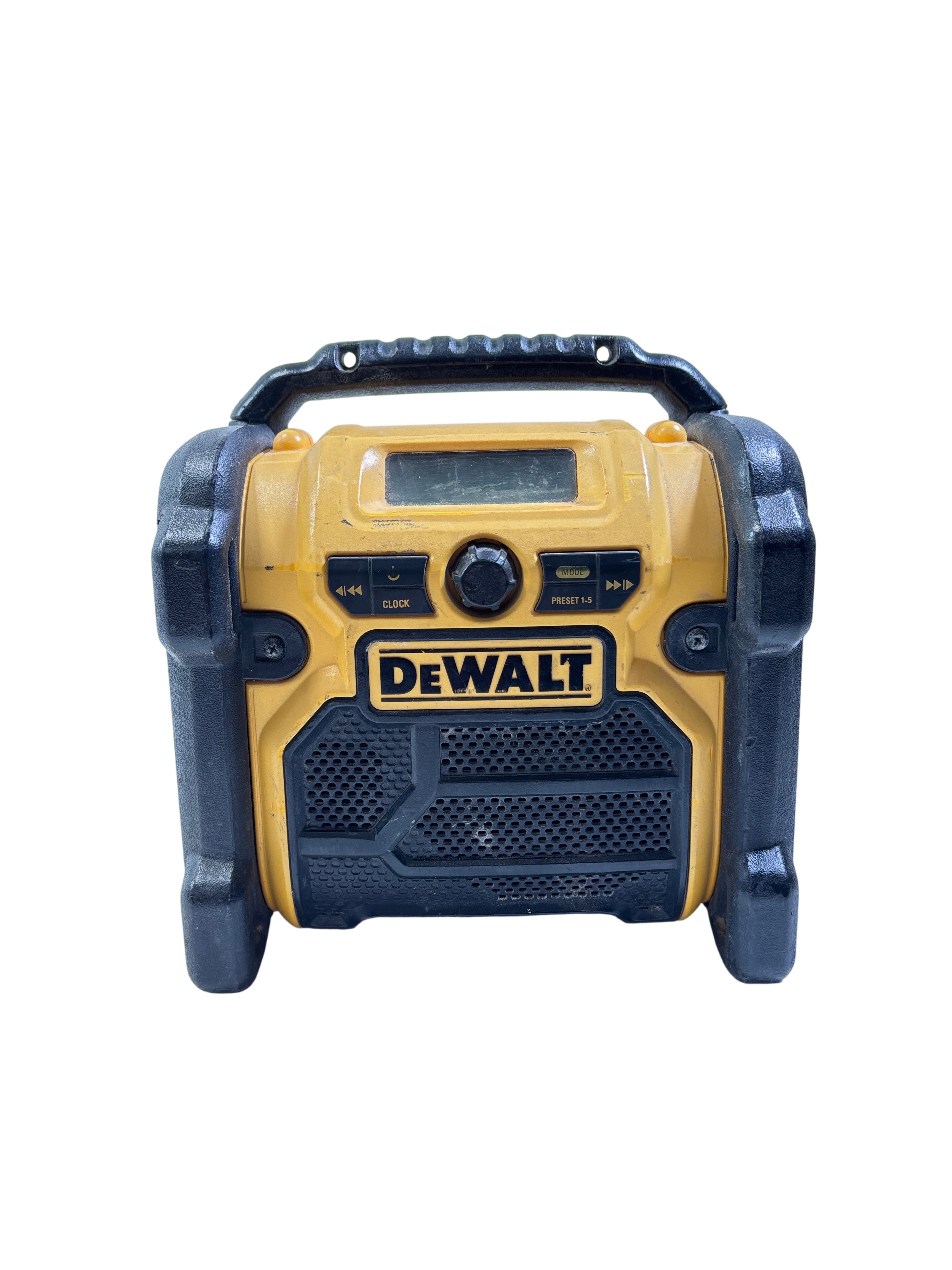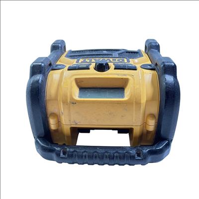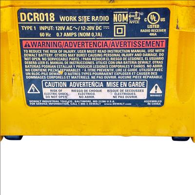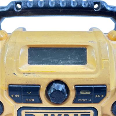 The DeWalt DCR018 Cordless Worksite Radio is designed for rugged jobsite use, compatible with DeWalt 12-20V batteries or standard 120V AC power. This durable radio features a digital clock, preset radio station memory for up to five stations, and a sturdy handle for easy transport. Its compact dimensions and robust construction make it ideal for construction sites or workshops where reliable audio and portability are essential.