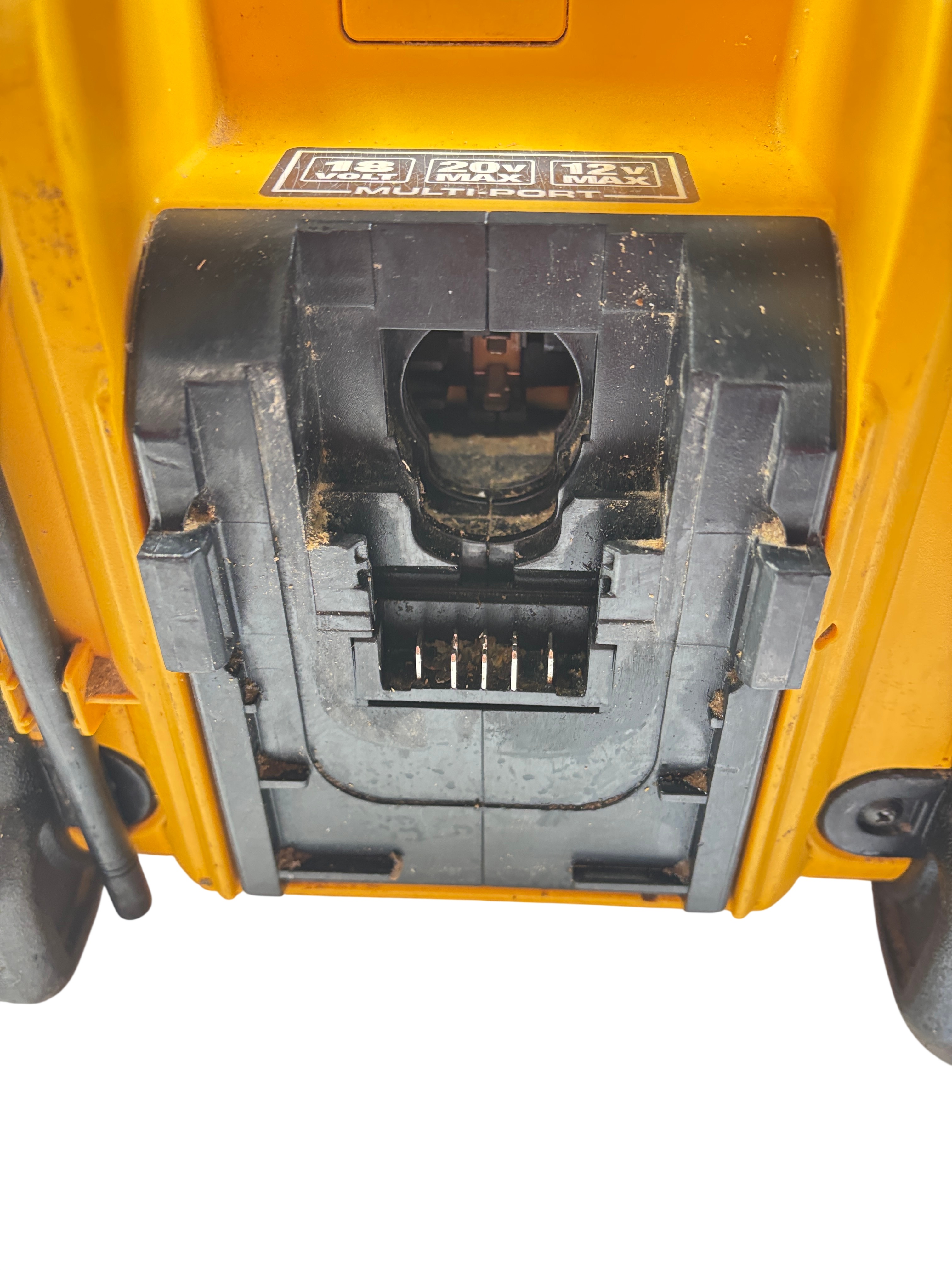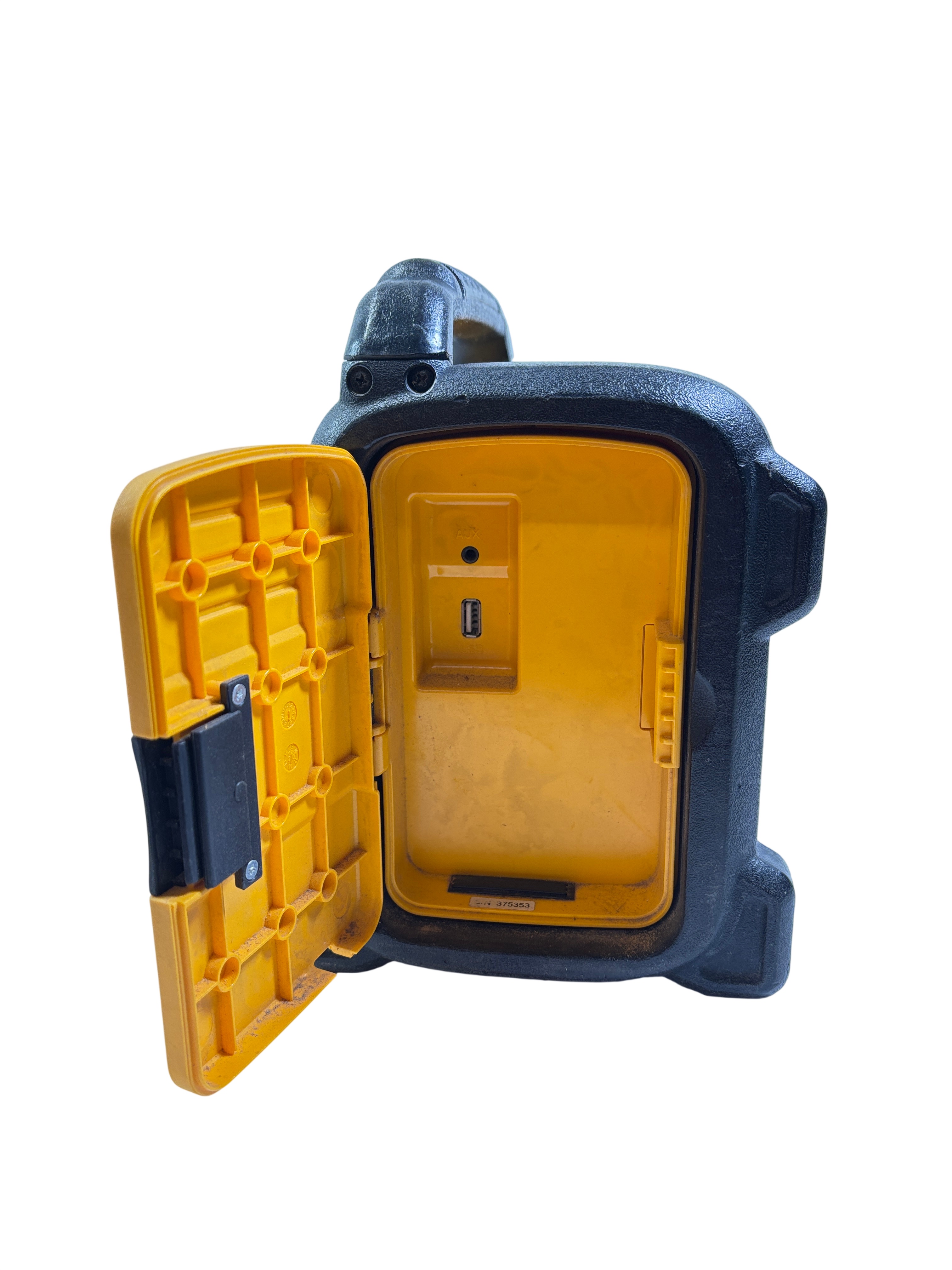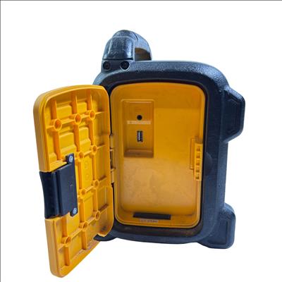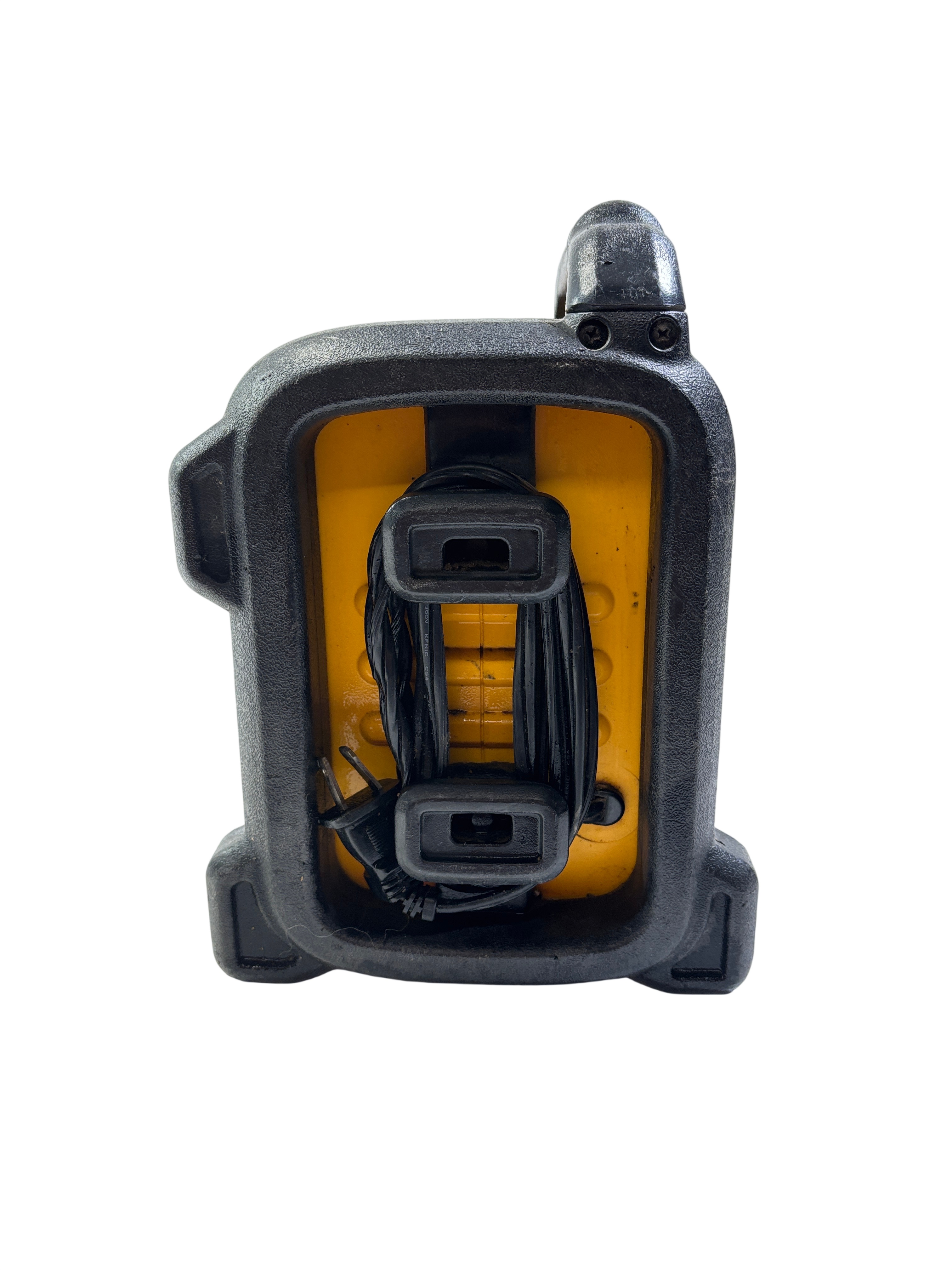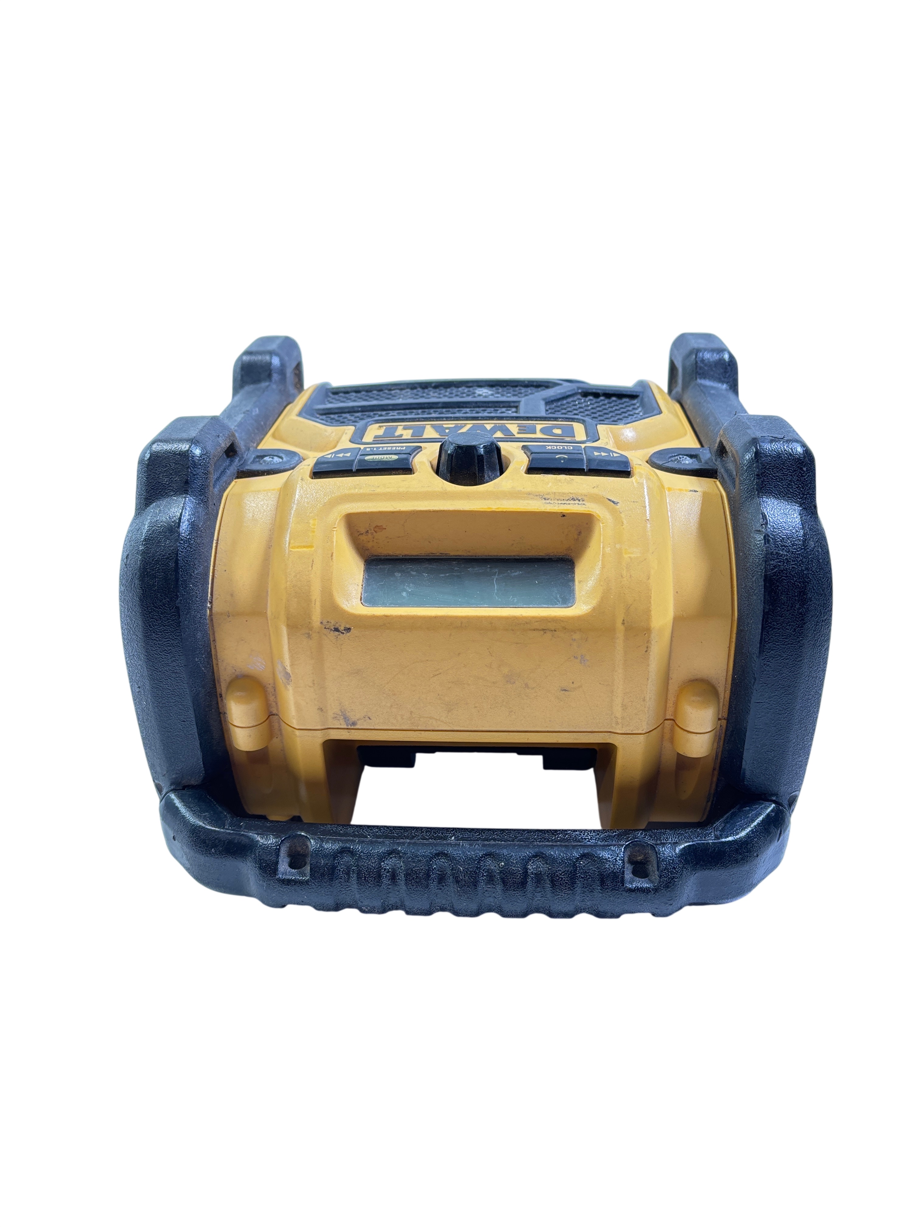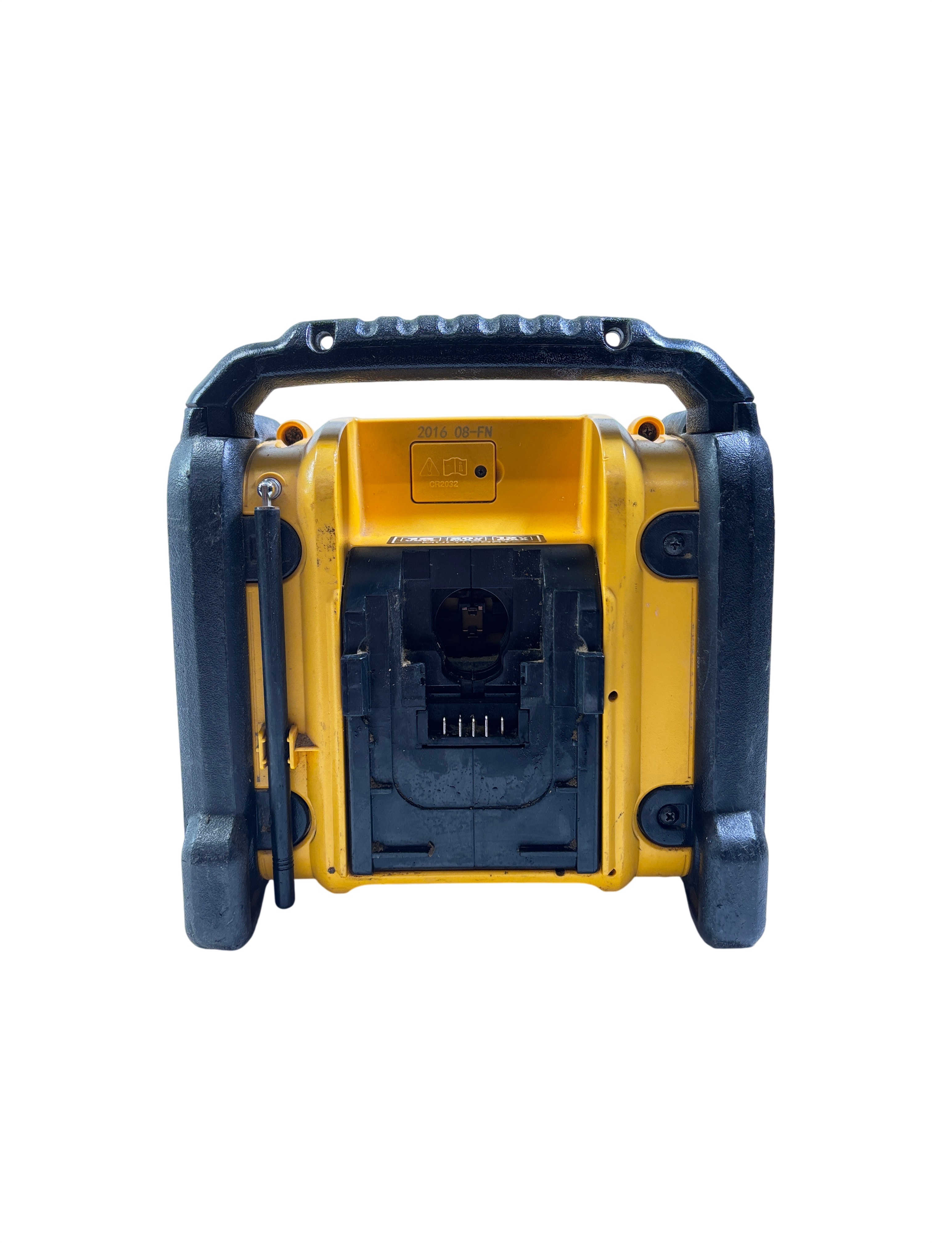 The DeWalt DCR018 Cordless Worksite Radio is designed for rugged jobsite use, compatible with DeWalt 12-20V batteries or standard 120V AC power. This durable radio features a digital clock, preset radio station memory for up to five stations, and a sturdy handle for easy transport. Its compact dimensions and robust construction make it ideal for construction sites or workshops where reliable audio and portability are essential.