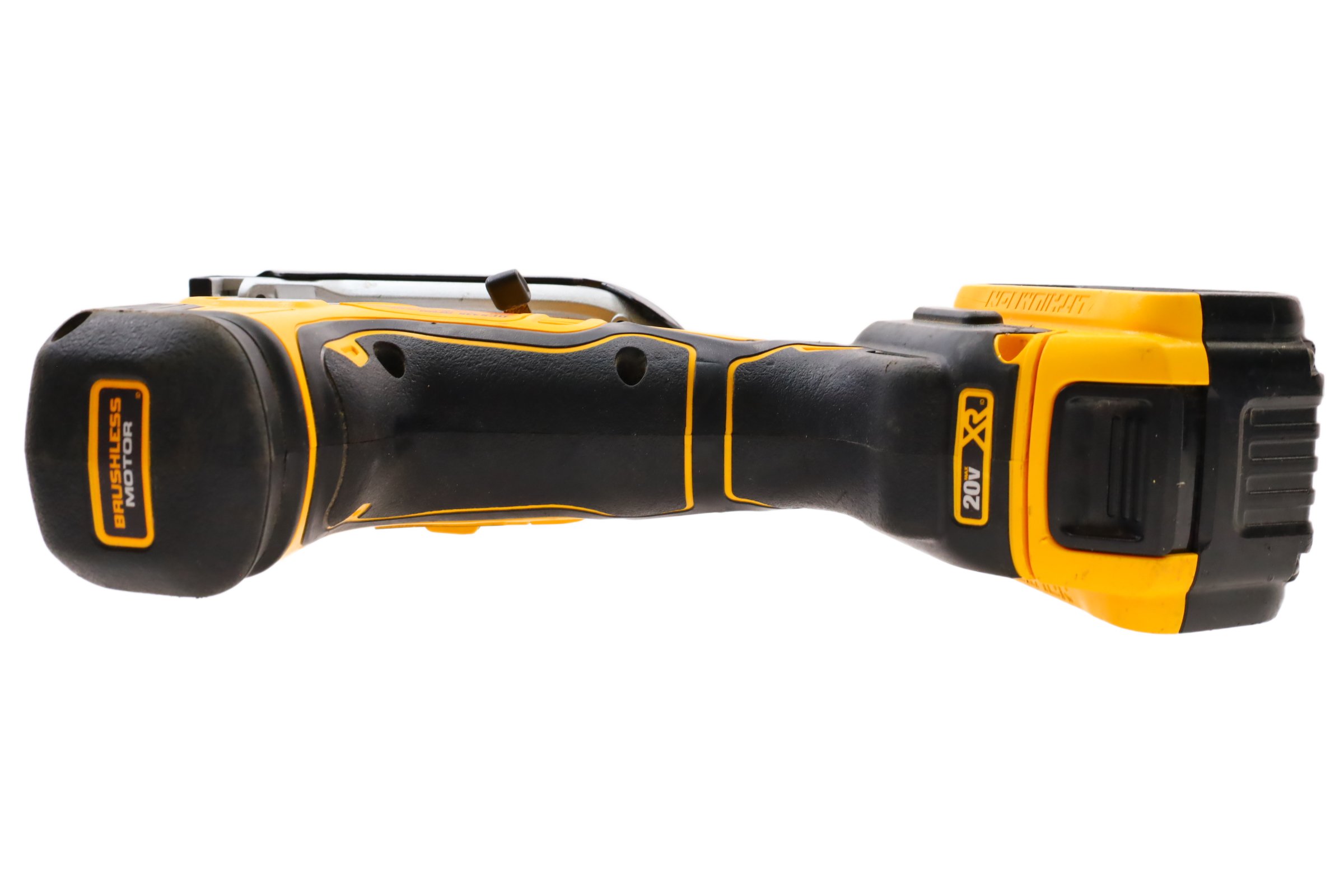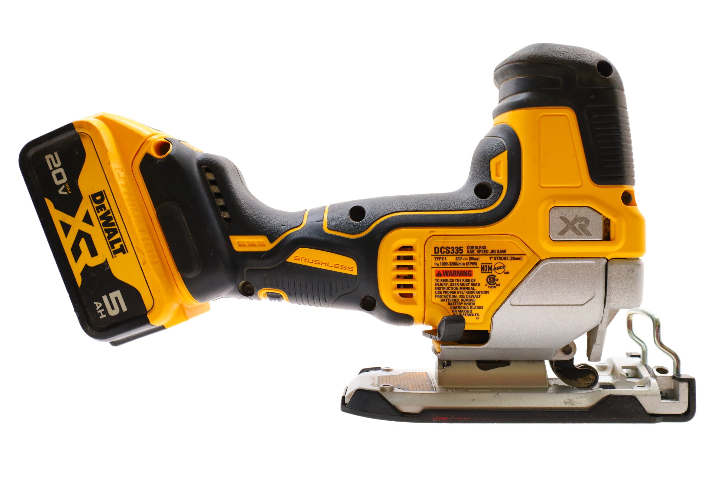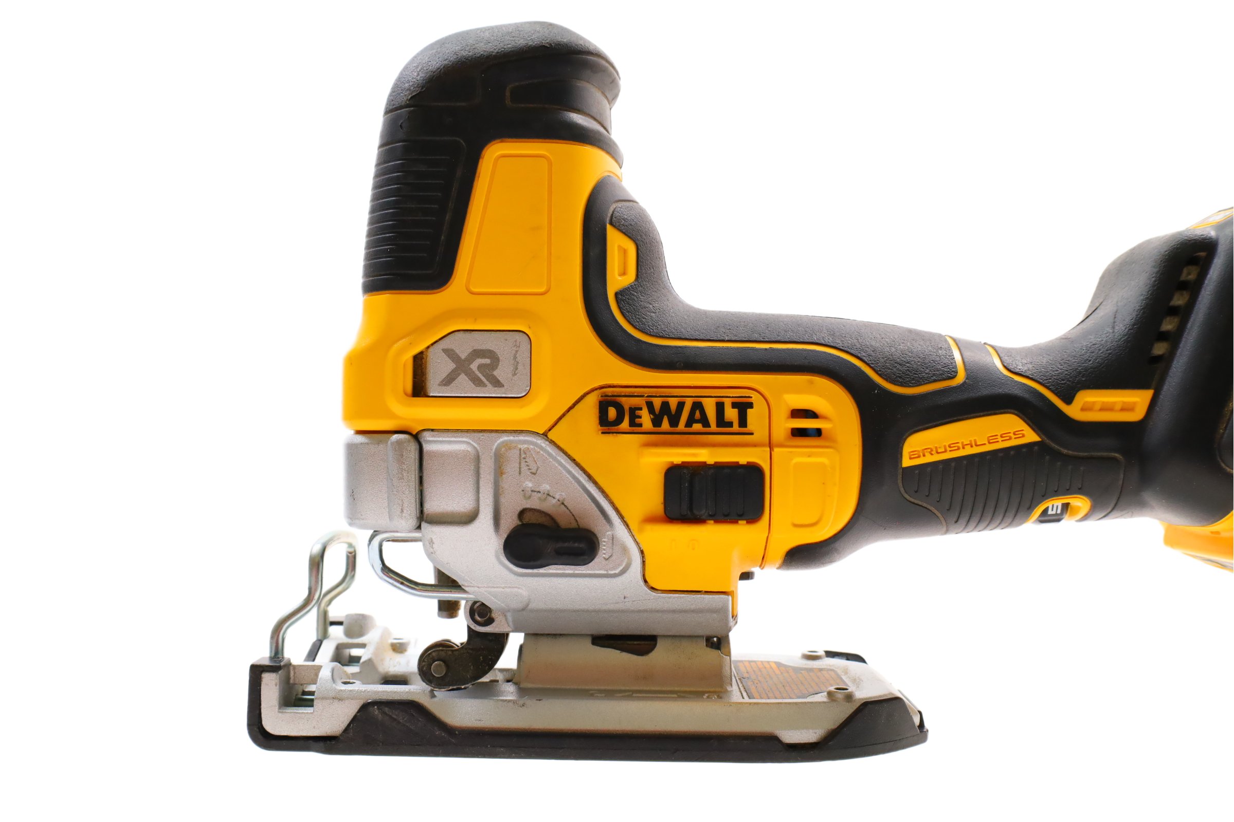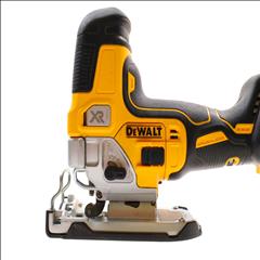 Designed for precision and efficiency with a brushless motor offering powerful performance. It features a variable speed trigger and dial to control blade speeds up to 3,200 SPM, ideal for cutting various materials. The 4-position orbital action enhances cut quality and speed, while the all-metal, lever-action keyless blade clamp allows for quick t-shank blade changes. Additional features include a bright LED for improved visibility, an integrated dust blower to maintain a clear cutting line, and a keyless shoe bevel with detents at 0, 15, 30, and 45 degrees for easy adjustments. The removable no-mar shoe cover helps protect work surfaces from scratches, making this jigsaw a practical tool for curved cuts and cutouts.