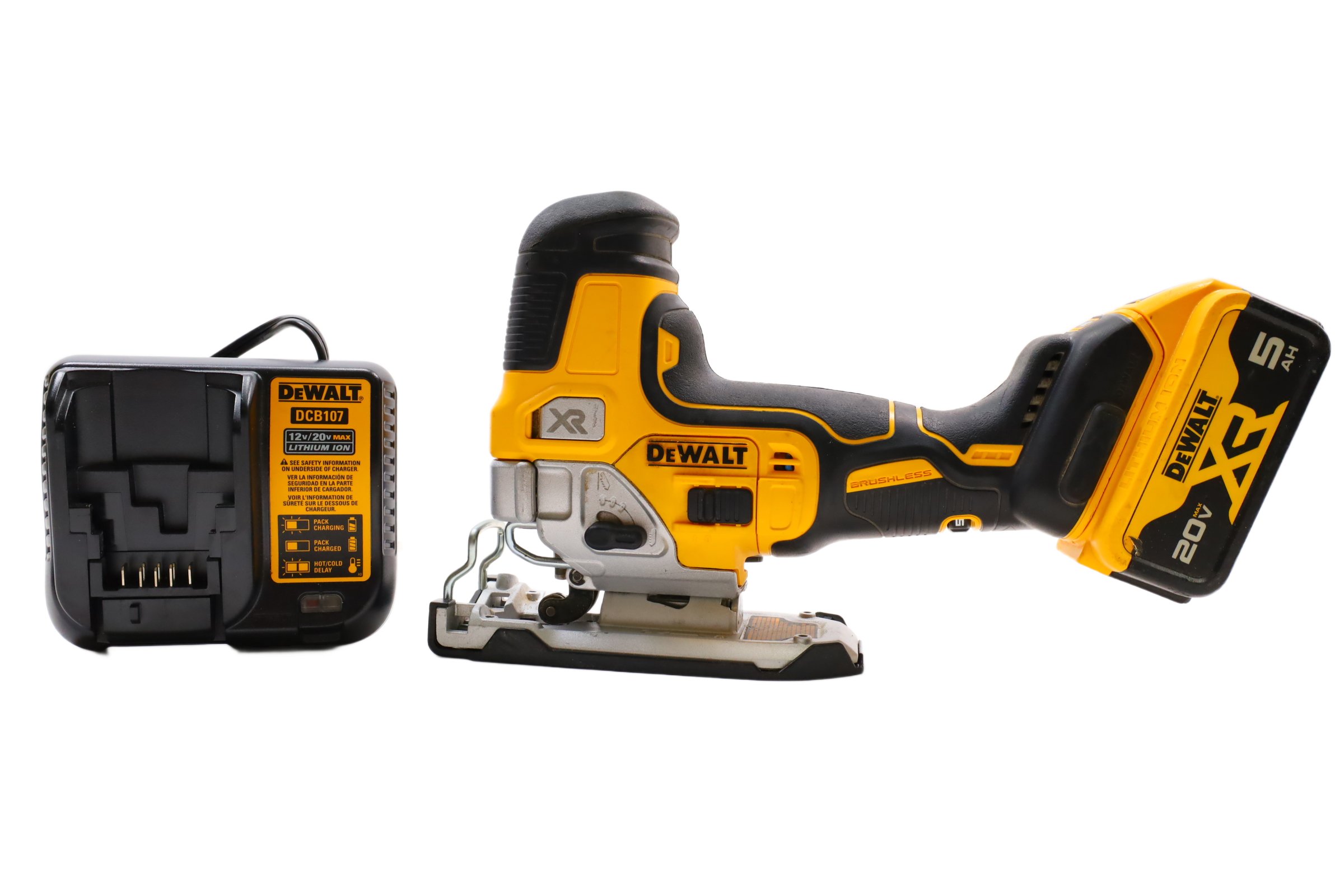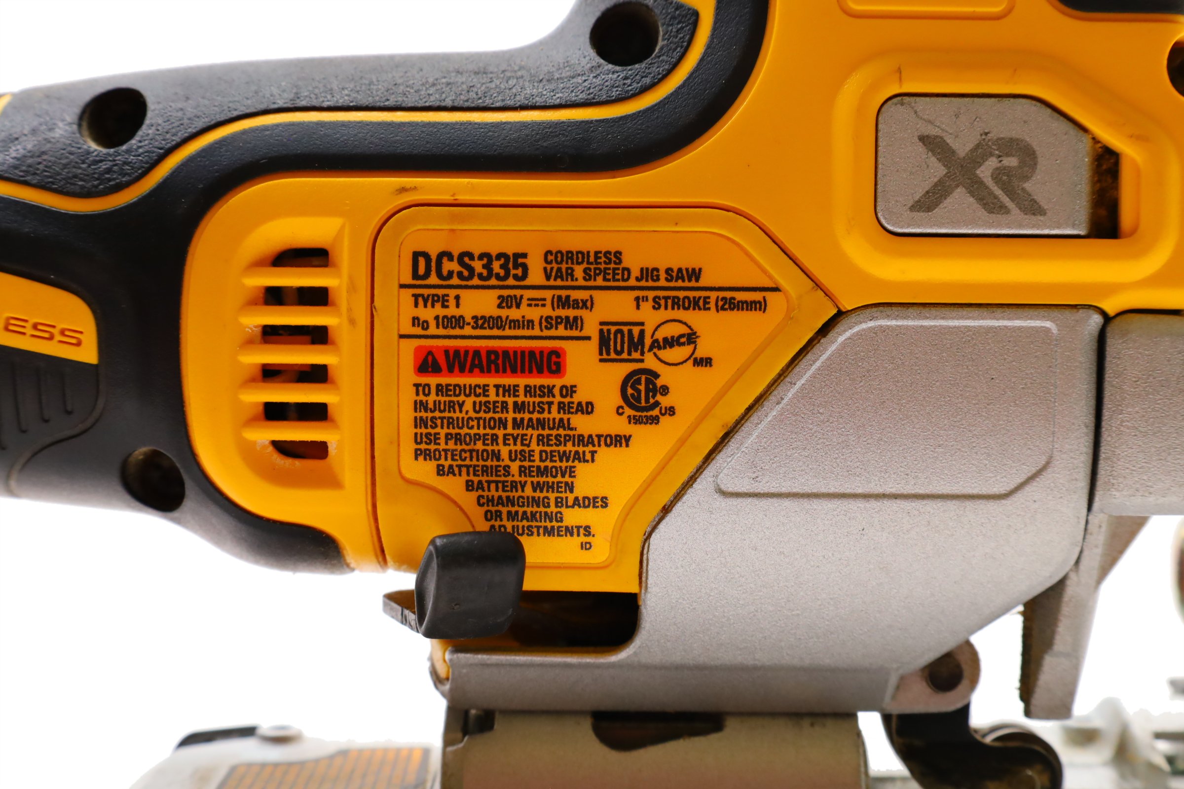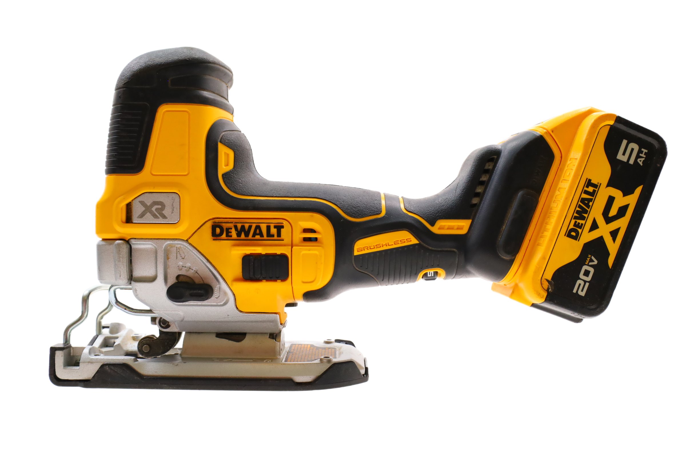 Designed for precision and efficiency with a brushless motor offering powerful performance. It features a variable speed trigger and dial to control blade speeds up to 3,200 SPM, ideal for cutting various materials. The 4-position orbital action enhances cut quality and speed, while the all-metal, lever-action keyless blade clamp allows for quick t-shank blade changes. Additional features include a bright LED for improved visibility, an integrated dust blower to maintain a clear cutting line, and a keyless shoe bevel with detents at 0, 15, 30, and 45 degrees for easy adjustments. The removable no-mar shoe cover helps protect work surfaces from scratches, making this jigsaw a practical tool for curved cuts and cutouts.