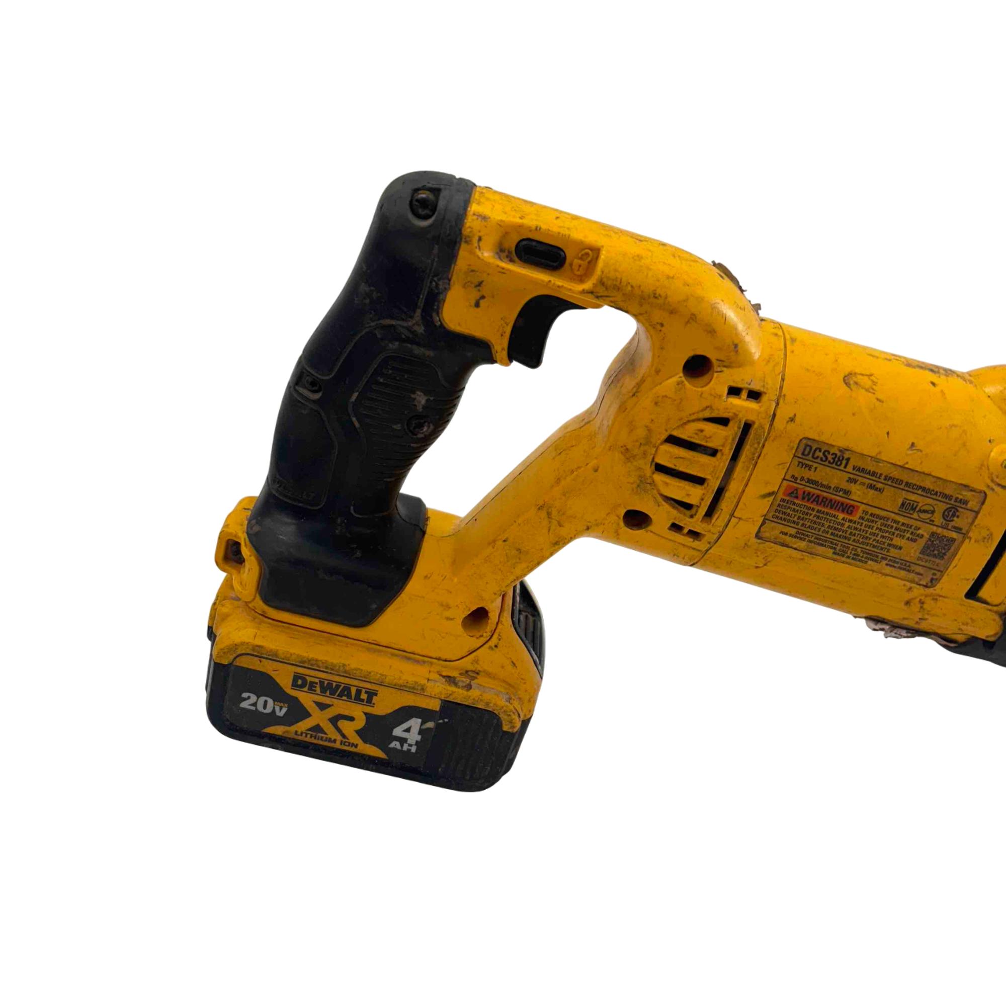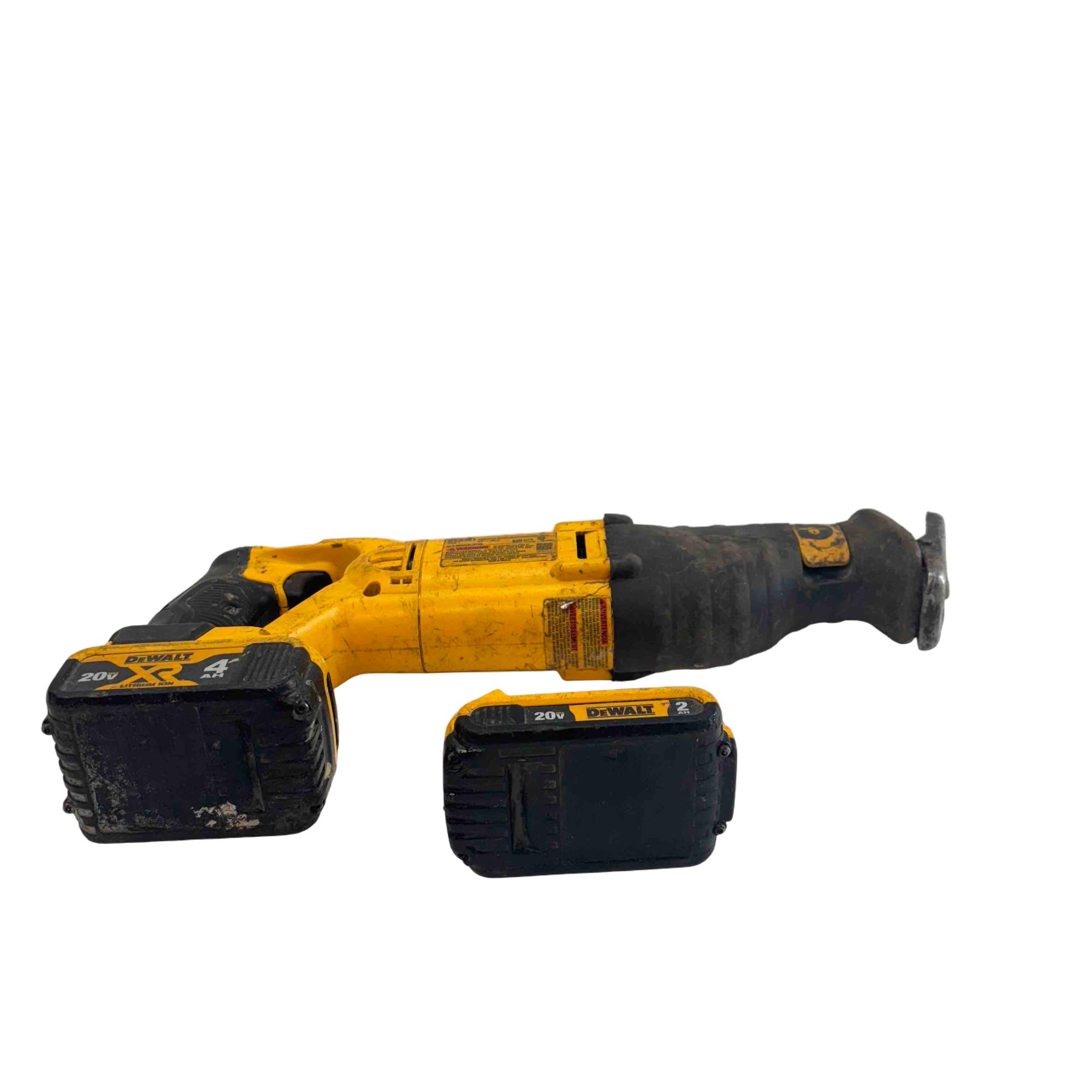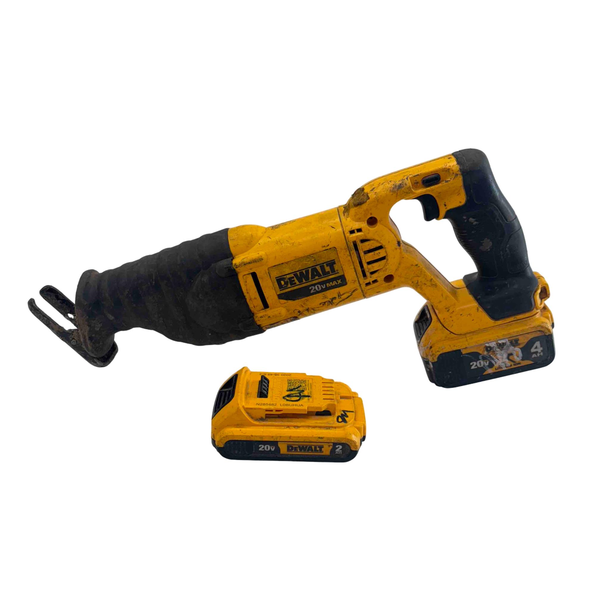 Tackle heavy-duty cutting tasks with this DeWalt DCS381 20V MAX cordless reciprocating saw, featuring a rugged yellow and black design and reliable DeWalt build quality. Included are two rechargeable lithium-ion batteries (4.0Ah and 2.0Ah), so you can power through demolition, renovation, and tough construction jobs without interruption. Built to last and ideal for professionals and DIYers, this saw shows some light wear but is ready for years of reliable service.
