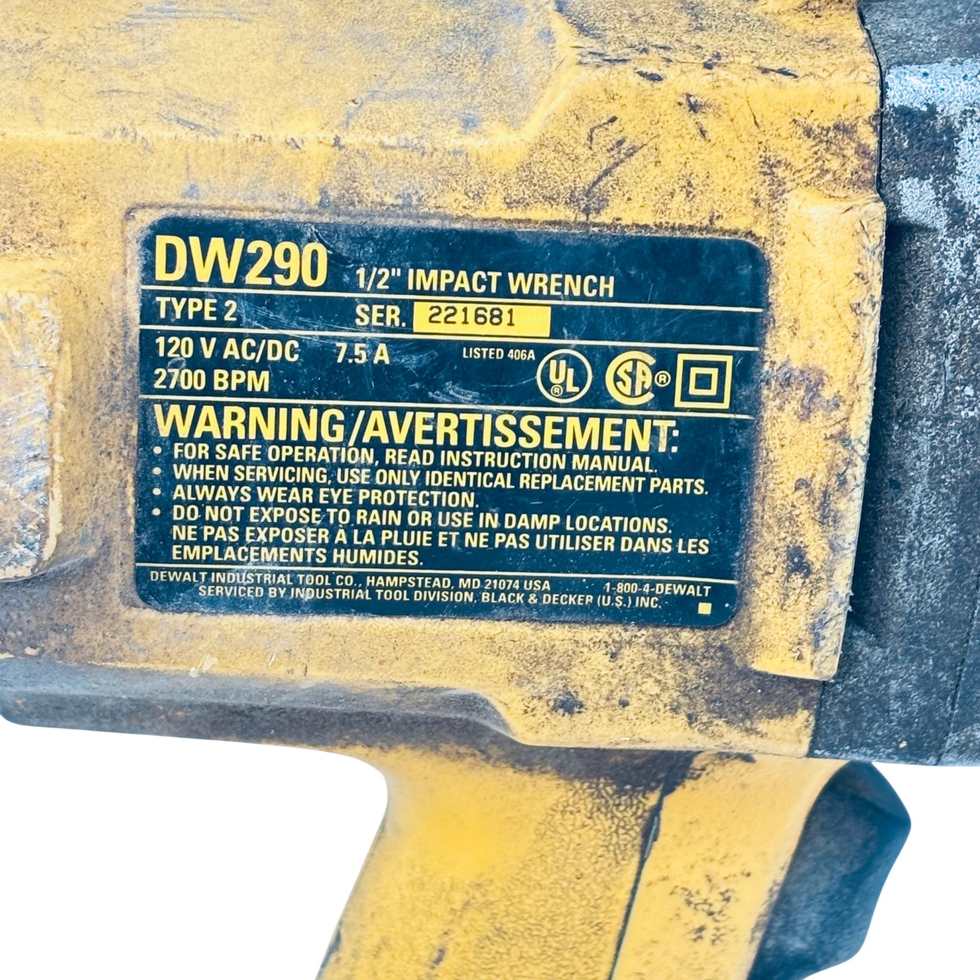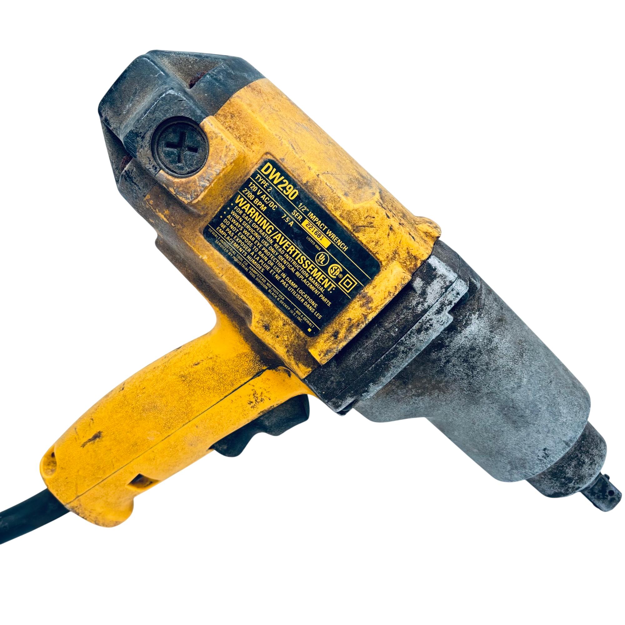 DeWalt DW290 1/2" Corded Impact Wrench, Type 2, 7.5 Amp Electric Power Tool is engineered for heavy-duty fastening tasks with its robust 7.5 amp motor delivering consistent torque for demanding applications. The corded design ensures reliable power without interruptions, while the 1/2 inch drive size offers compatibility with a wide range of sockets and accessories. Its durable construction and ergonomic build make it ideal for professional use and extended operation.