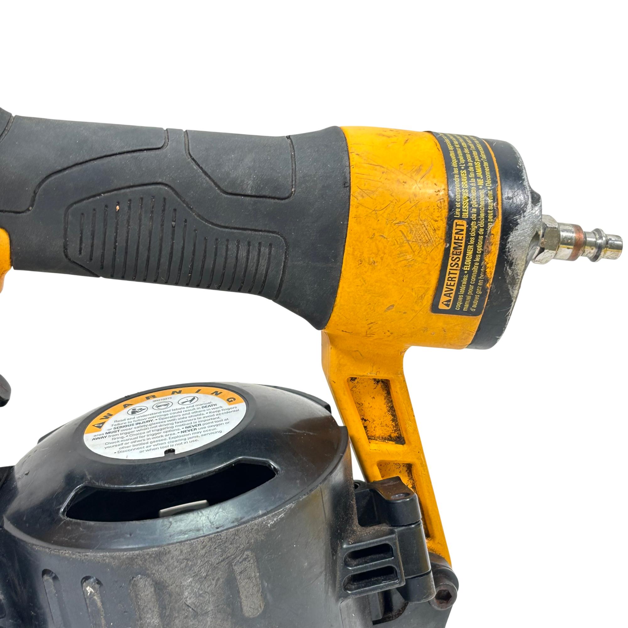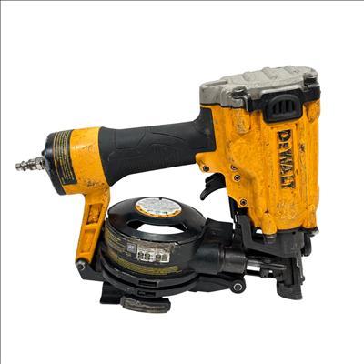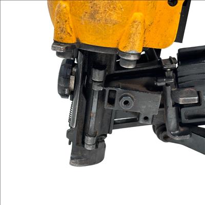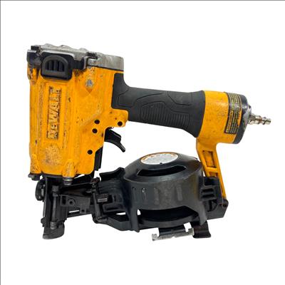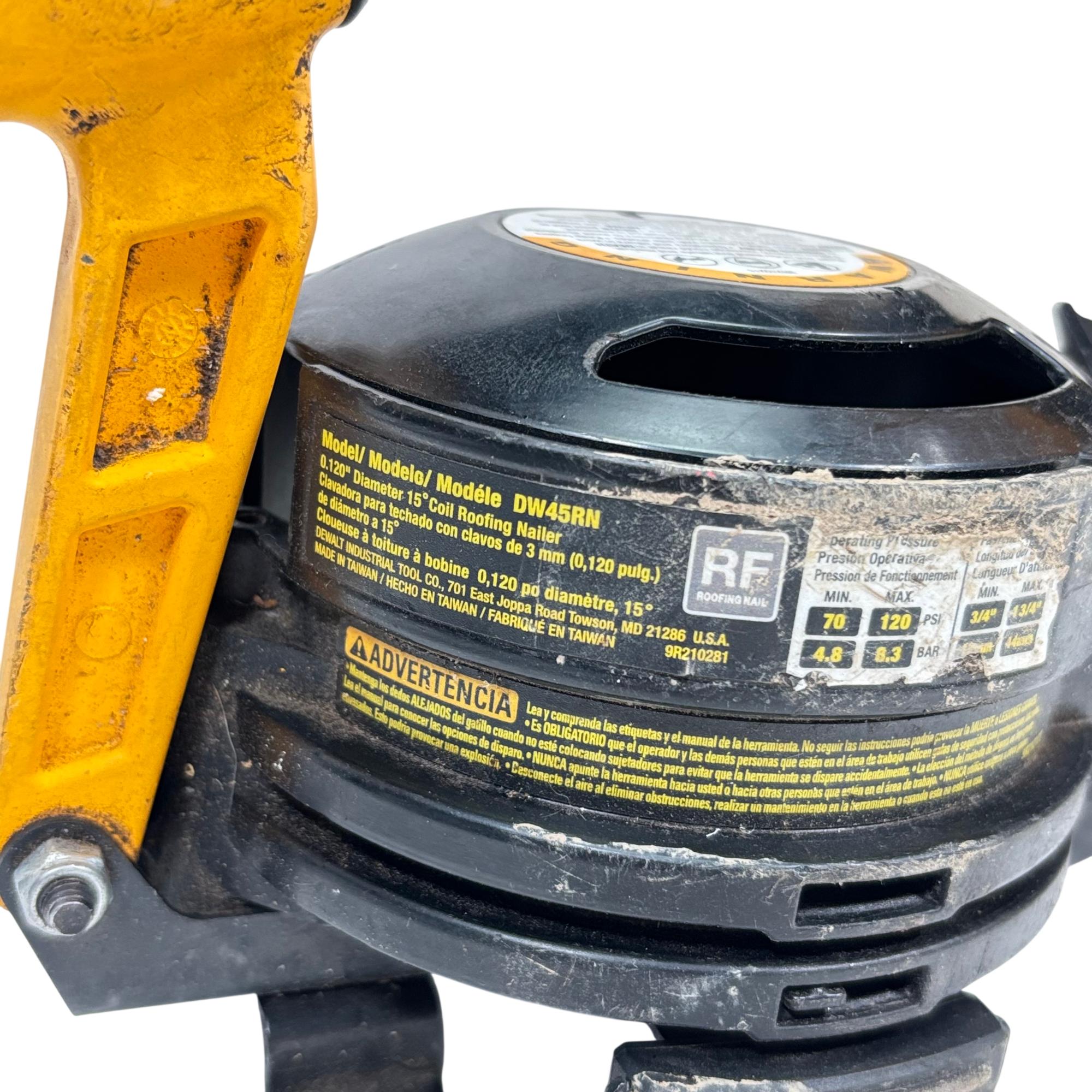 DeWalt DW45RN 0.120" Diameter 15° Pneumatic Coil Roofing Nailer is a heavy-duty tool designed for precise roofing applications. It features a 15-degree angled magazine for coil nails up to 1 3/4 inches, delivering consistent and efficient performance. Built for professional use, this pneumatic nailer combines durability with ergonomic handling for optimal control during extended tasks.